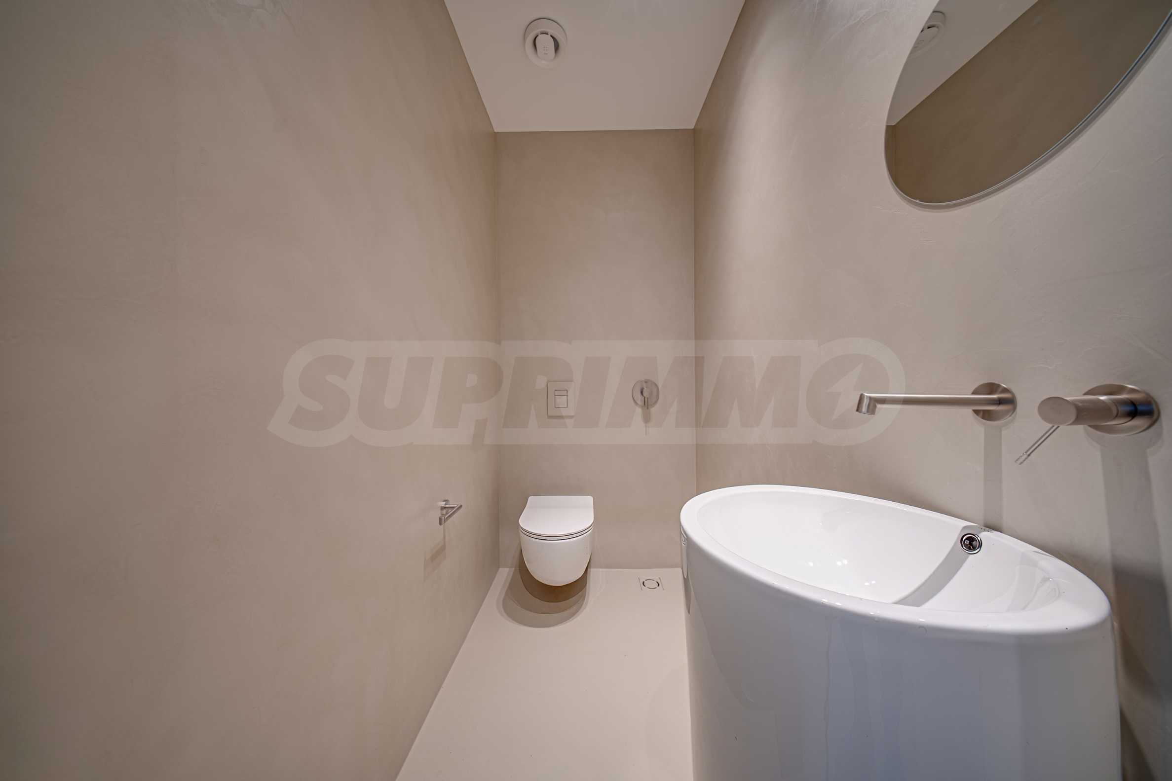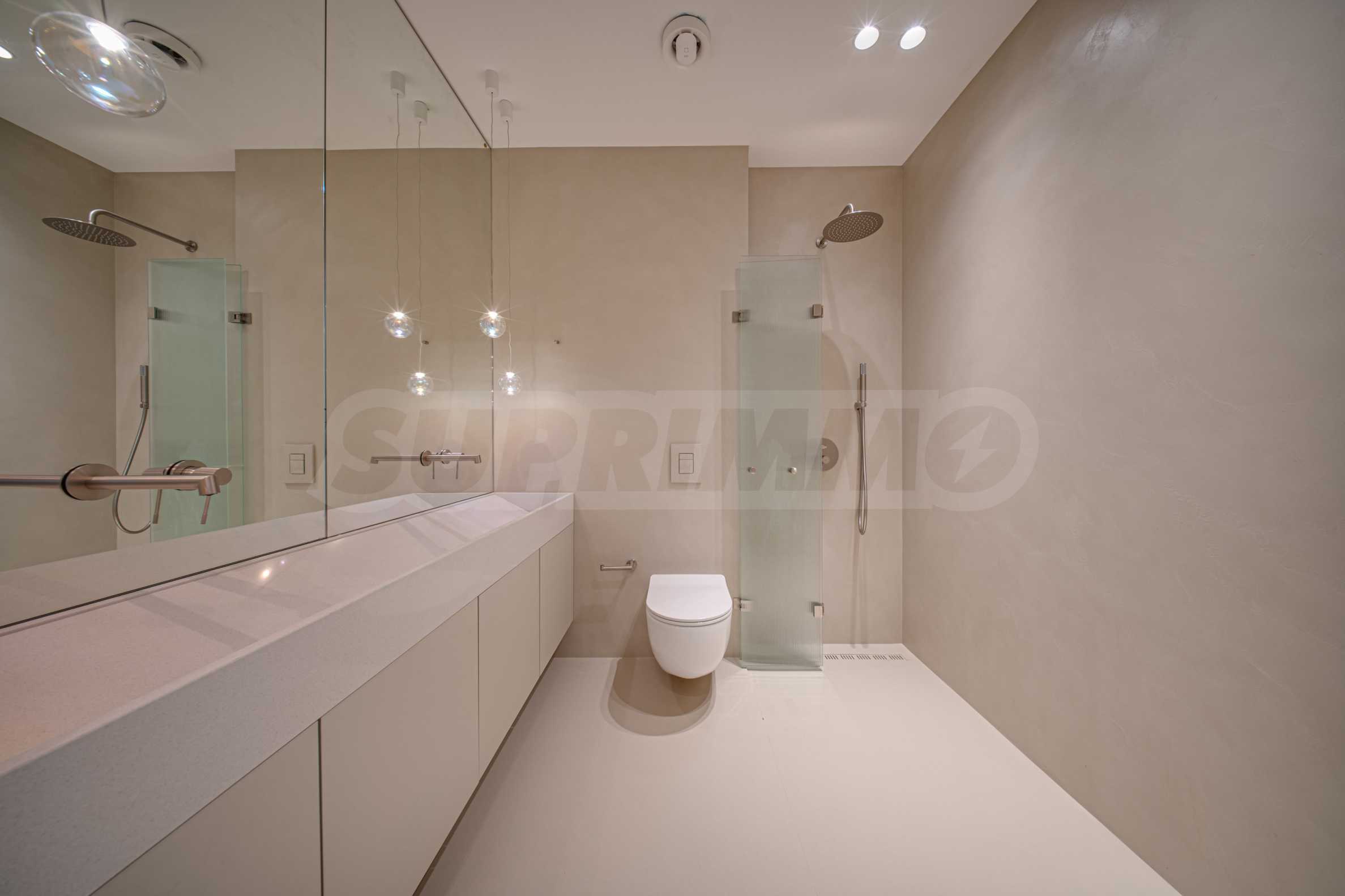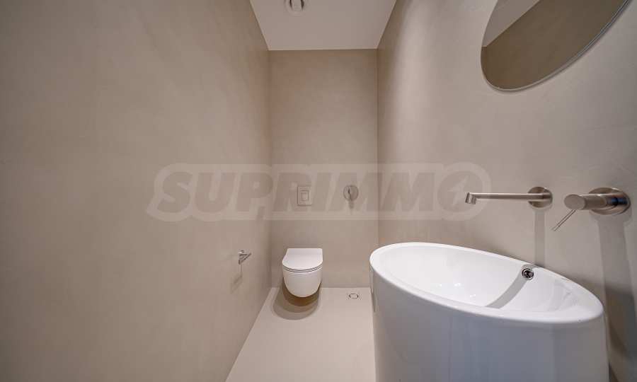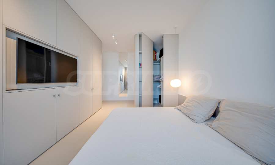 The apartment is offered completely finished, with a built-in underfloor heating system and an individual gas boiler. The kitchen is equipped with high-end NEFF appliances, and the floors in the rooms and bathrooms are filled with elegant microcement, emphasizing the modern vision of the interior.