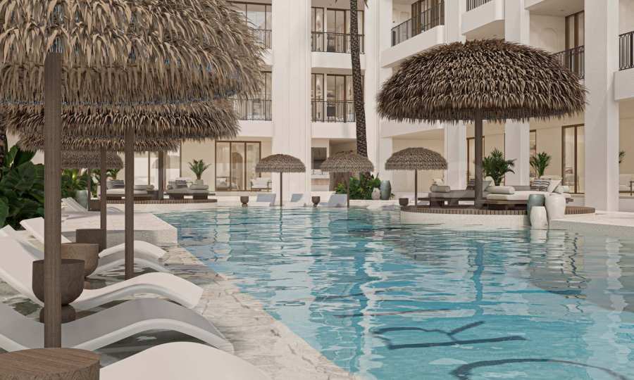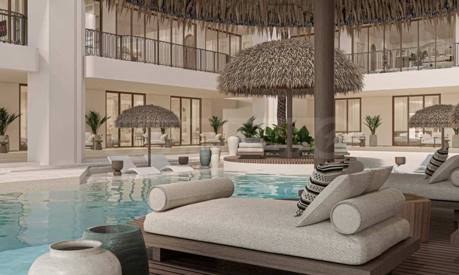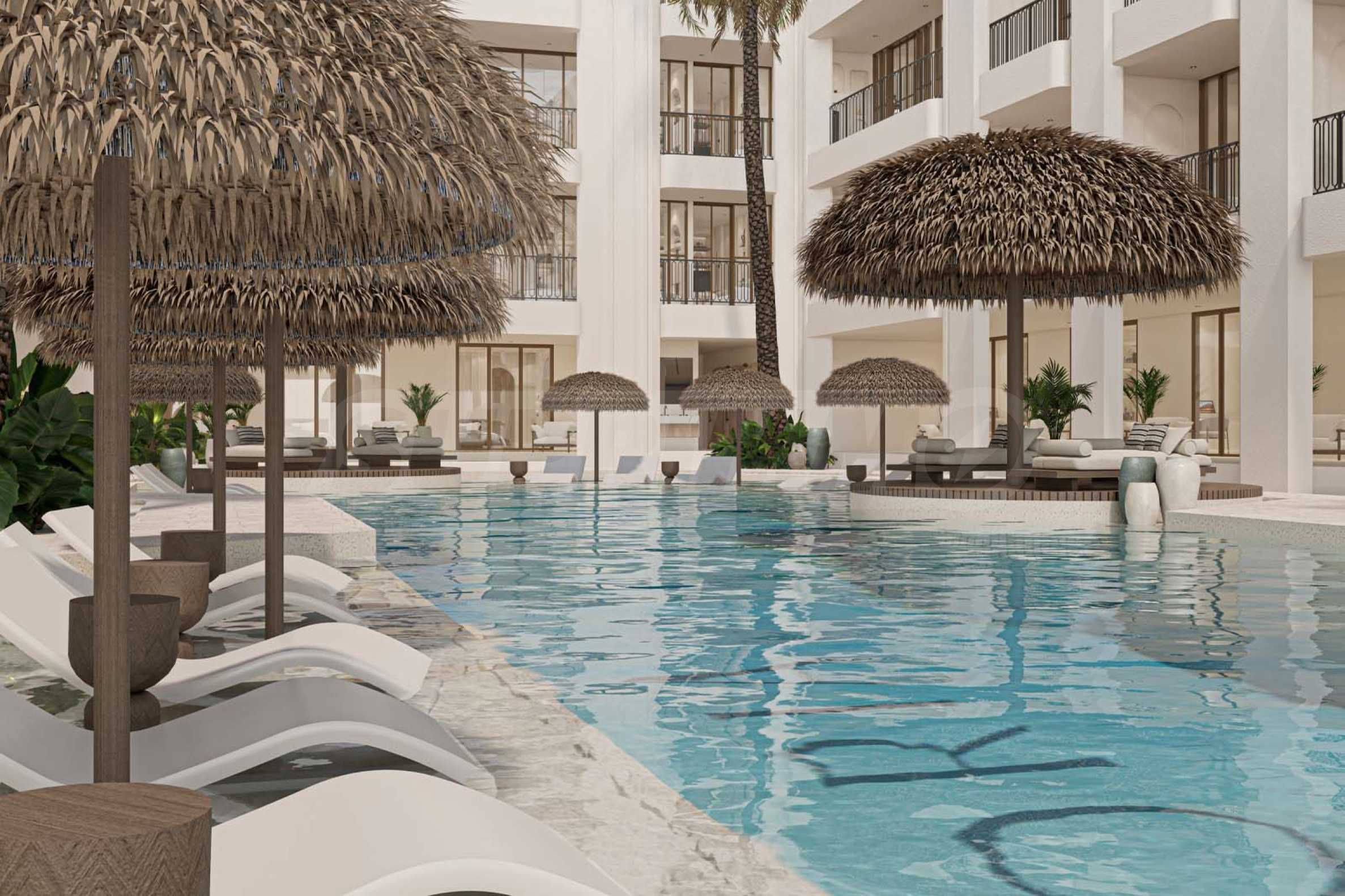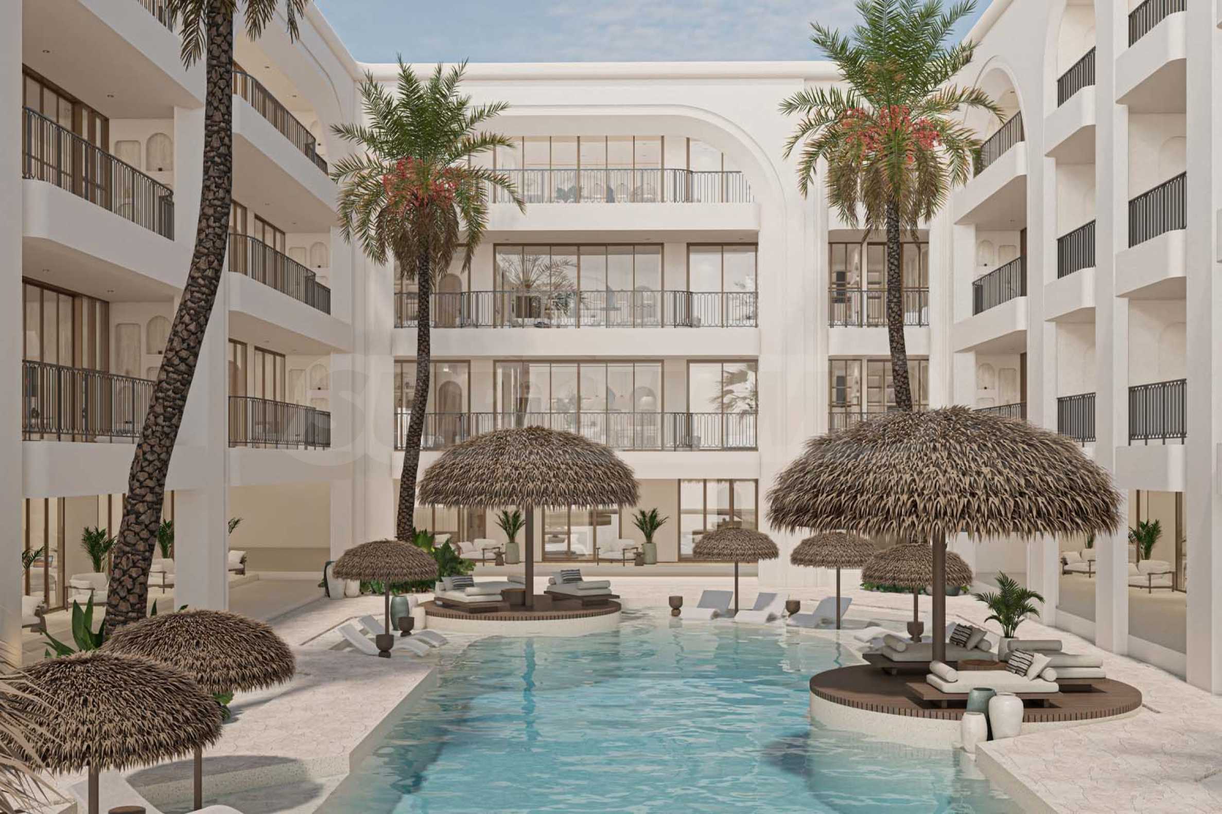 The complex offers a limited number of two-bedroom apartments with an area of 40 sq m, designed with comfort and functionality in mind. The layout includes a cozy living room with a kitchenette and a bar counter, a separate bedroom and a spacious sun terrace, on which a private pool is located for the pleasure and relaxation of the residents.