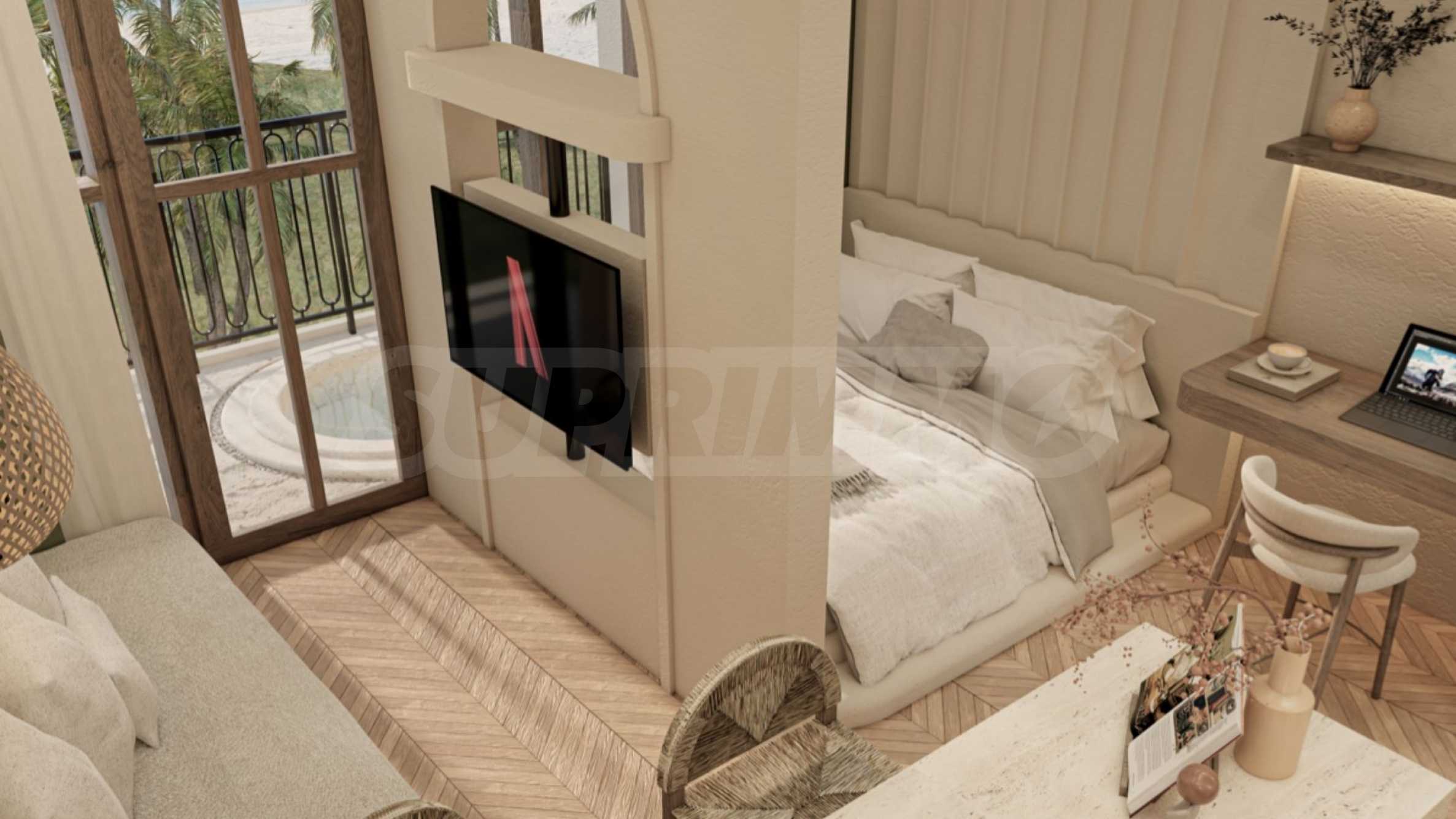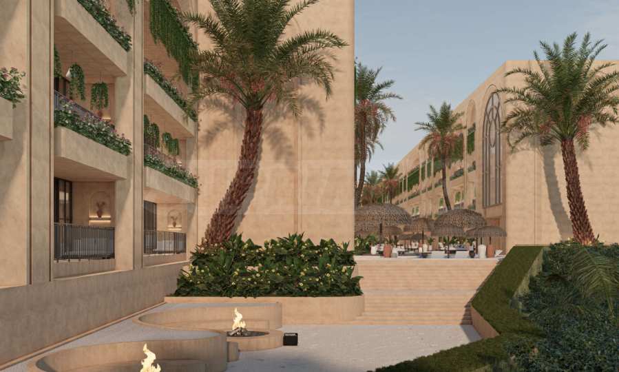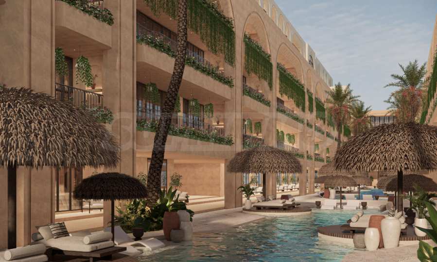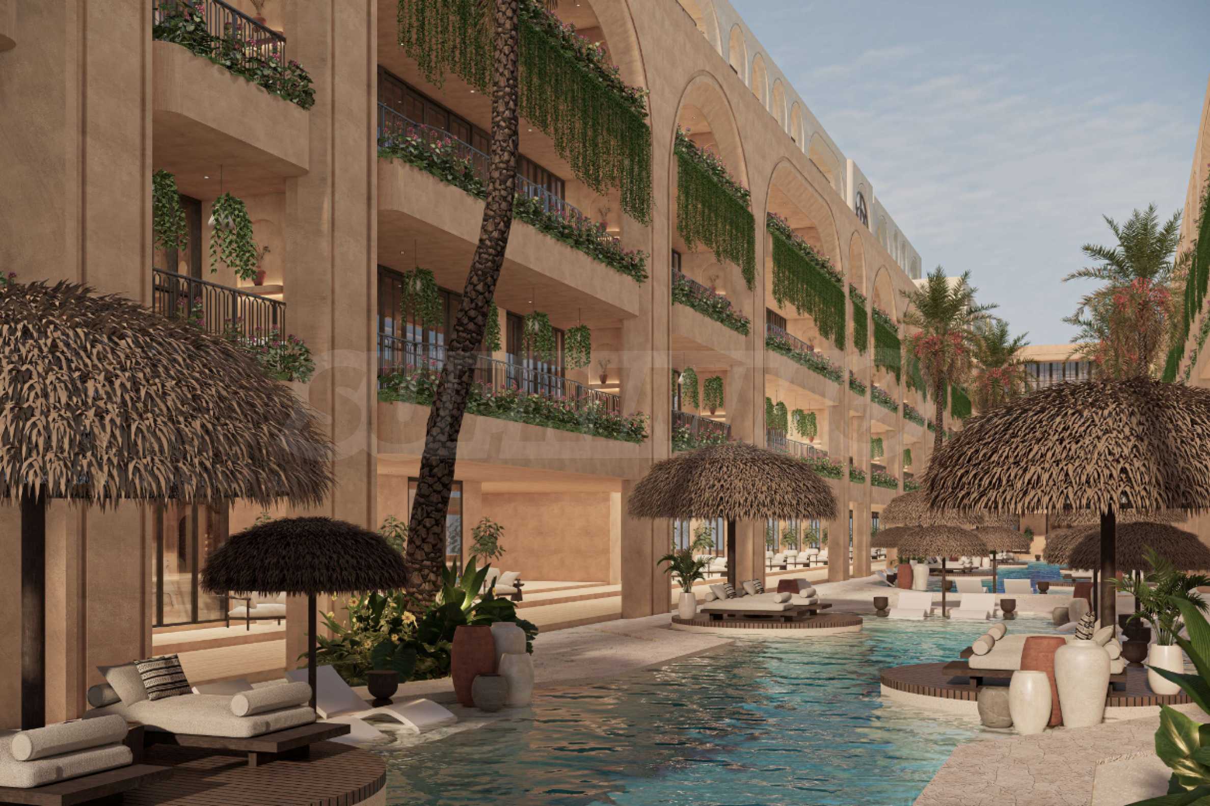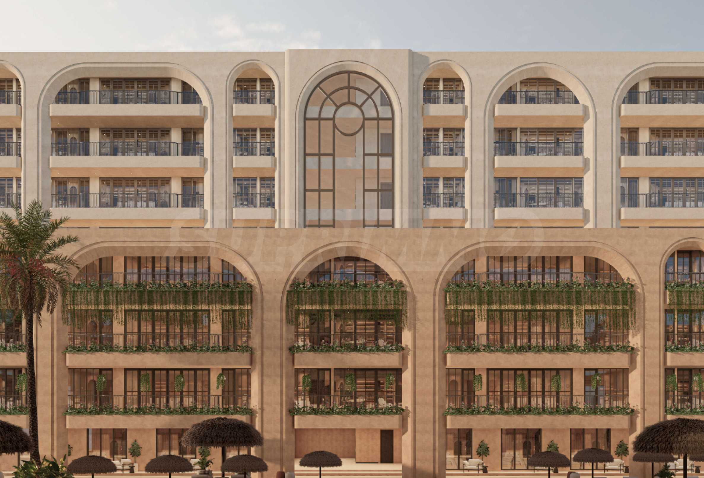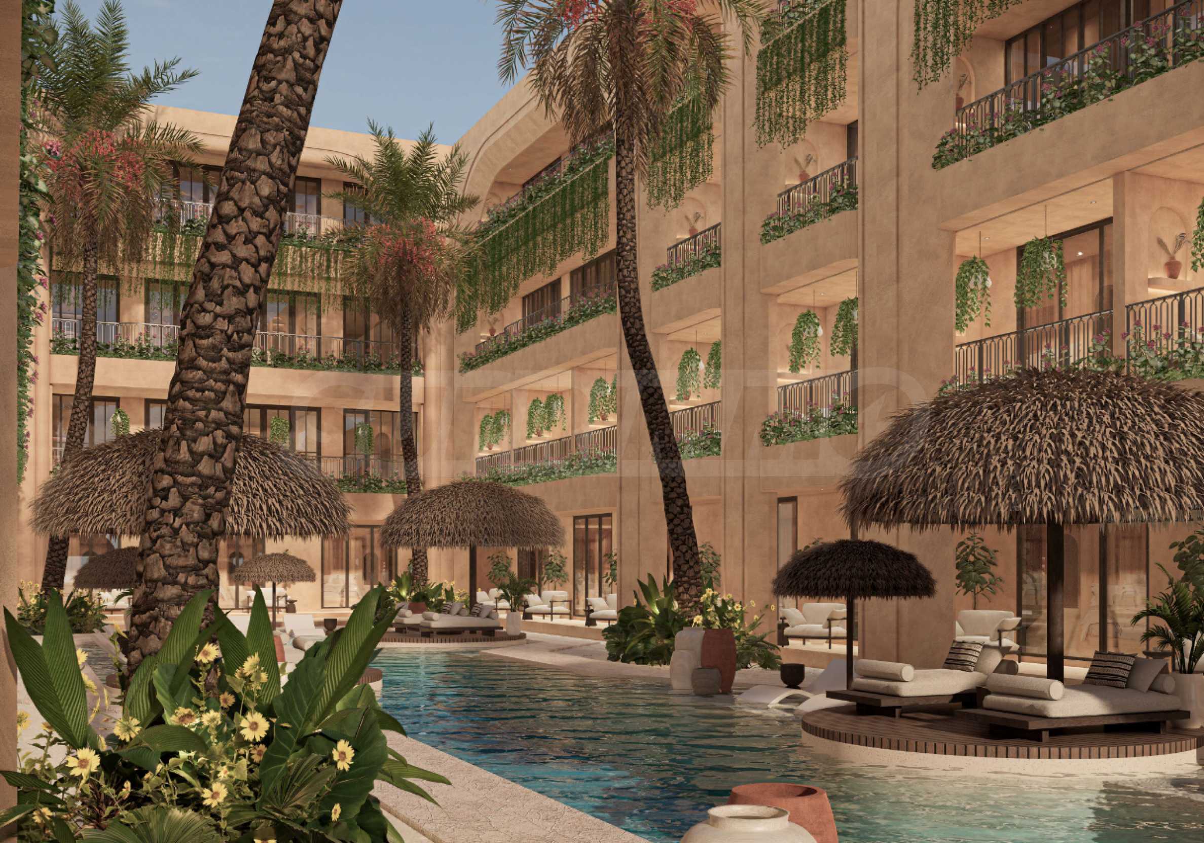 The apartments are offered fully furnished and equipped, featuring natural materials for flooring, high-quality appliances, and stylish furniture that together create a harmonious and elegant living environment. The layouts are comfortable and functional, while floor-to-ceiling windows and high ceilings enhance the sense of openness and space. Each residential unit includes a sun-drenched terrace, with the one- and two-bedroom apartments also featuring private swimming pools.