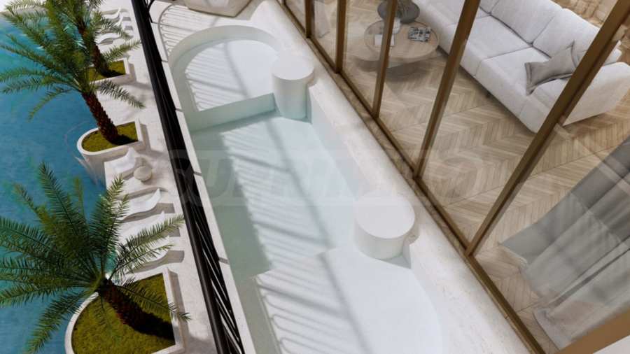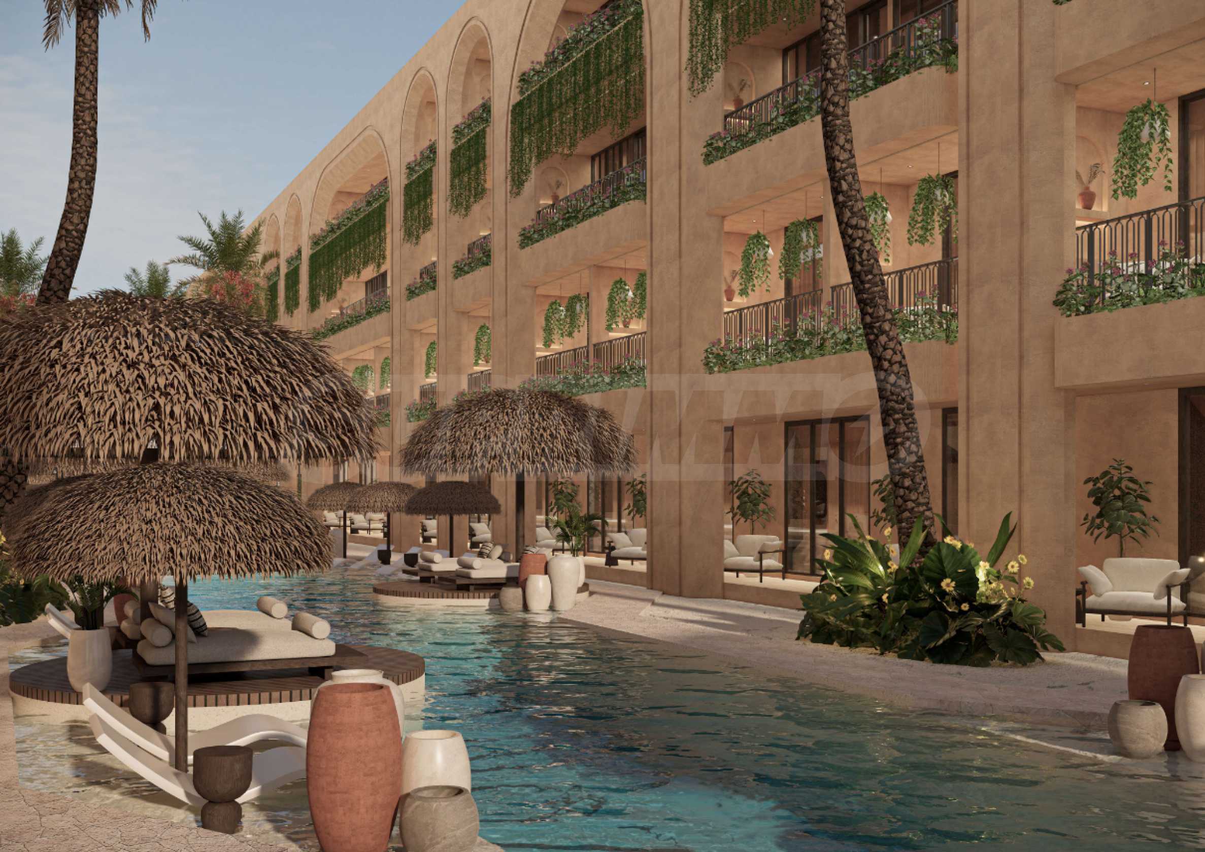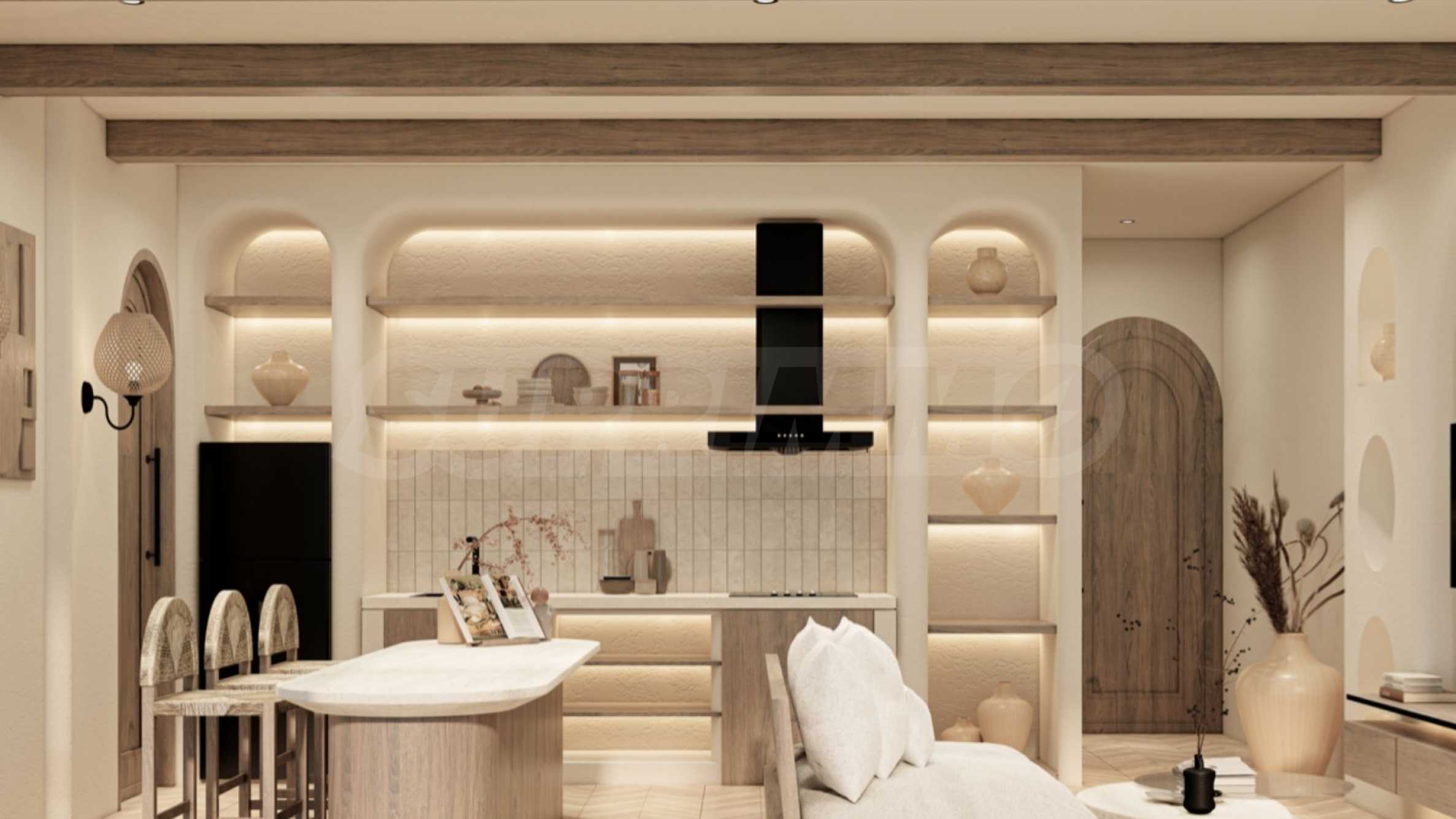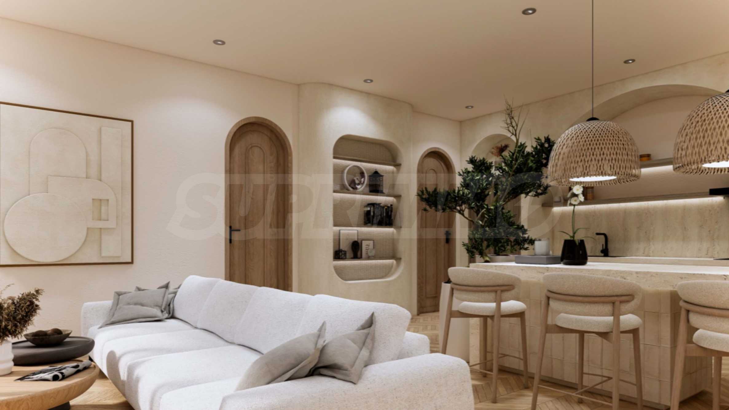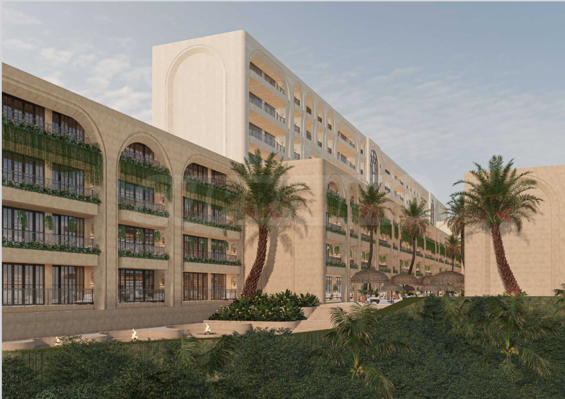The apartments are offered fully furnished and equipped, featuring natural materials for flooring, high-quality appliances, and stylish furniture that together create a harmonious and elegant living environment. The layouts are comfortable and functional, while floor-to-ceiling windows and high ceilings enhance the sense of openness and space. Each residential unit includes a sun-drenched terrace, with the one- and two-bedroom apartments also featuring private swimming pools.