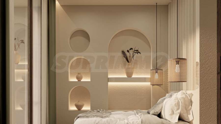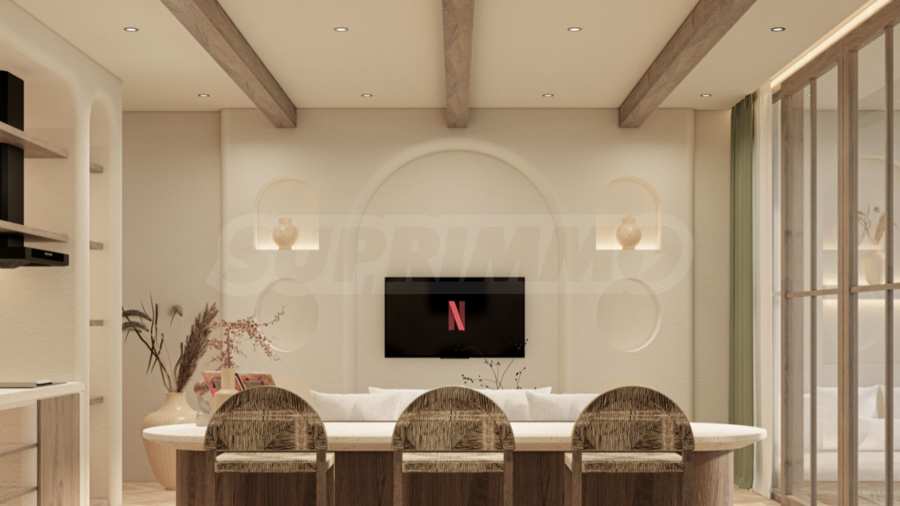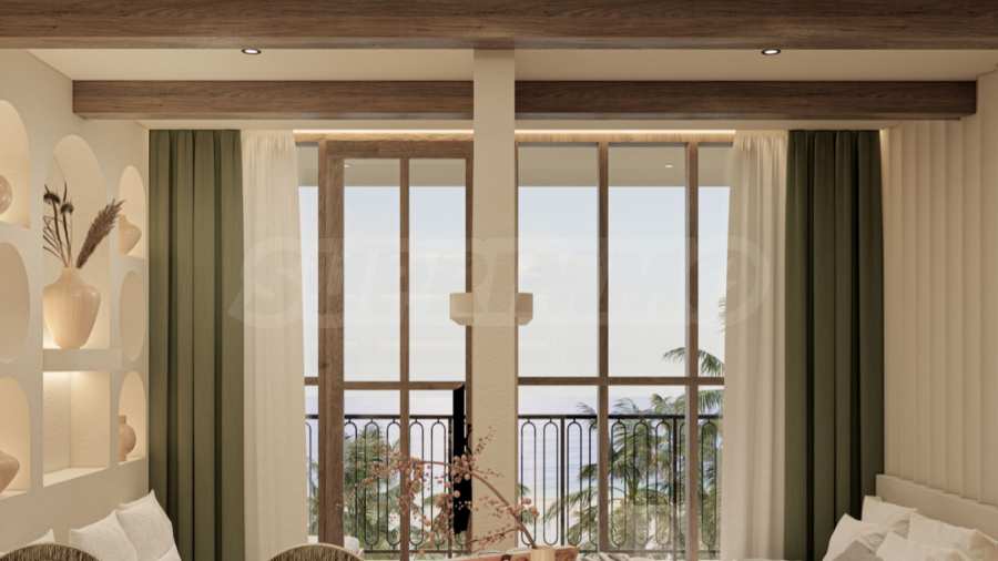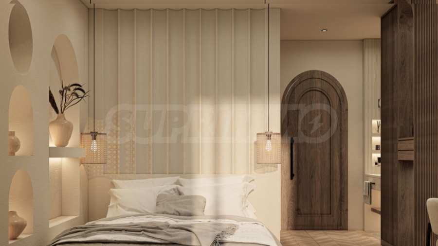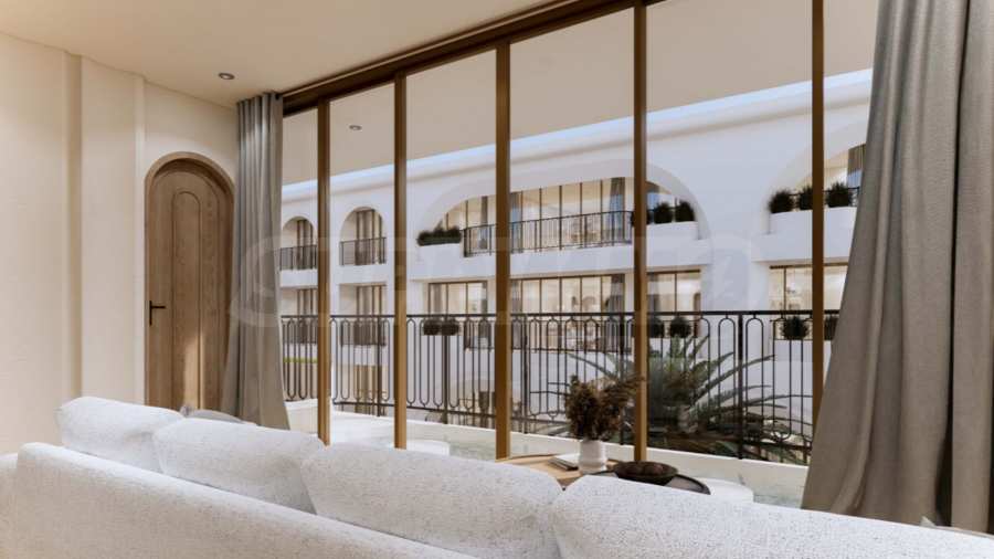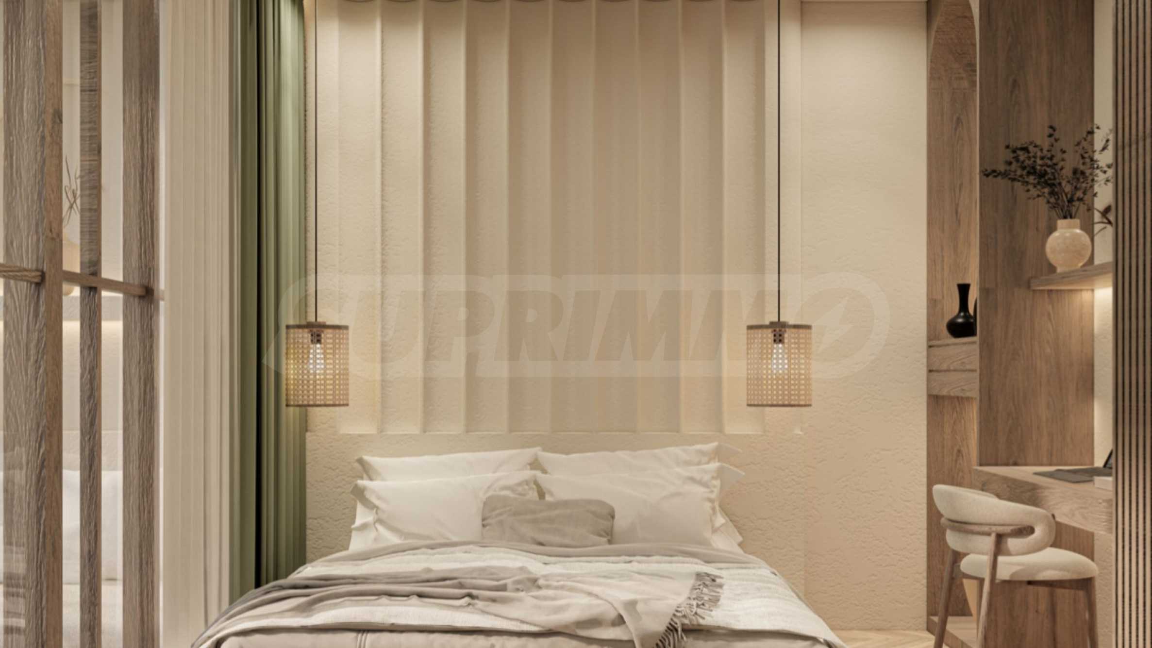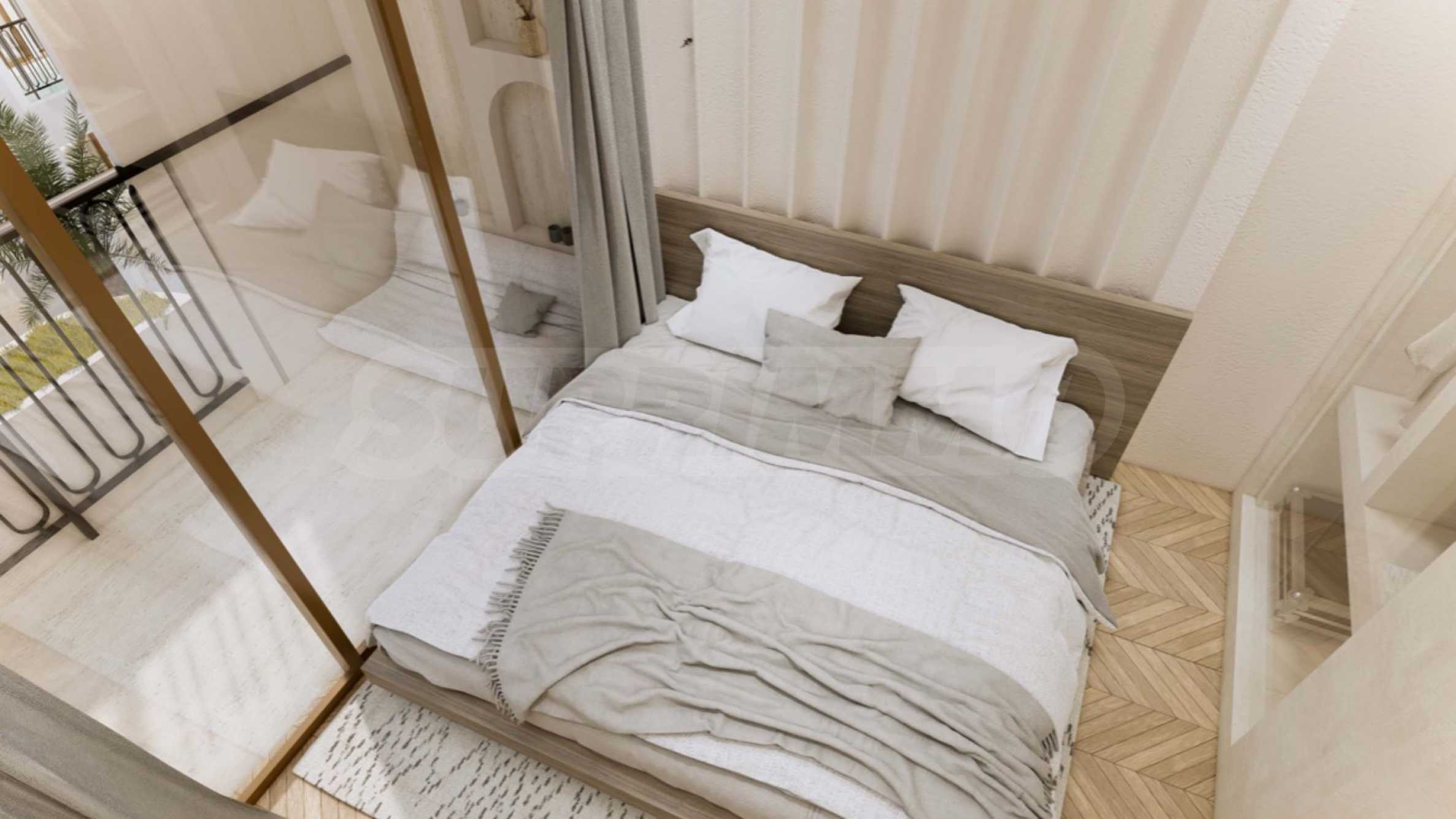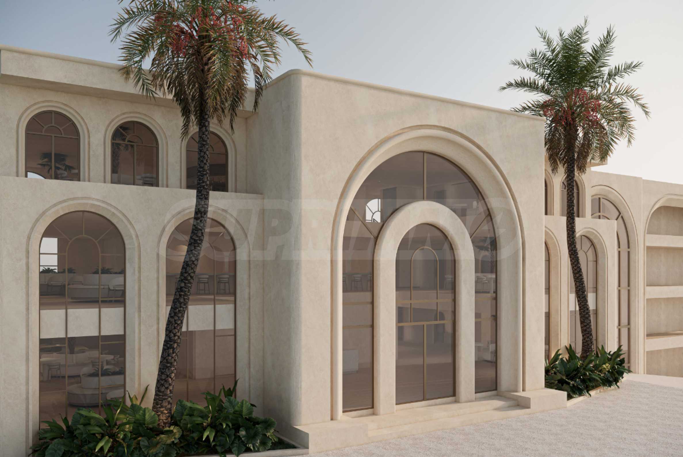The apartments are offered fully furnished and equipped, featuring natural materials for flooring, high-quality appliances, and stylish furniture that together create a harmonious and elegant living environment. The layouts are comfortable and functional, while floor-to-ceiling windows and high ceilings enhance the sense of openness and space. Each residential unit includes a sun-drenched terrace, with the one- and two-bedroom apartments also featuring private swimming pools.