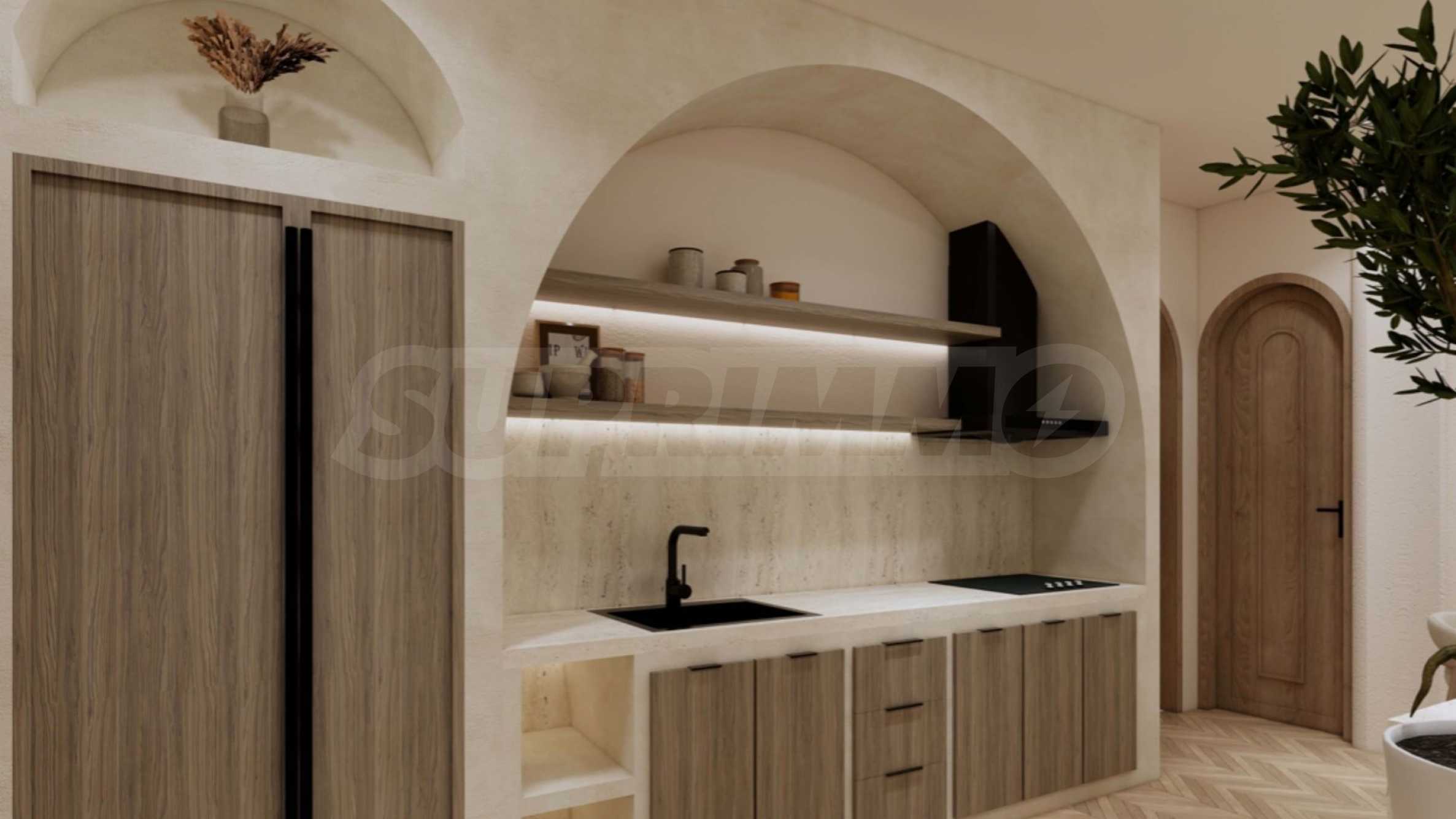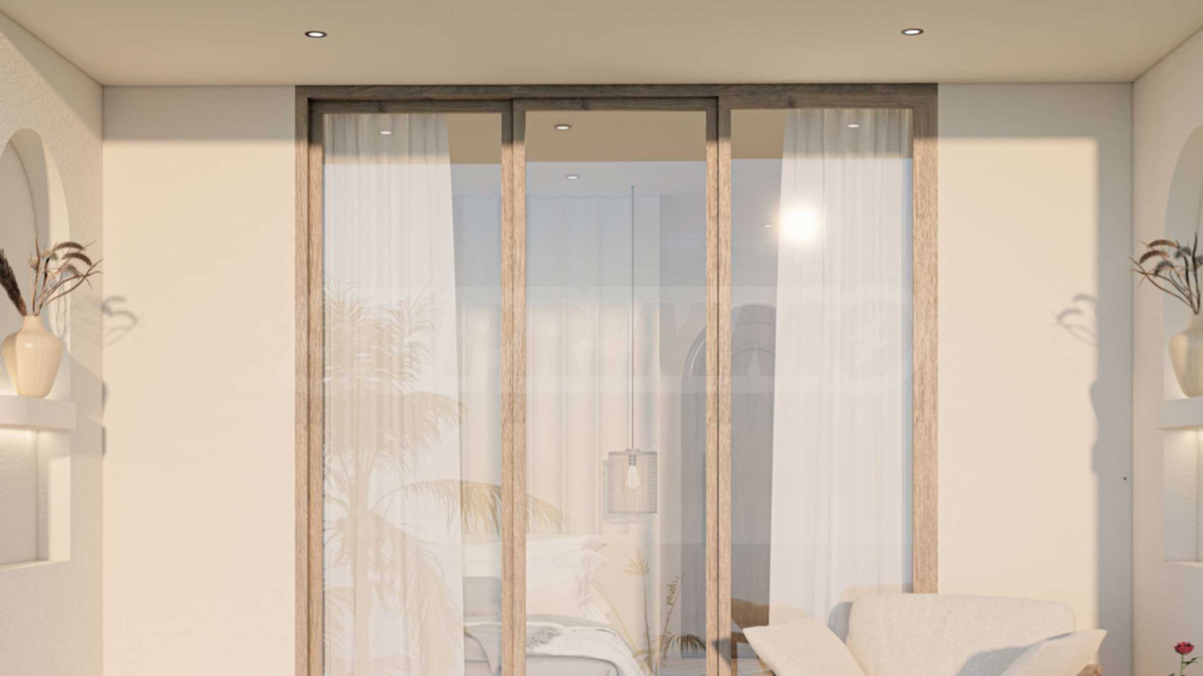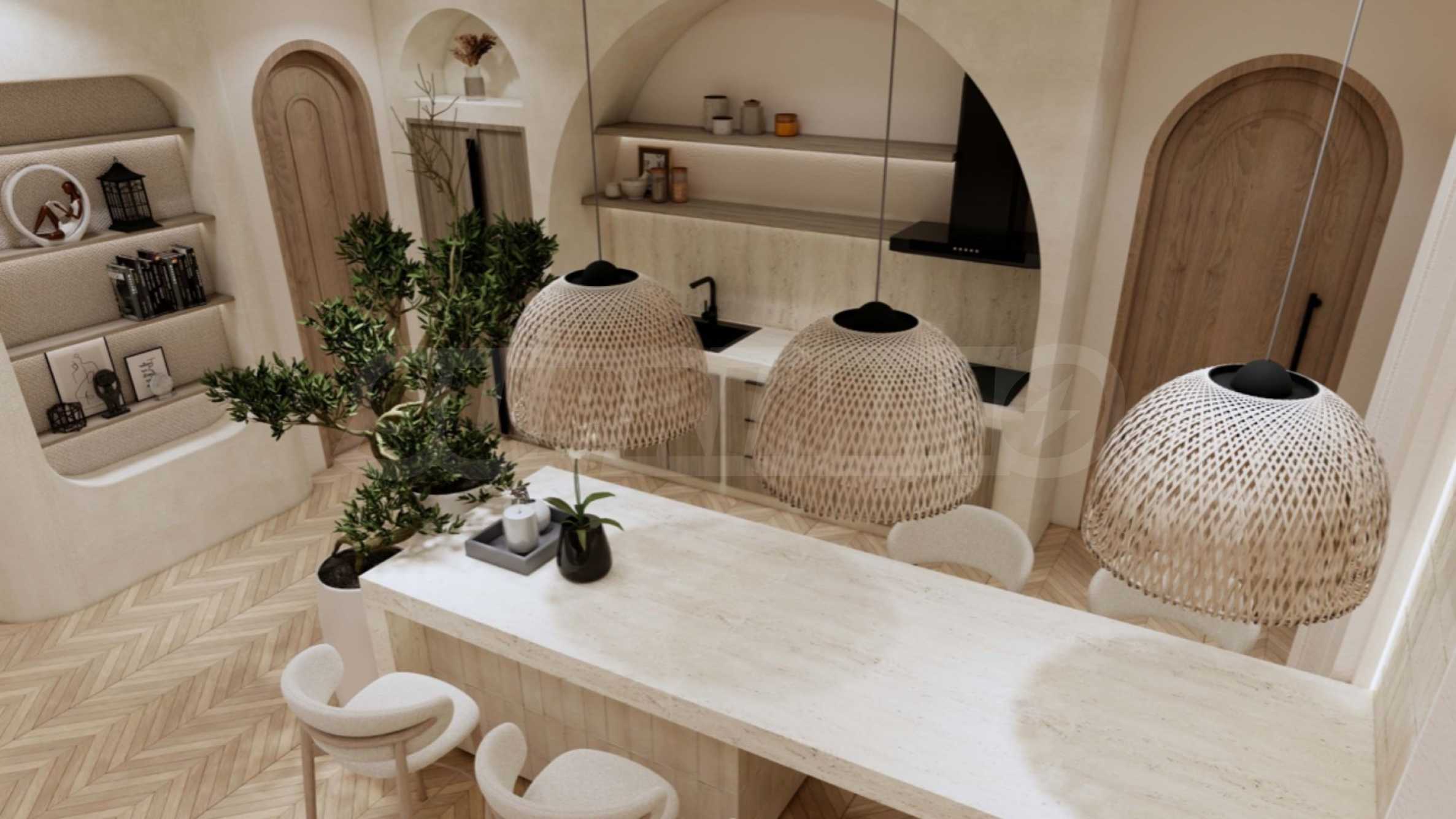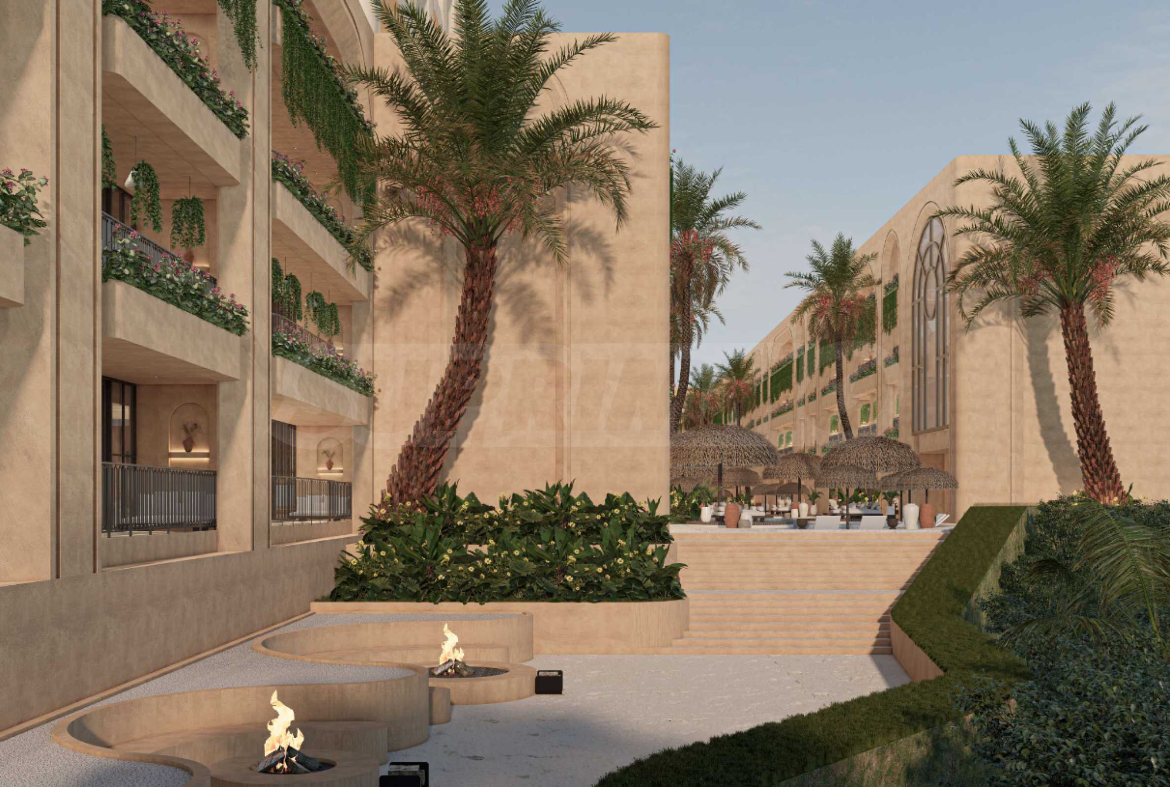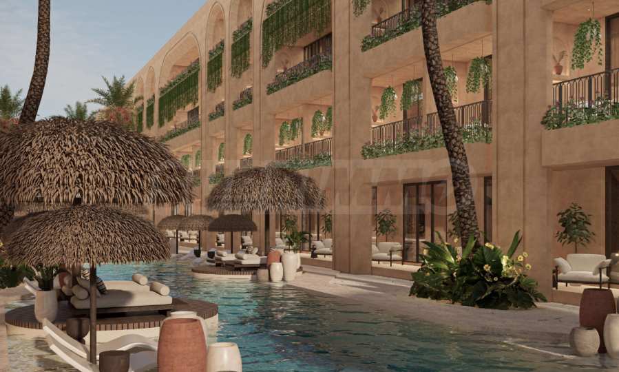 The apartments are offered fully furnished and equipped, featuring natural materials for flooring, high-quality appliances, and stylish furniture that together create a harmonious and elegant living environment. The layouts are comfortable and functional, while floor-to-ceiling windows and high ceilings enhance the sense of openness and space. Each residential unit includes a sun-drenched terrace, with the one- and two-bedroom apartments also featuring private swimming pools.
