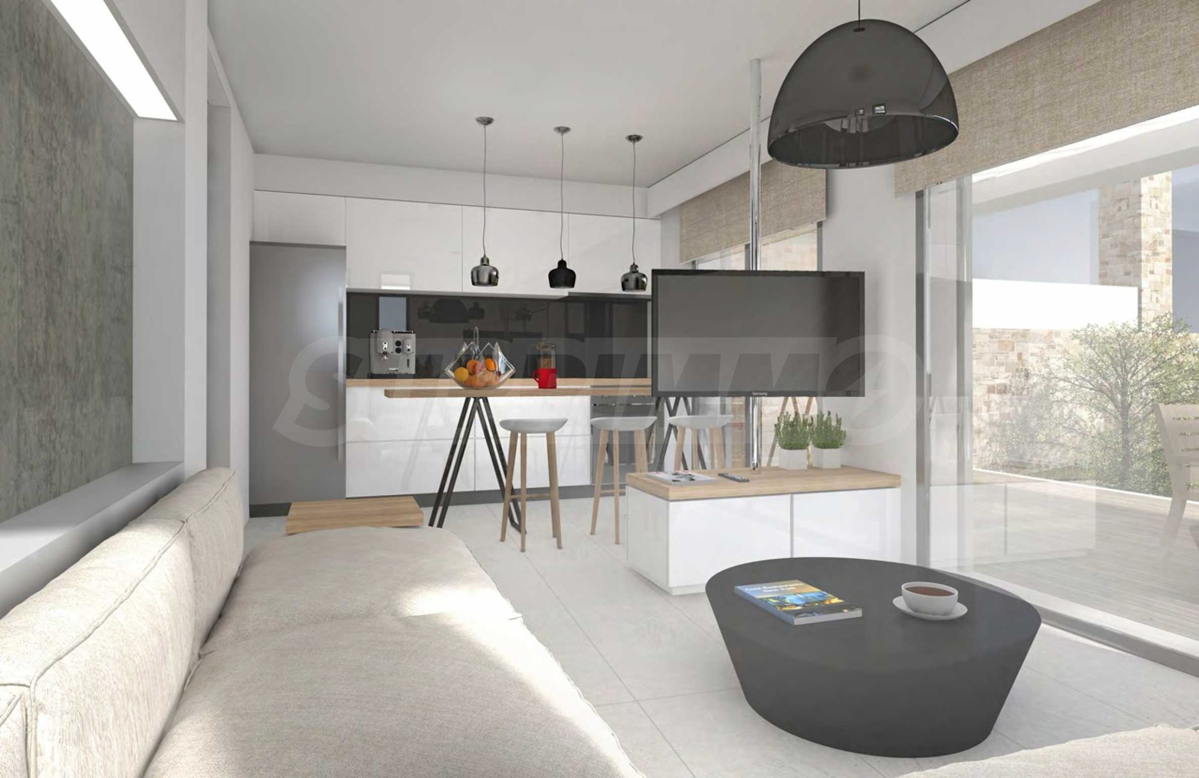 The housing stock is organized into two main categories. Blocks A, B, C and D include a total of 28 houses (seven in each block) with an area of 80 m2. each. Their layout is designed for maximum comfort: on the ground floor (45 m2.) there is a living room with kitchen and dining room, a guest bedroom and a bathroom, and on the first floor (35 m2.) there are two more bedrooms, a second bathroom and a terrace with a sea view. The most exclusive part is Block E, located at the highest point of the complex. It consists of 6 houses with a larger area of 97 m2. with the same layout, they also have more spacious private courtyards in front of the living rooms and direct access to the pool area of the complex.