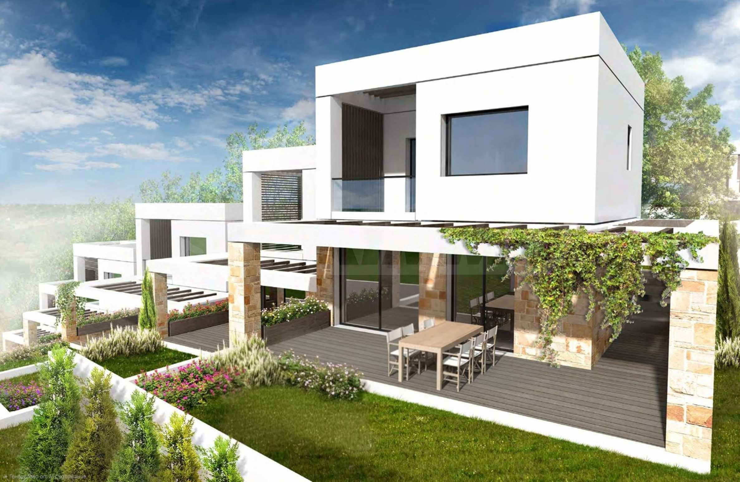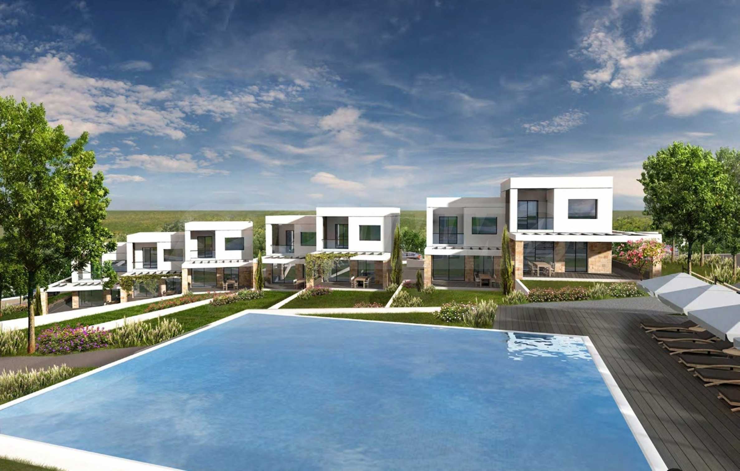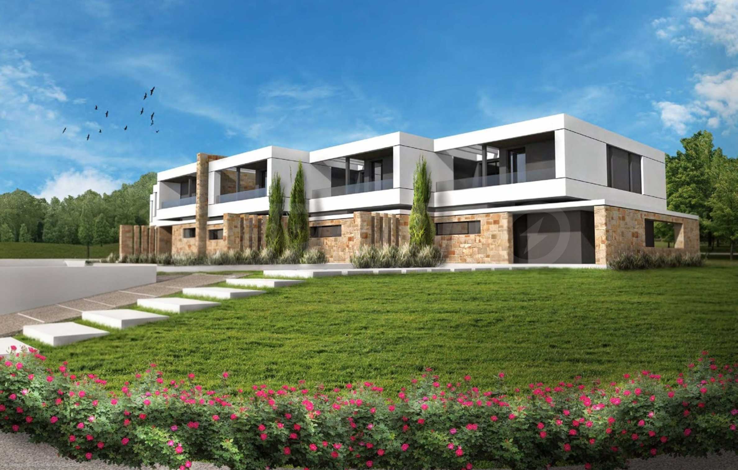 We present to your attention a large-scale investment project located on a green hill in the area of Kalandra and Possidi, Kassandra. The property extends over a vast plot of 43,000 m2., located at an altitude of about 200 meters above sea level, which provides each of the houses with a magnificent panoramic view of the bay. The project is a gated complex (village), consisting of 34 two-story terraced houses, distributed in five architectural blocks. The architecture is in a modern "Doric" style with clean white volumes that harmonize with the landscape through the use of natural light local stone and wooden elements.