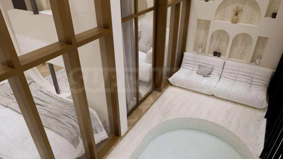 The apartment is offered fully furnished and equipped, using natural materials for the flooring, high-quality electrical appliances and stylish furniture, which create a sense of harmony and elegance. The floor-to-ceiling windows and high ceilings contribute to the feeling of light, space and freedom.