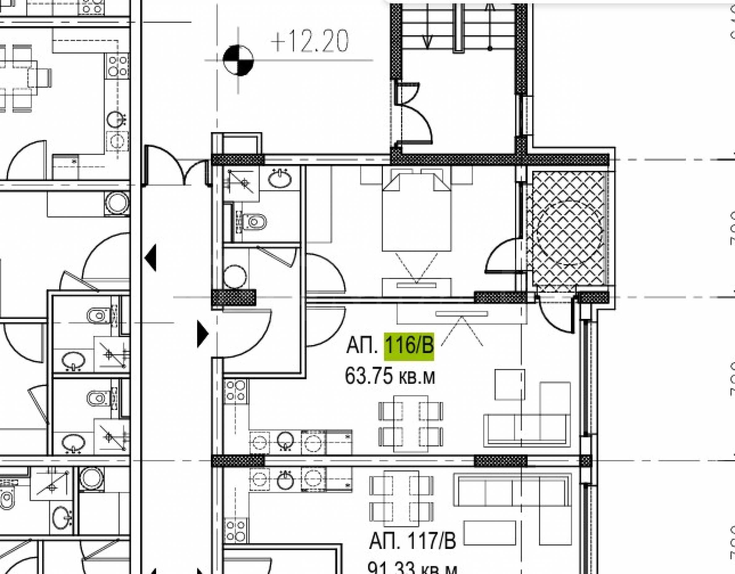 The property is located on the 5th floor and has a total area of 73.66 m2, net area - 63.75 m2, on which are distributed: entrance hall, living room with kitchen, bathroom/toilet, bedroom, terrace with access from both rooms. It is being let in a degree of completion according to BDS, with five-chamber PVC joinery Rehau, with triple glazing and an armored entrance door.