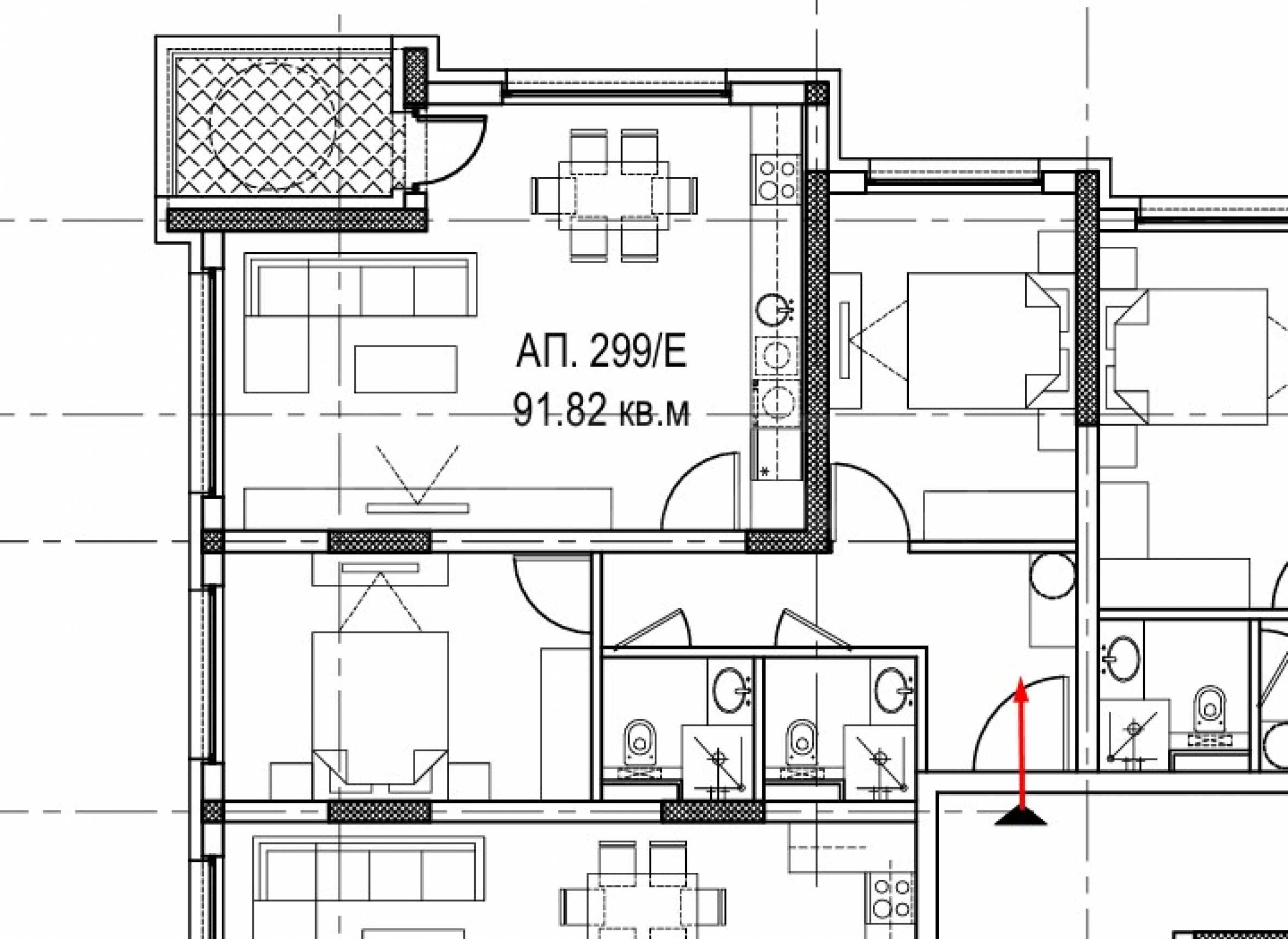 The property is located on the 4th floor and has a total area of 106.09 m2, net area - 91.82 m2, on which are distributed: entrance hall, two bathrooms with toilets, living room with kitchen and terrace, two bedrooms. The apartment is being rented out in a degree of completion according to BDS, with five-chamber PVC joinery Rehau, with triple glazing and an armored entrance door.