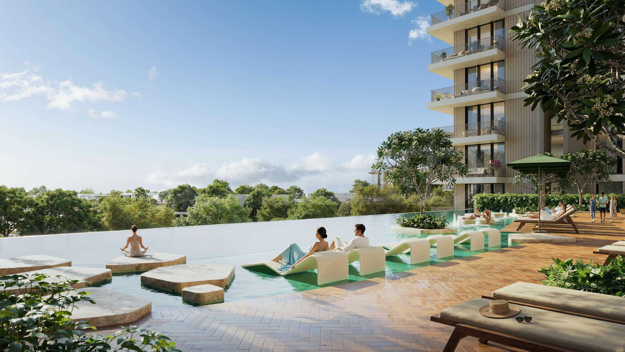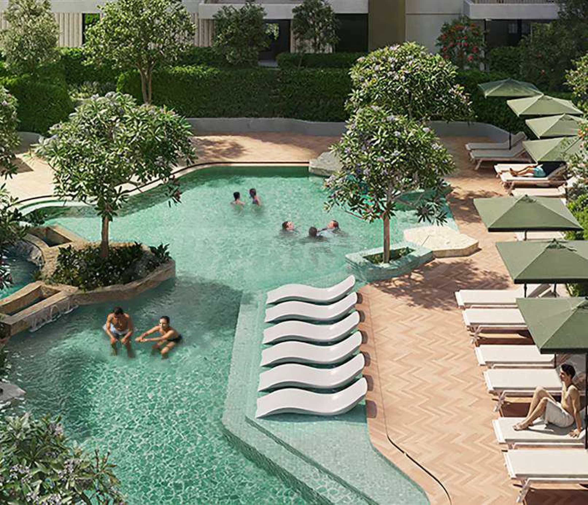 Lush gardens with water facilities, shaded paths for walking and jogging, outdoor areas for yoga and relaxation create an environment that encourages balance and tranquility. At the heart of the complex is a picturesque lake where ducks swim freely, and specially designed gardens are home to beautiful peacocks. An impressive butterfly pavilion is also planned, which will become an iconic accent of the residential area with its beauty and natural diversity. The landscaping is designed not only with an aesthetic, but also with a functional purpose - creating a natural microclimate, in which the temperatures in the complex are noticeably lower than in the surrounding desert environment. The gardens also have an elegant area for holding outdoor events.