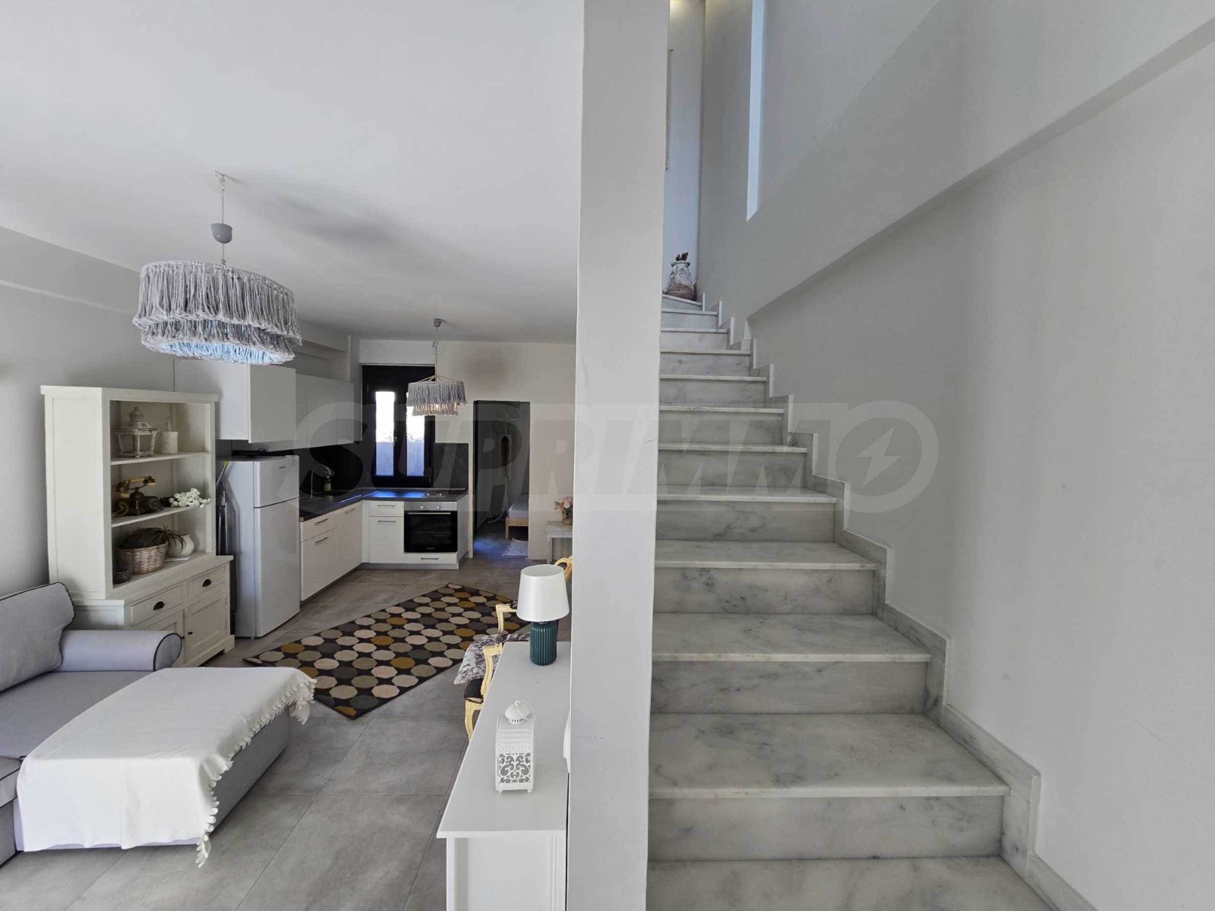 We offer you a bright and functional maisonette with a total area of 80 sq m. The property is located in a quiet area of Nikiti, within walking distance of the promenade and the beach (about 300 m).