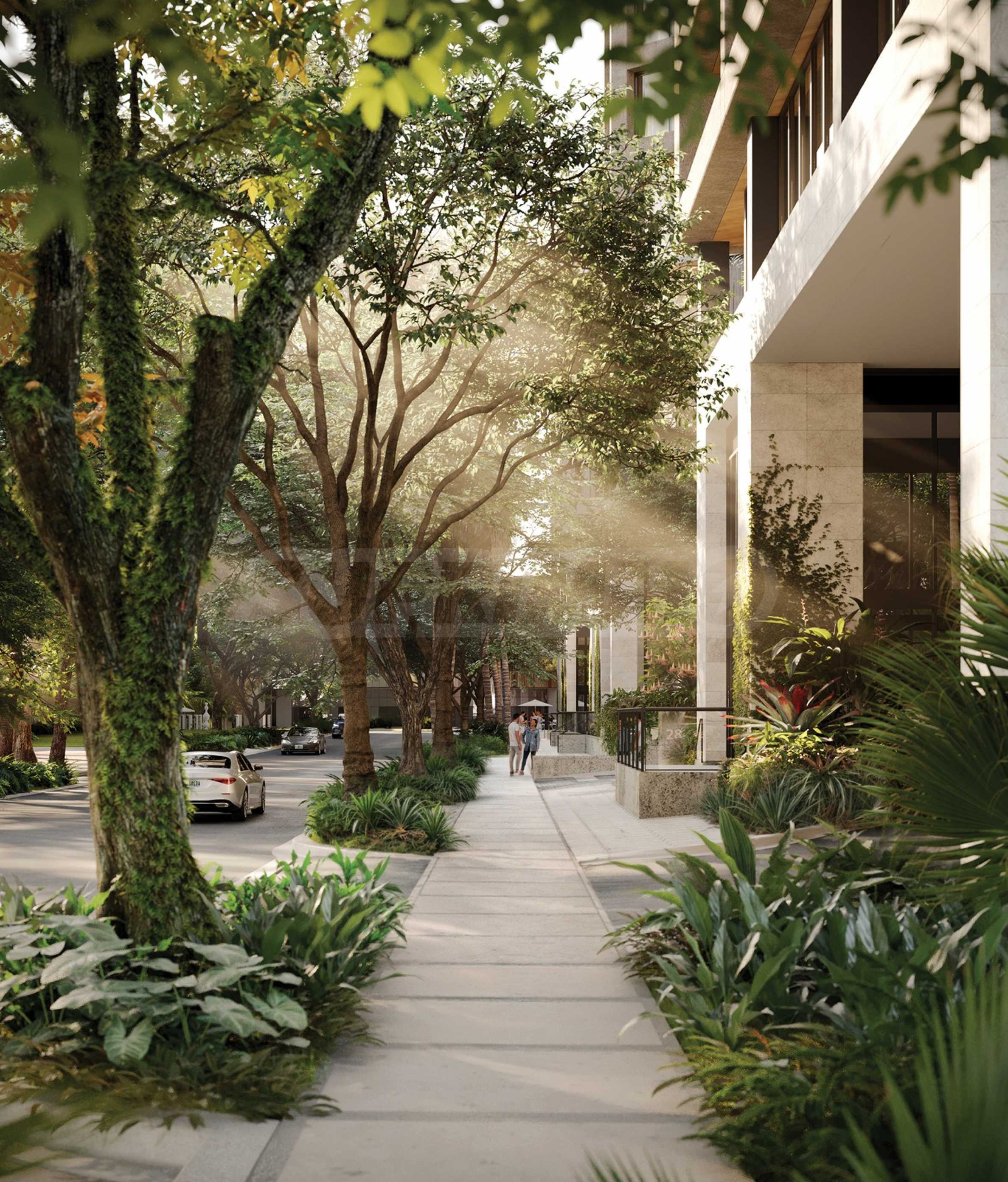 THE WELL Coconut Grove impresses with its contemporary architecture and elegant presence amidst the greenery of Coconut Grove. Angular glass facades capture soft sunlight, and lush landscaping creates a natural connection with the environment and a sense of tranquility upon arrival.