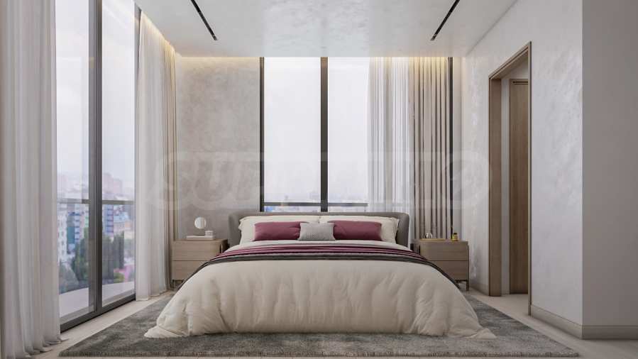 The presented apartment is located on the first residential floor and has a total area of 116.81 sq m. The space is filled with natural light thanks to the panoramic floor-to-ceiling windows and high ceilings, which create a feeling of spaciousness and airiness.