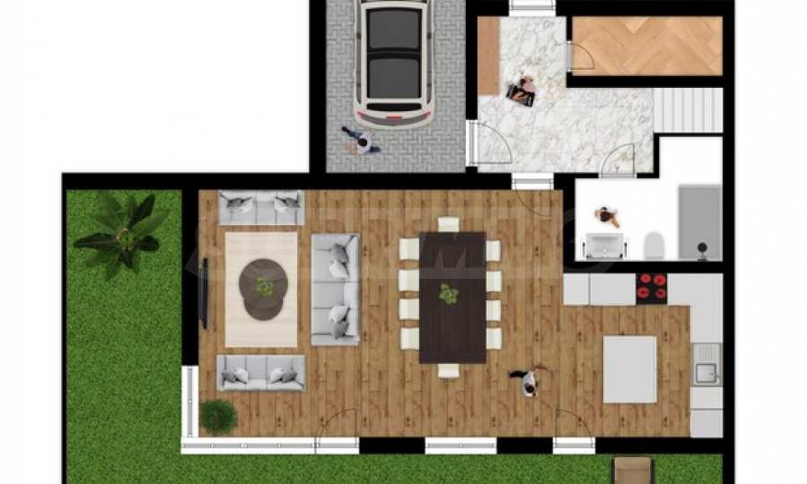 We present a two-storey house in a new boutique complex, located in the land of the village of Markovo, Plovdiv region - one of the most preferred locations at the foot of the Rhodope Mountains. The place combines tranquility and fresh air of the natural environment with quick and convenient access to Plovdiv.