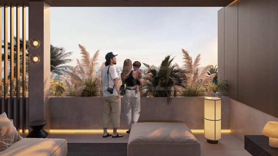The villas are arranged over three levels, clearly separating social and private areas. The ground floor features a spacious open-plan living room with kitchen and dining area, seamlessly connected to a sunny veranda with a private swimming pool and elegant lounge space with shaded sunbeds. The second floor includes two comfortable bedrooms, each with its own en-suite bathroom. The third level hosts the third bedroom and an impressive rooftop terrace with lounge furniture and a jacuzzi – an ideal setting for evening relaxation under the open sky. One of the available villas even includes a private elevator – a high-end feature that enhances both convenience and property value.