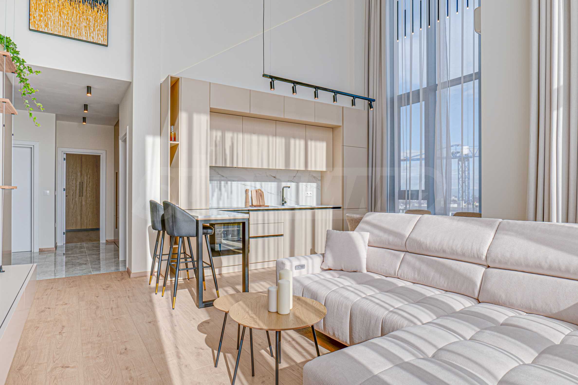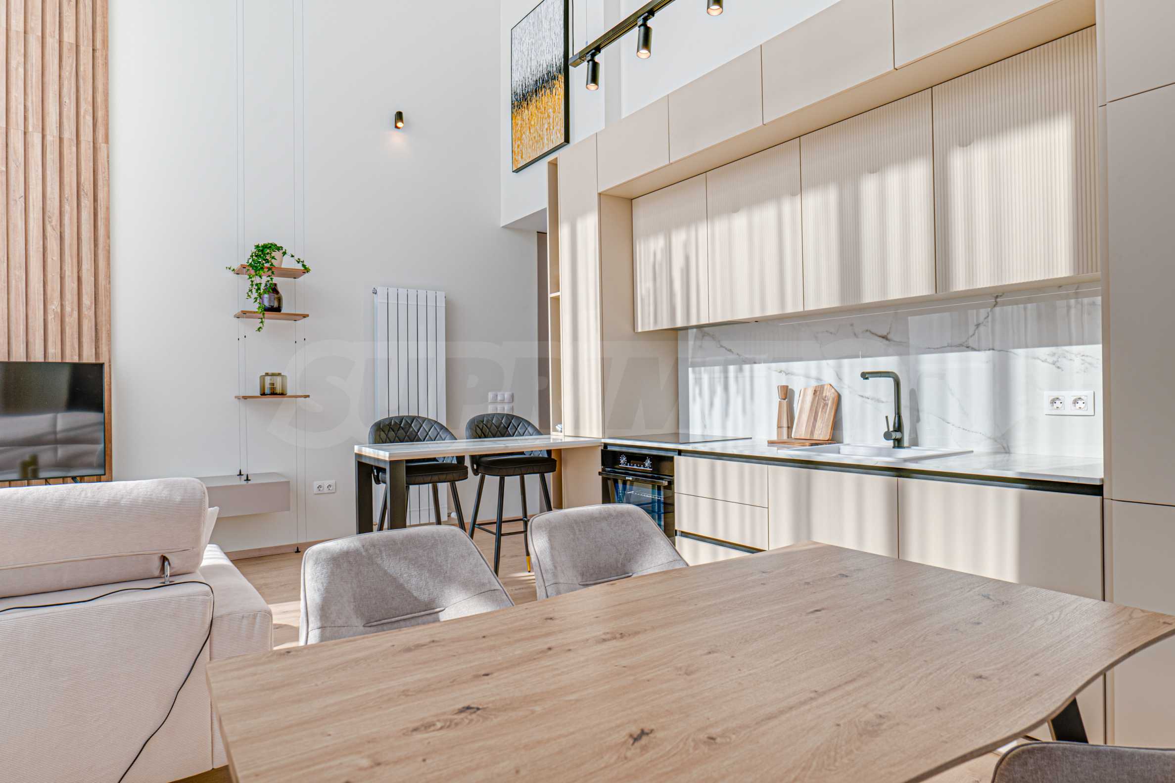 • living room with dining room and kitchenette with a ceiling height of 5 meters.
