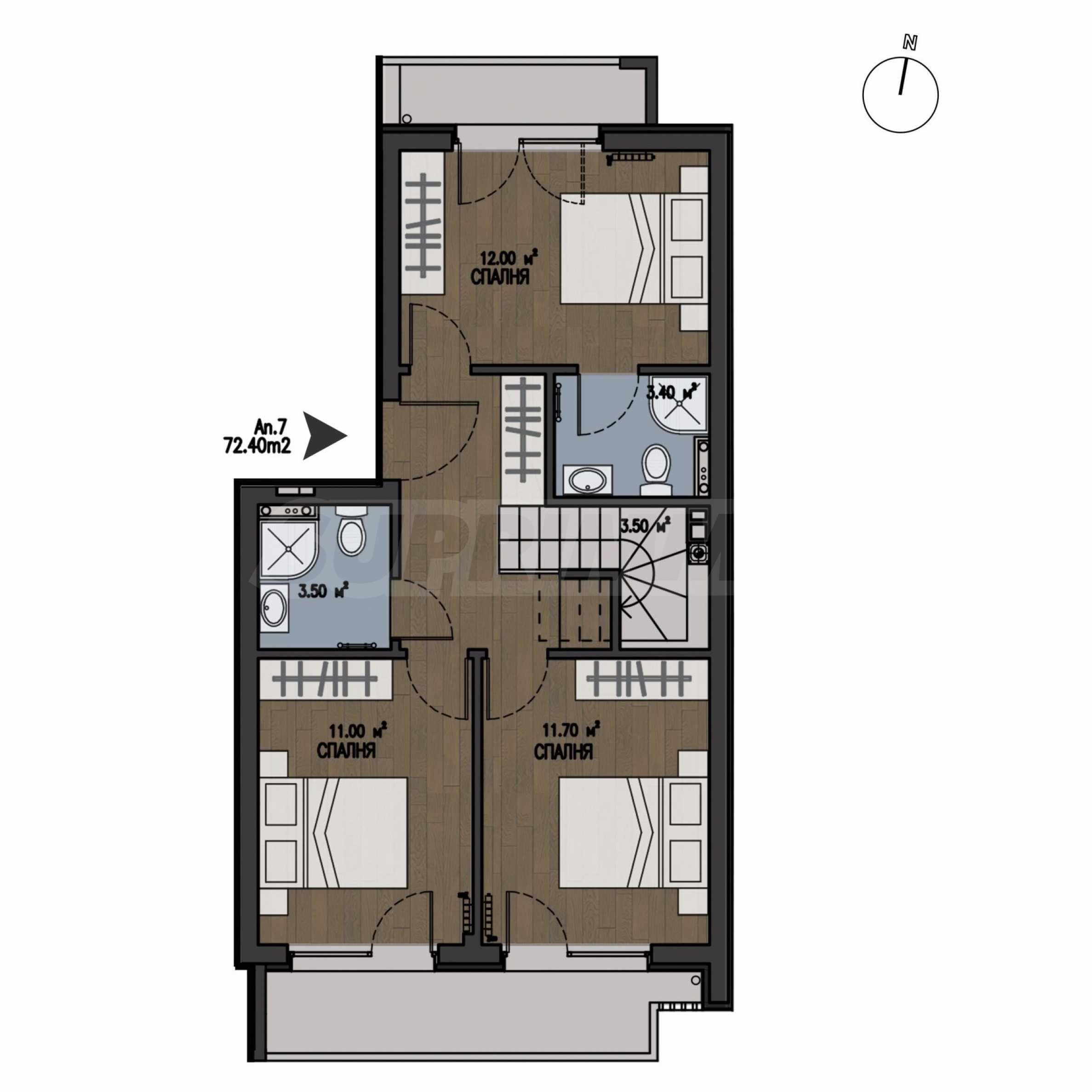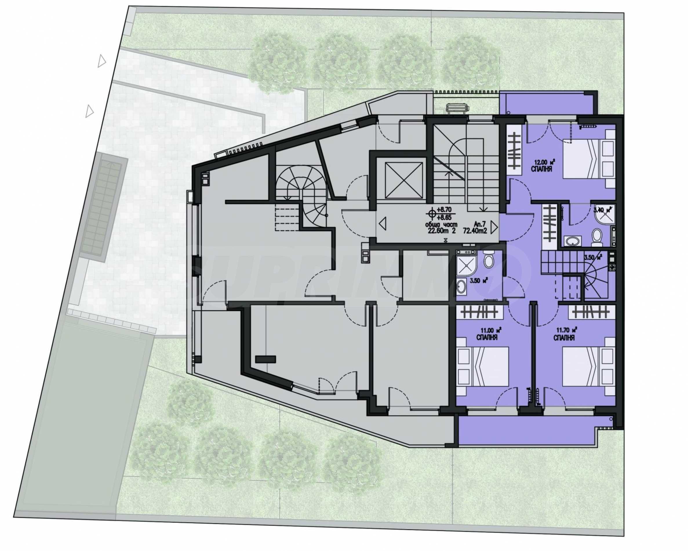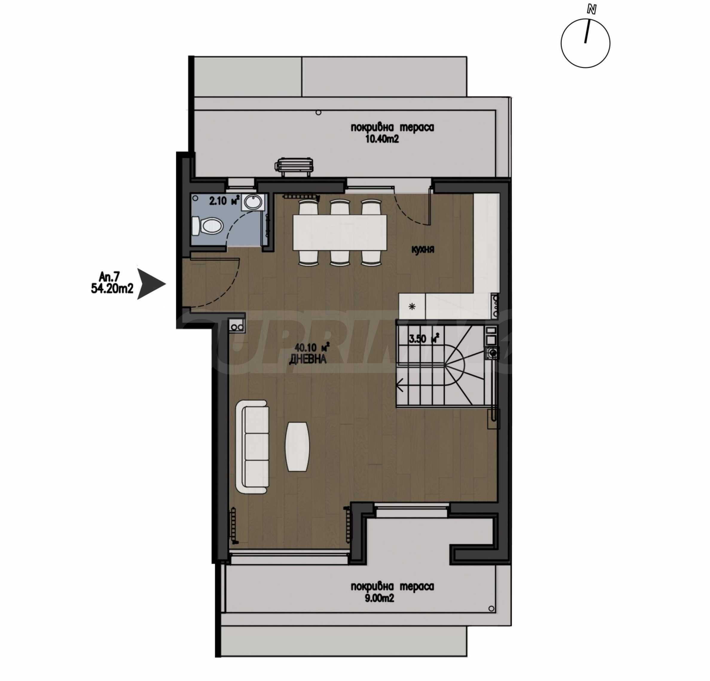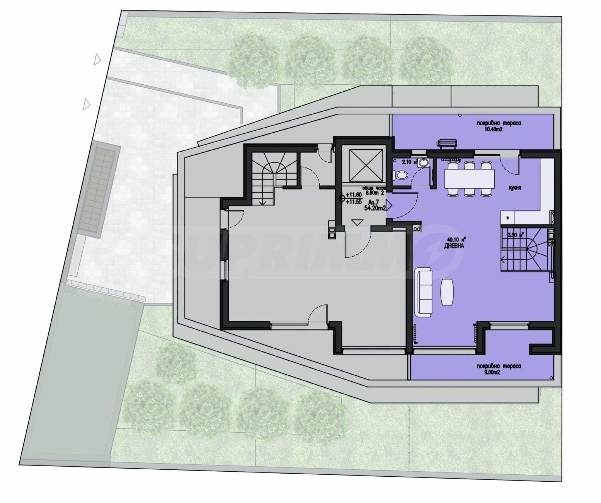 The apartment is a maisonette type, located on the fourth and fifth floors (elevation +8.70 and +11.60) and has a built-up area of 151.20 sq m, with a BONUS roof terrace of about 50 sq m (in addition to the terraces in the property), which will be partially landscaped.
