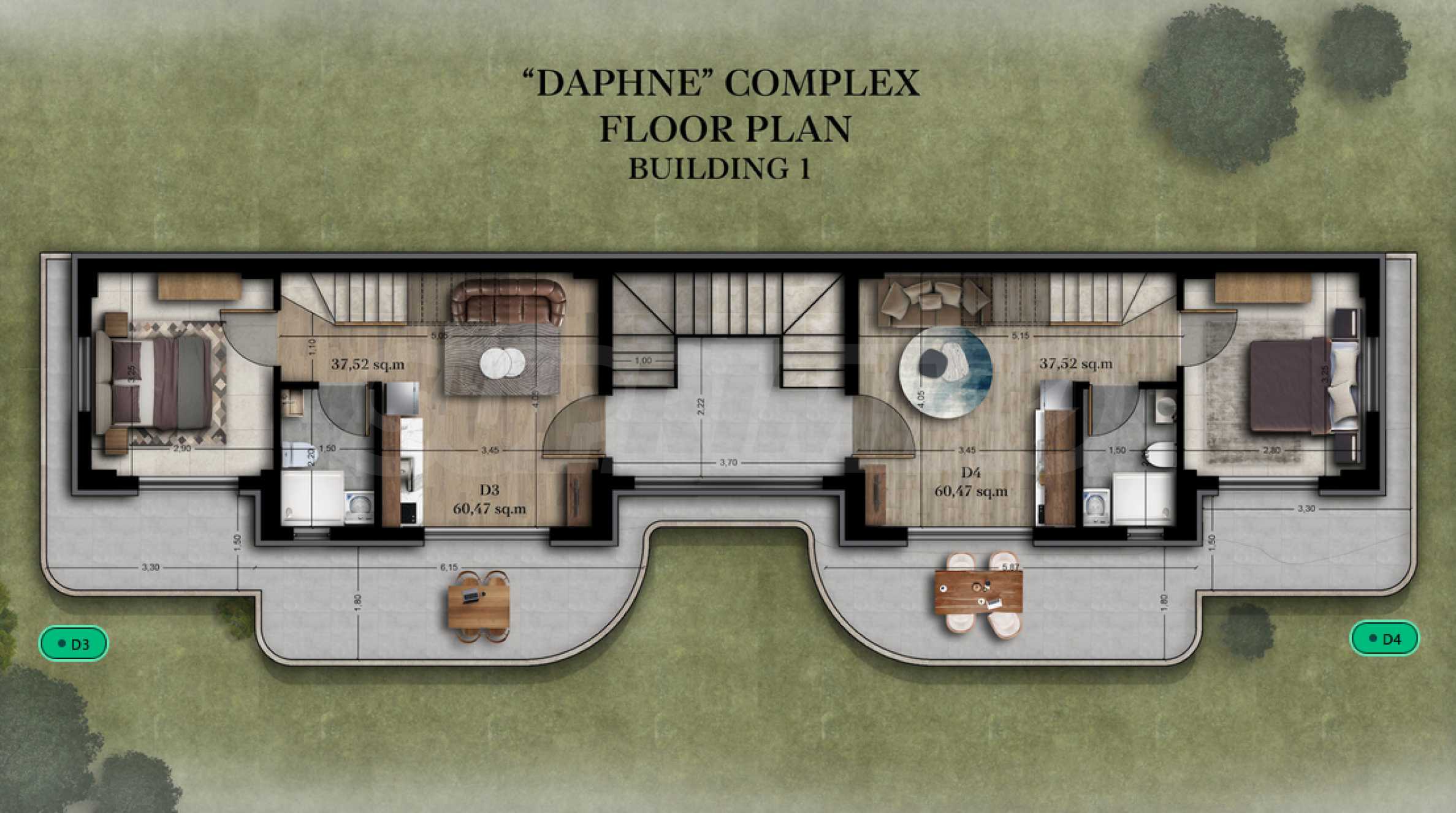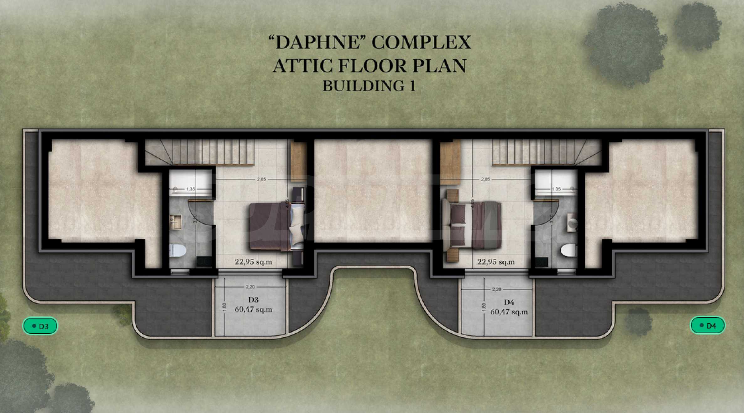 The apartment we present to you is comfortable and functional, located on the second and third floors of the building, with a total area of 60.47 sq m. The apartment is designed with attention to practicality and convenience in everyday life, including a bright living room, two bedrooms with private bathrooms and two terraces - pleasant outdoor spaces that naturally expand the living area and create a feeling of peace and coziness.