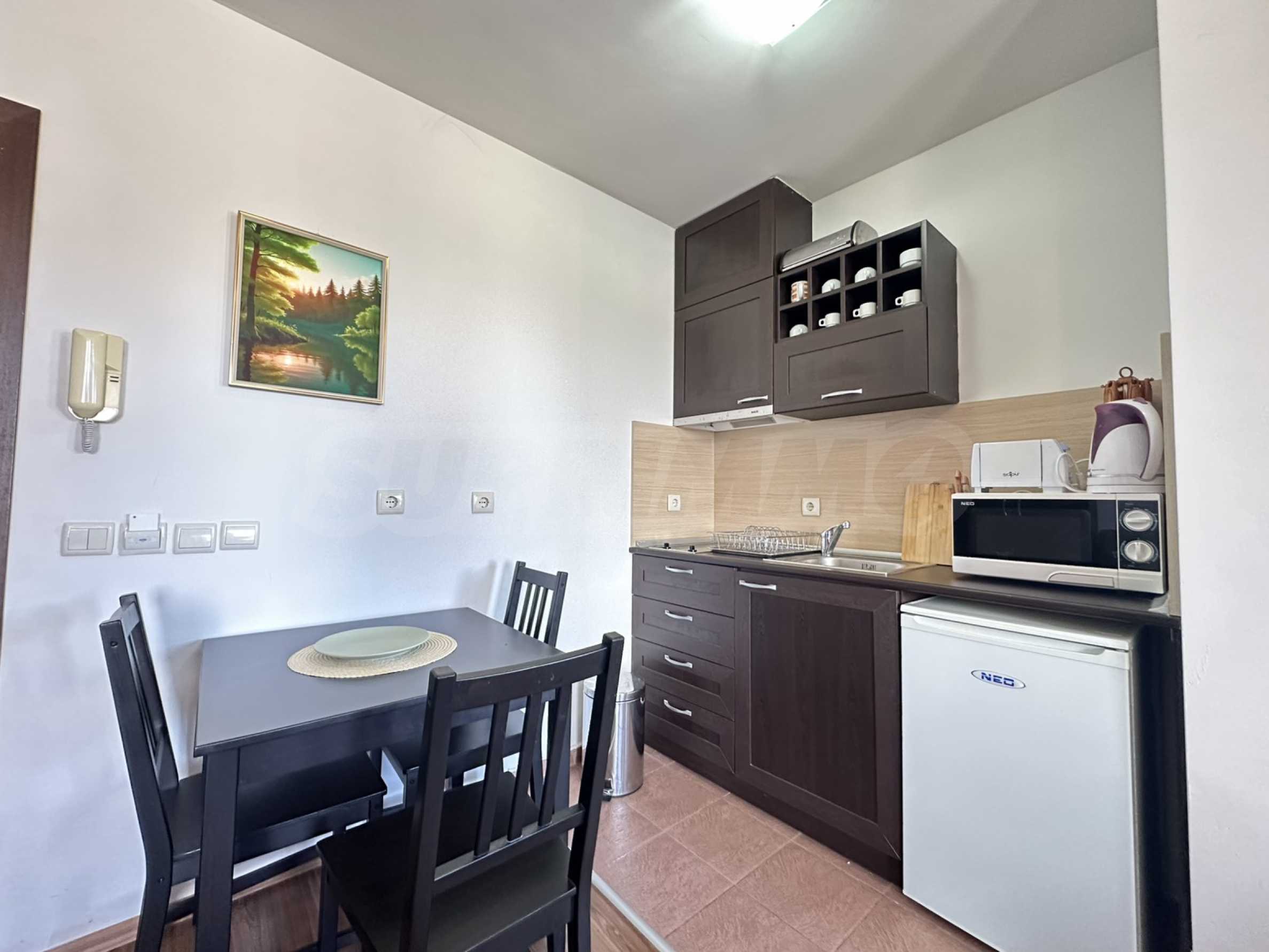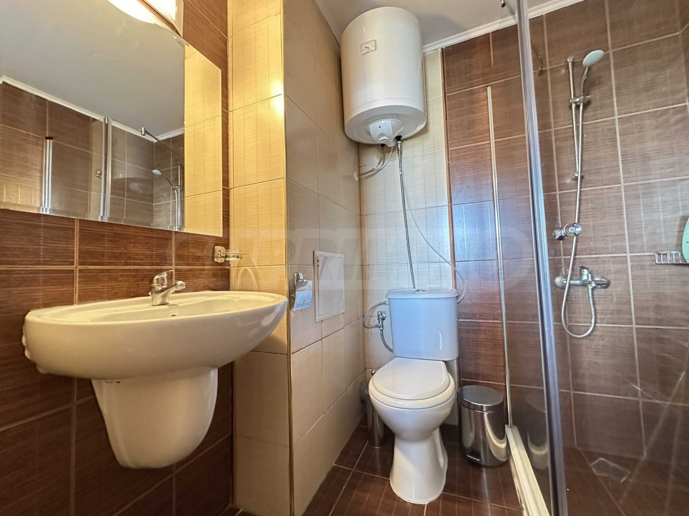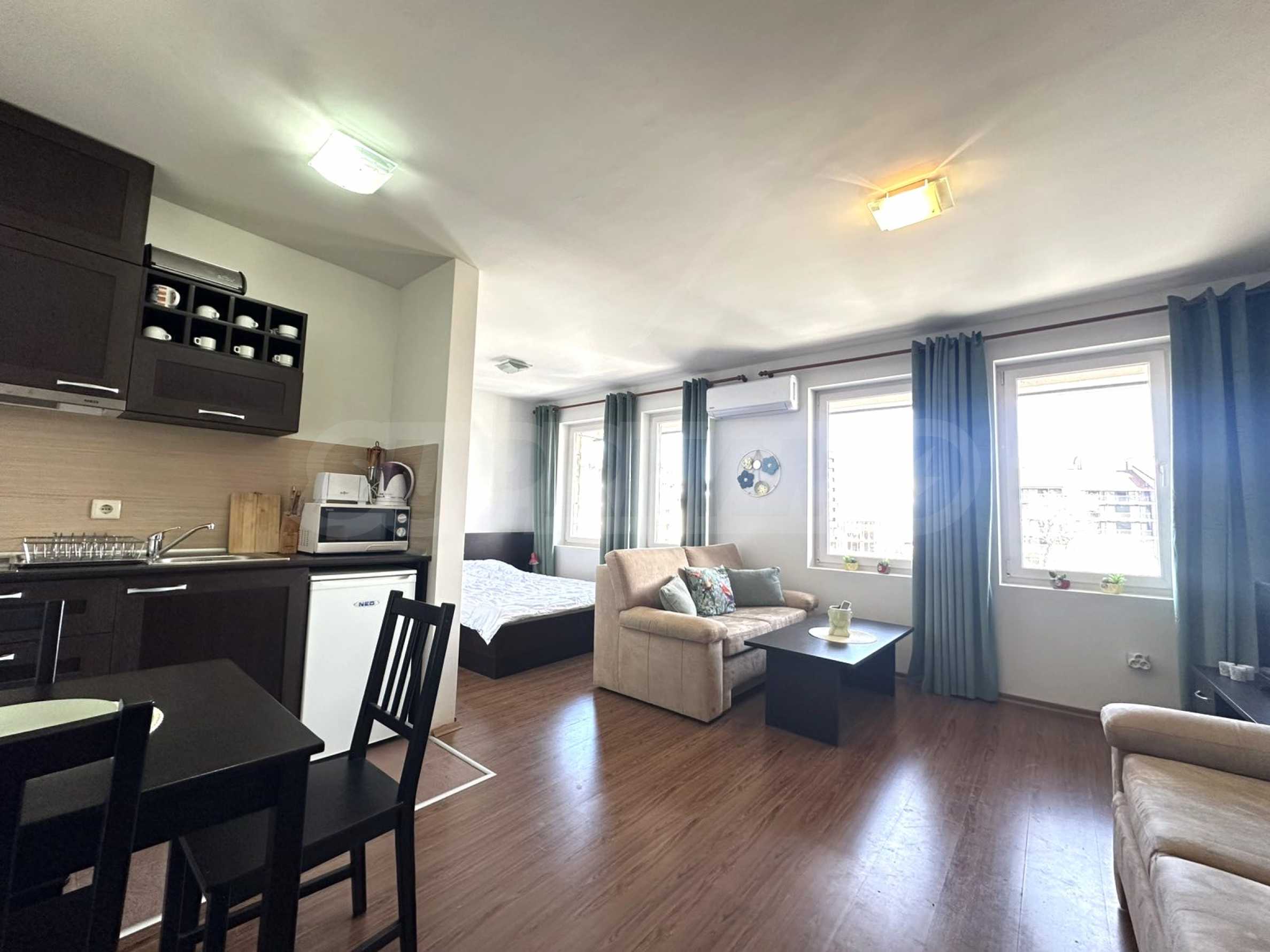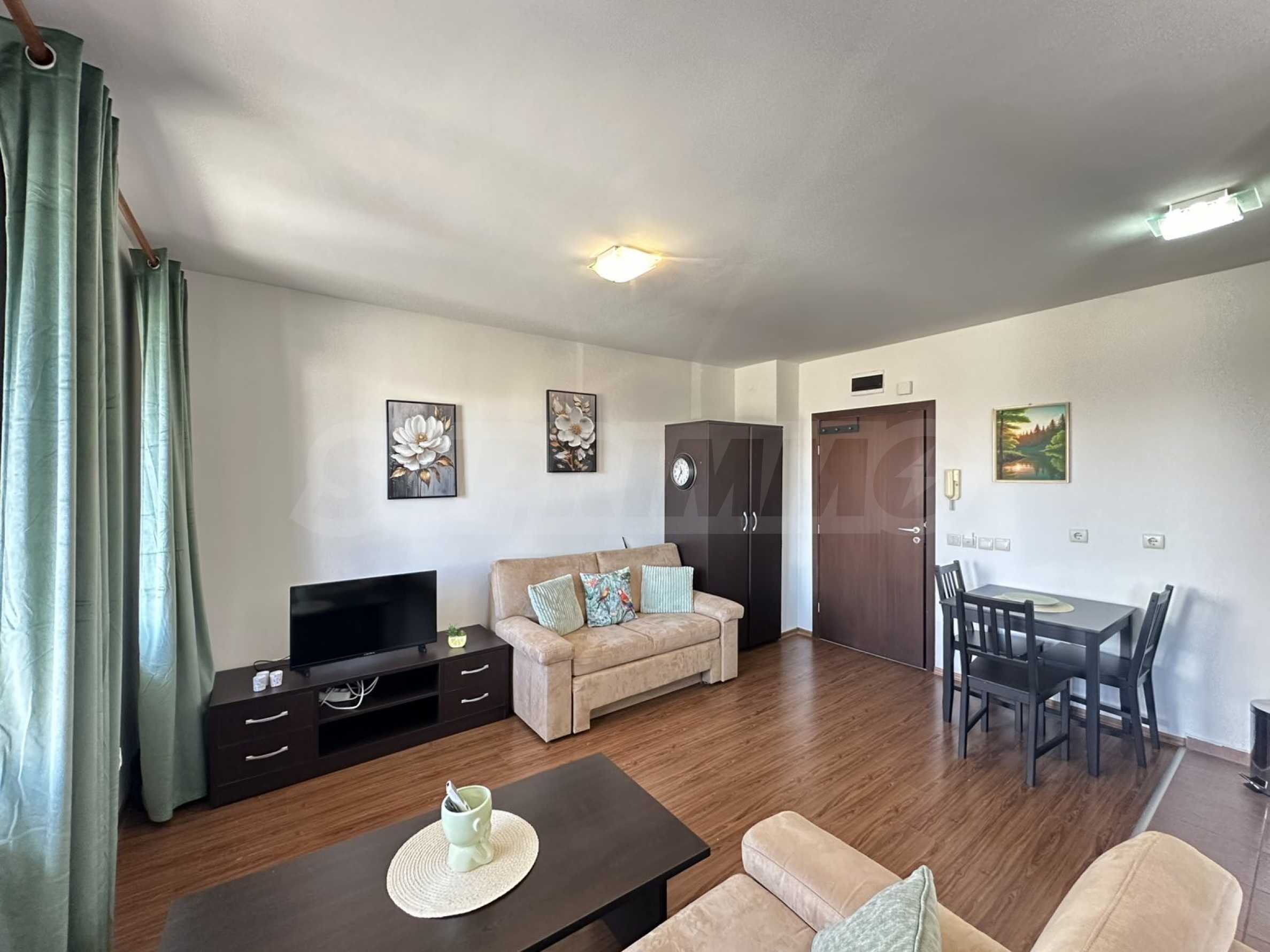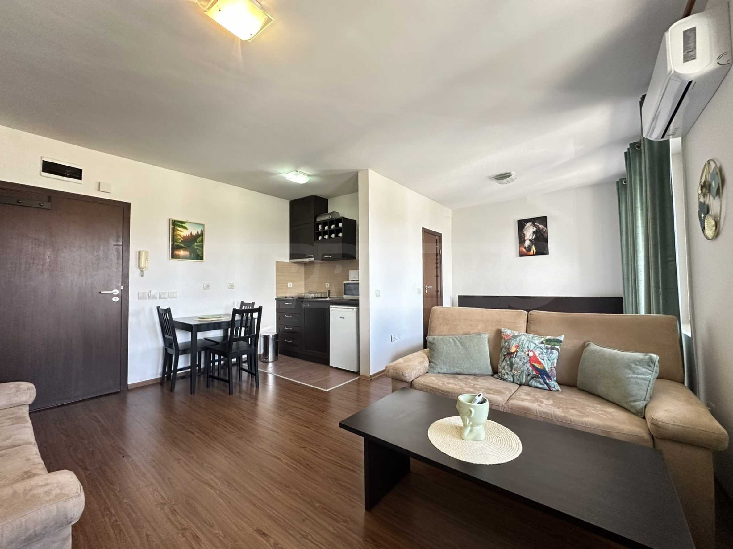 We present a spacious studio in the gated complex Bansko Royal Towers with a 5,000 m2 meadow with a children's playground and an outdoor pool, 100 meters from the gondola lift.