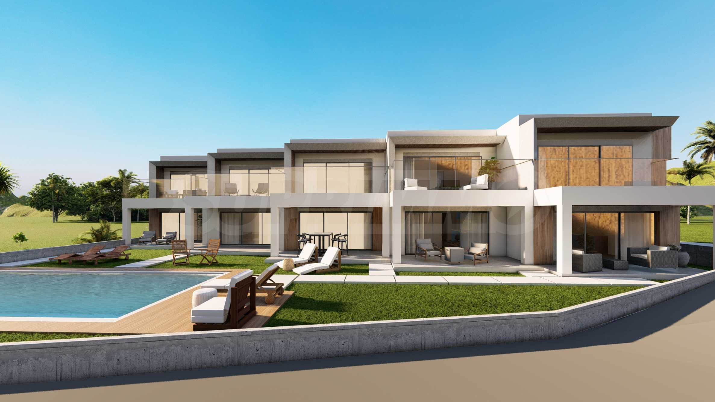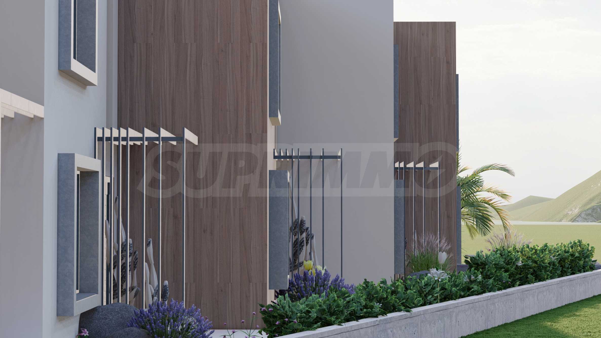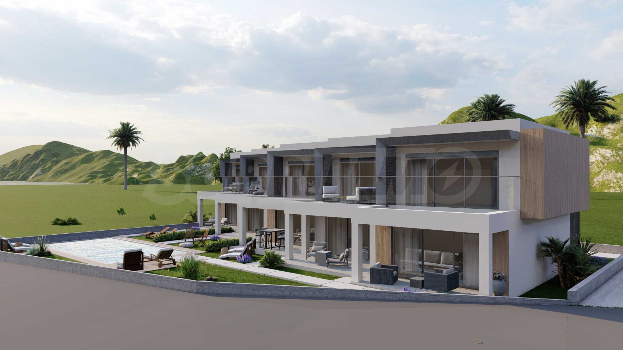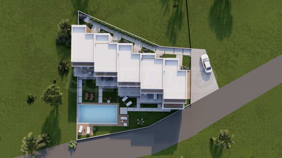 The development is positioned on top of a hill in Karyani, ensuring stunning panoramic sea views from all villas. The exterior is carefully designed with clean, straight lines, characteristic of contemporary architecture. High-quality materials have been used throughout the construction, ensuring durability and long-term value, while the well-maintained landscaped garden enhances the overall aesthetic of the development.