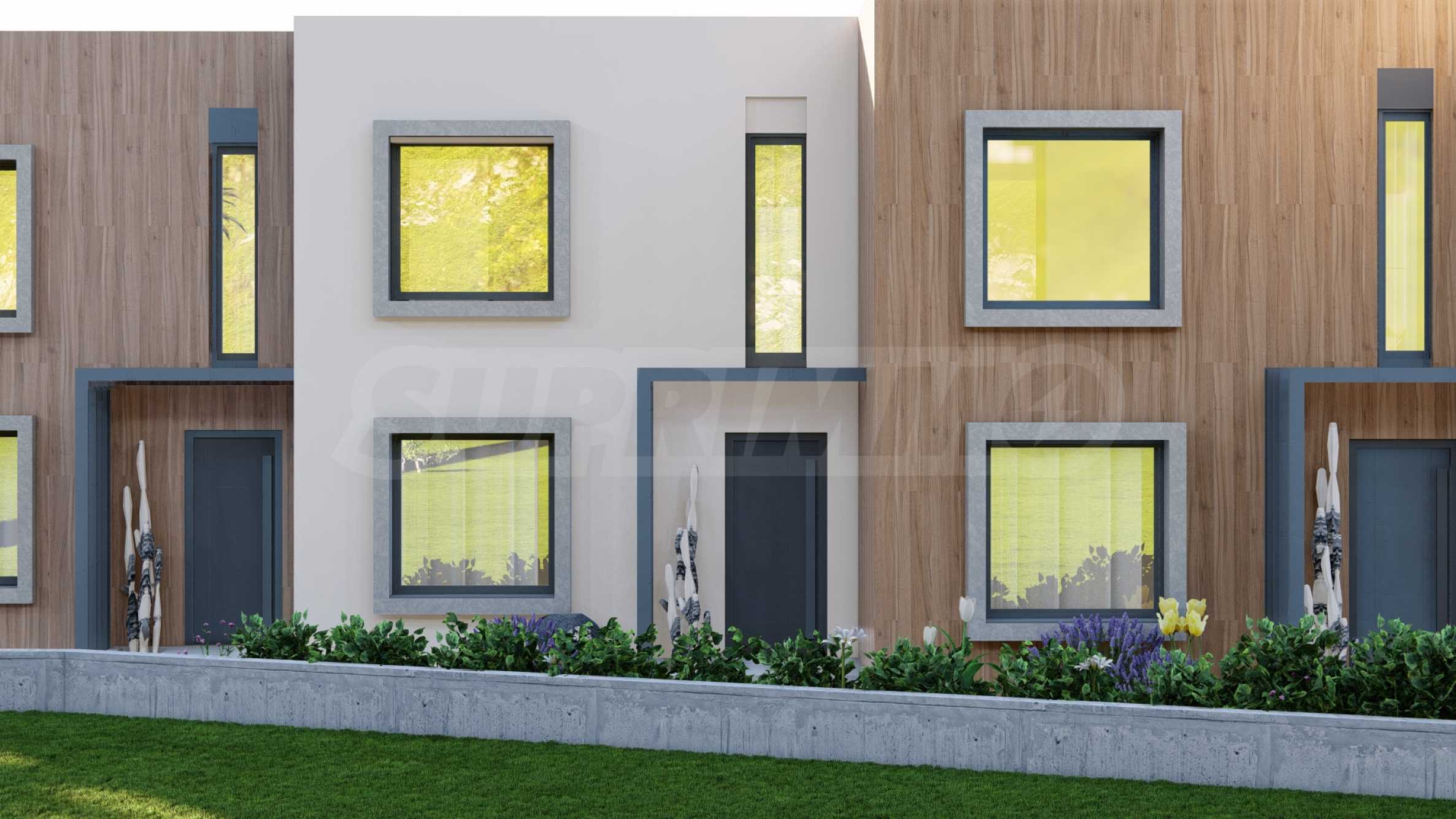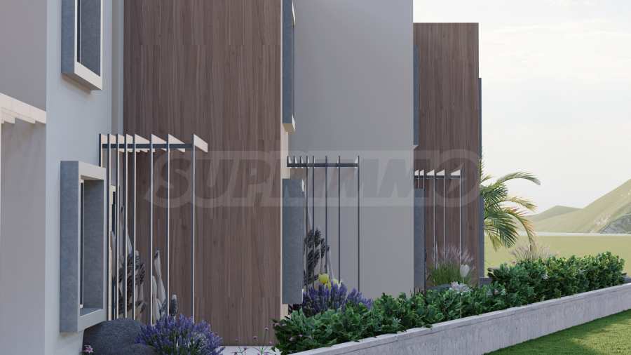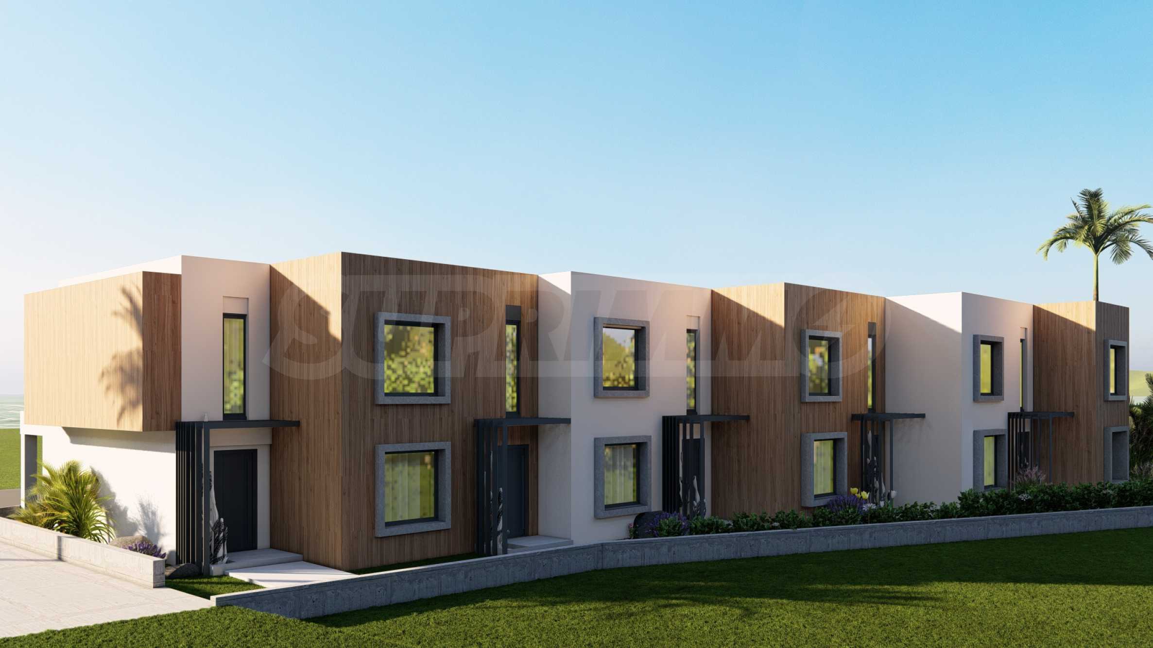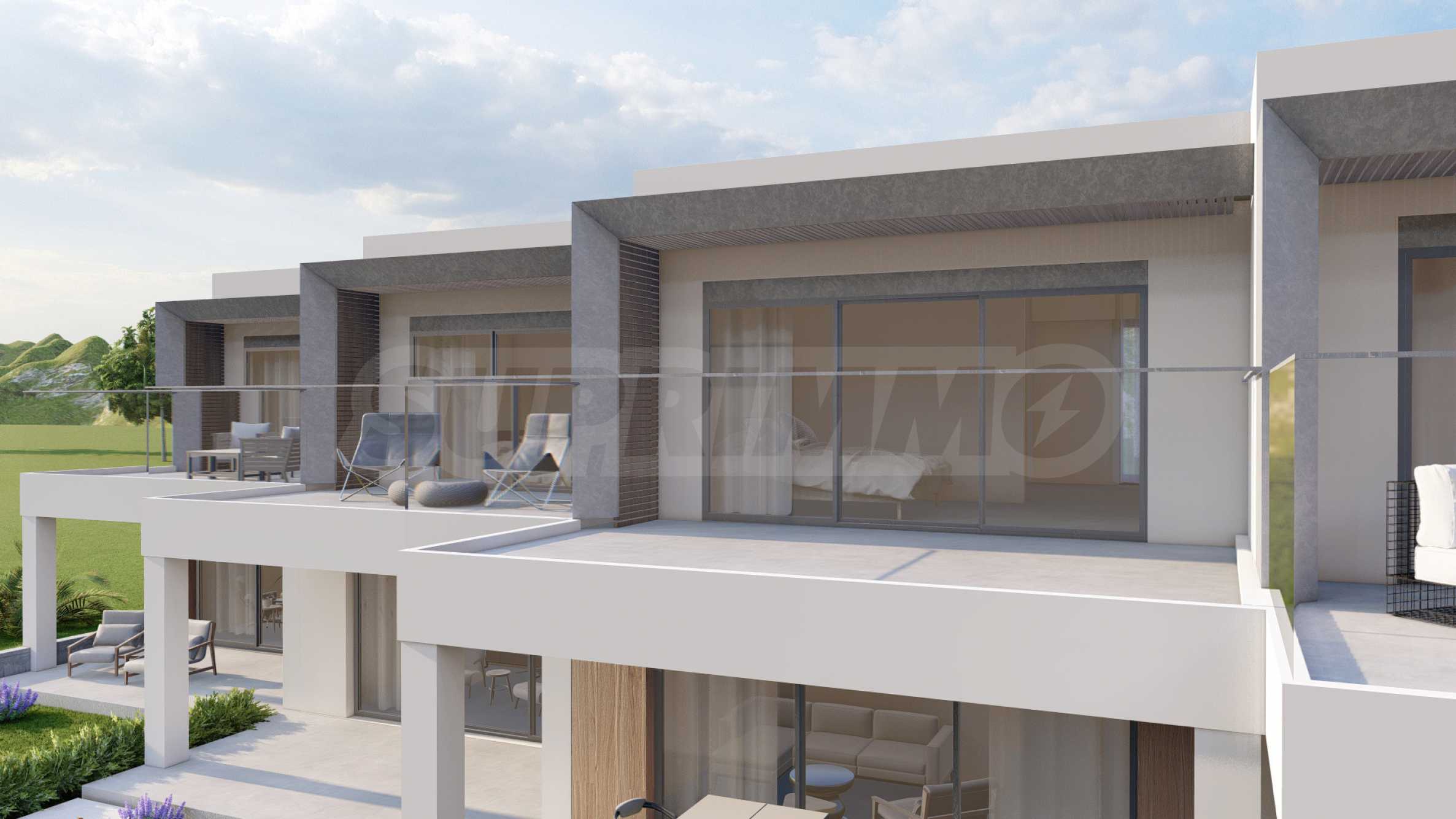 The villas feature functional layouts, with the first level comprising a living room with kitchen and dining area, a bedroom, and a bathroom with toilet. The second level includes two bedrooms, each with its own bathroom and terrace. The properties are delivered fully finished “turnkey,” with installed entrance and interior doors, flooring, lighting, fitted kitchens, and fully equipped bathrooms.