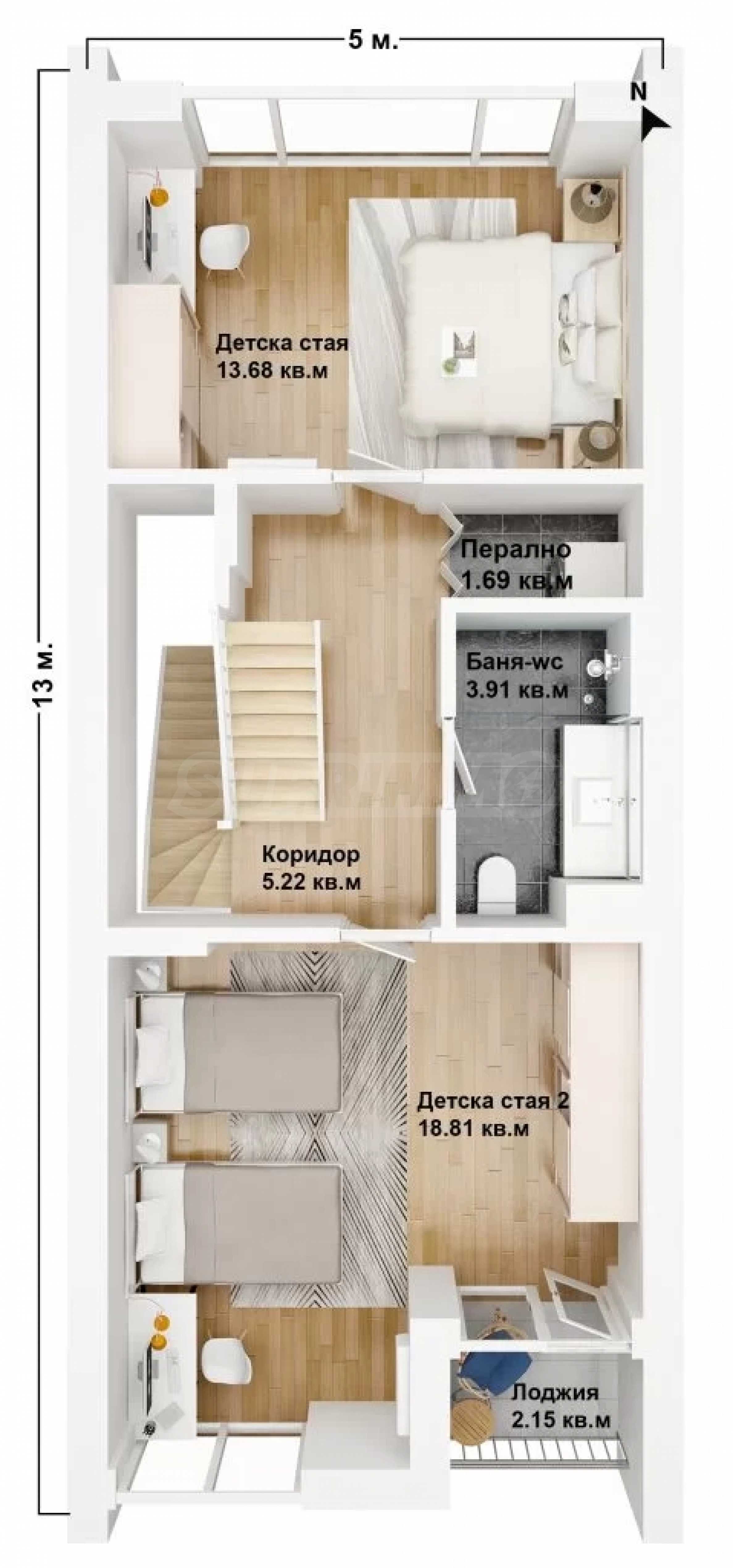 1st level – two bedrooms, laundry room, loggia, bathroom with toilet – 62.52 sq m;