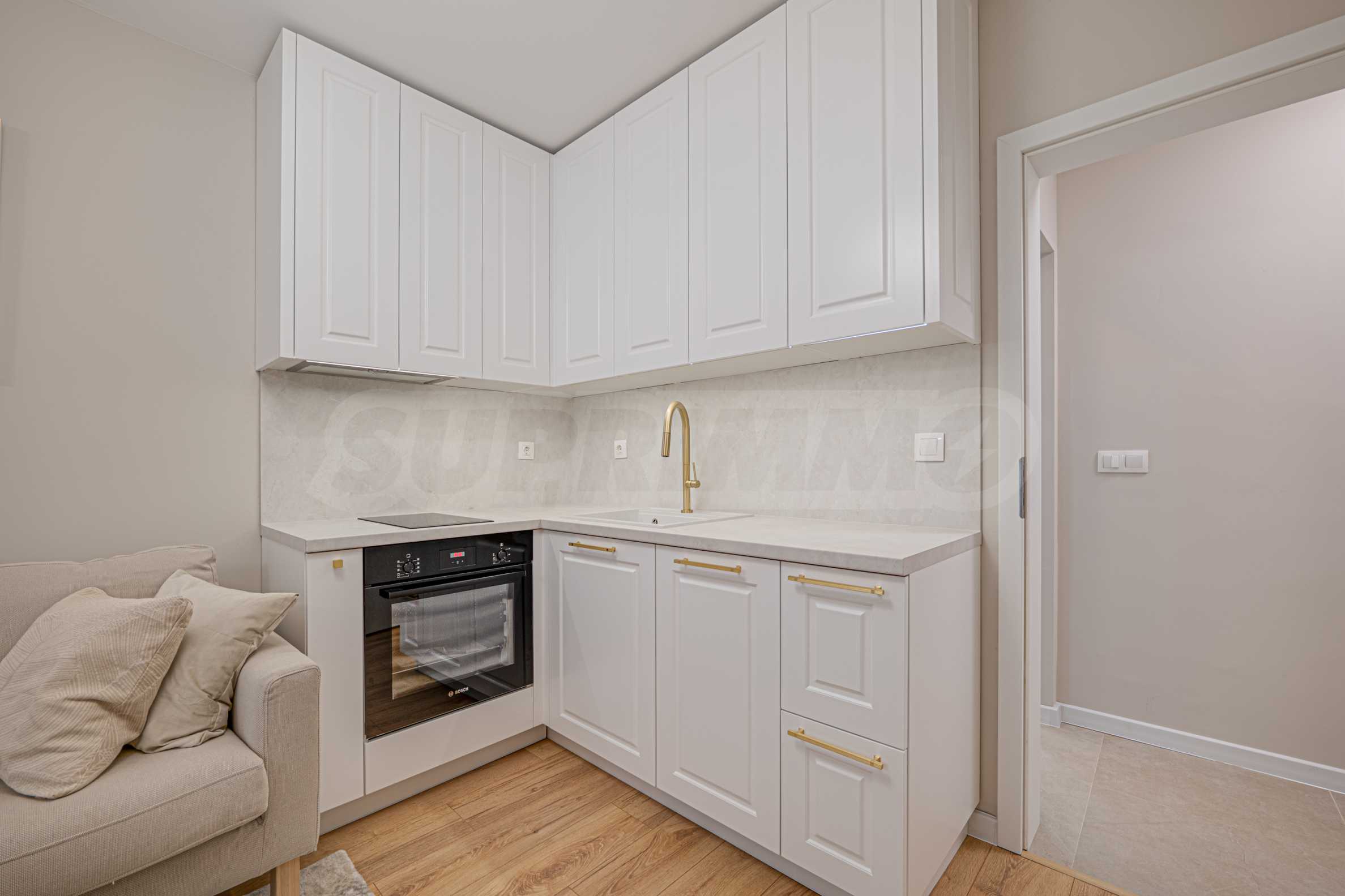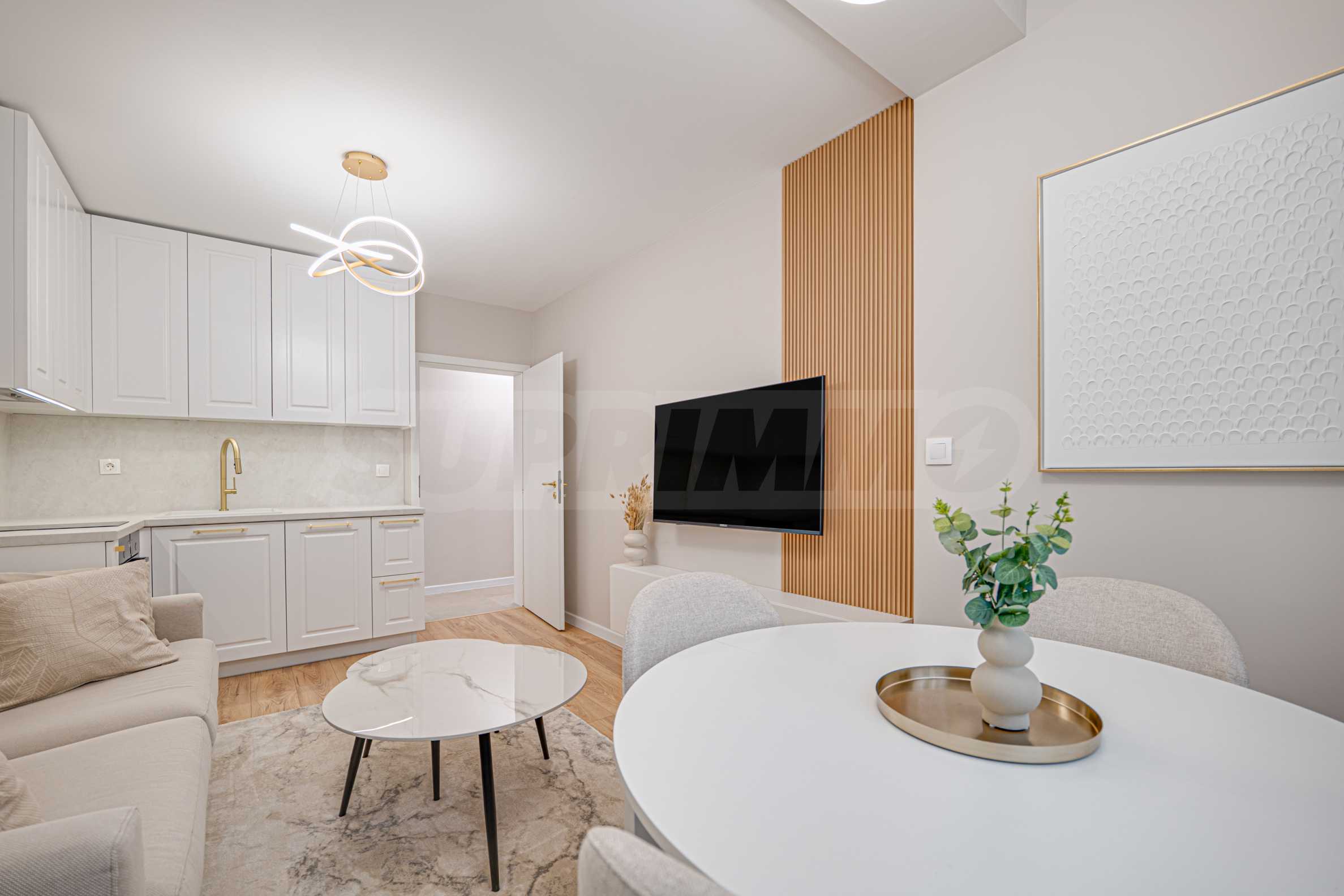 The apartment consists of an entrance hall, a bright living area with a dining area and a kitchenette, a cozy bedroom and a bathroom with a toilet. The kitchen is fully equipped with high-end appliances, including a dishwasher.