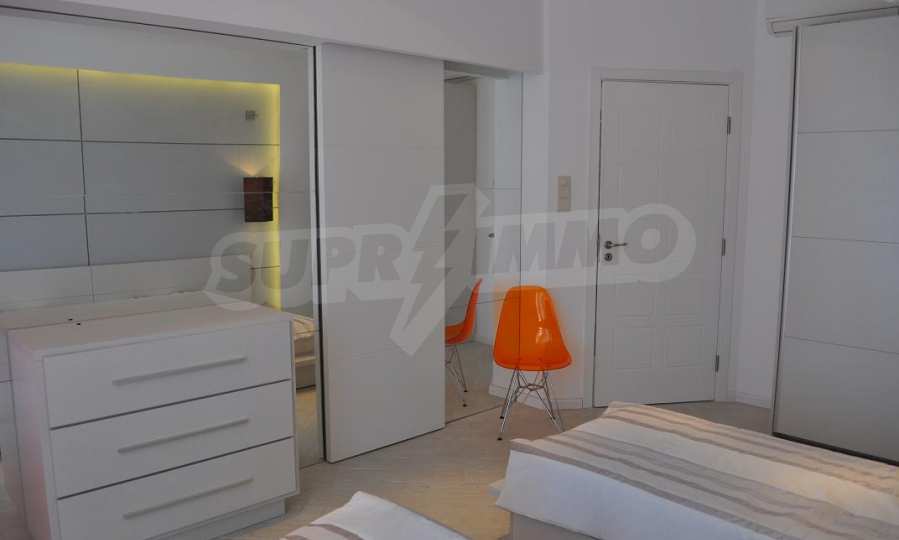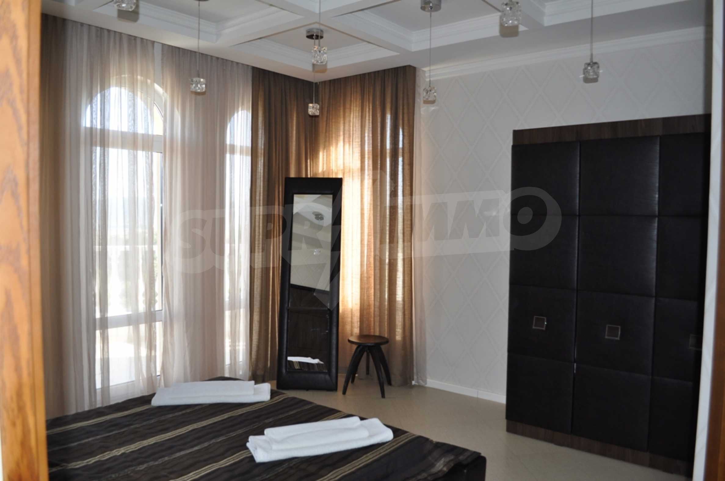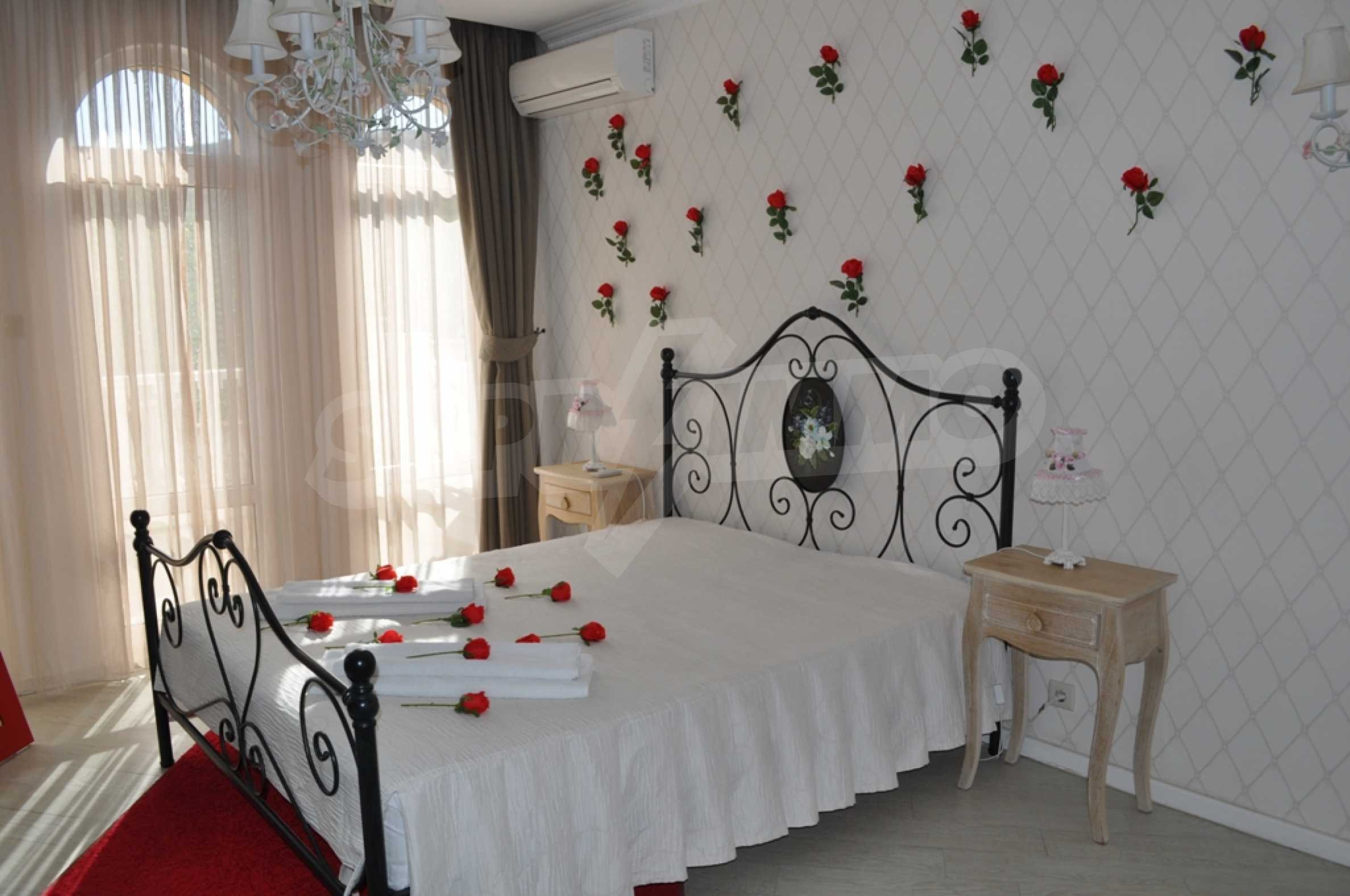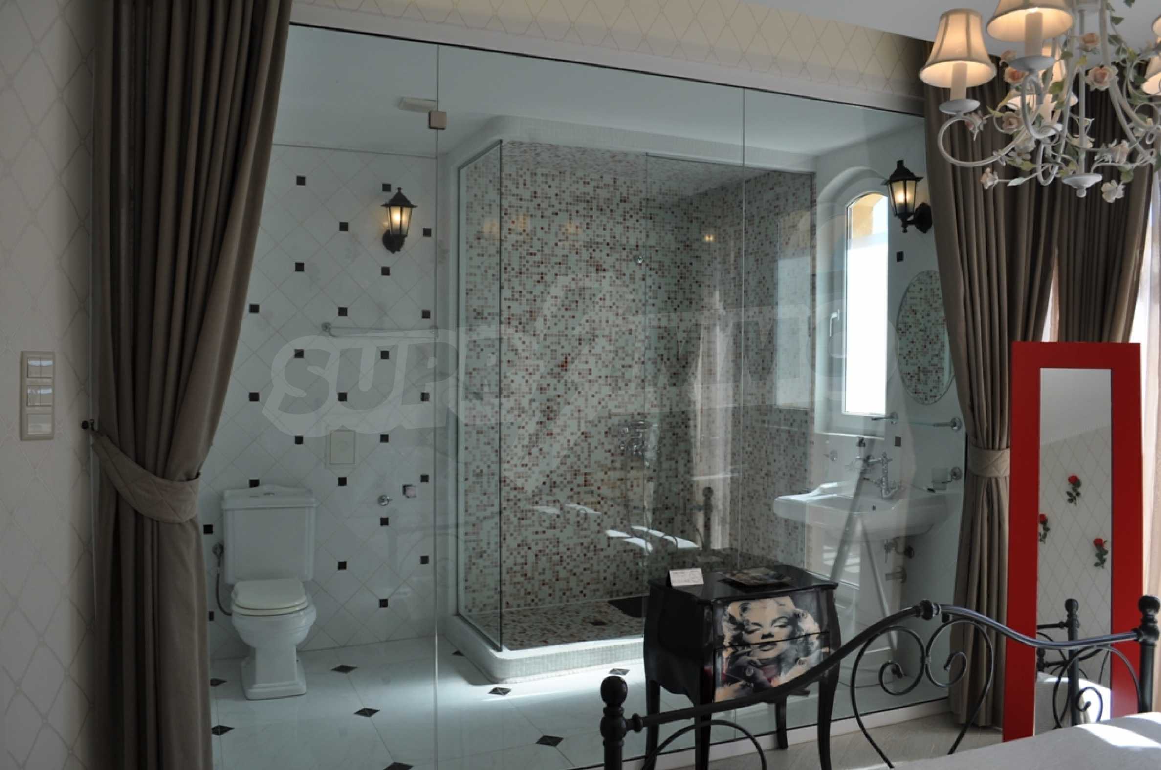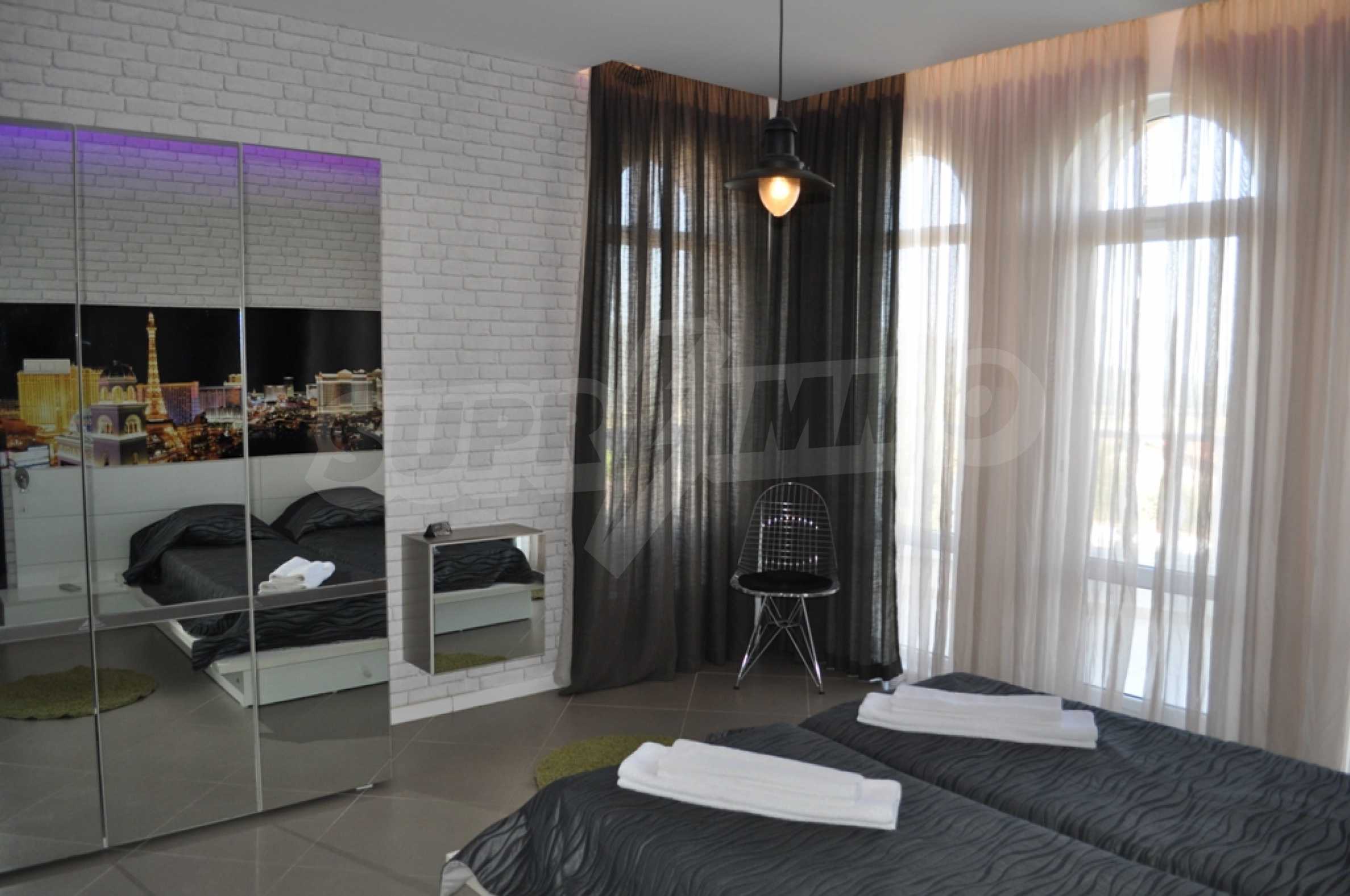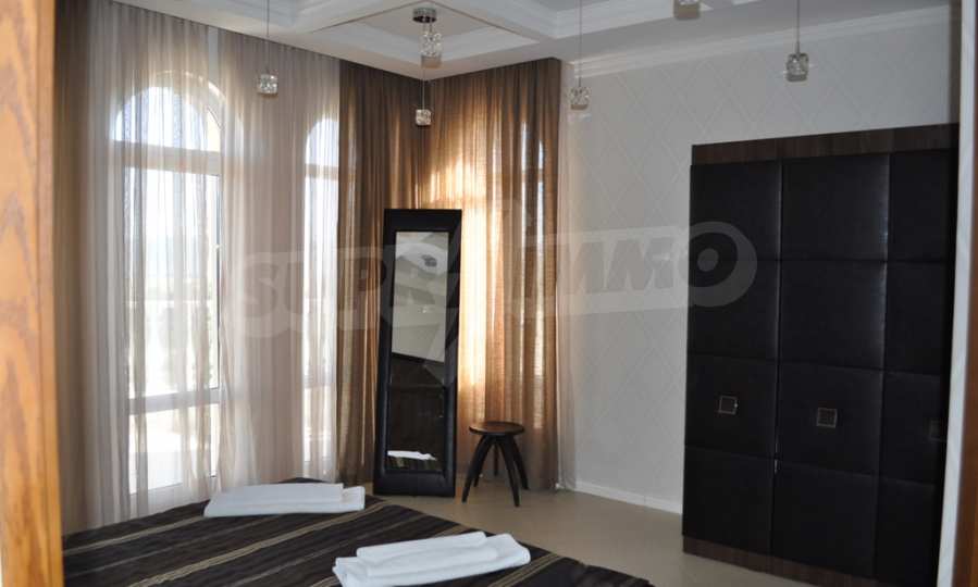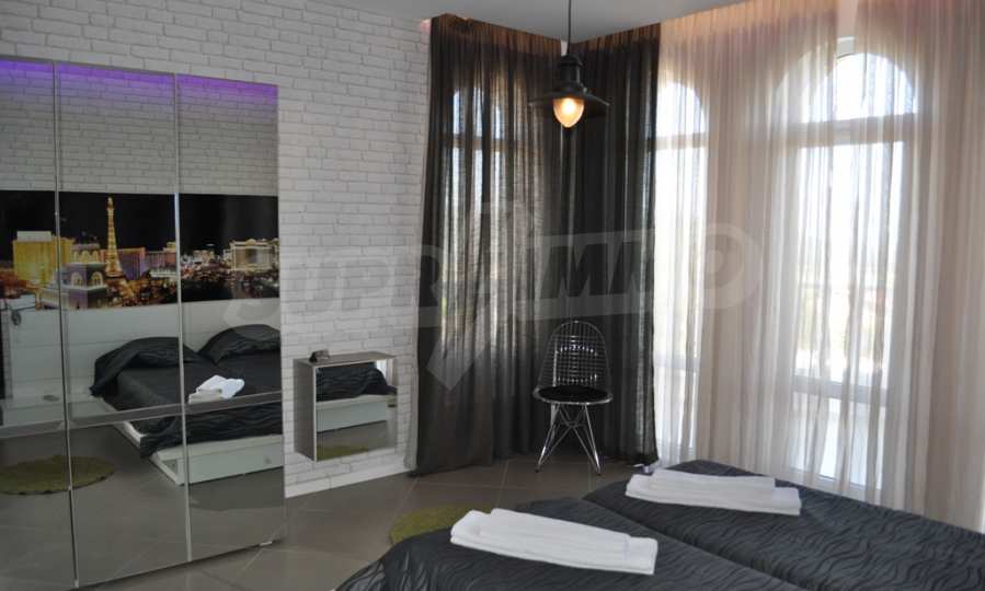 Villa "Sinatra" has 3 bedrooms with double beds and 2 bedrooms with 2 single beds, offering maximum comfort and accommodation for 10 guests. Each bedroom is luxuriously furnished in the style of one of the icons of Las Vegas or symbols of the city, with its own bathroom and access to a terrace. Three of the bedrooms have access to a large sunny veranda with a wonderful panoramic view of Albena.