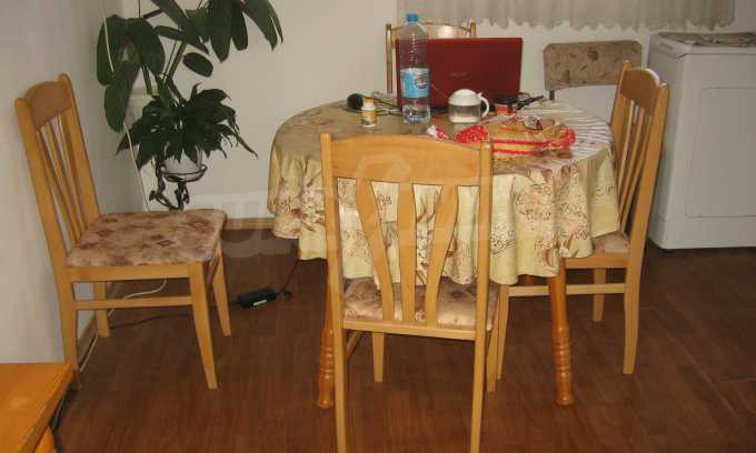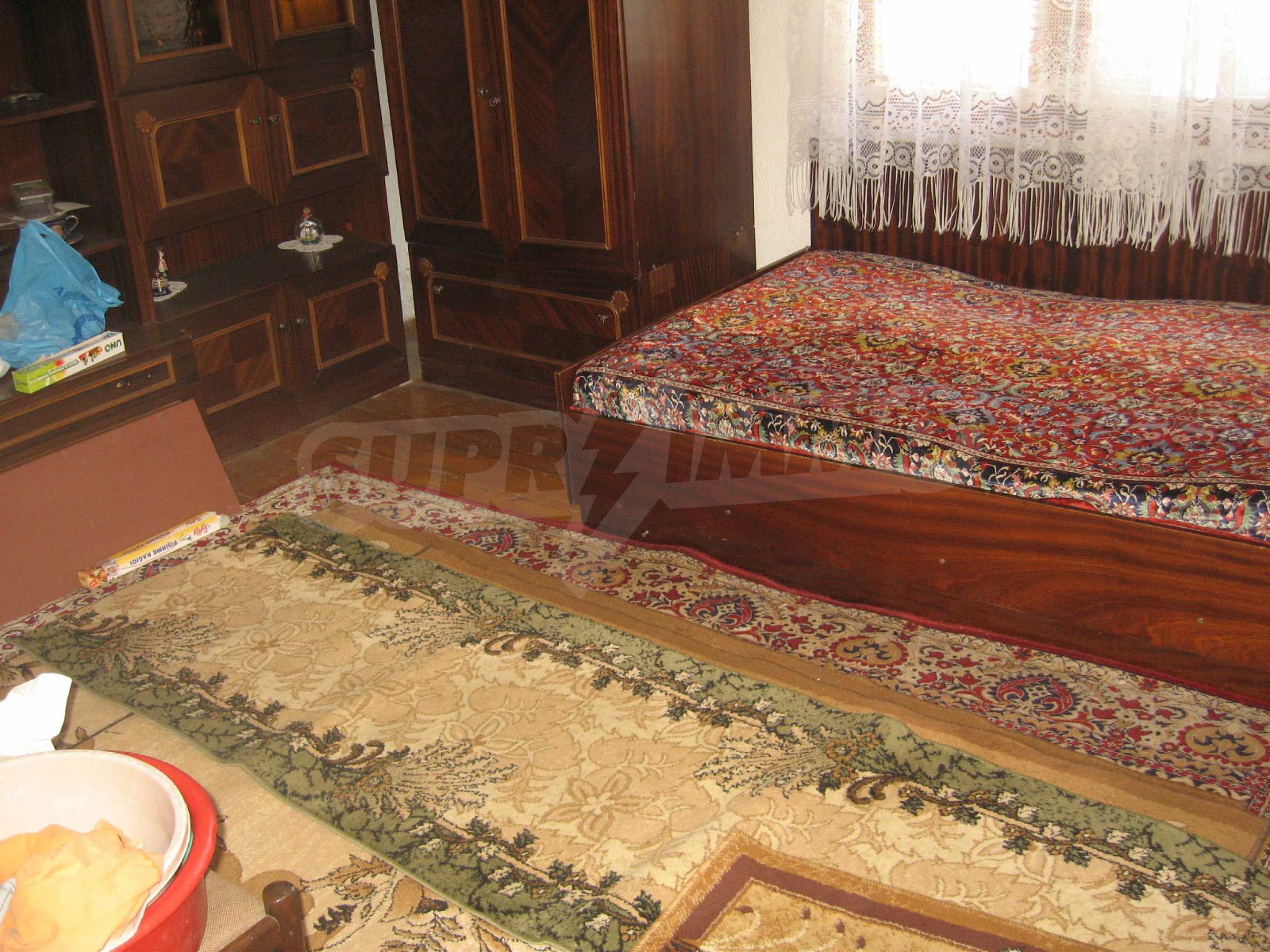 First floor with two entrances - the first entrance - a staircase, a hallway, a kitchen with dining area, a living room - bedroom, a bathroom with WC and the second entrance - a glazed entrance hall, a room, a kitchen, a bathroom with WC. The flooring is with laminate and wood, the window frames are wooden and the plasters are strong.