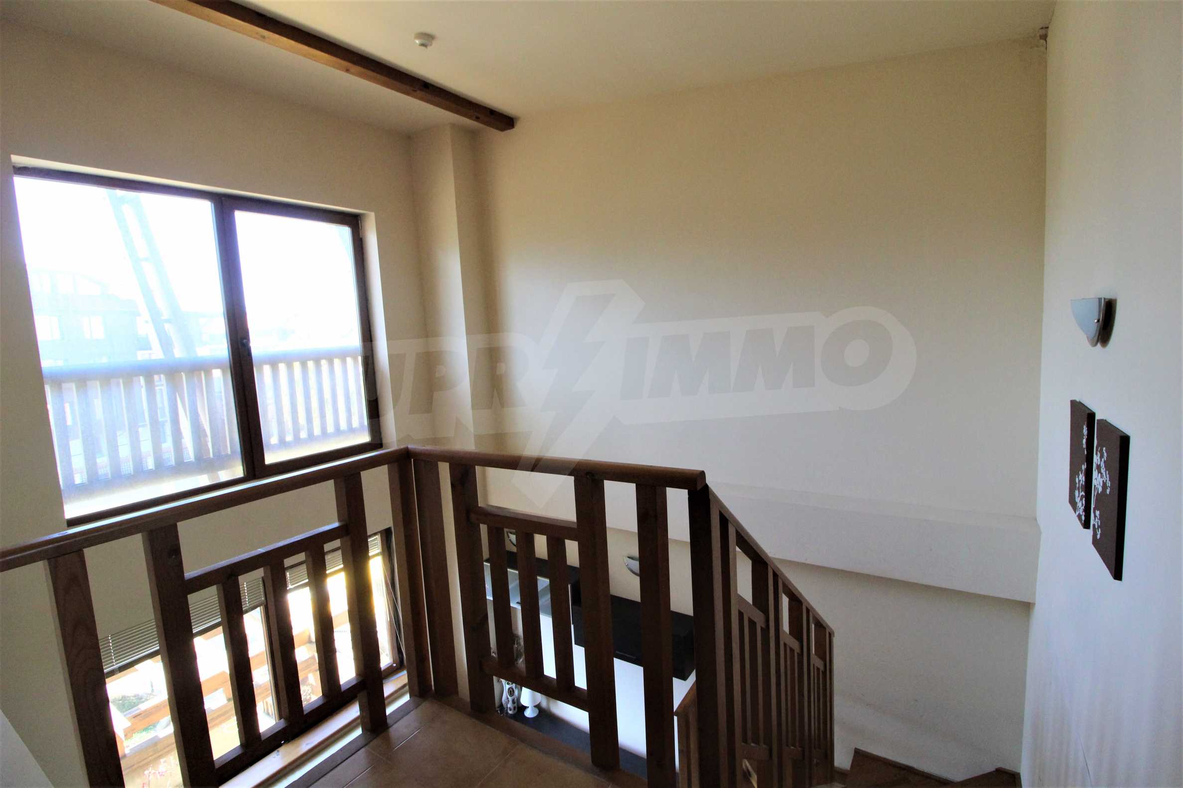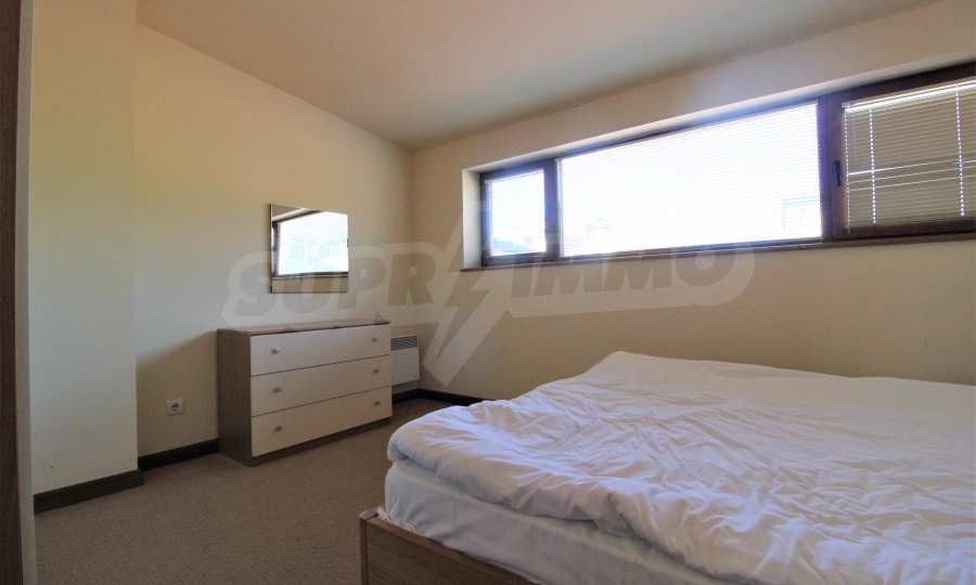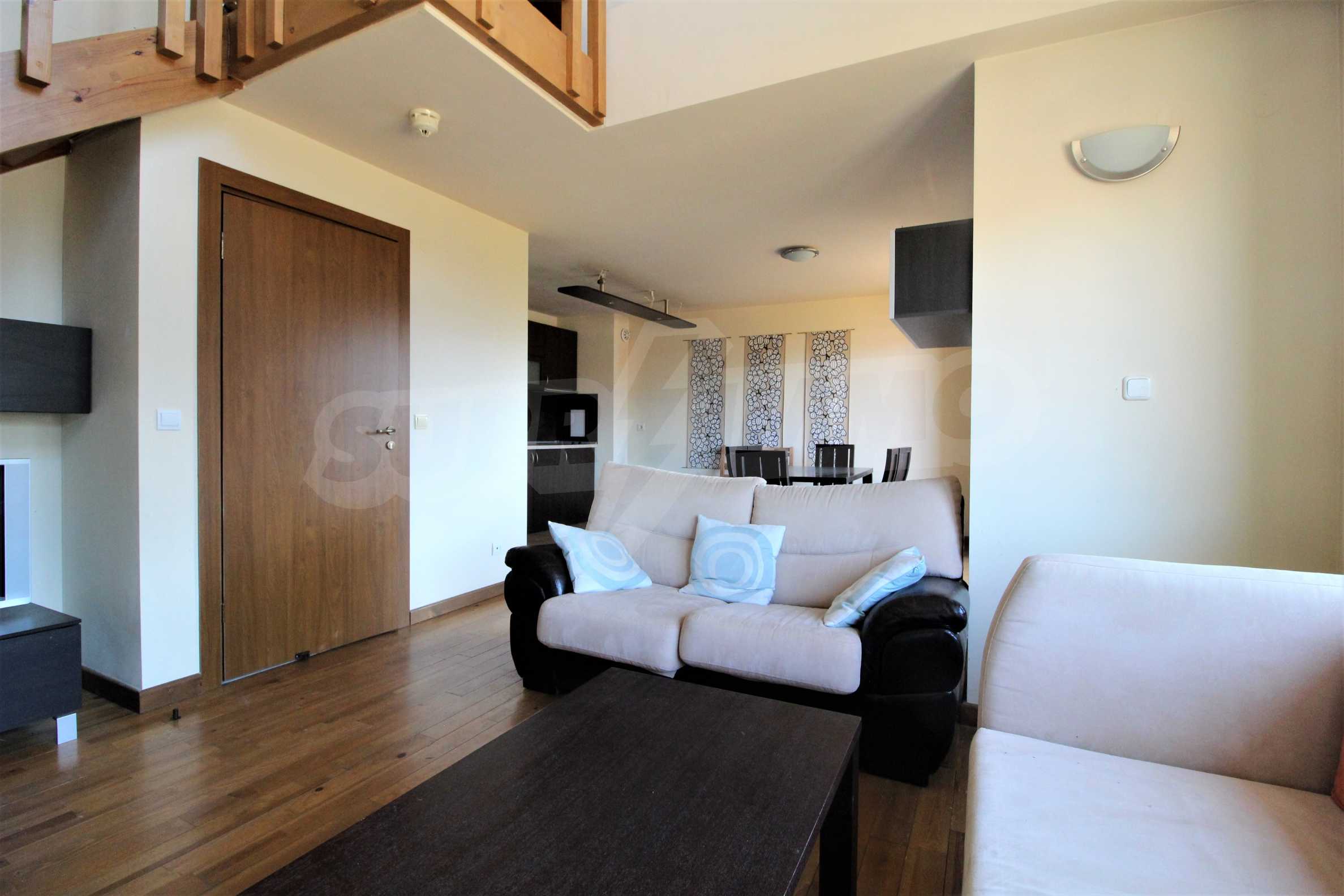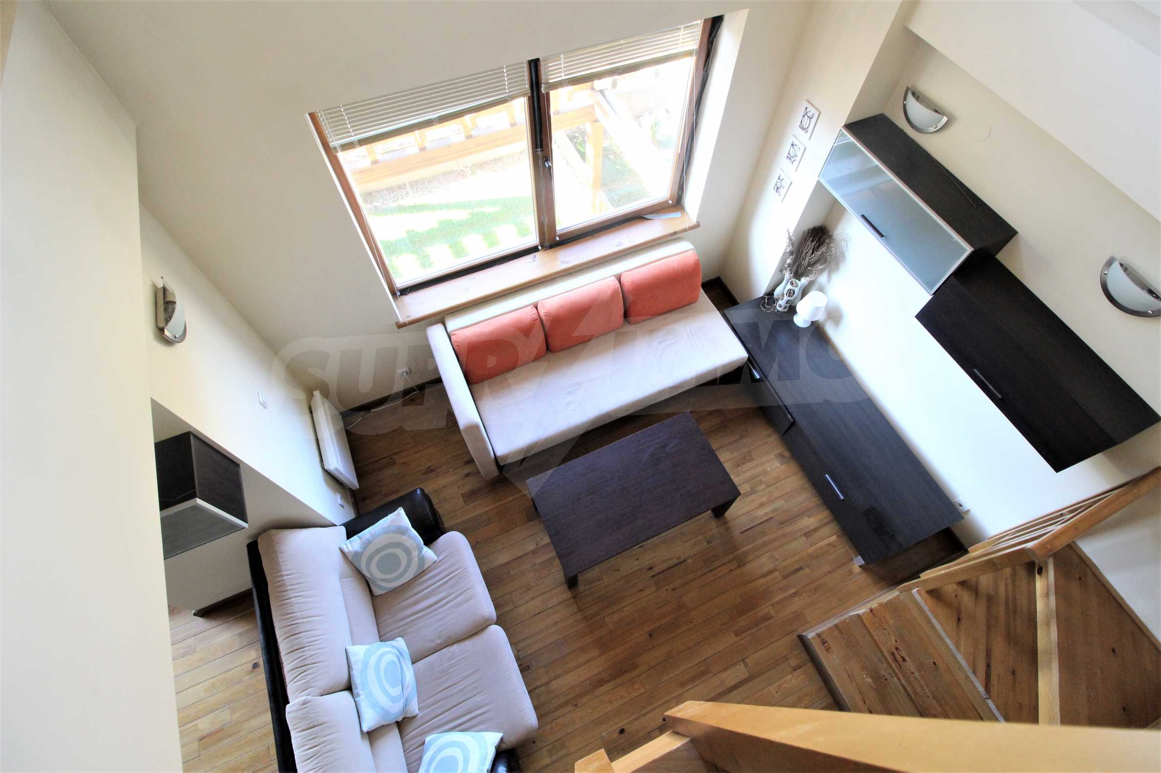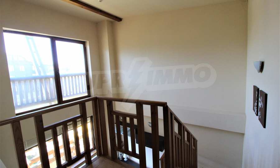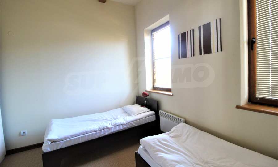 The apartment complex has 28 apartments and studios, all luxuriously furnished and equipped. Our offer includes a two-bedroom 2-level penthouse set on the second floor of the building equipped with an elevator. The western apartment has an area of 135.48 sq.m. (common parts - 29.01 sq.m.). It consists of a living room with kitchenette, a WC and a balcony with great views of the Pirin and Rila Mountains (first level) and two bedrooms and a bathroom with WC (second level). The rooms are finished with painted walls, floors - of parquet and tiles in the hallway and the kitchen and PVC joinery. The full furniture and equipment included in the asked price consists of: a ceramic hob, a sink, cupboards, an oven, an extractor hood, a fridge, a table with six chairs (kitchen); a table, a sofa, a TV set (living room); a double bed, a bedside table with lamp, a wardrobe, a dresser and a mirror (first bedroom), two single beds (second bedroom ) and a bath tube, a separate shower, a washbasin with a mirror (bathroom with WC). The property is heated by electric convectors. The apartment has cable TV, internet and security system.