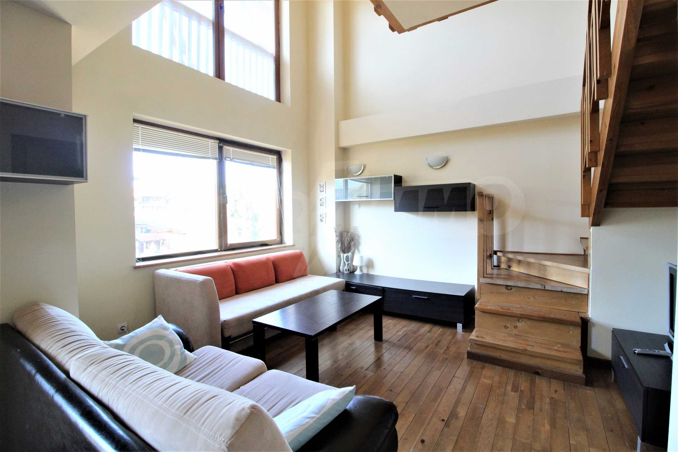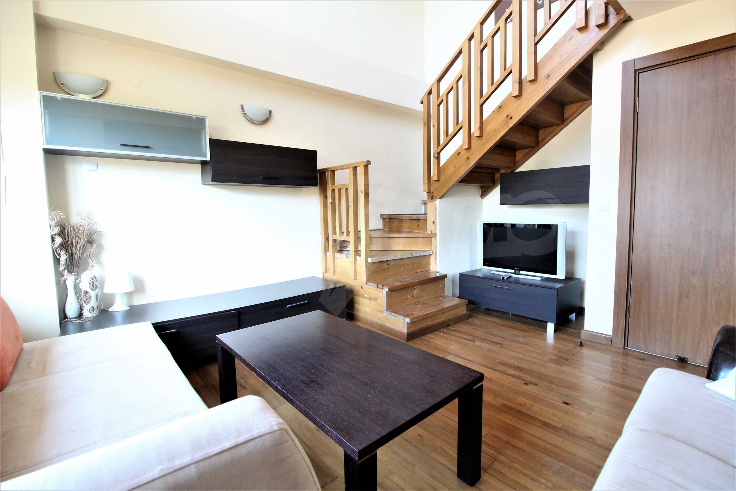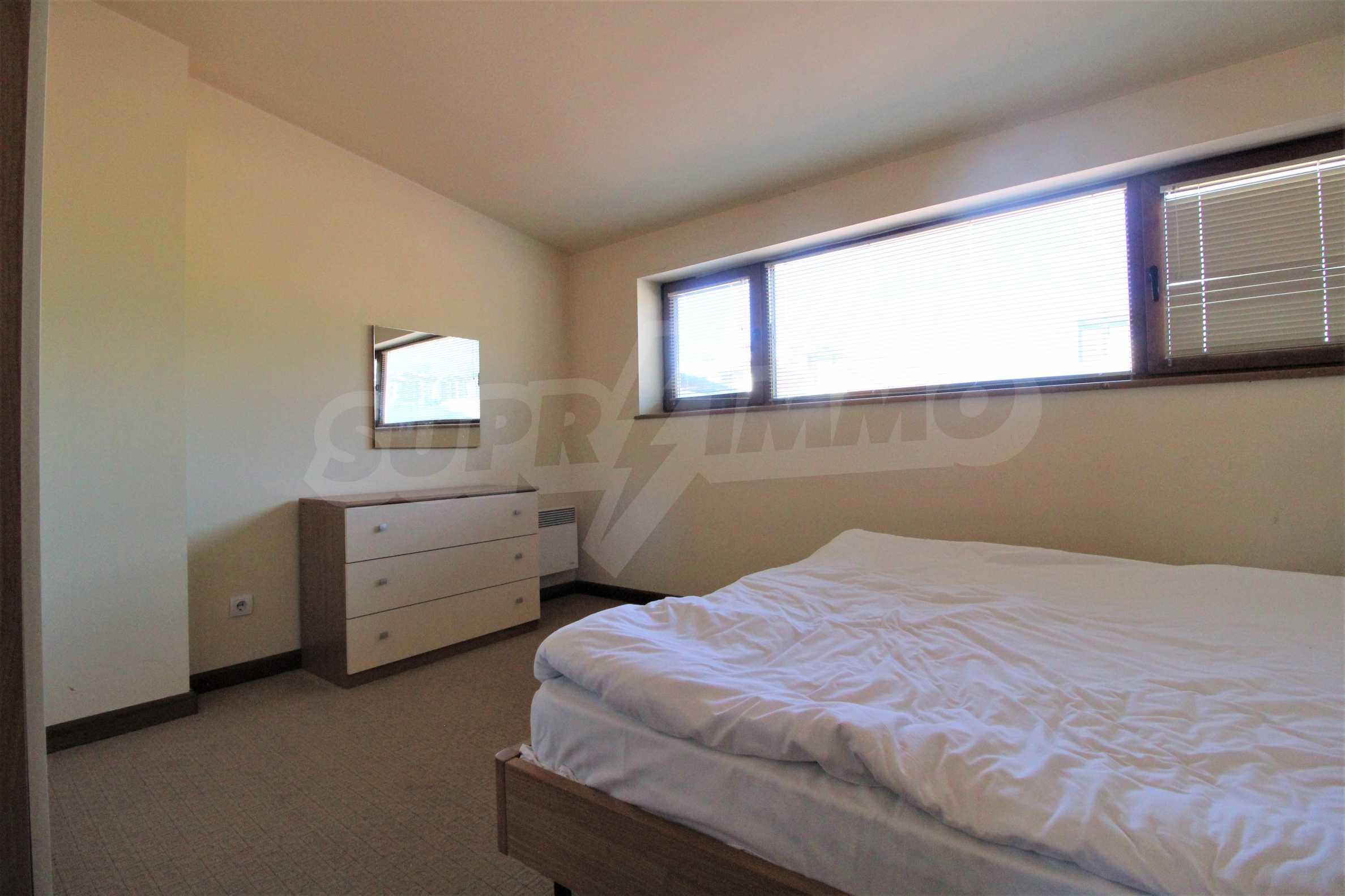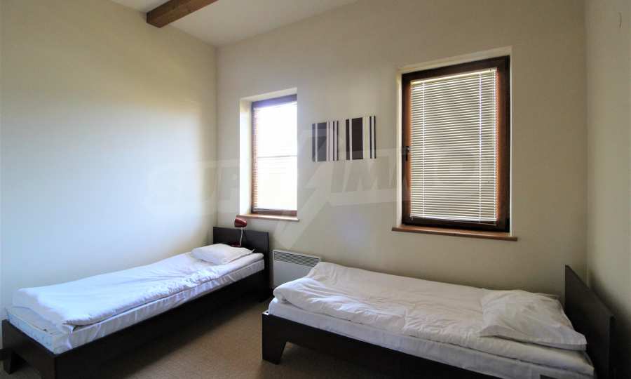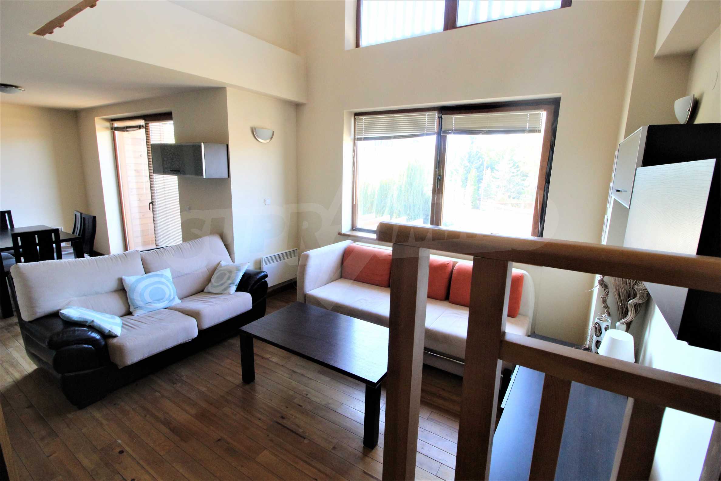 The apartment complex has 28 apartments and studios, all luxuriously furnished and equipped. Our offer includes a two-bedroom 2-level penthouse set on the second floor of the building equipped with an elevator. The western apartment has an area of 135.48 sq.m. (common parts - 29.01 sq.m.). It consists of a living room with kitchenette, a WC and a balcony with great views of the Pirin and Rila Mountains (first level) and two bedrooms and a bathroom with WC (second level). The rooms are finished with painted walls, floors - of parquet and tiles in the hallway and the kitchen and PVC joinery. The full furniture and equipment included in the asked price consists of: a ceramic hob, a sink, cupboards, an oven, an extractor hood, a fridge, a table with six chairs (kitchen); a table, a sofa, a TV set (living room); a double bed, a bedside table with lamp, a wardrobe, a dresser and a mirror (first bedroom), two single beds (second bedroom ) and a bath tube, a separate shower, a washbasin with a mirror (bathroom with WC). The property is heated by electric convectors. The apartment has cable TV, internet and security system.