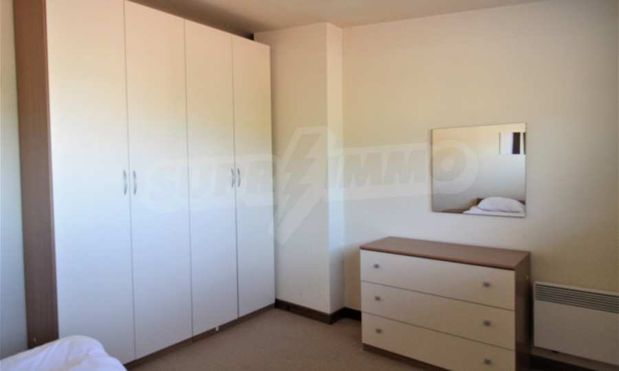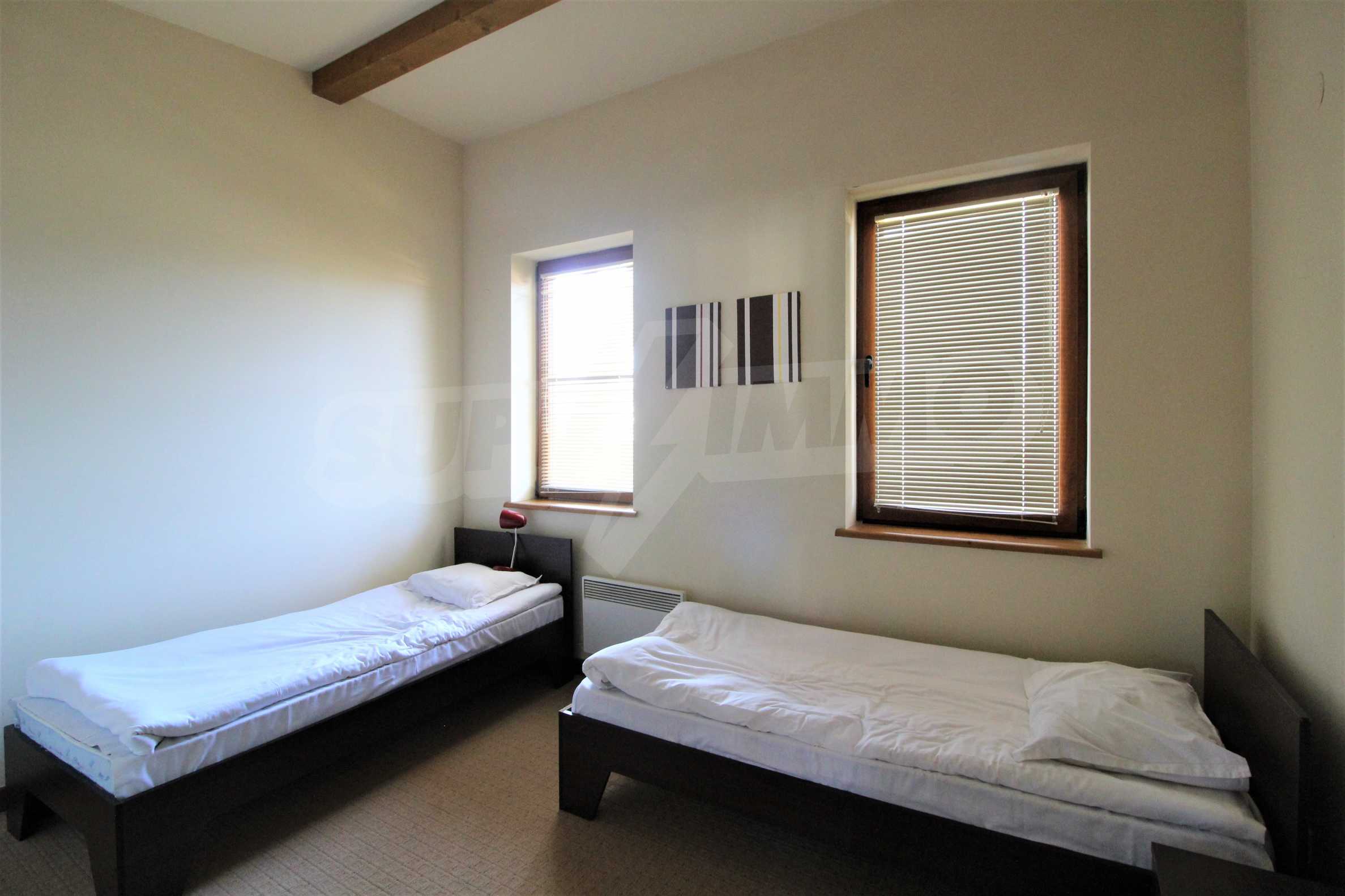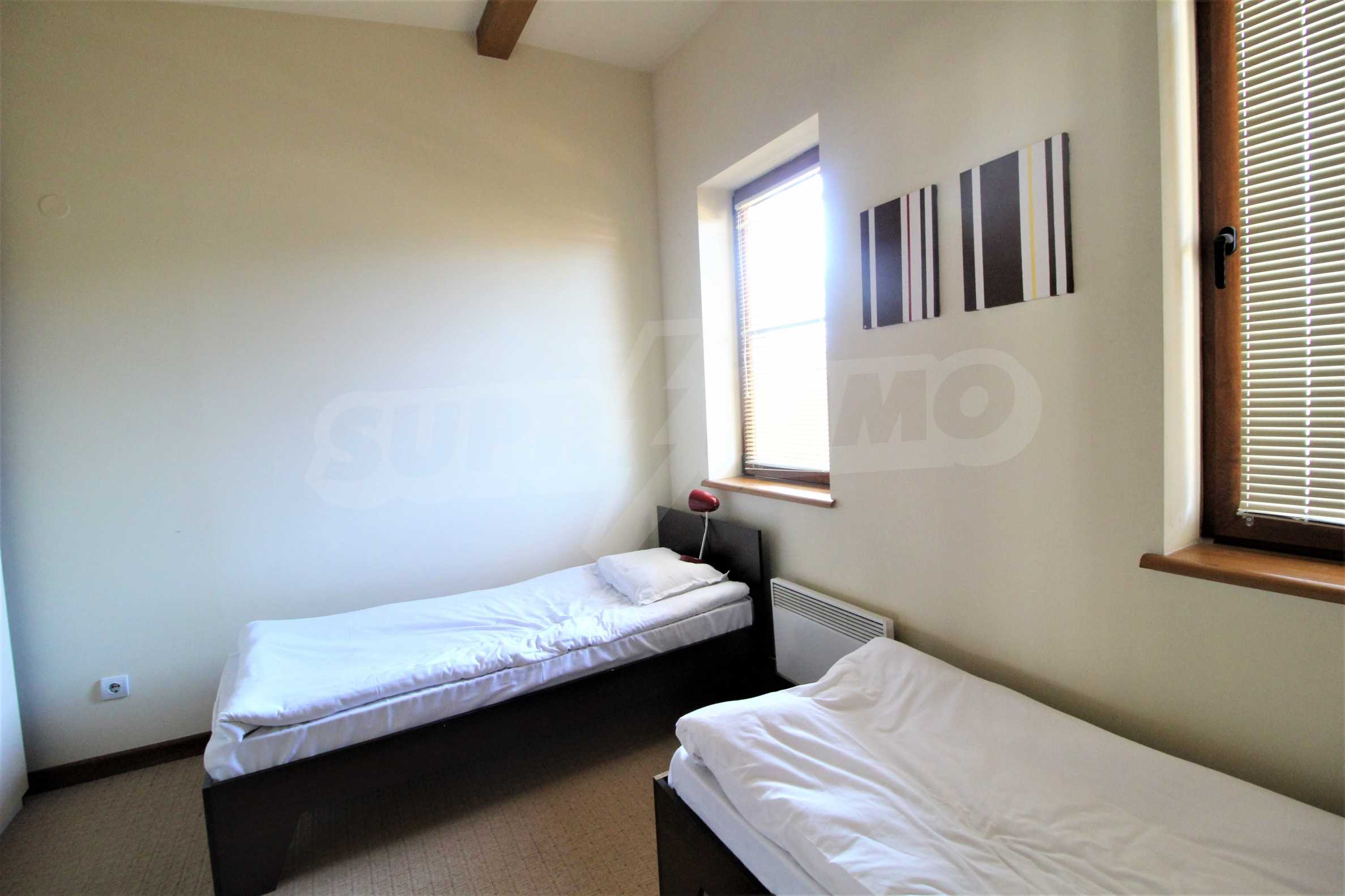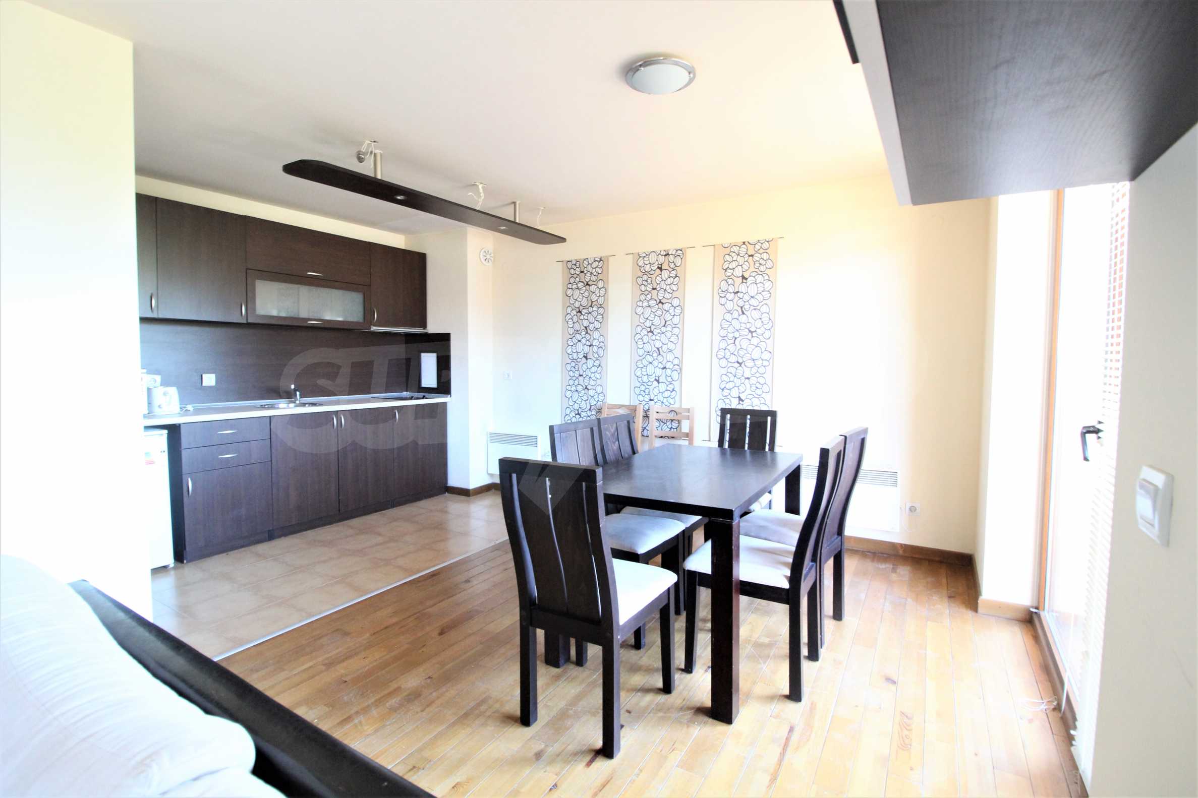 The apartment complex has 28 apartments and studios, all luxuriously furnished and equipped. Our offer includes a two-bedroom 2-level penthouse set on the second floor of the building equipped with an elevator. The western apartment has an area of 135.48 sq.m. (common parts - 29.01 sq.m.). It consists of a living room with kitchenette, a WC and a balcony with great views of the Pirin and Rila Mountains (first level) and two bedrooms and a bathroom with WC (second level). The rooms are finished with painted walls, floors - of parquet and tiles in the hallway and the kitchen and PVC joinery. The full furniture and equipment included in the asked price consists of: a ceramic hob, a sink, cupboards, an oven, an extractor hood, a fridge, a table with six chairs (kitchen); a table, a sofa, a TV set (living room); a double bed, a bedside table with lamp, a wardrobe, a dresser and a mirror (first bedroom), two single beds (second bedroom ) and a bath tube, a separate shower, a washbasin with a mirror (bathroom with WC). The property is heated by electric convectors. The apartment has cable TV, internet and security system.