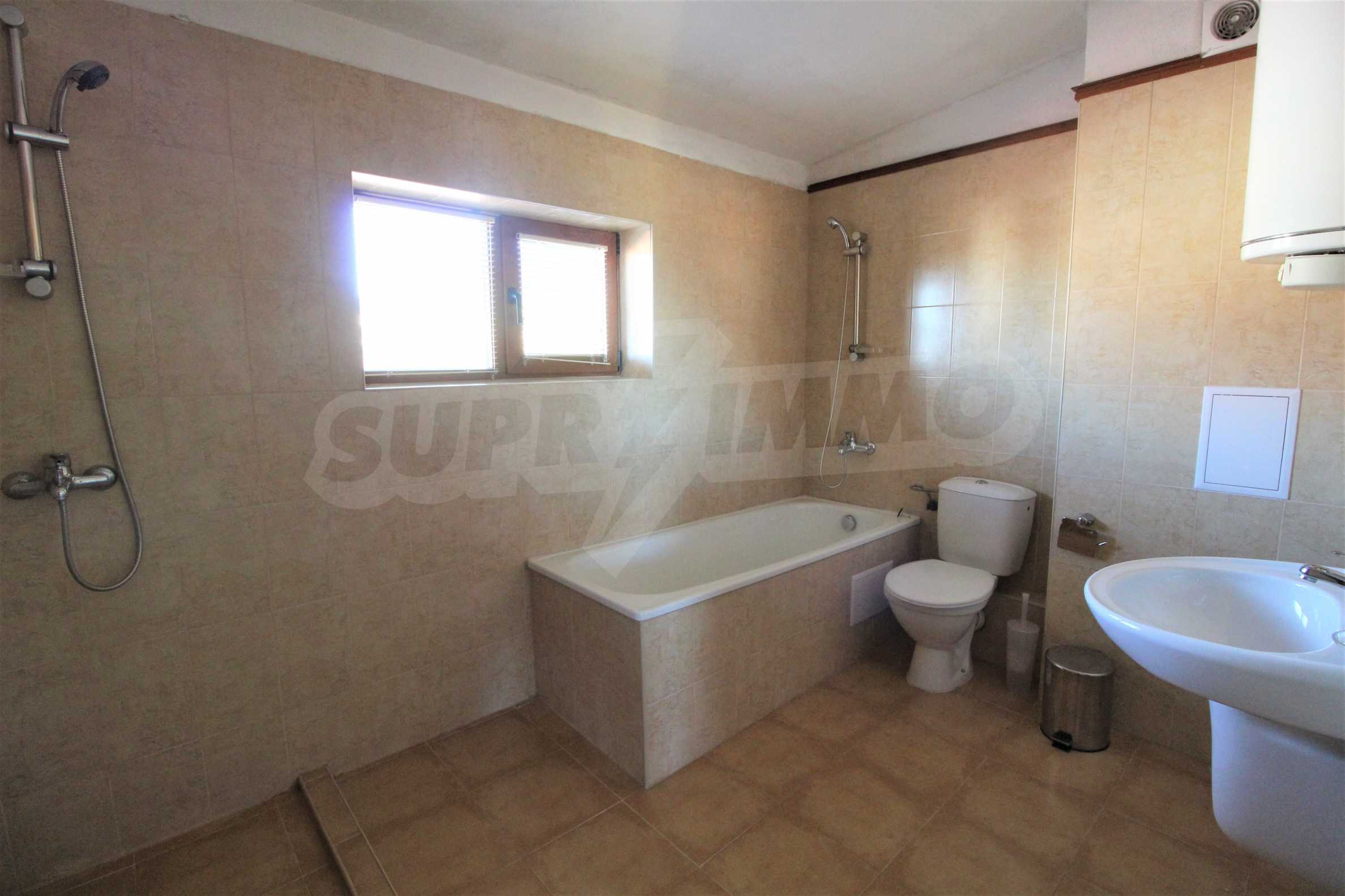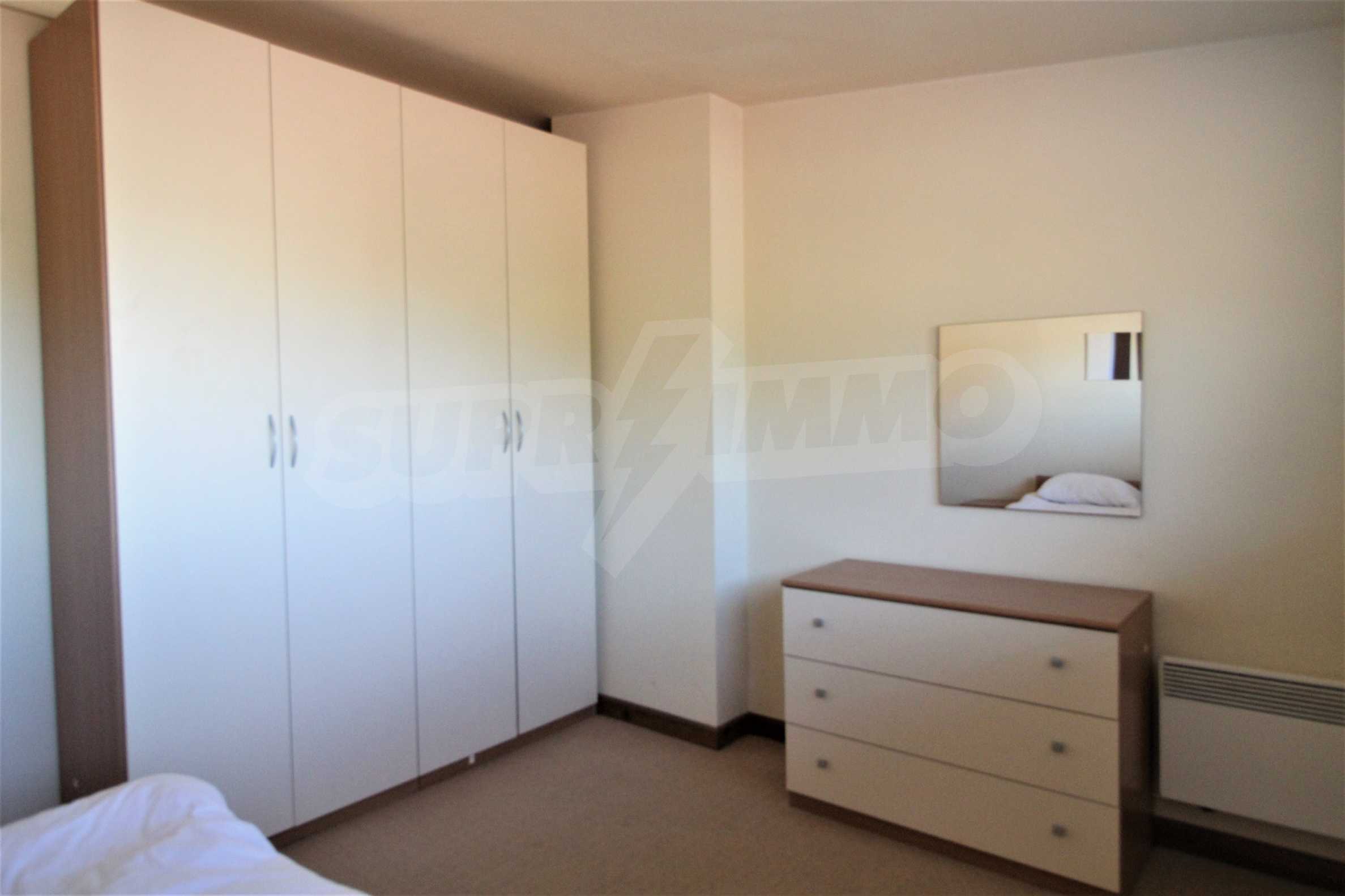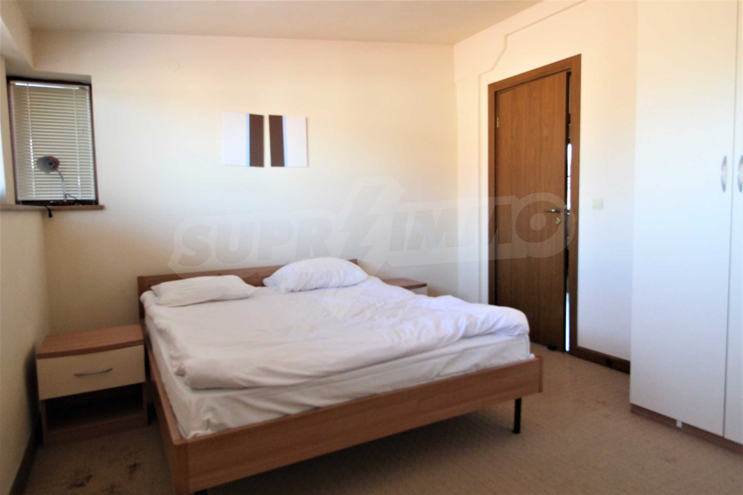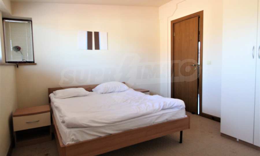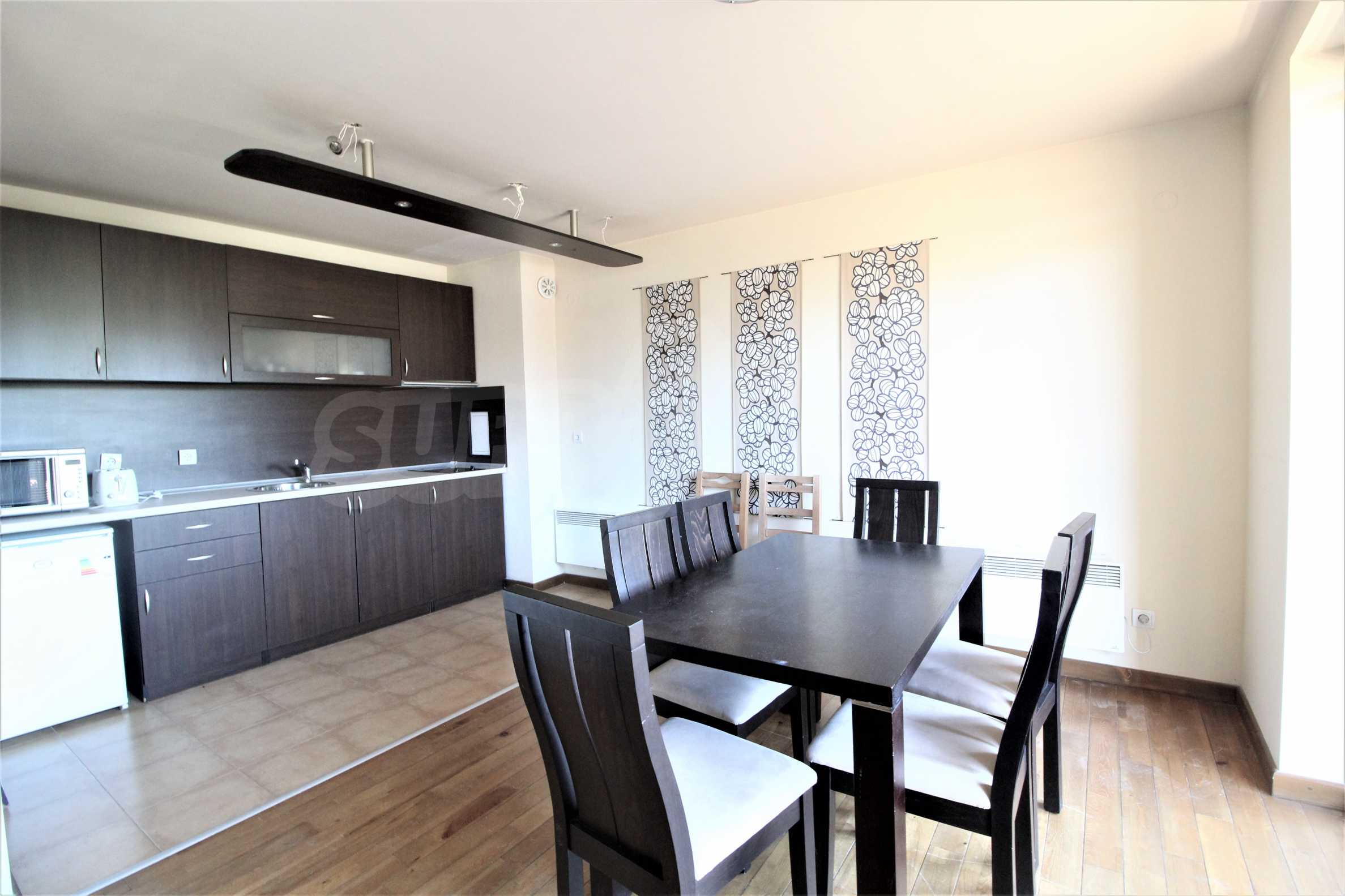 The apartment complex has 28 apartments and studios, all luxuriously furnished and equipped. Our offer includes a two-bedroom 2-level penthouse set on the second floor of the building equipped with an elevator. The western apartment has an area of 135.48 sq.m. (common parts - 29.01 sq.m.). It consists of a living room with kitchenette, a WC and a balcony with great views of the Pirin and Rila Mountains (first level) and two bedrooms and a bathroom with WC (second level). The rooms are finished with painted walls, floors - of parquet and tiles in the hallway and the kitchen and PVC joinery. The full furniture and equipment included in the asked price consists of: a ceramic hob, a sink, cupboards, an oven, an extractor hood, a fridge, a table with six chairs (kitchen); a table, a sofa, a TV set (living room); a double bed, a bedside table with lamp, a wardrobe, a dresser and a mirror (first bedroom), two single beds (second bedroom ) and a bath tube, a separate shower, a washbasin with a mirror (bathroom with WC). The property is heated by electric convectors. The apartment has cable TV, internet and security system.