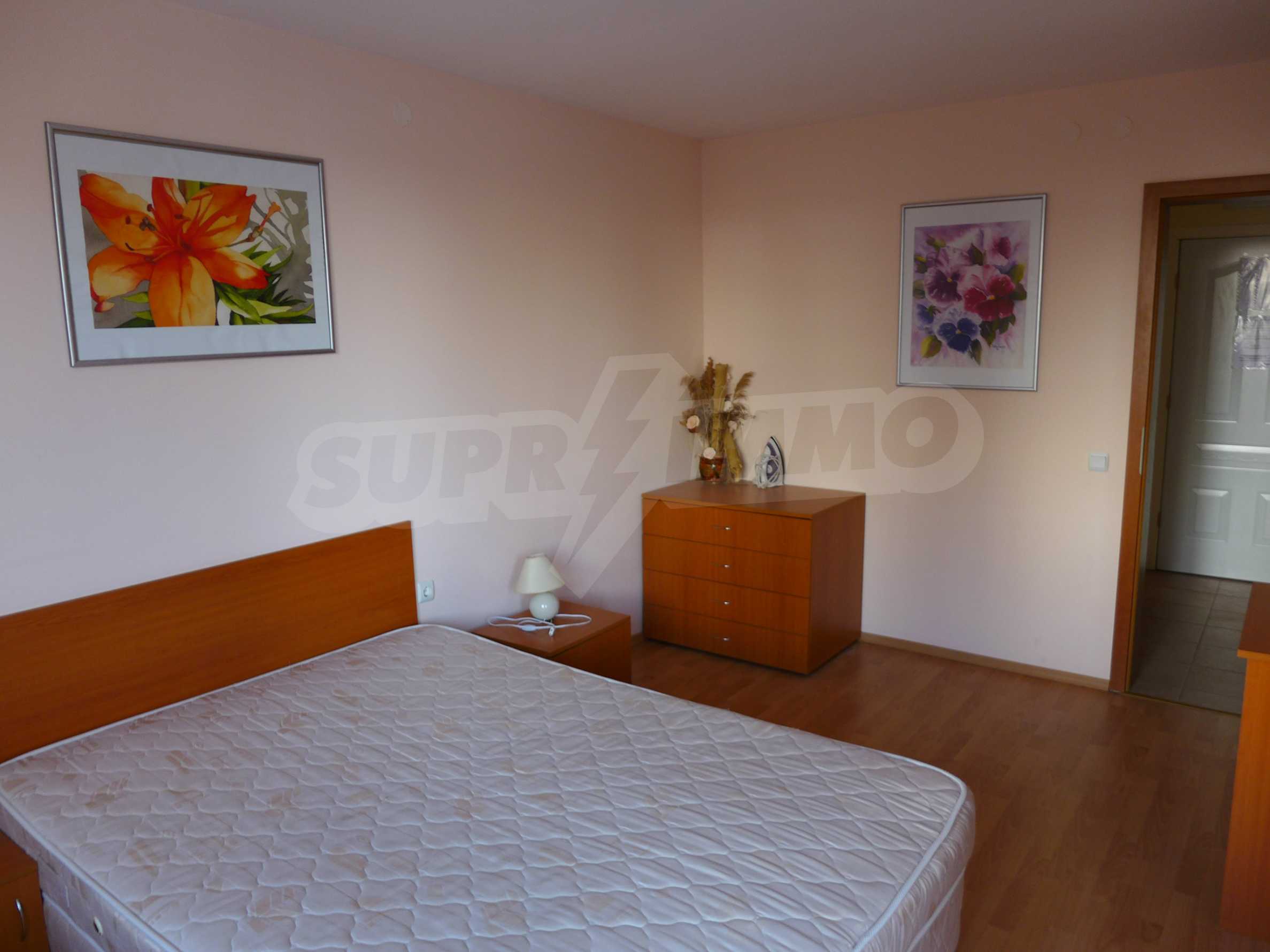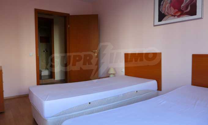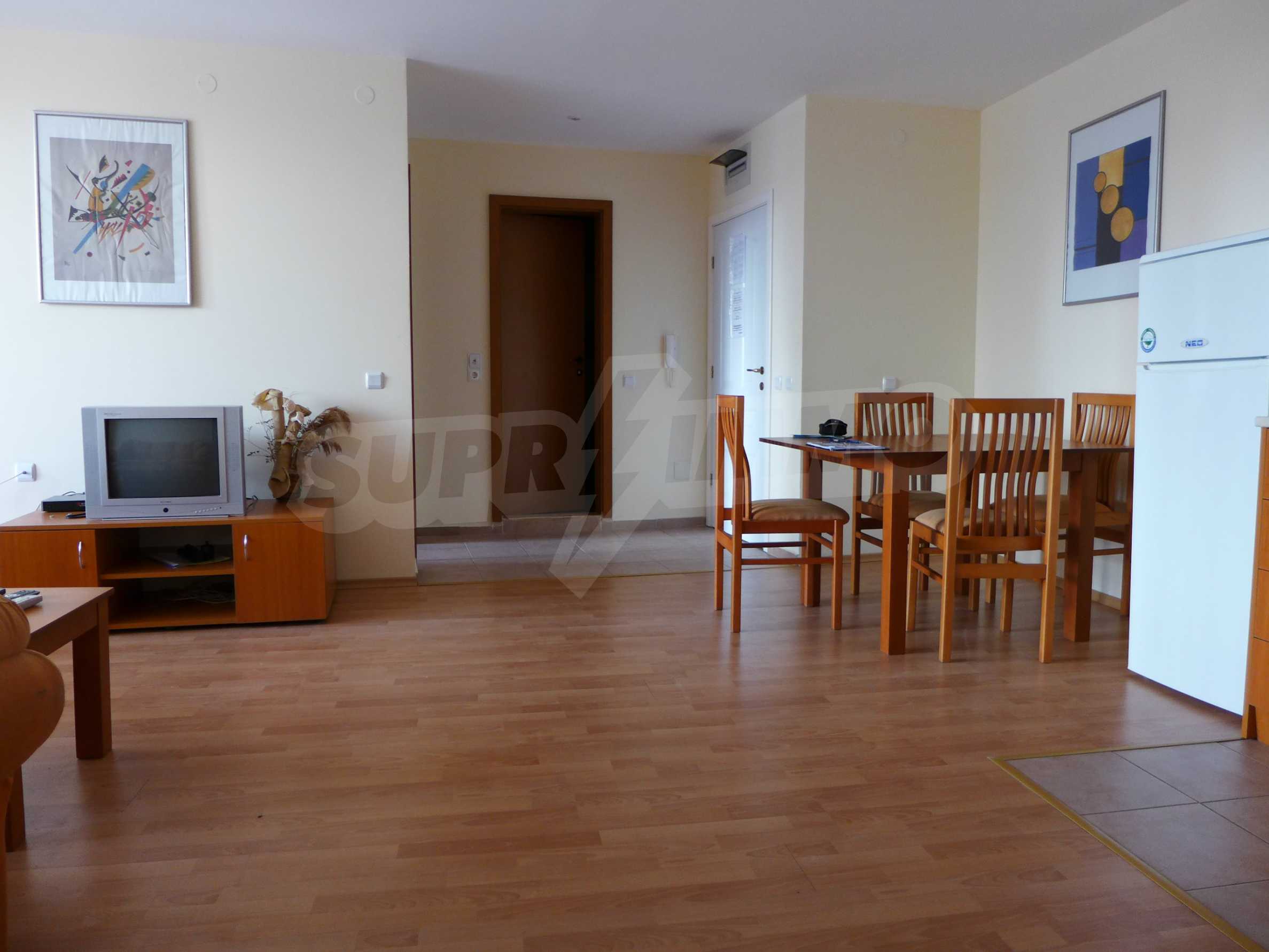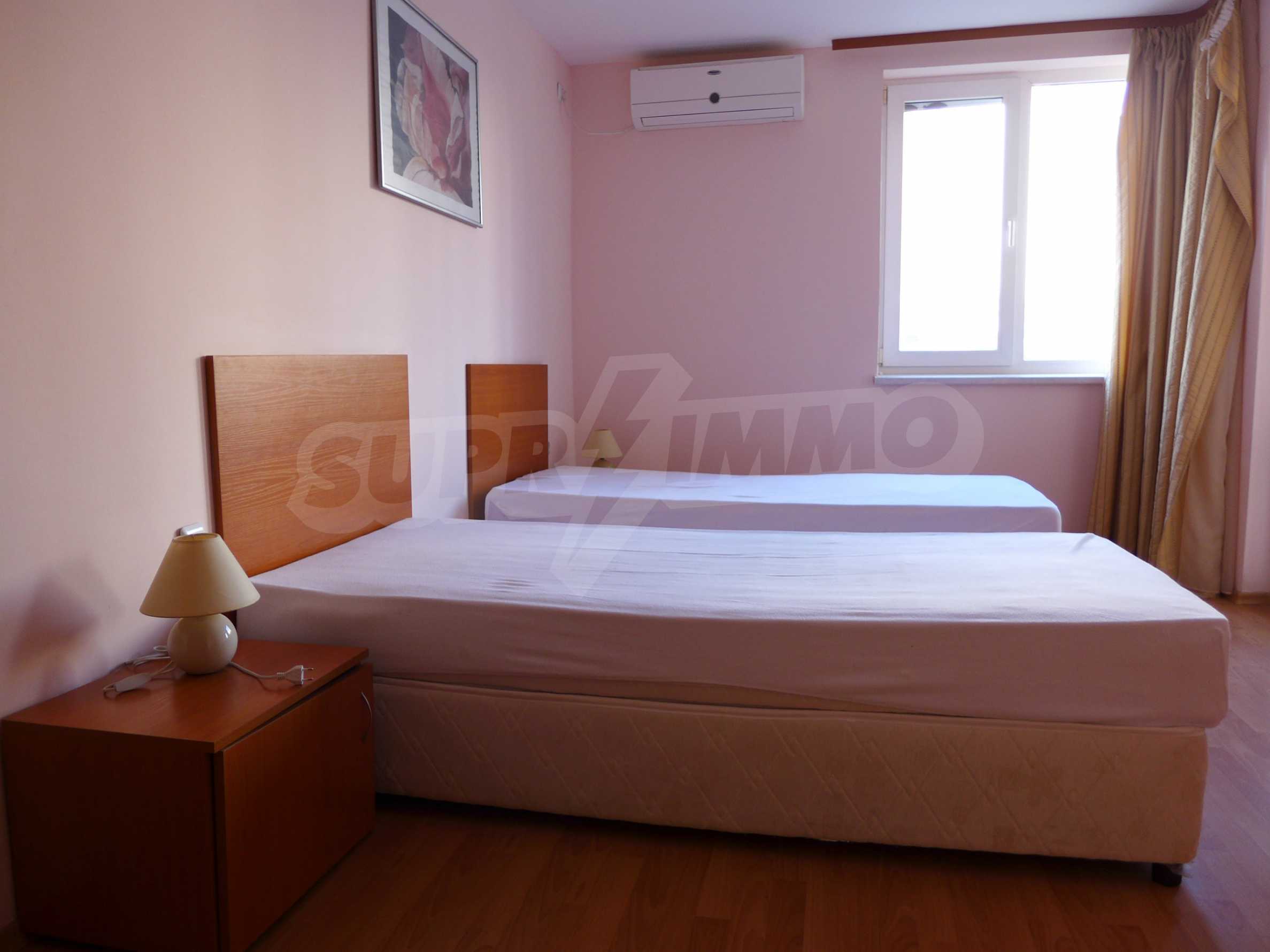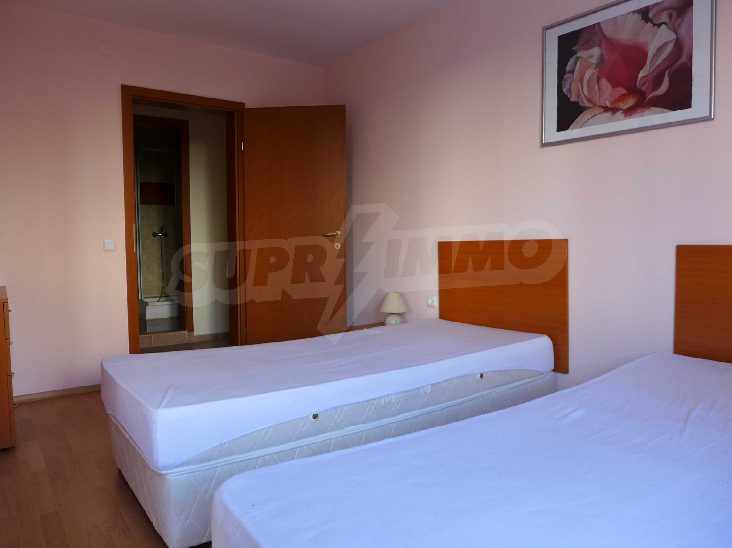 The luxury home that we offer for sale in this offer is set on the second floor with cool for the hot summer days northern exposure. The two-bedroom apartment spreads over a total area of 98 sq.m., of which the net area is 86.92 sq.m. The rooms are finished with laminate flooring and with tiles. The furniture and equipment included in the price, consists of: living room with kitchenette with a sofa, a kitchen table, a coffee table, a fridge, a washing machine, a TV set; first bedroom - with two beds, a dressing table, an air conditioner; second bedroom - with a double bed, a dressing table, bedside tables; bathroom with WC - with a shower box, a cupboard, two mirrors; toilet with a sink and a cupboard with mirror. The balcony is one, with beautiful views of the complex and the road. The apartment has cable TV and internet.