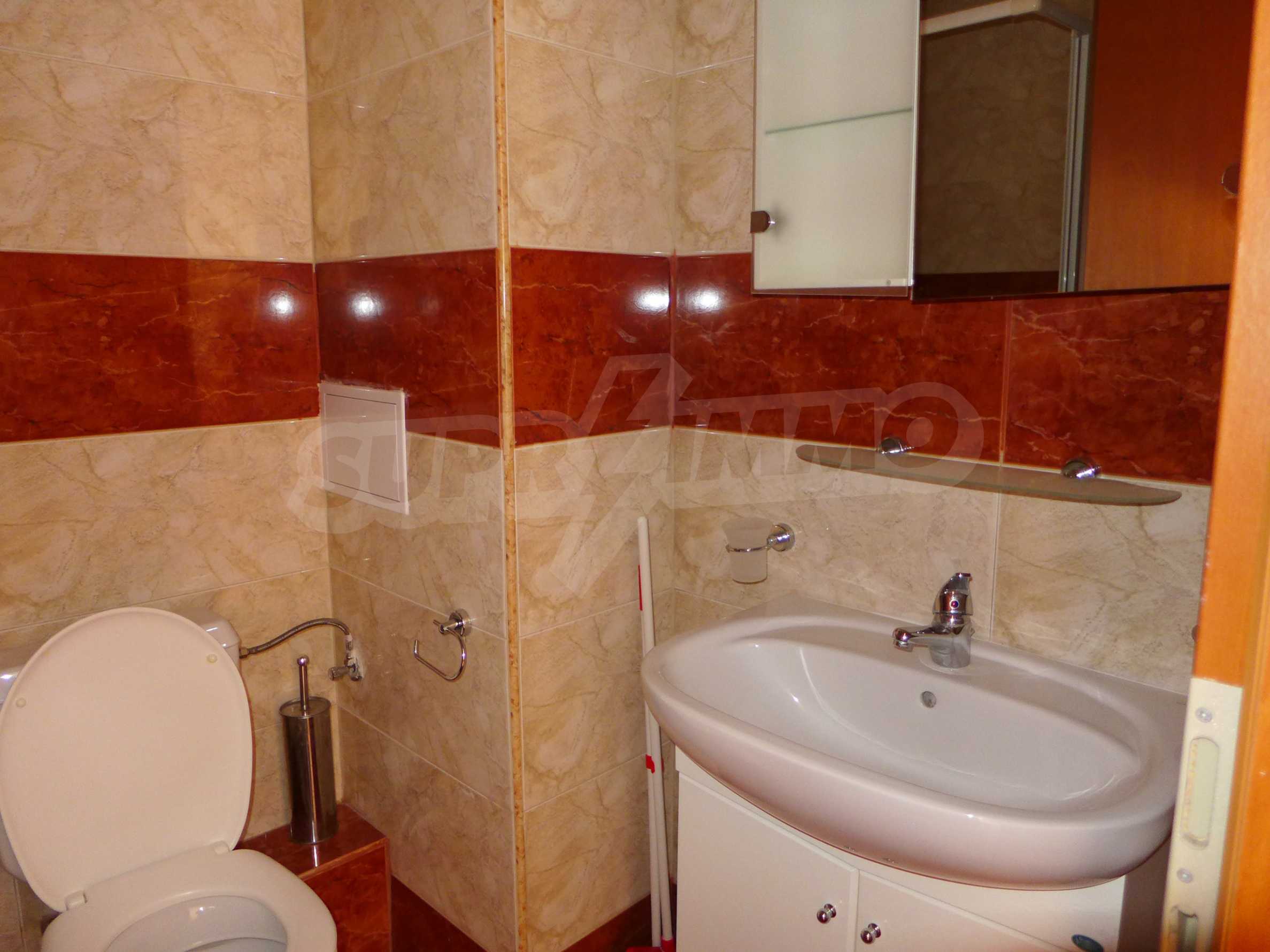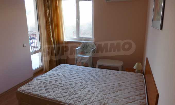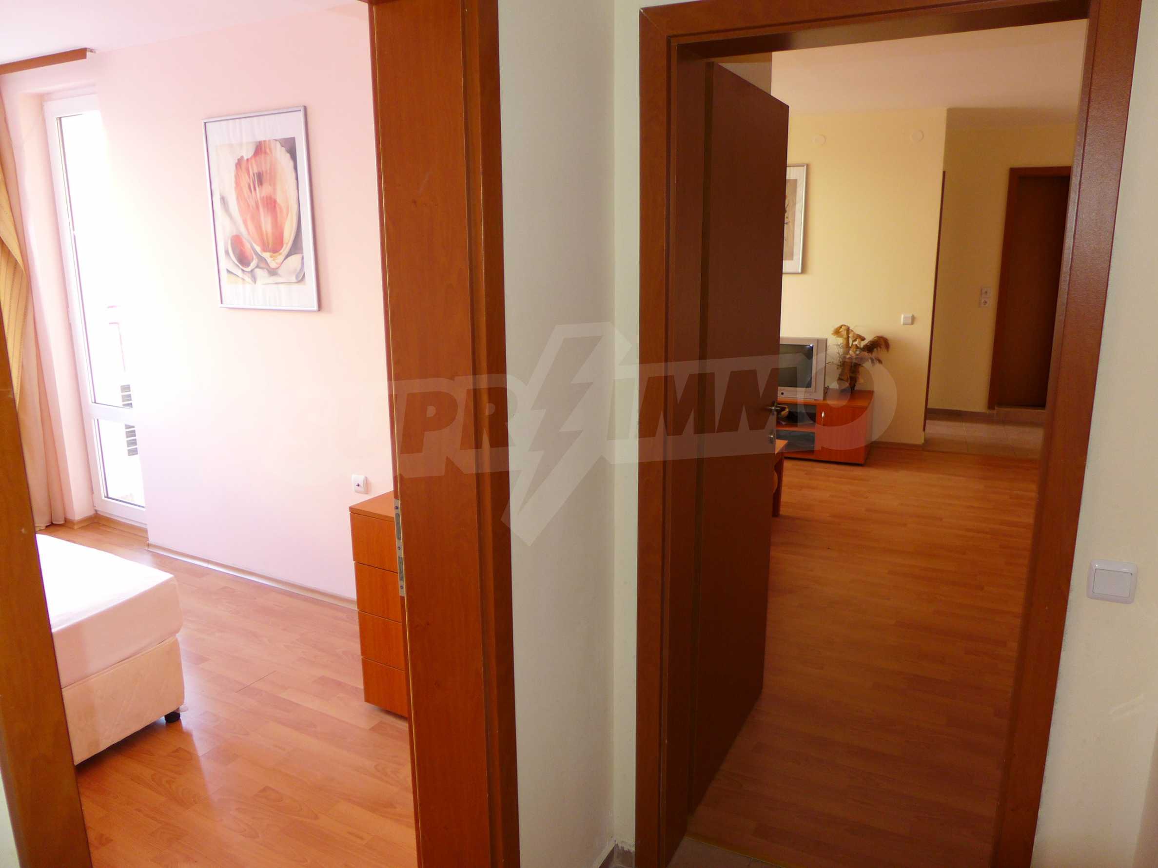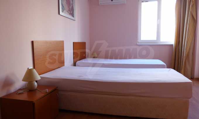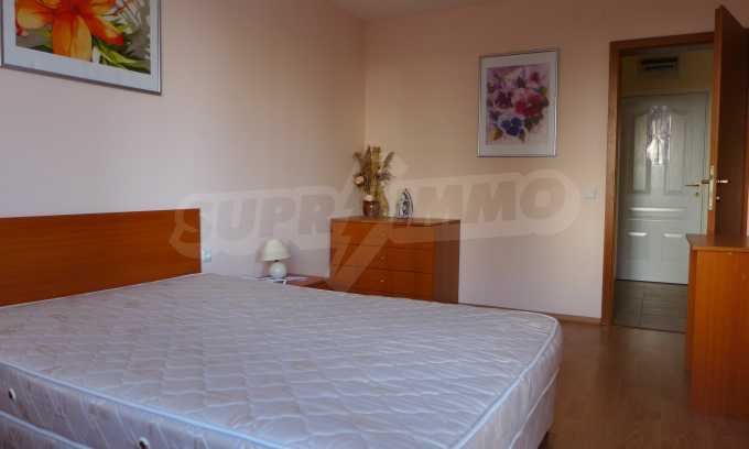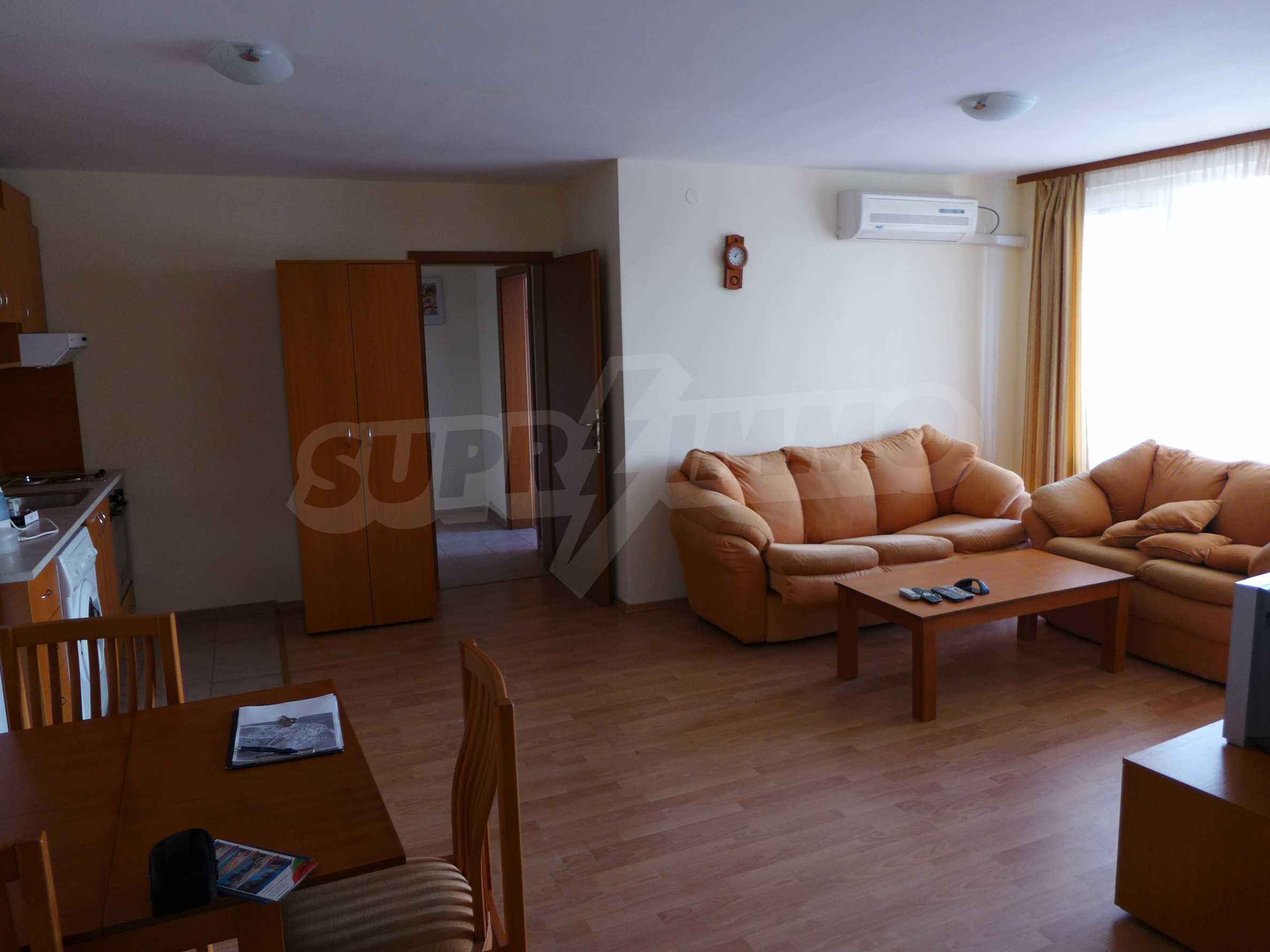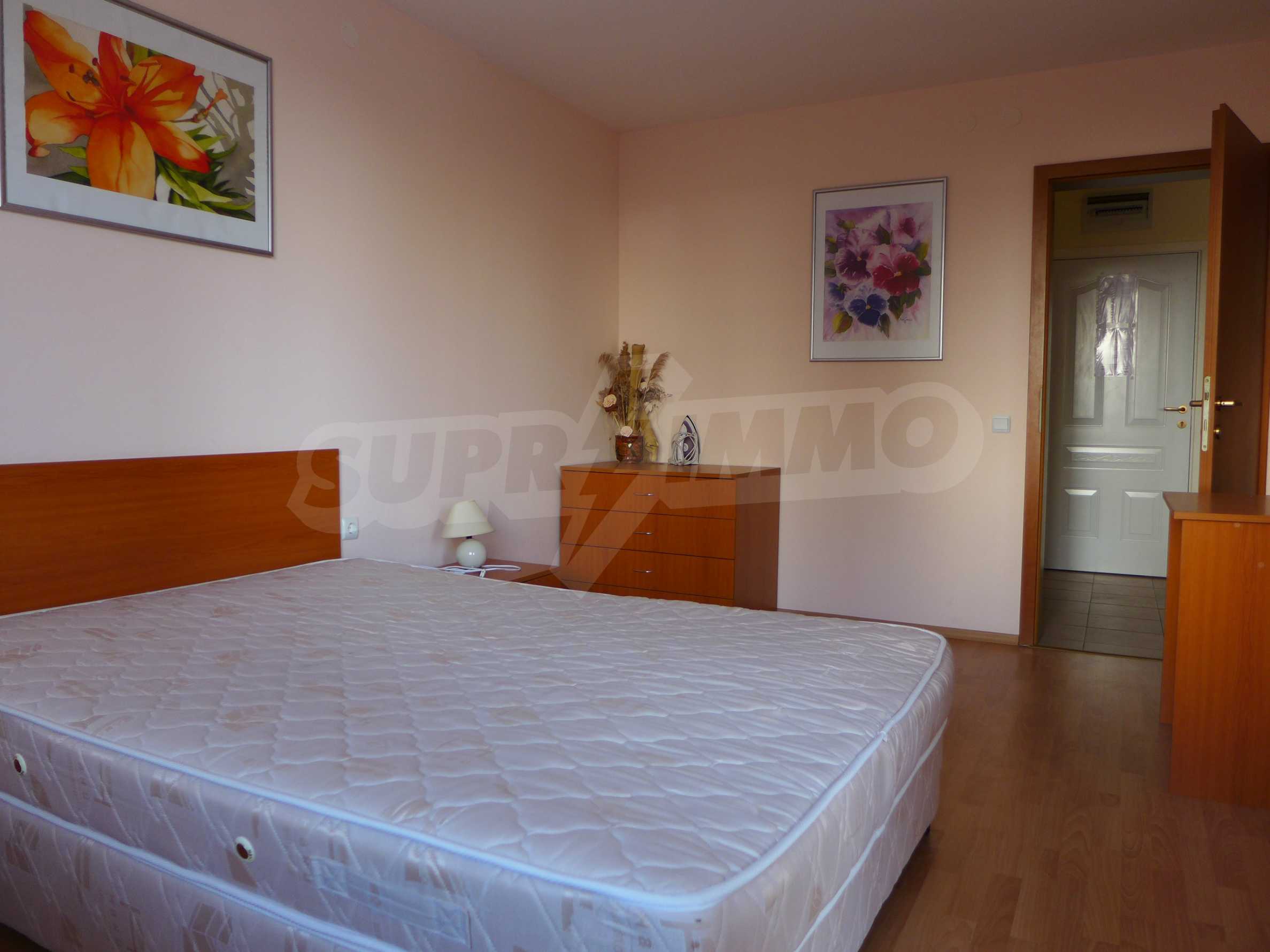 The luxury home that we offer for sale in this offer is set on the second floor with cool for the hot summer days northern exposure. The two-bedroom apartment spreads over a total area of 98 sq.m., of which the net area is 86.92 sq.m. The rooms are finished with laminate flooring and with tiles. The furniture and equipment included in the price, consists of: living room with kitchenette with a sofa, a kitchen table, a coffee table, a fridge, a washing machine, a TV set; first bedroom - with two beds, a dressing table, an air conditioner; second bedroom - with a double bed, a dressing table, bedside tables; bathroom with WC - with a shower box, a cupboard, two mirrors; toilet with a sink and a cupboard with mirror. The balcony is one, with beautiful views of the complex and the road. The apartment has cable TV and internet.