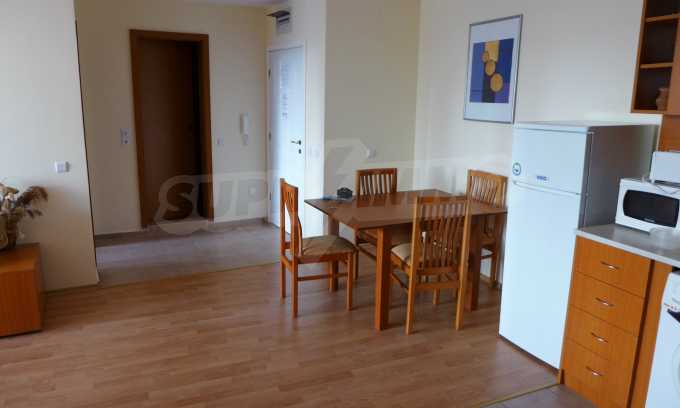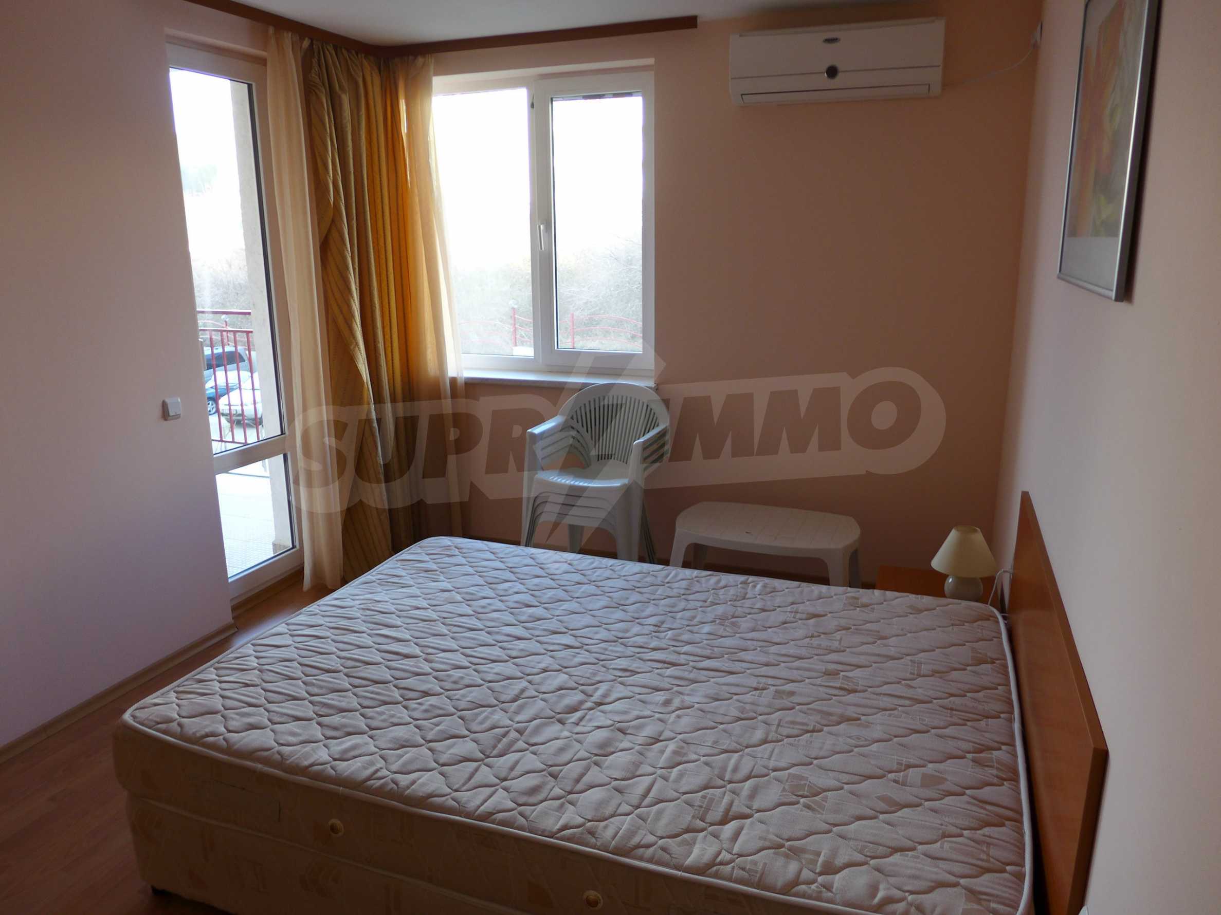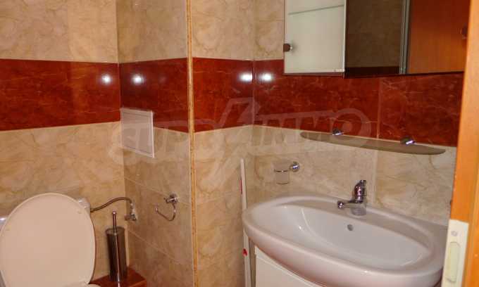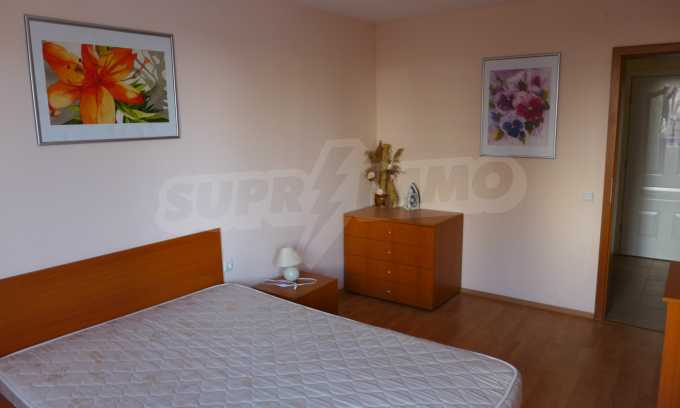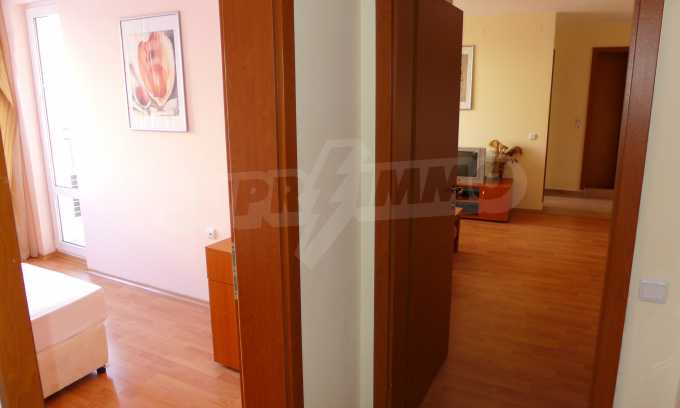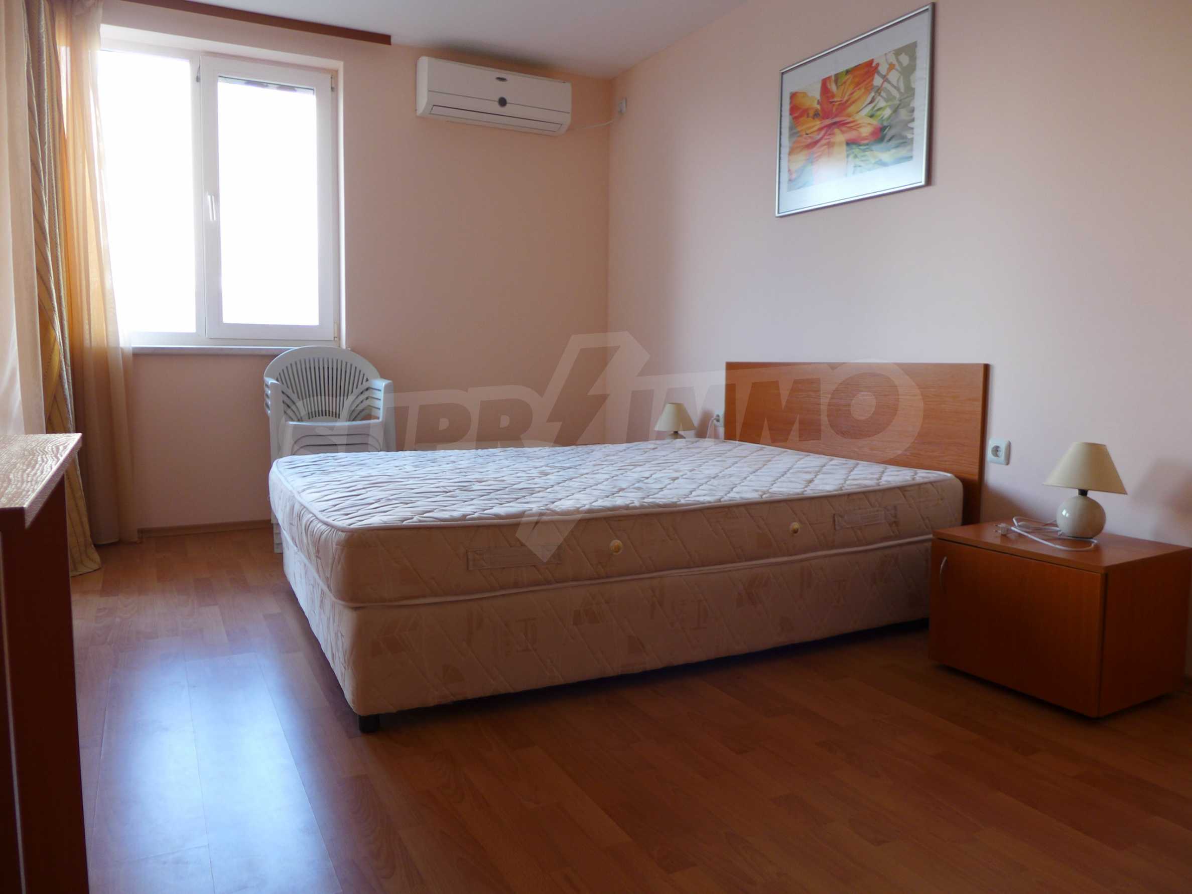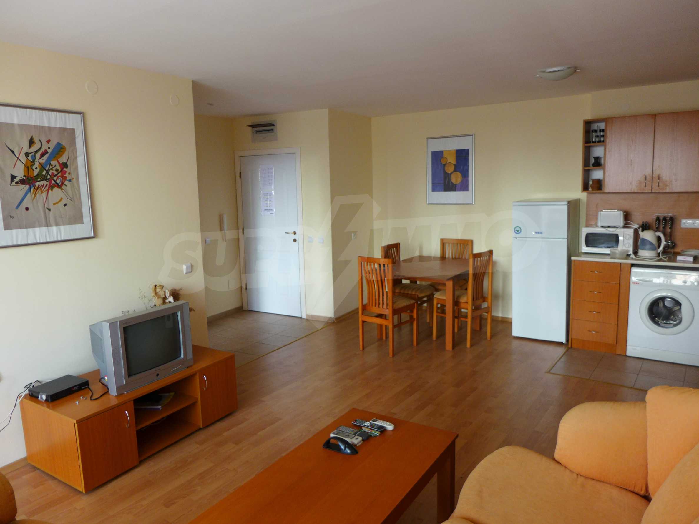 The luxury home that we offer for sale in this offer is set on the second floor with cool for the hot summer days northern exposure. The two-bedroom apartment spreads over a total area of 98 sq.m., of which the net area is 86.92 sq.m. The rooms are finished with laminate flooring and with tiles. The furniture and equipment included in the price, consists of: living room with kitchenette with a sofa, a kitchen table, a coffee table, a fridge, a washing machine, a TV set; first bedroom - with two beds, a dressing table, an air conditioner; second bedroom - with a double bed, a dressing table, bedside tables; bathroom with WC - with a shower box, a cupboard, two mirrors; toilet with a sink and a cupboard with mirror. The balcony is one, with beautiful views of the complex and the road. The apartment has cable TV and internet.