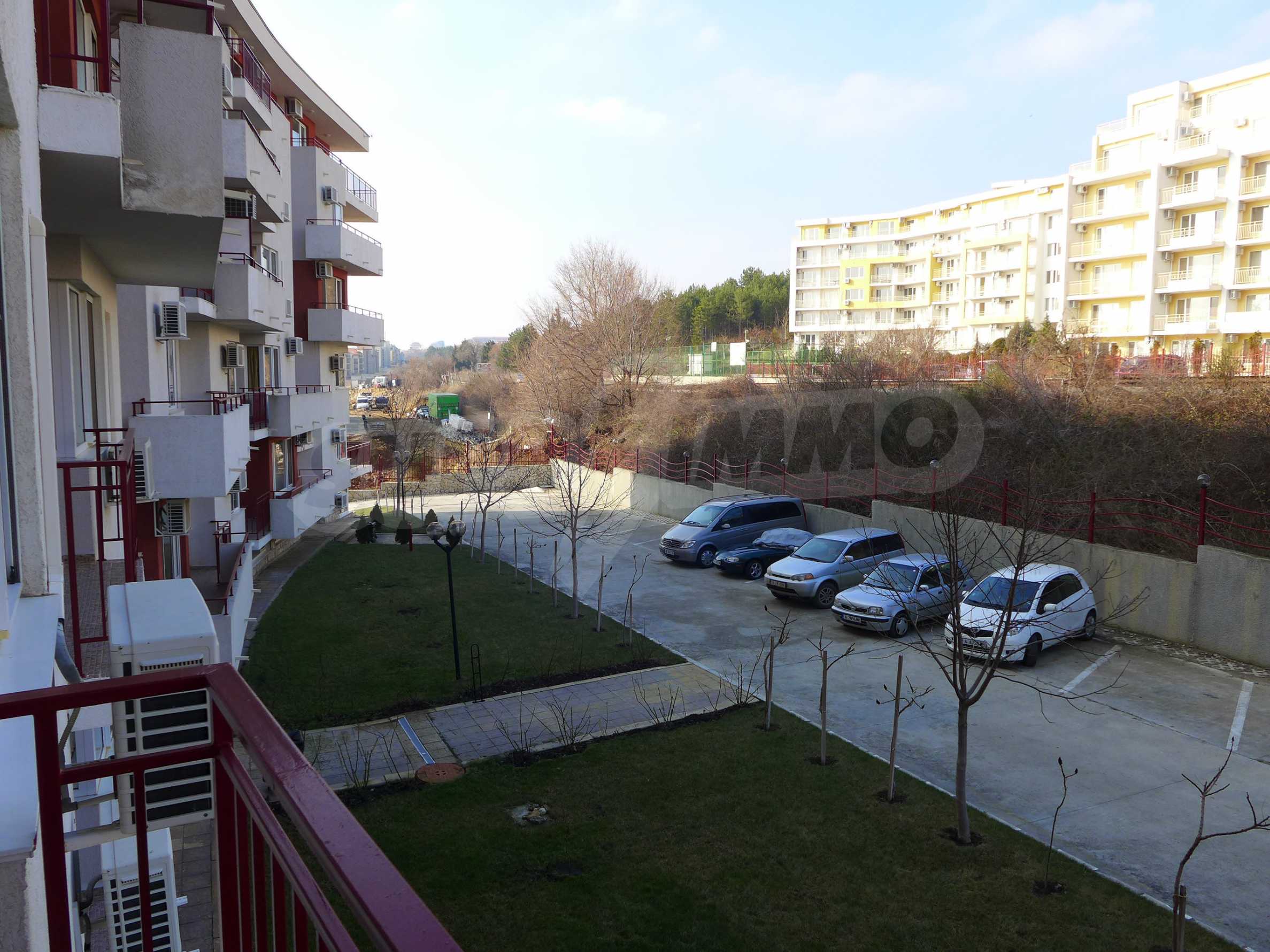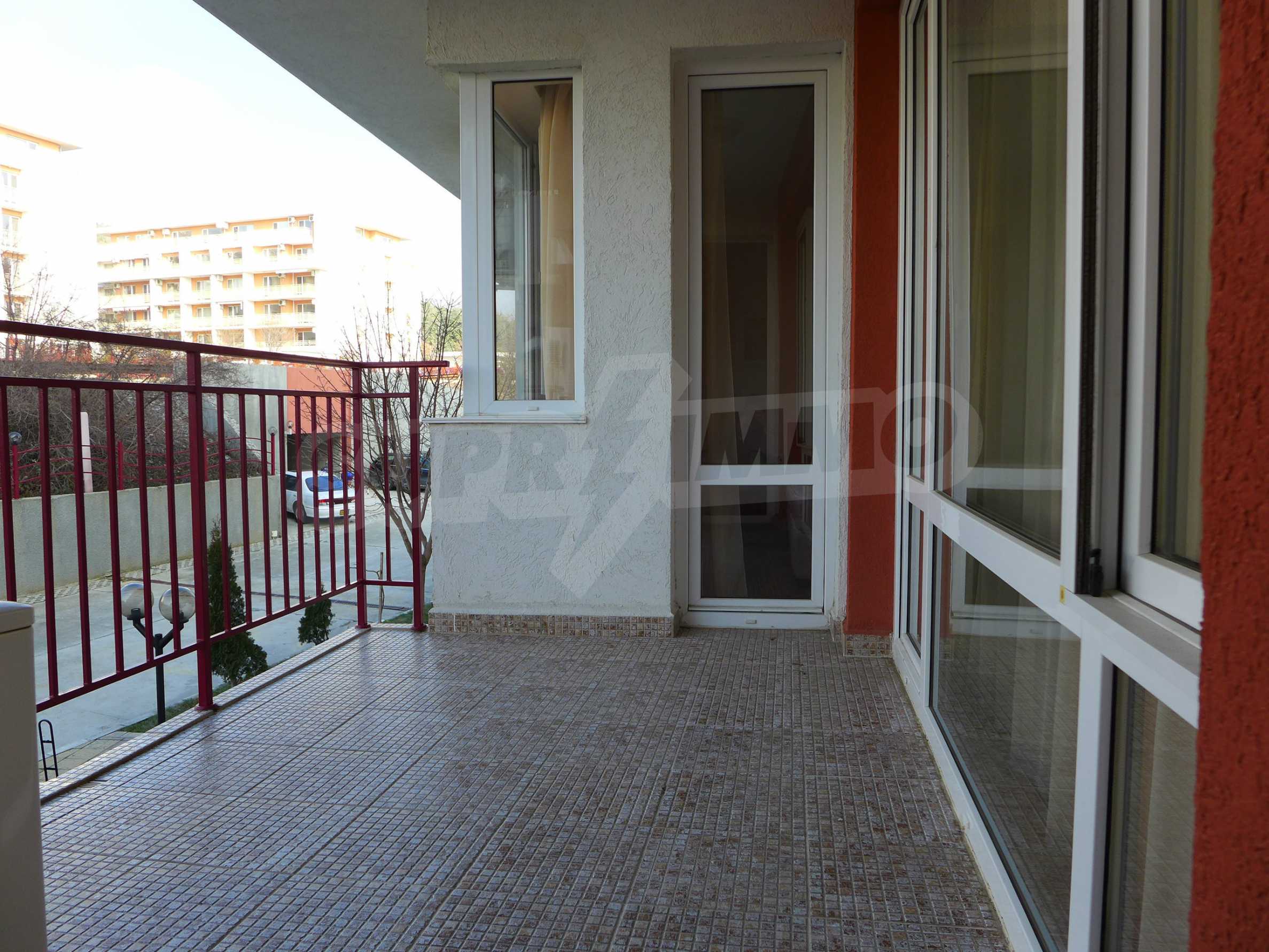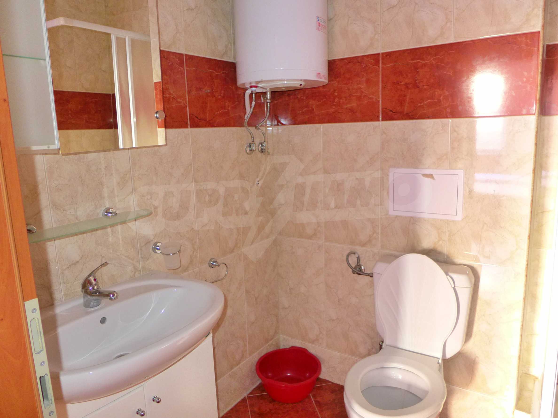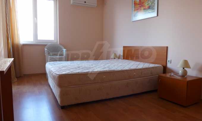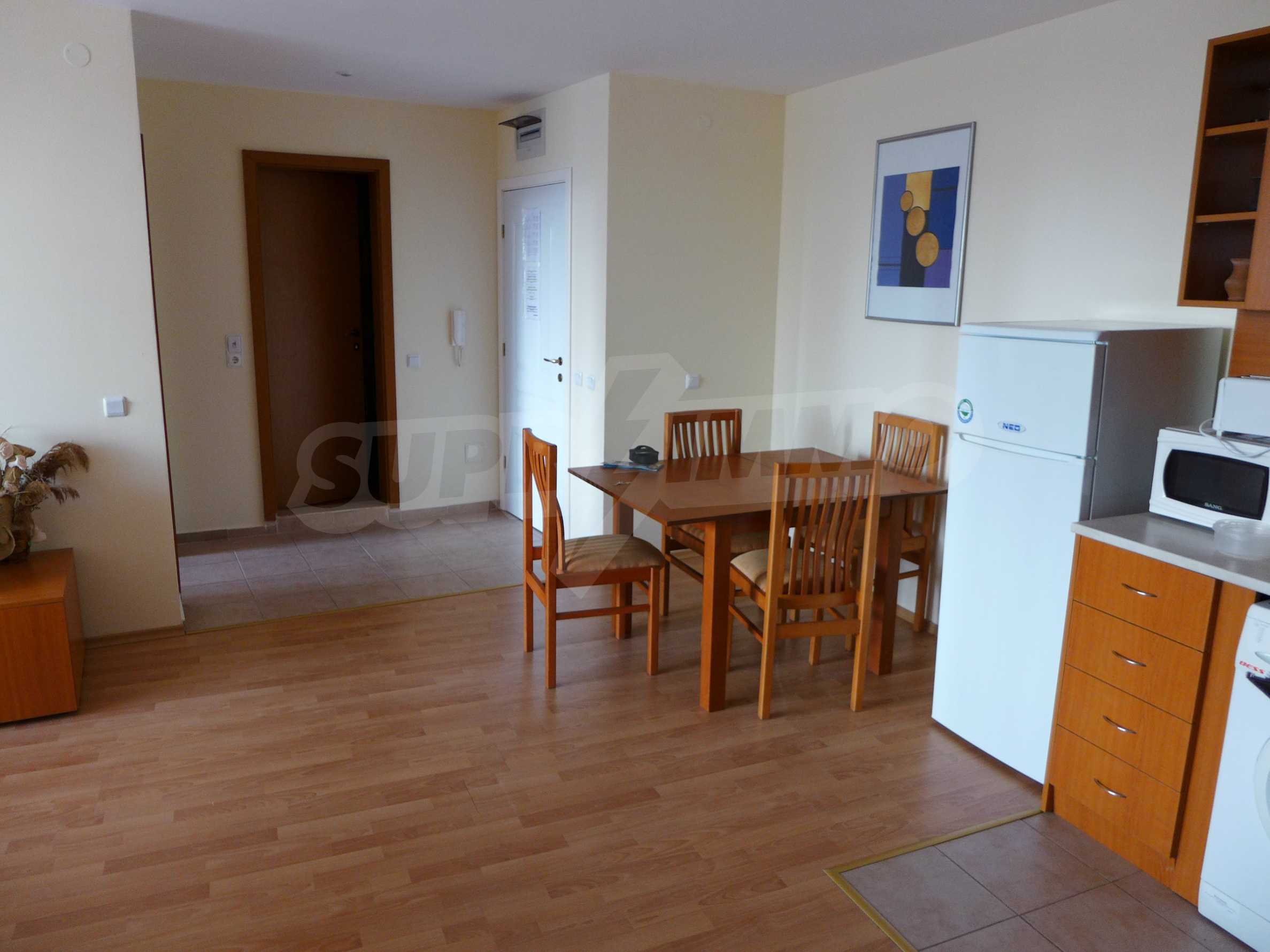 The luxury home that we offer for sale in this offer is set on the second floor with cool for the hot summer days northern exposure. The two-bedroom apartment spreads over a total area of 98 sq.m., of which the net area is 86.92 sq.m. The rooms are finished with laminate flooring and with tiles. The furniture and equipment included in the price, consists of: living room with kitchenette with a sofa, a kitchen table, a coffee table, a fridge, a washing machine, a TV set; first bedroom - with two beds, a dressing table, an air conditioner; second bedroom - with a double bed, a dressing table, bedside tables; bathroom with WC - with a shower box, a cupboard, two mirrors; toilet with a sink and a cupboard with mirror. The balcony is one, with beautiful views of the complex and the road. The apartment has cable TV and internet.