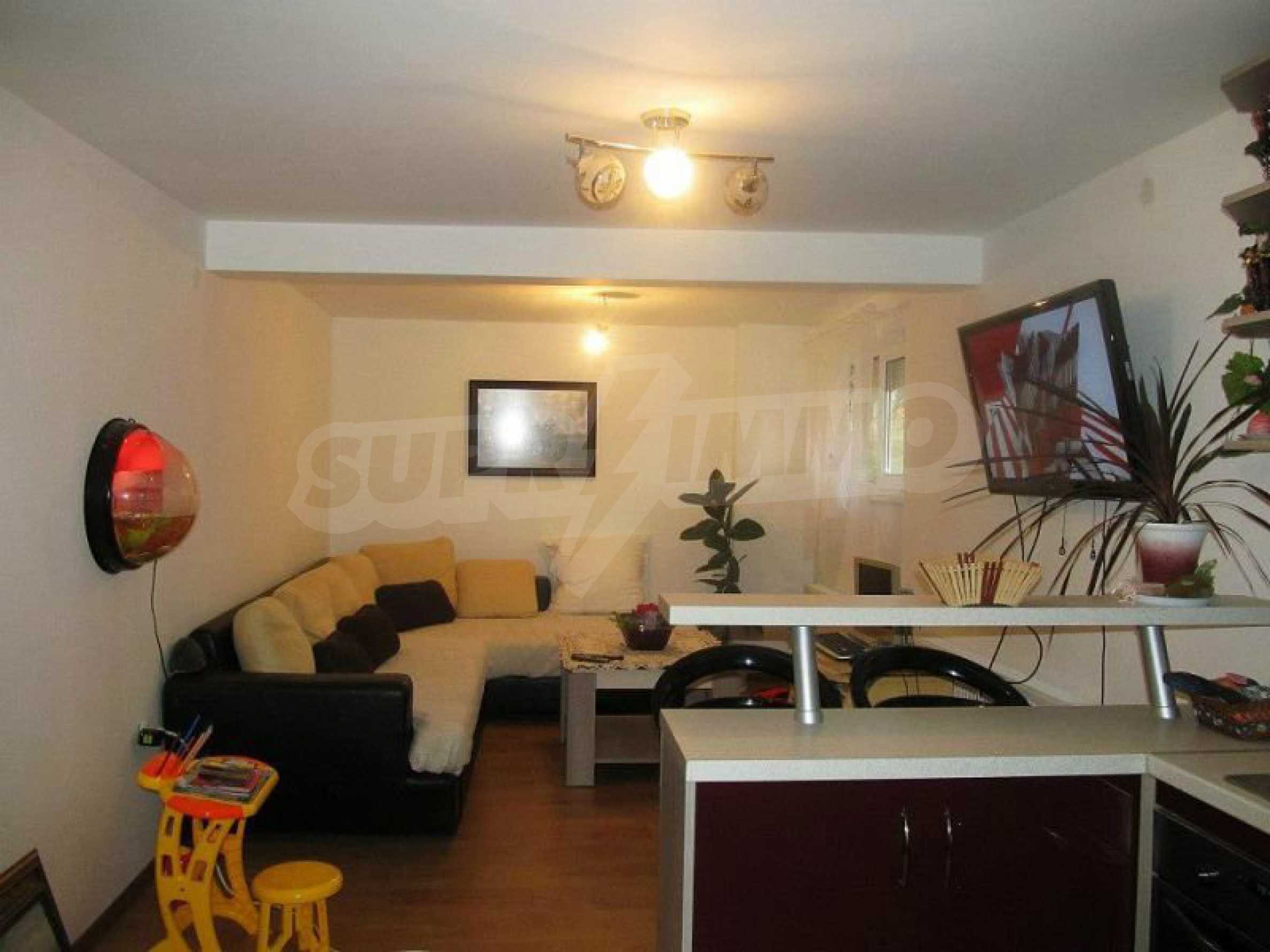 The first floor has a great room with spacious size - about 60 square meters, which has several rooms separated visually - kitchen, dining room and hallway. There is one large bedroom about 28 square meters and bathroom/WC.