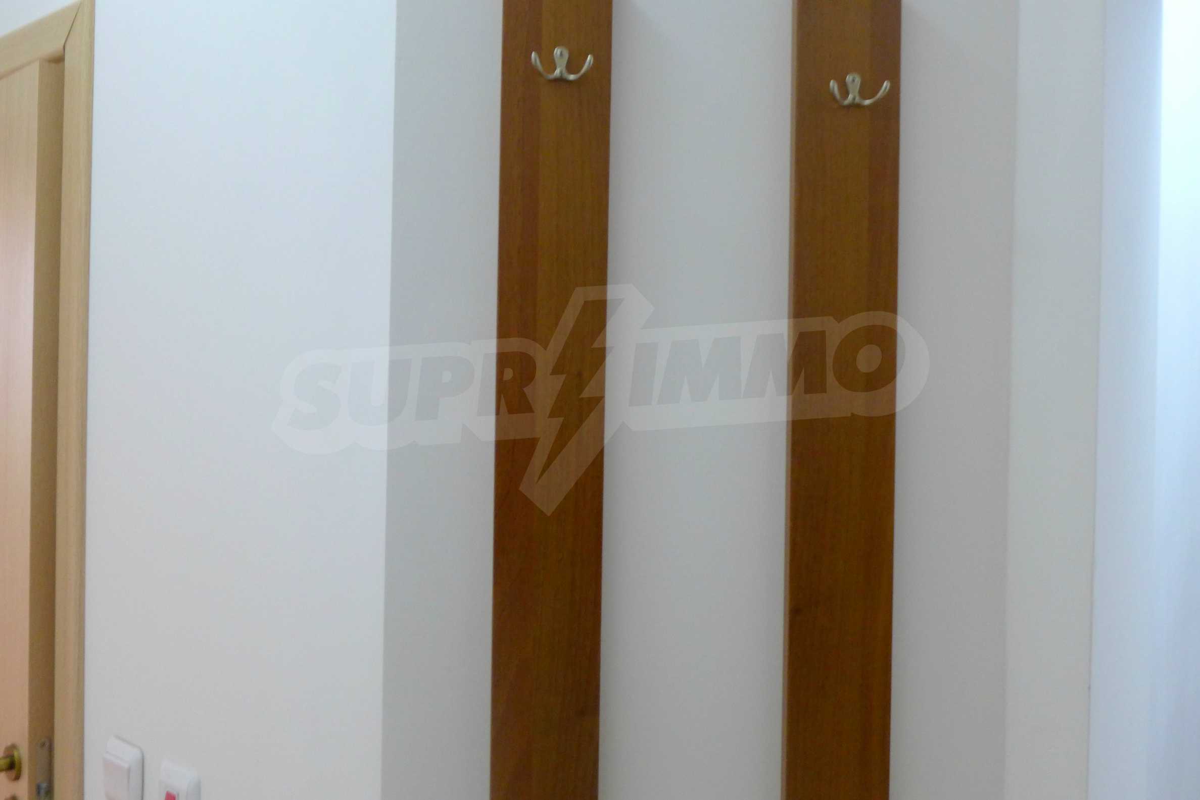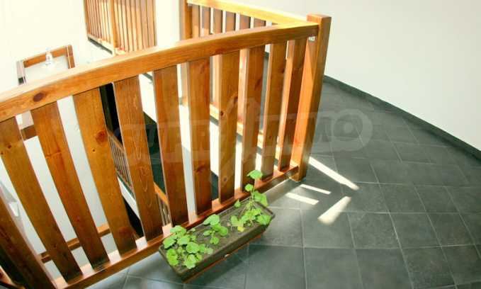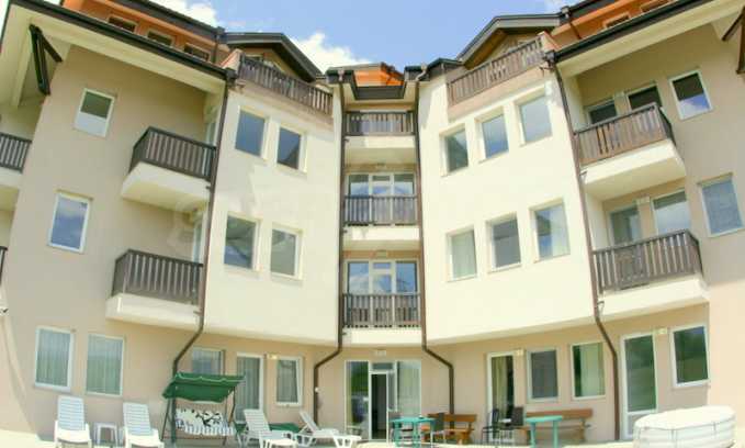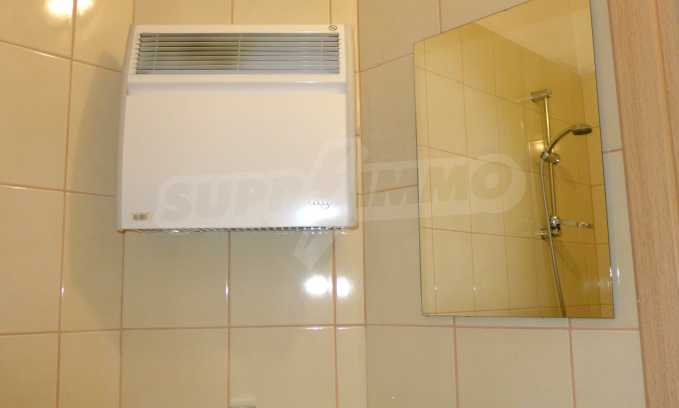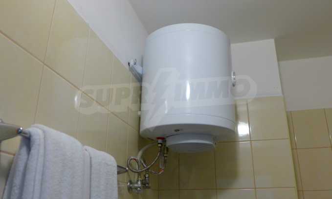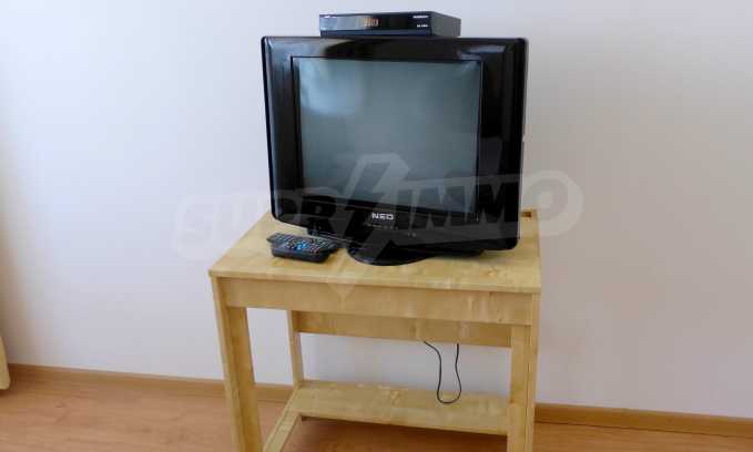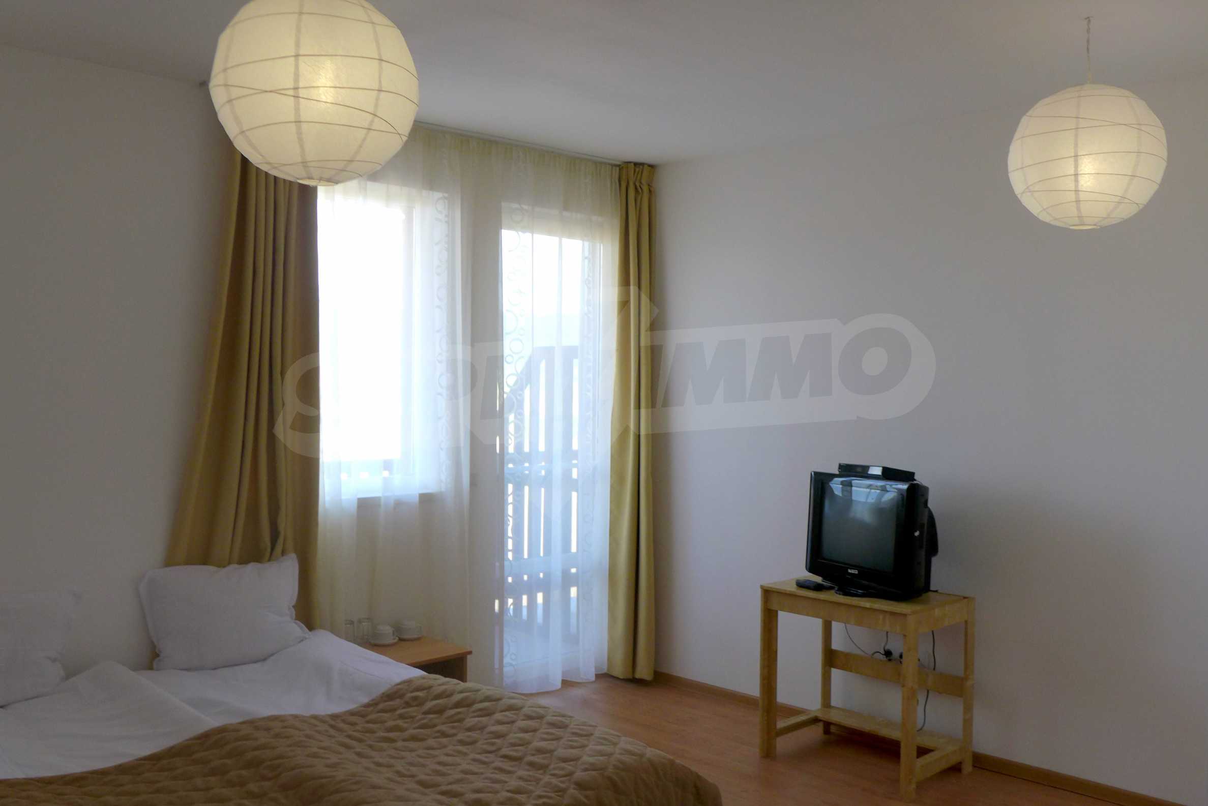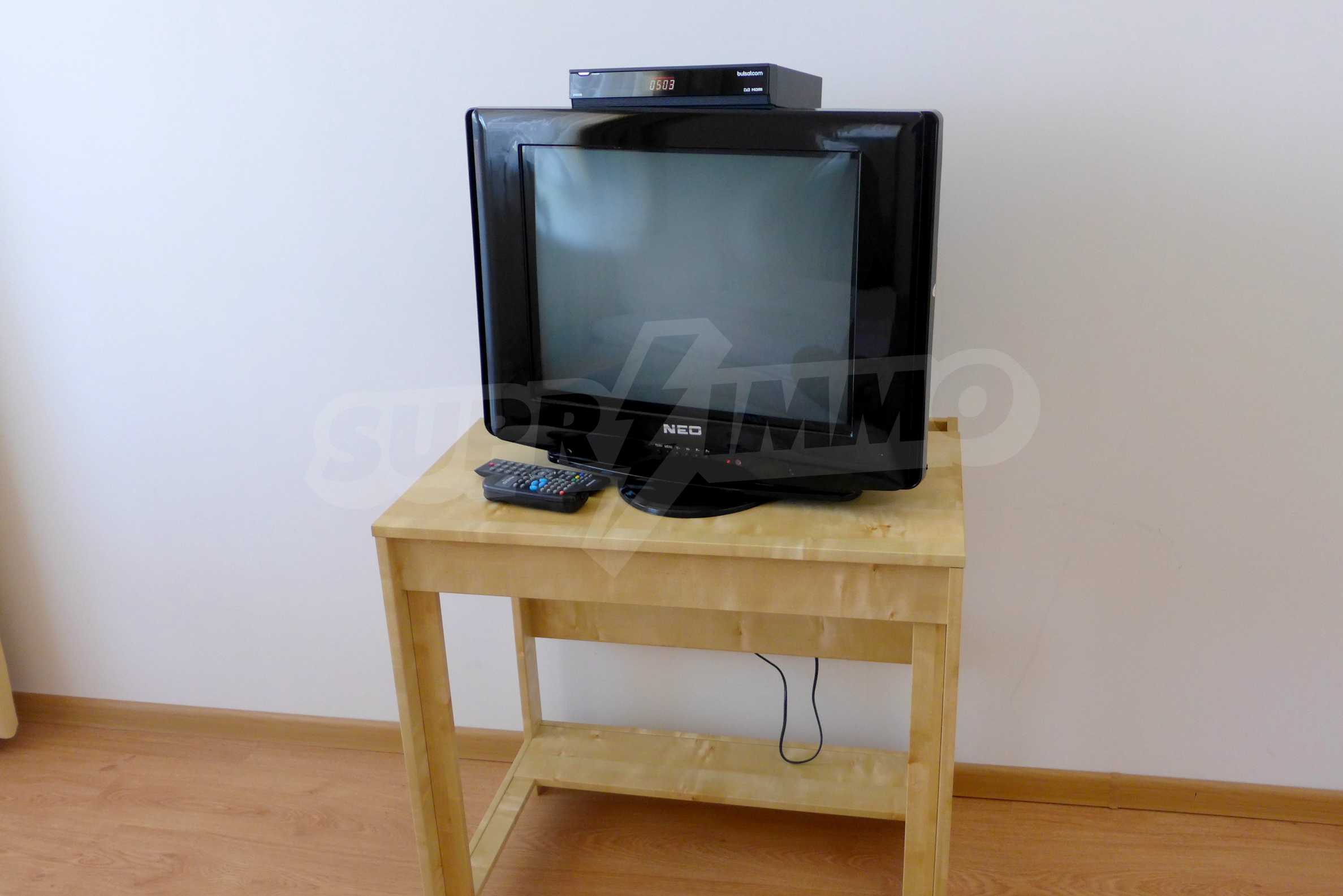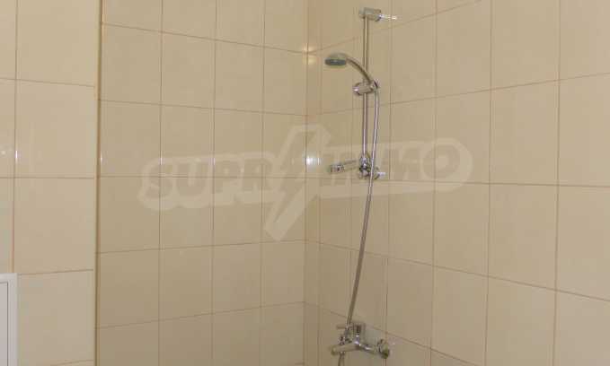 The apartment is finished with a total area of 42.82 sq.m., of which the net area is 34.35 sq.m. and the common areas are 8.47 sq.m. It is located on the second floor and has one northern balcony. The rooms are completed with painted walls, flooring - with laminate and tiles and PVC joinery. The furniture includes a sofa, chairs, a TV set, a coffee table (living room), a double bed (bedroom) and a fully finished bathroom with a shower, a water heater and a sink. The apartment is sold furnished without the kitchenette furniture (there is only preparation for it). The property is wired for Internet, telephone and cable TV. The bathrooms in the complex are supplied with mineral hot water. The building has an elevator and 24- hour reception. The fee for the maintenance of the common areas is 9 Euro / sq.m. per year.
