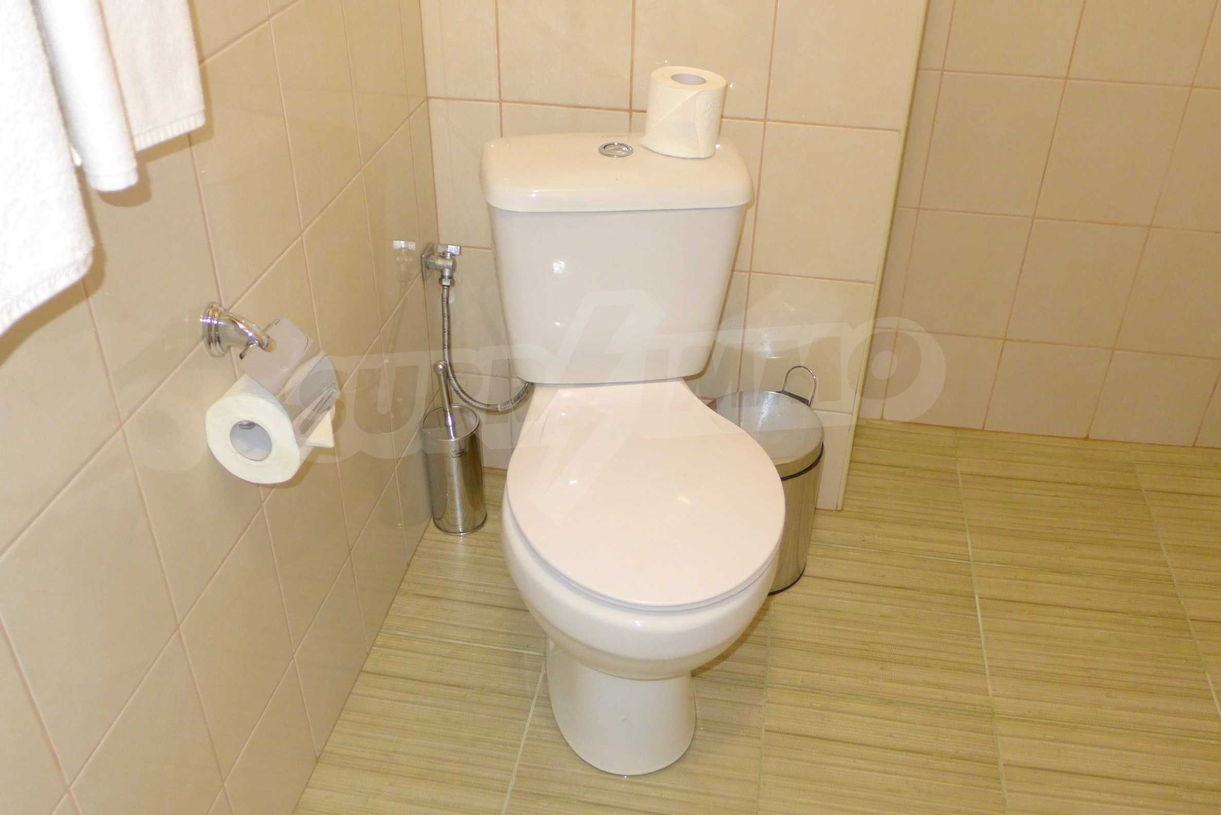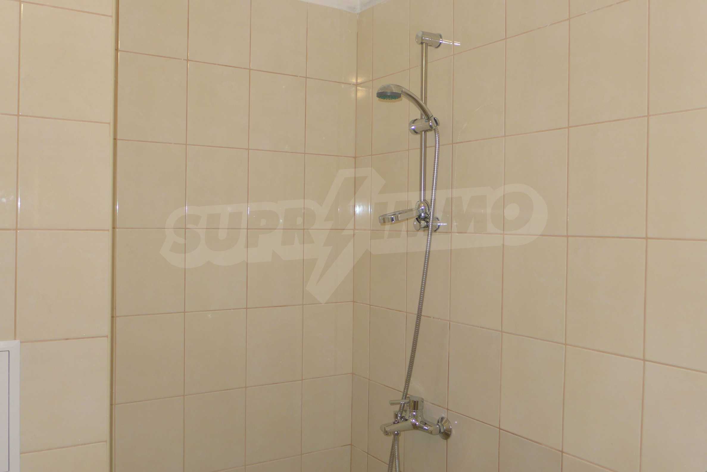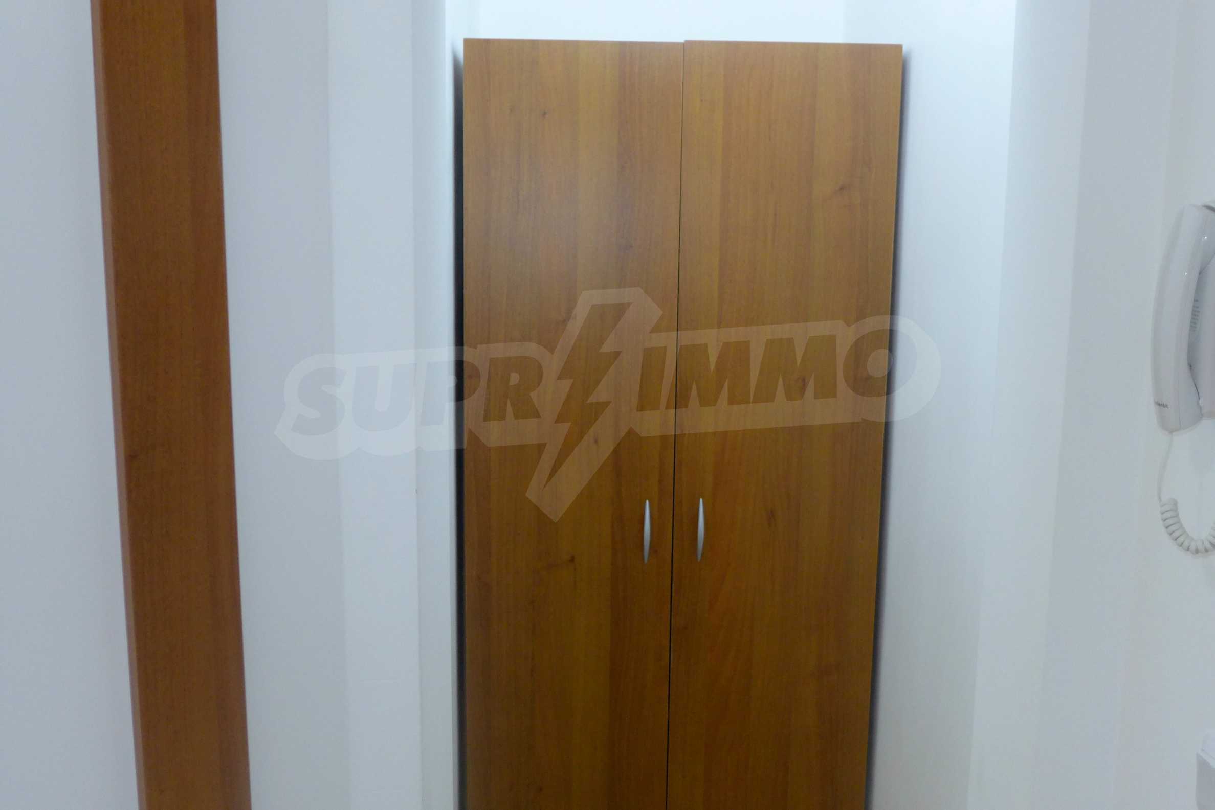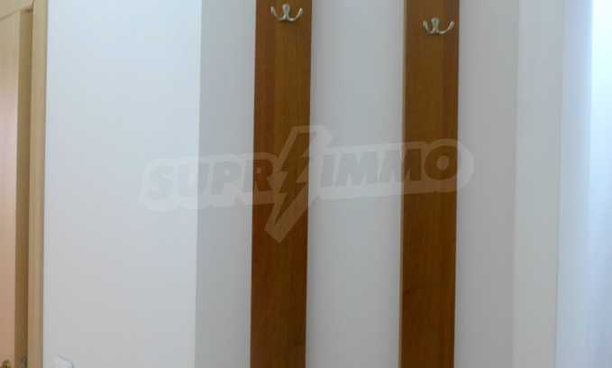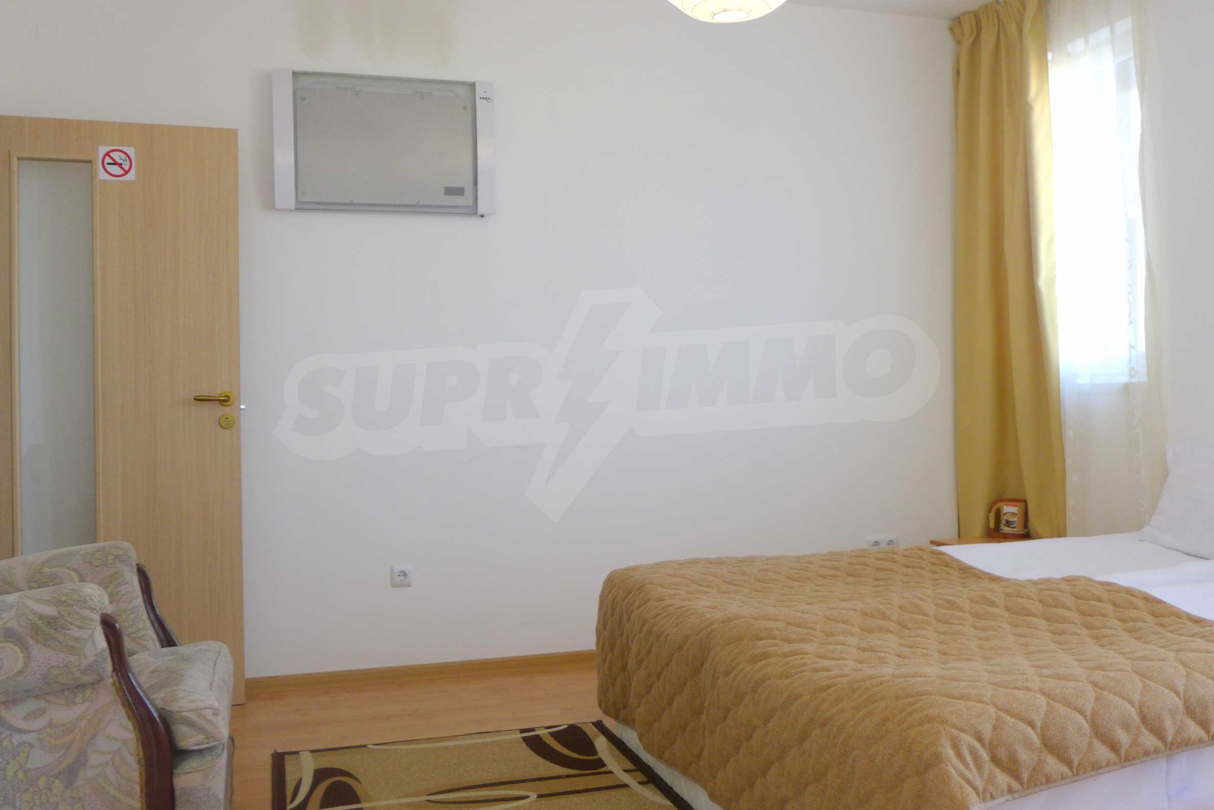 The apartment is finished with a total area of 42.82 sq.m., of which the net area is 34.35 sq.m. and the common areas are 8.47 sq.m. It is located on the second floor and has one northern balcony. The rooms are completed with painted walls, flooring - with laminate and tiles and PVC joinery. The furniture includes a sofa, chairs, a TV set, a coffee table (living room), a double bed (bedroom) and a fully finished bathroom with a shower, a water heater and a sink. The apartment is sold furnished without the kitchenette furniture (there is only preparation for it). The property is wired for Internet, telephone and cable TV. The bathrooms in the complex are supplied with mineral hot water. The building has an elevator and 24- hour reception. The fee for the maintenance of the common areas is 9 Euro / sq.m. per year.