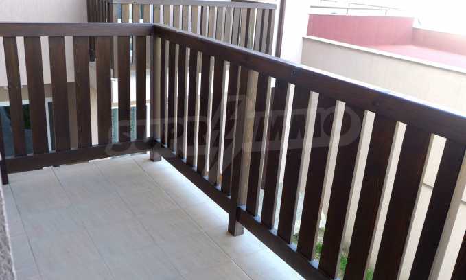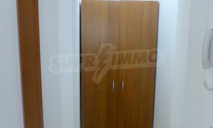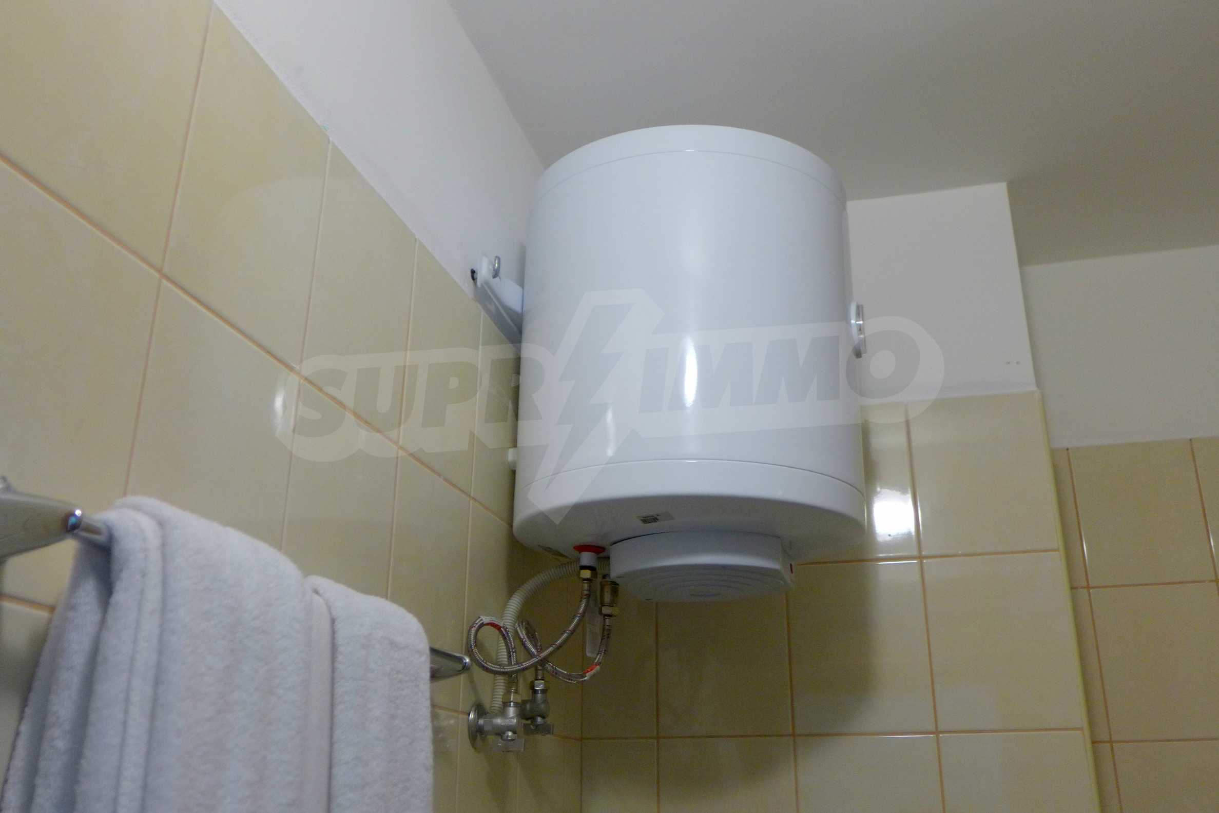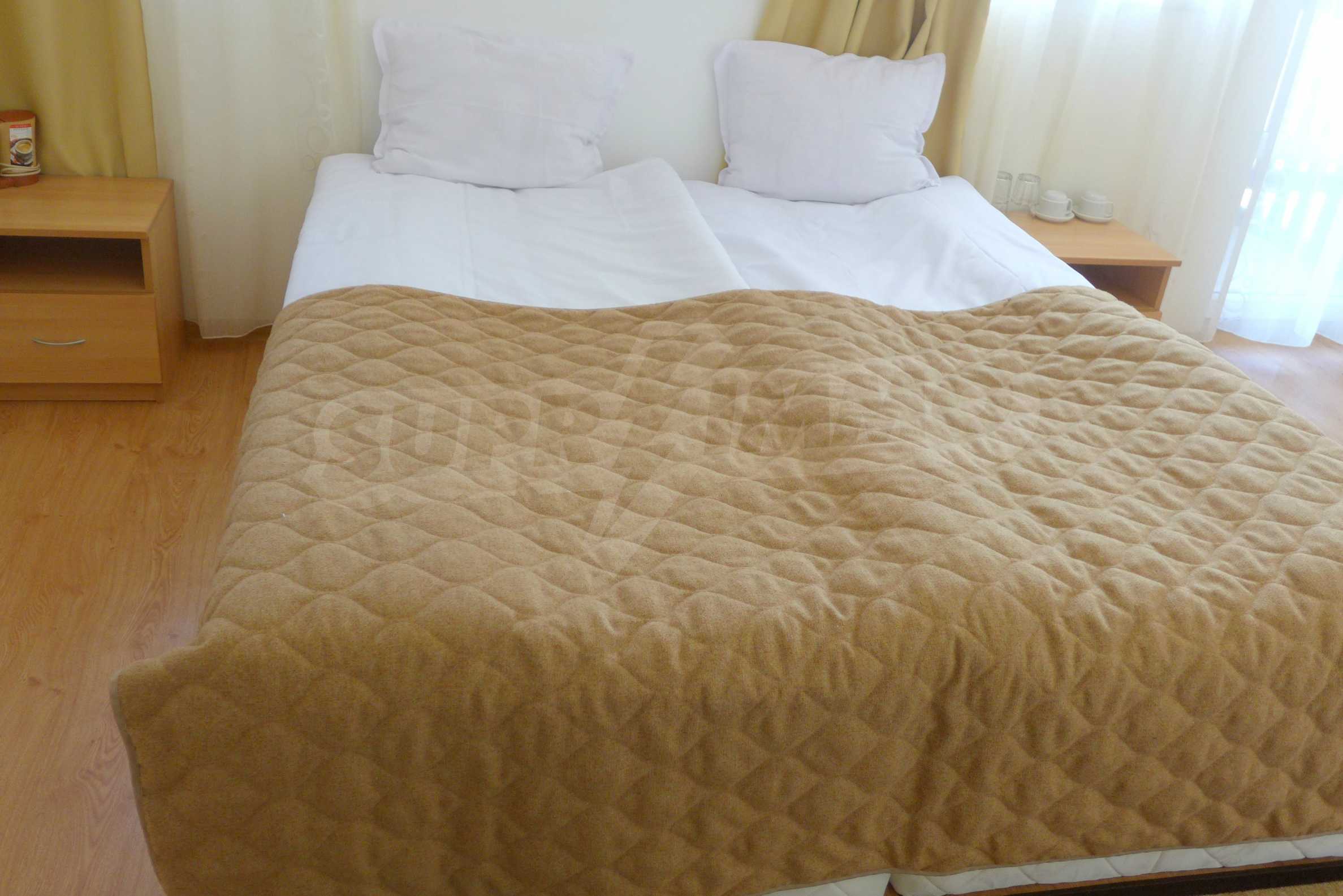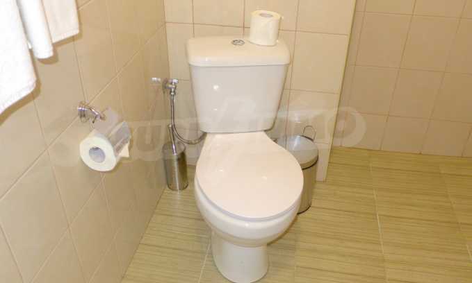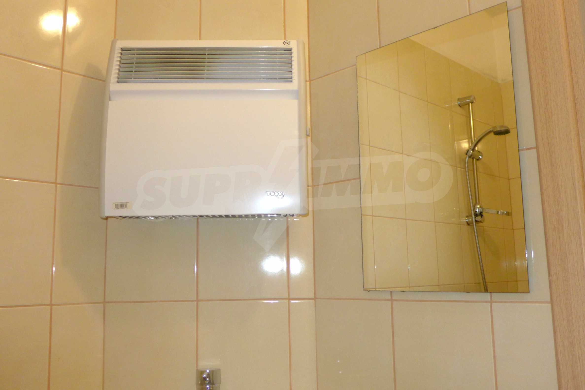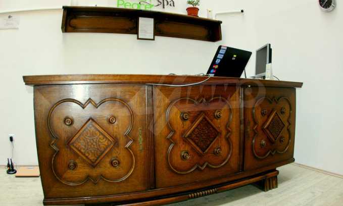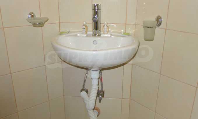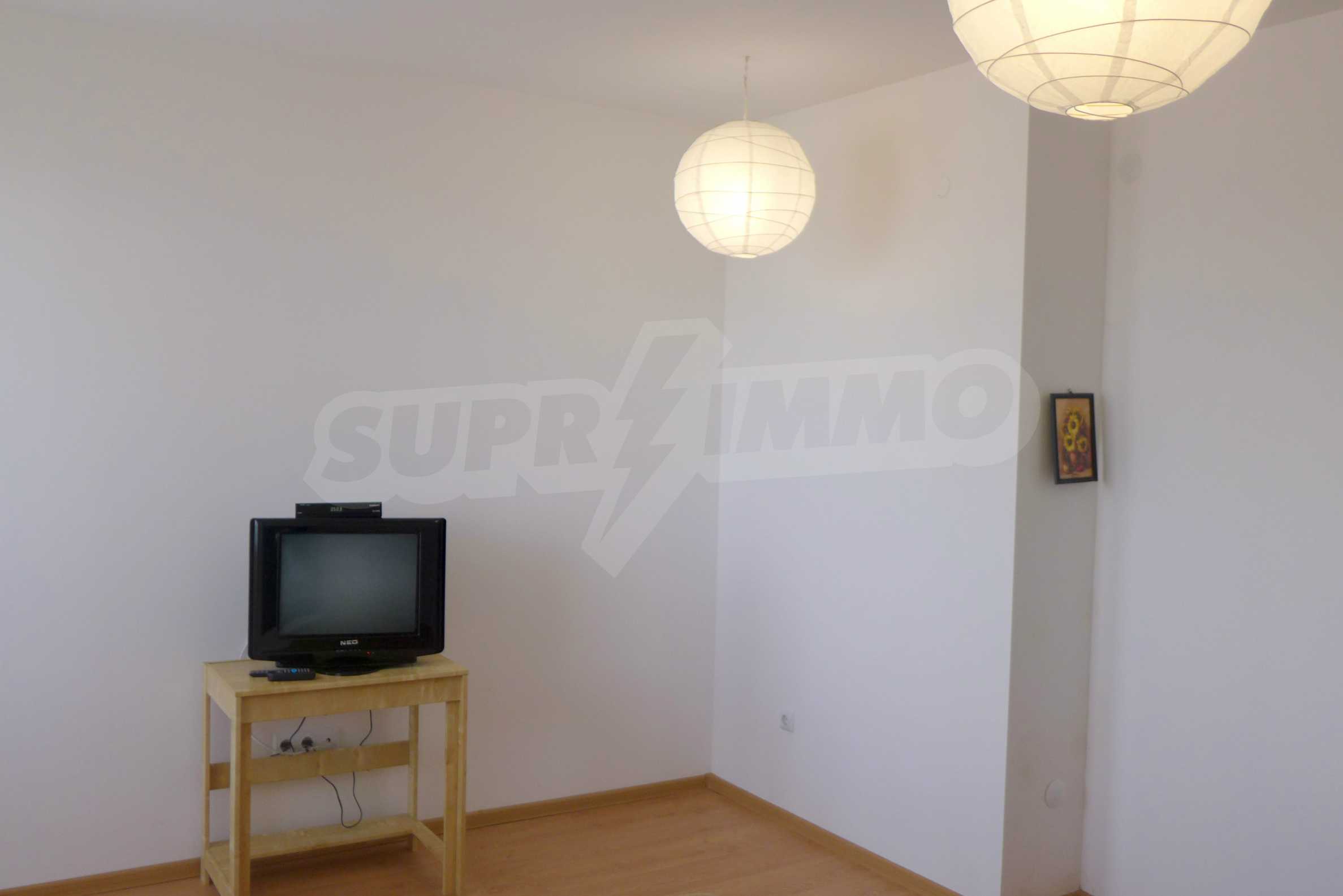 The apartment is finished with a total area of 42.82 sq.m., of which the net area is 34.35 sq.m. and the common areas are 8.47 sq.m. It is located on the second floor and has one northern balcony. The rooms are completed with painted walls, flooring - with laminate and tiles and PVC joinery. The furniture includes a sofa, chairs, a TV set, a coffee table (living room), a double bed (bedroom) and a fully finished bathroom with a shower, a water heater and a sink. The apartment is sold furnished without the kitchenette furniture (there is only preparation for it). The property is wired for Internet, telephone and cable TV. The bathrooms in the complex are supplied with mineral hot water. The building has an elevator and 24- hour reception. The fee for the maintenance of the common areas is 9 Euro / sq.m. per year.