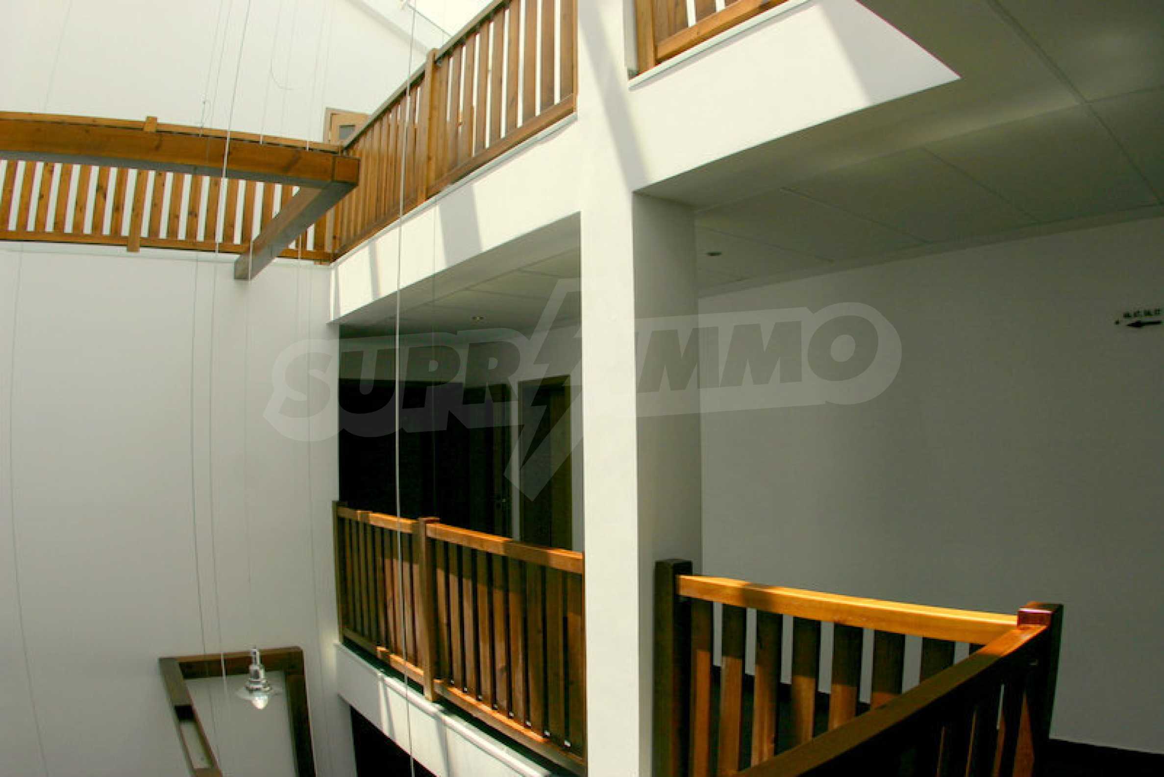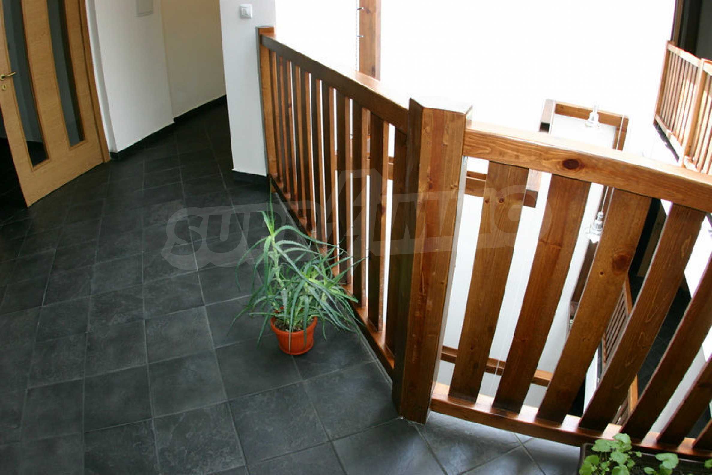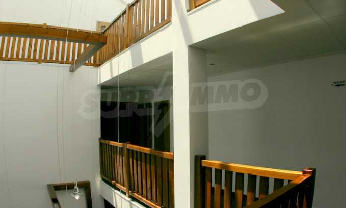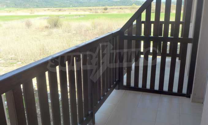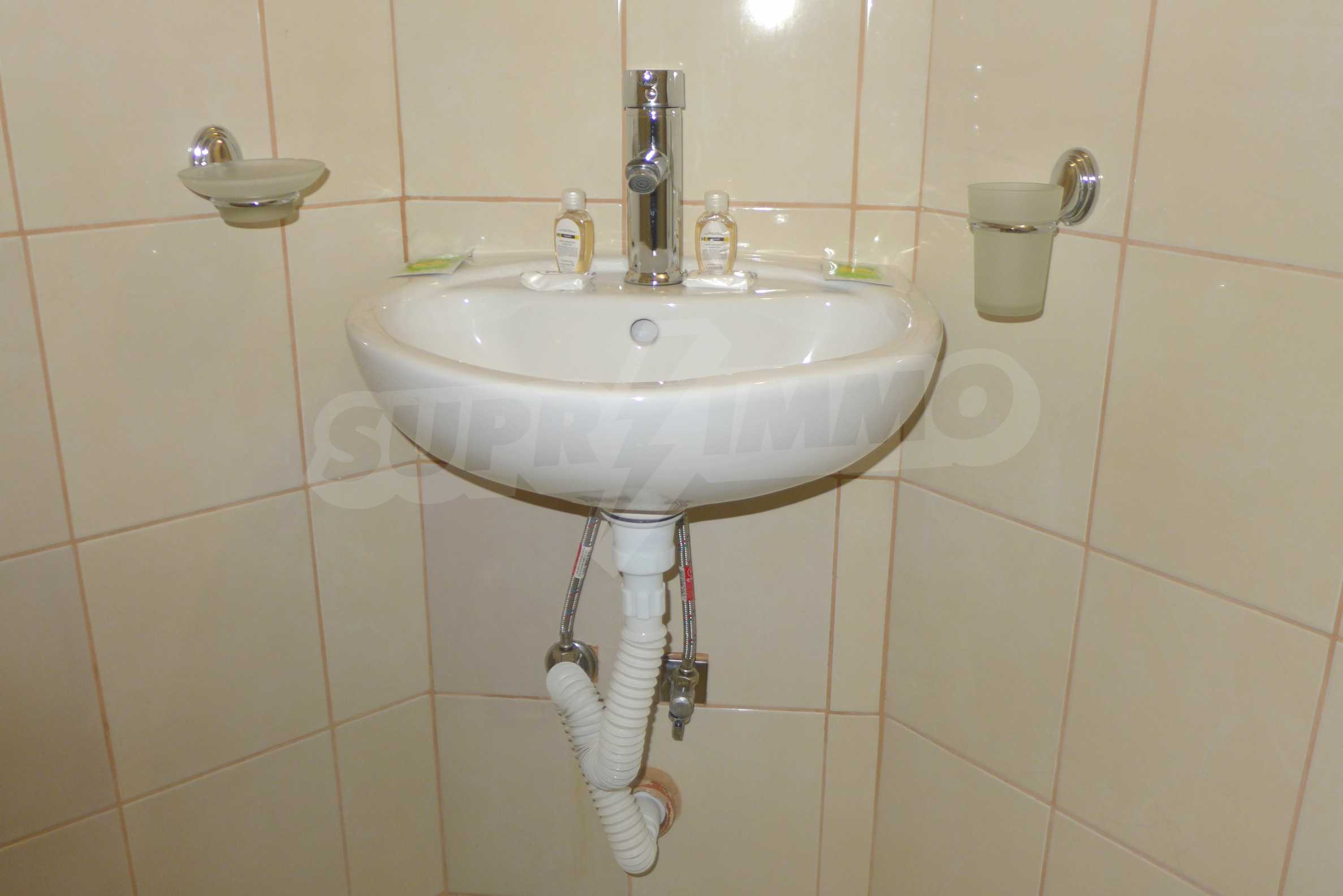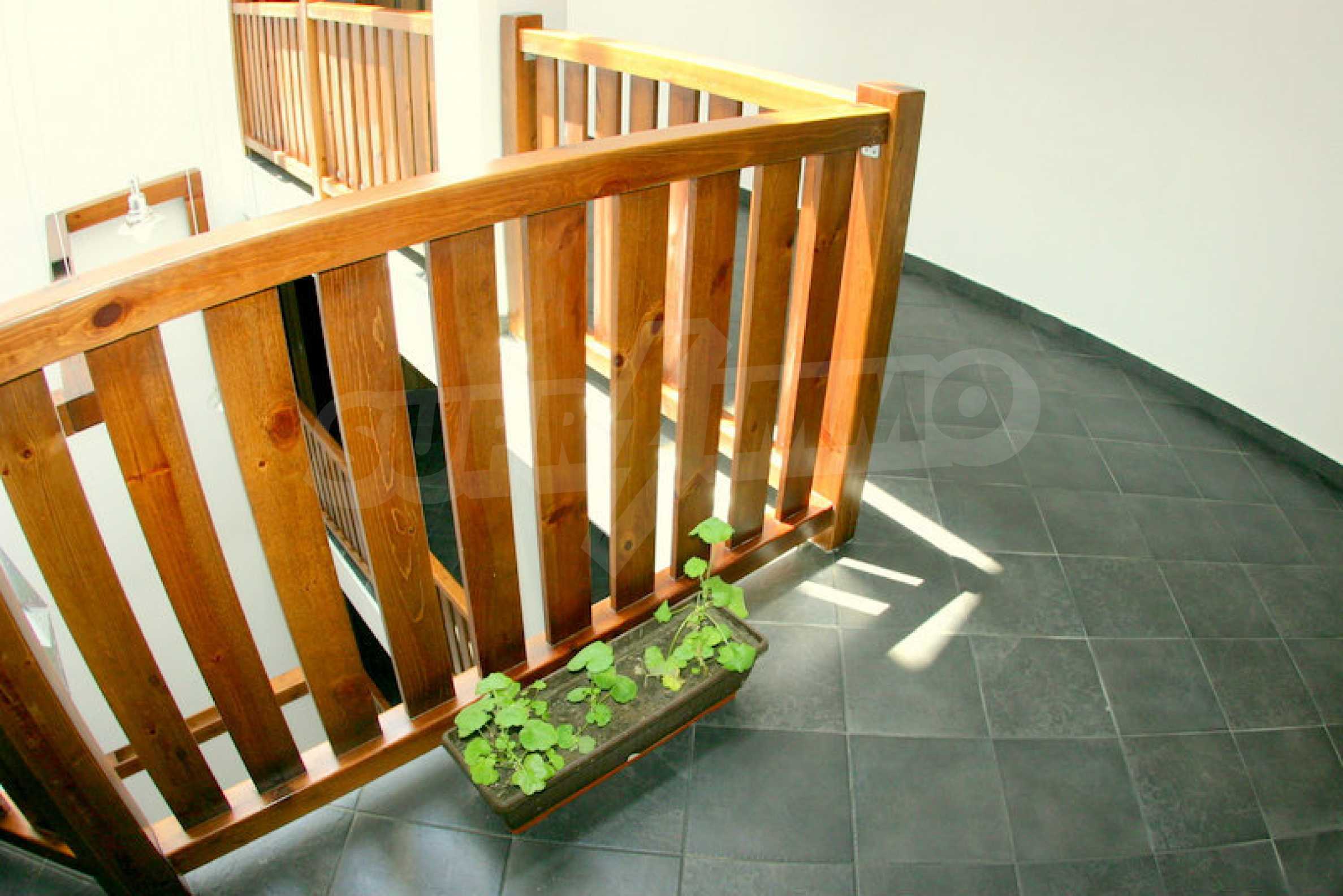 The apartment is finished with a total area of 42.82 sq.m., of which the net area is 34.35 sq.m. and the common areas are 8.47 sq.m. It is located on the second floor and has one northern balcony. The rooms are completed with painted walls, flooring - with laminate and tiles and PVC joinery. The furniture includes a sofa, chairs, a TV set, a coffee table (living room), a double bed (bedroom) and a fully finished bathroom with a shower, a water heater and a sink. The apartment is sold furnished without the kitchenette furniture (there is only preparation for it). The property is wired for Internet, telephone and cable TV. The bathrooms in the complex are supplied with mineral hot water. The building has an elevator and 24- hour reception. The fee for the maintenance of the common areas is 9 Euro / sq.m. per year.