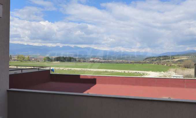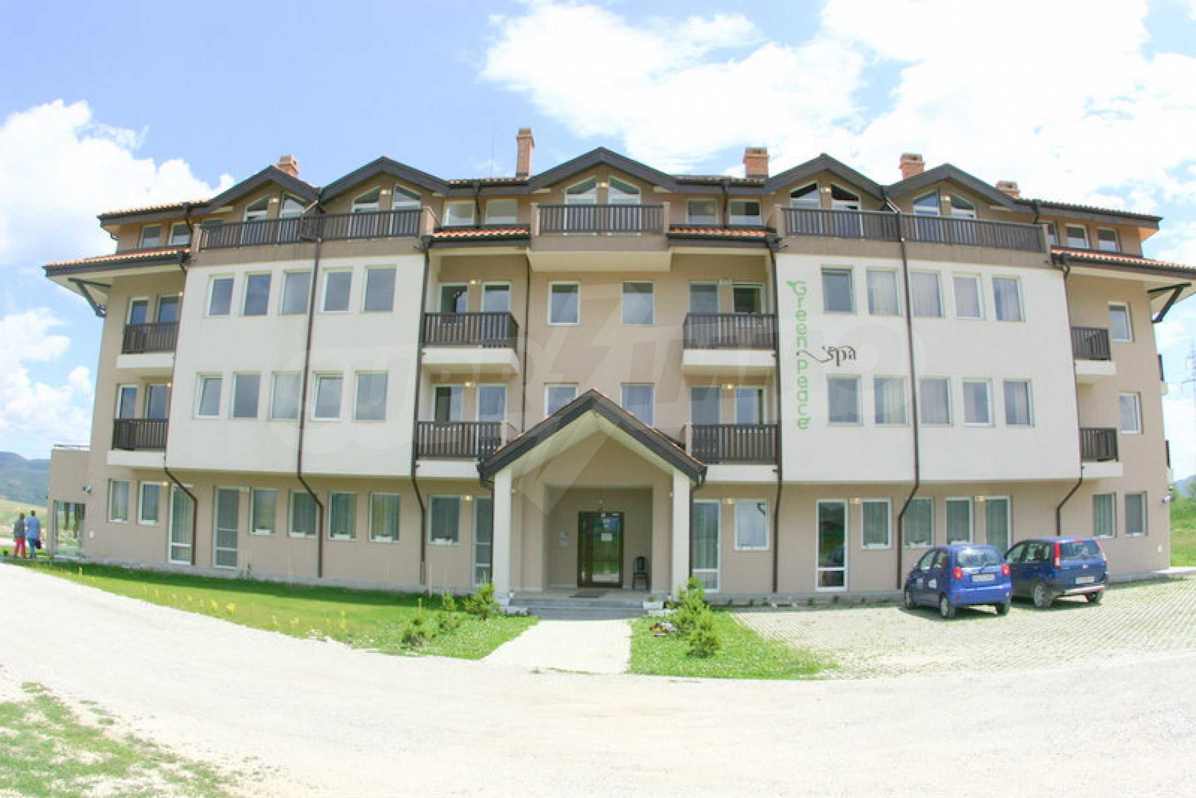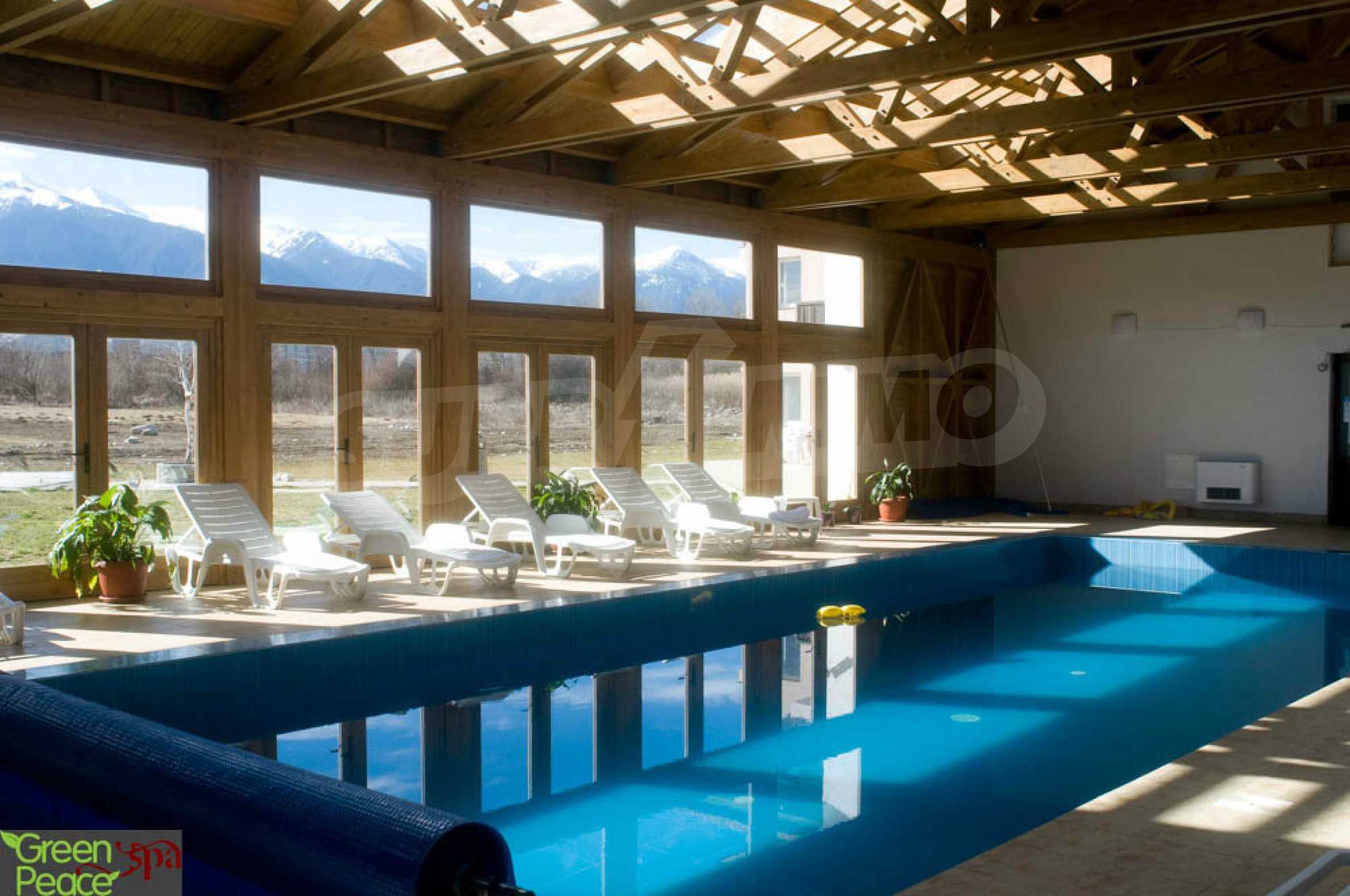 We sell a great studio with panoramic views of the Rila and Rhodope Mountains, situated in a modern gated complex which is equipped with indoor and outdoor swimming pools with mineral water. Since there are no other nearby buildings to interfere with the panoramic views, the complex, nestled in the valley between the Pirin, Rila and Rhodope mountains, enjoys spaciousness and quietness. The newly built apart-hotel Green Peace Spa is set 300 meters from the road connecting the ski resort Bansko and the village of Banya, famous for its natural hot springs. The gated complex Pirin is situated nearby.