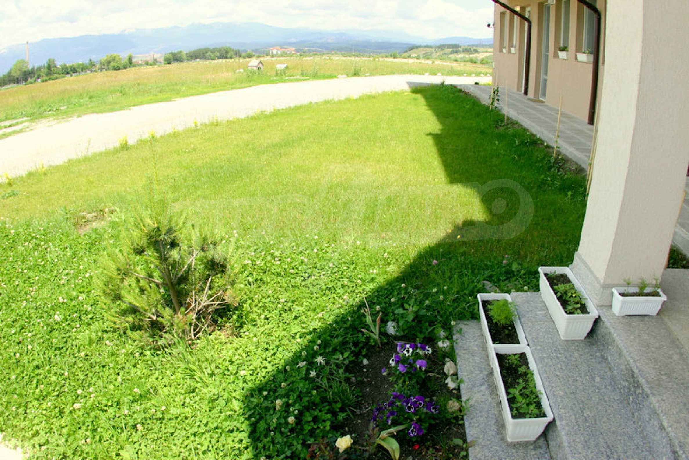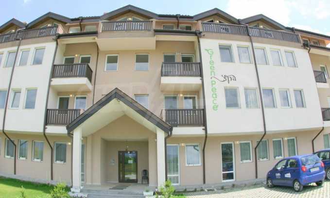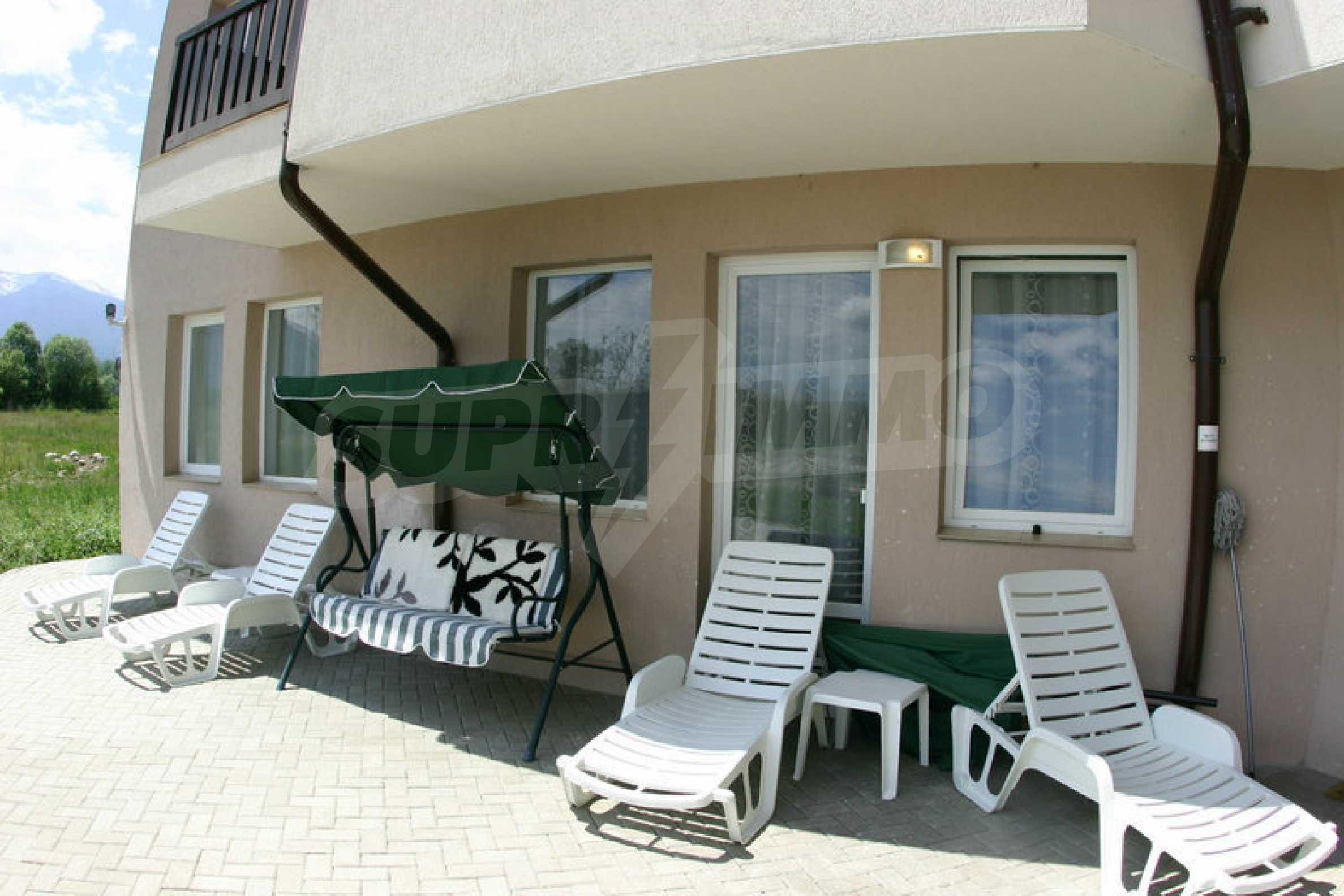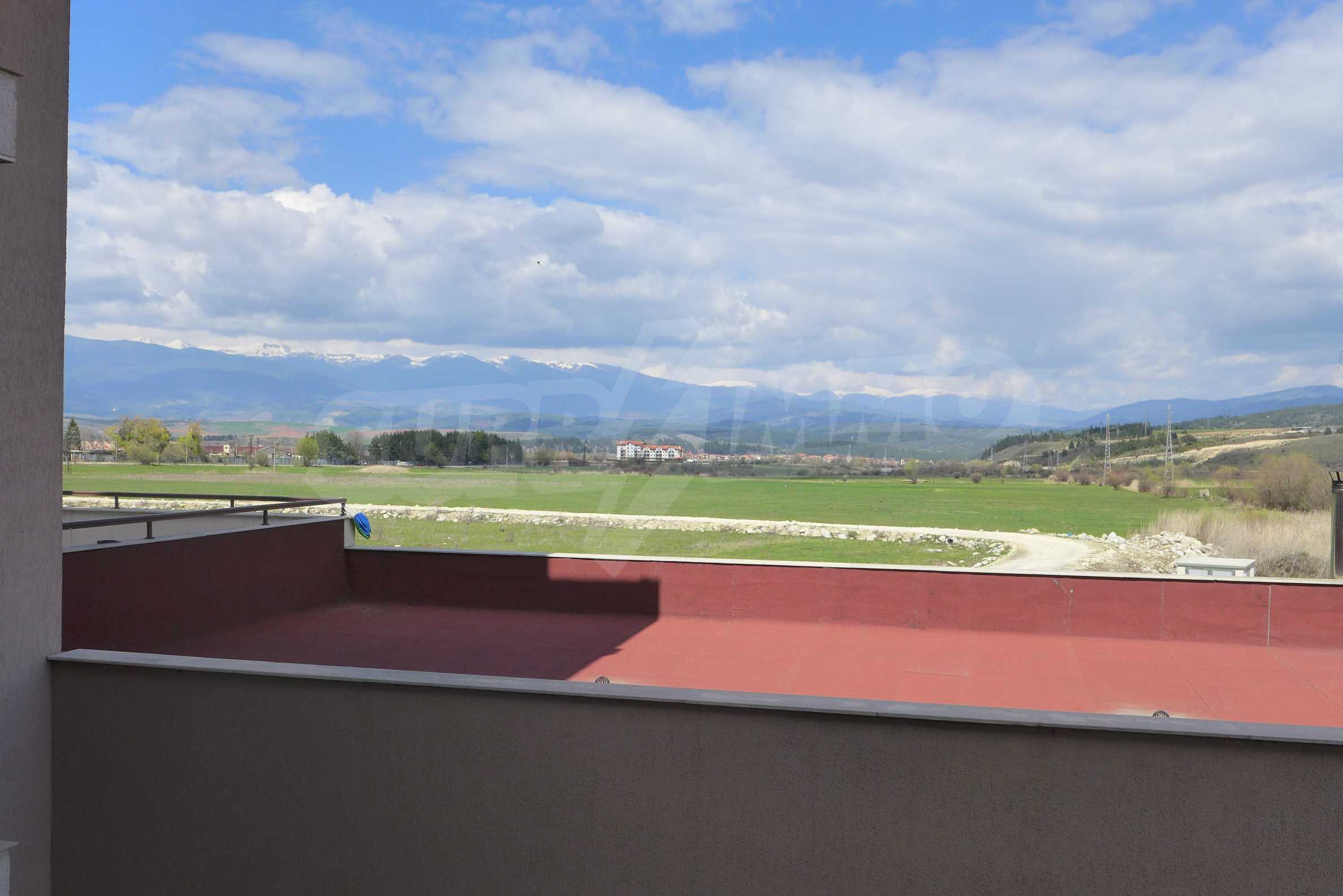 We sell a great studio with panoramic views of the Rila and Rhodope Mountains, situated in a modern gated complex which is equipped with indoor and outdoor swimming pools with mineral water. Since there are no other nearby buildings to interfere with the panoramic views, the complex, nestled in the valley between the Pirin, Rila and Rhodope mountains, enjoys spaciousness and quietness. The newly built apart-hotel Green Peace Spa is set 300 meters from the road connecting the ski resort Bansko and the village of Banya, famous for its natural hot springs. The gated complex Pirin is situated nearby.