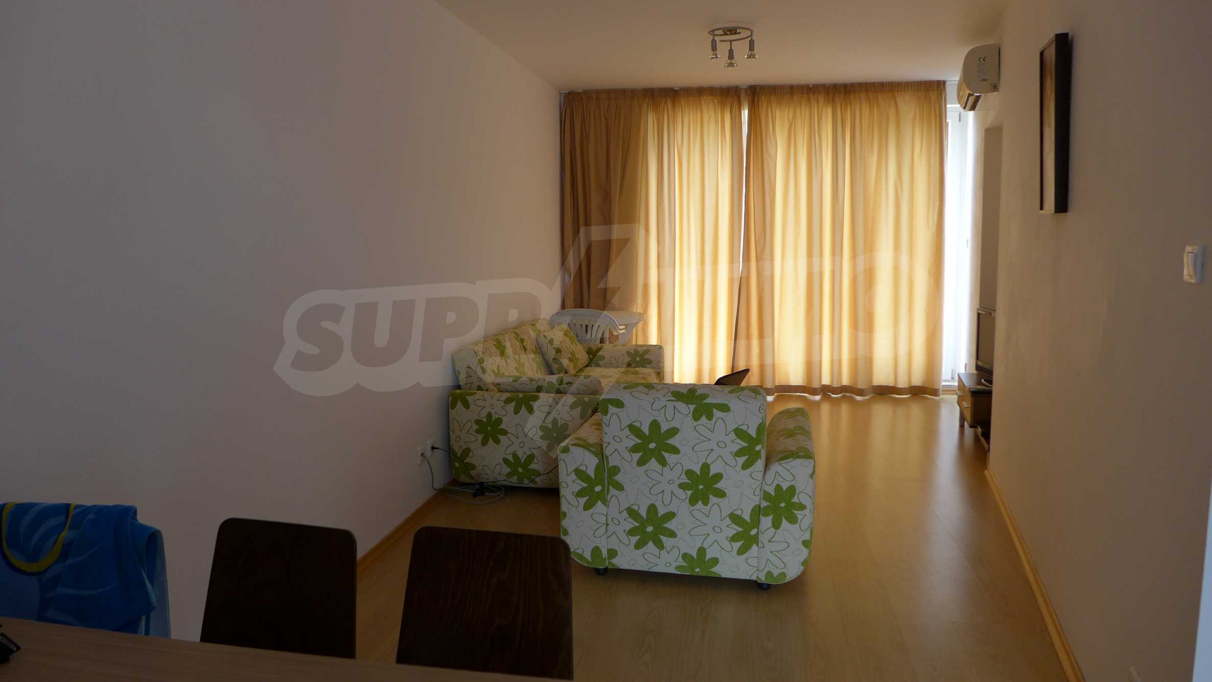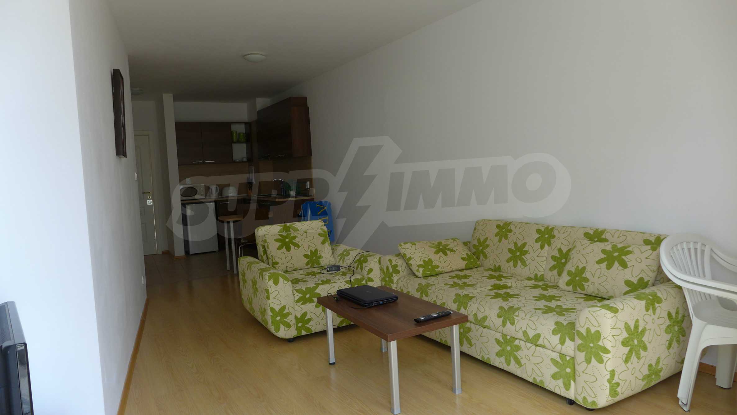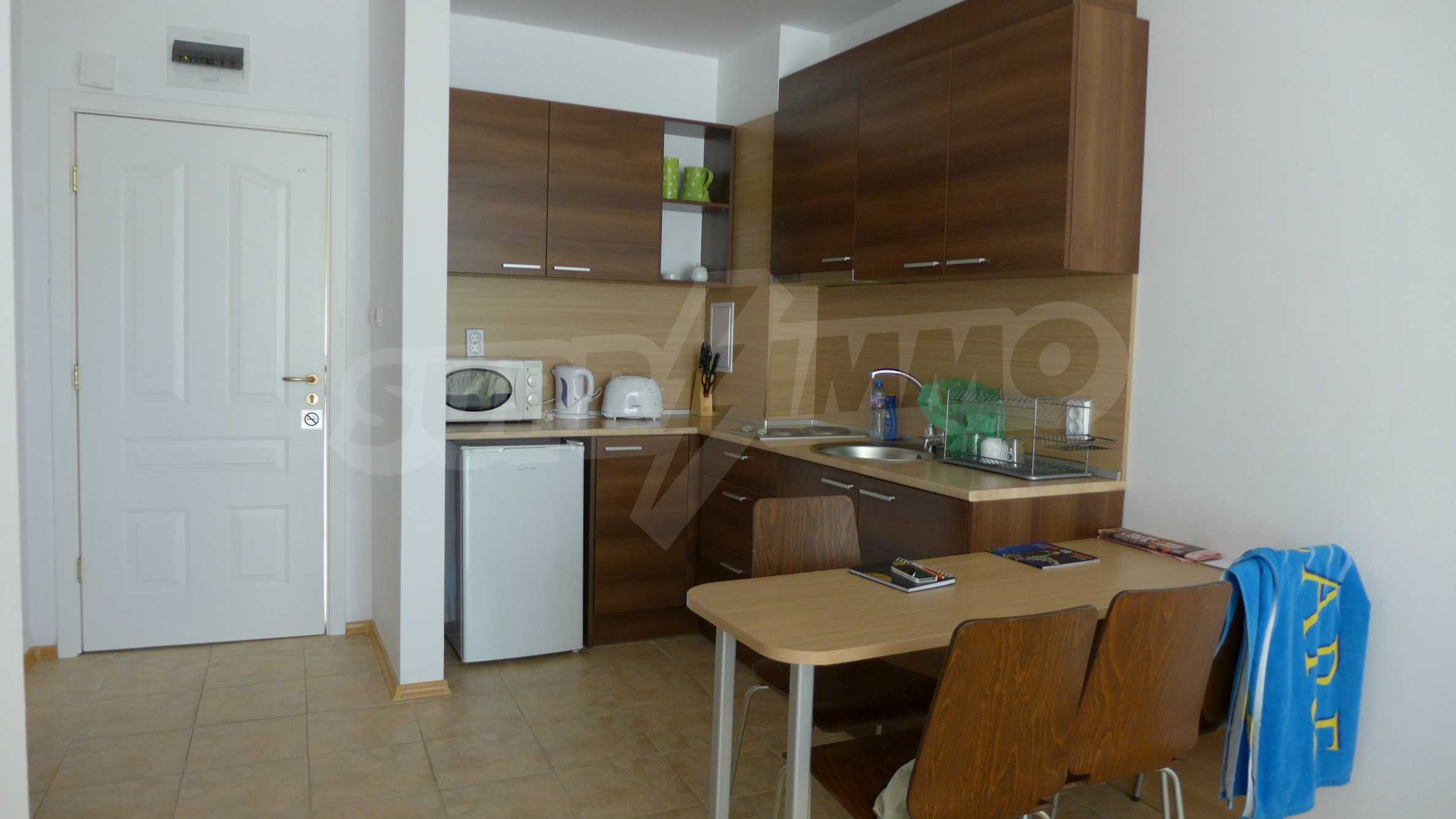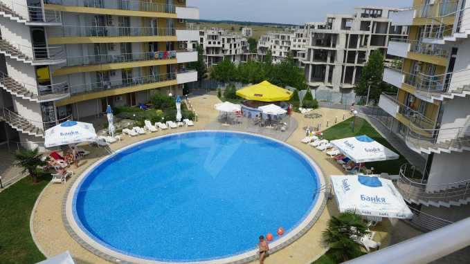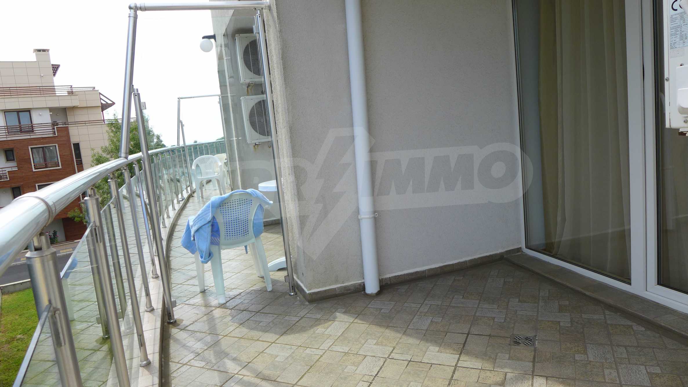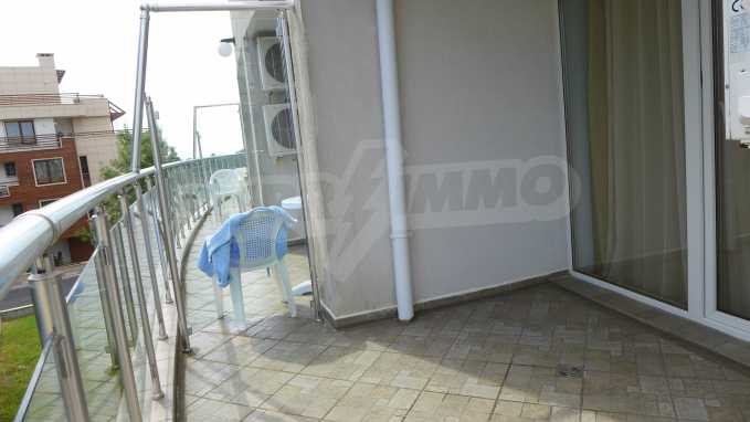 Bay View is a complex with distinctive architecture in Mediterranean style (2008), located on the beach where Strandzha mountain comes into the Black sea, less than 2 minutes from a quiet beach in proximity to the mountains. The apartment that we describe in this offer is set on the second floor and is equipped with cable TV and Internet. It consists of an entrance hall, a bathroom with toilet, a living room with kitchenette, a bedroom and a balcony. The floors in the hallway are tiled and in the living room and bedroom - with laminate. The bathroom is finished with a shower box. The annual maintenance fee is 12 euro / sq.m. (VAT included).