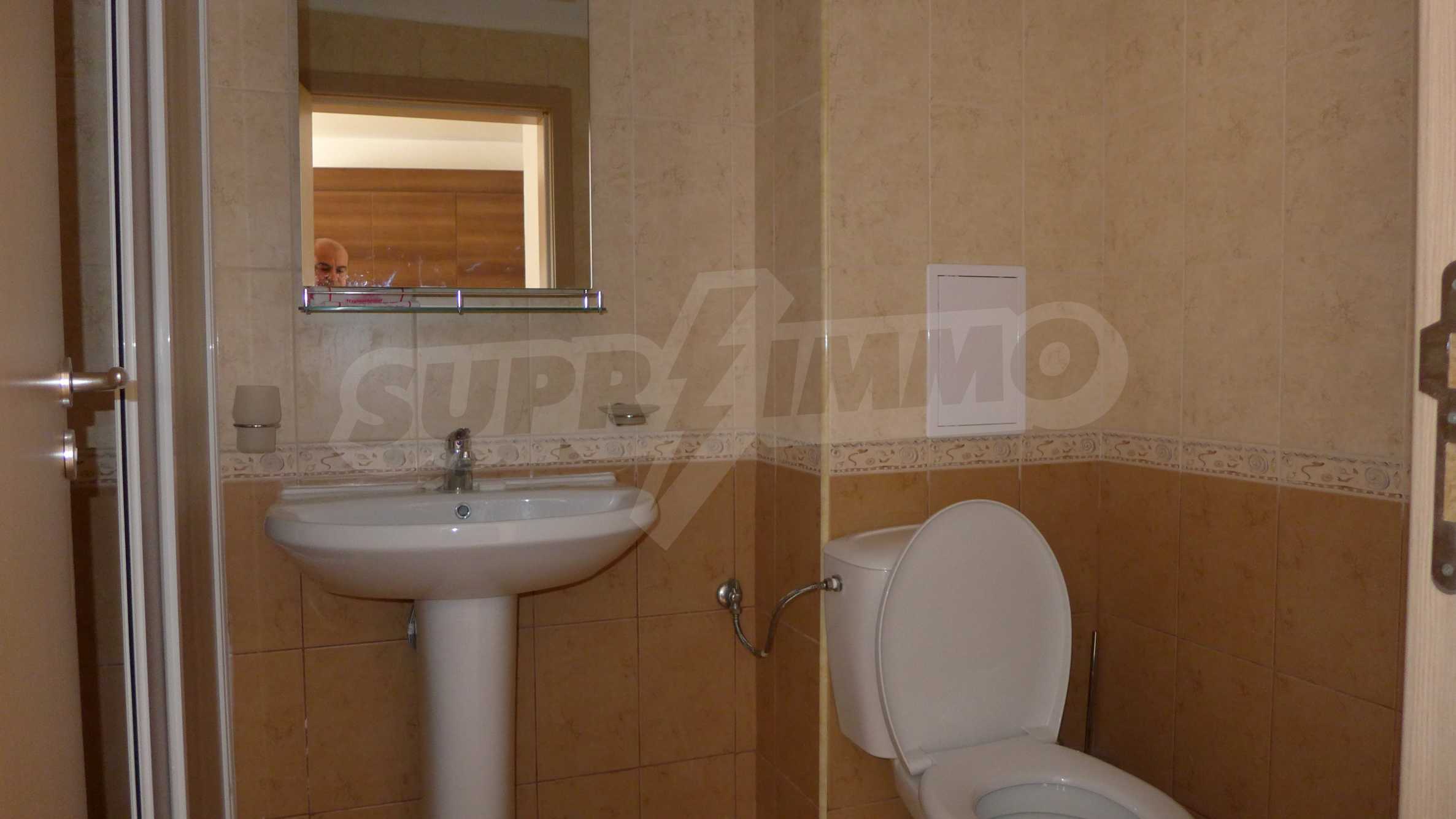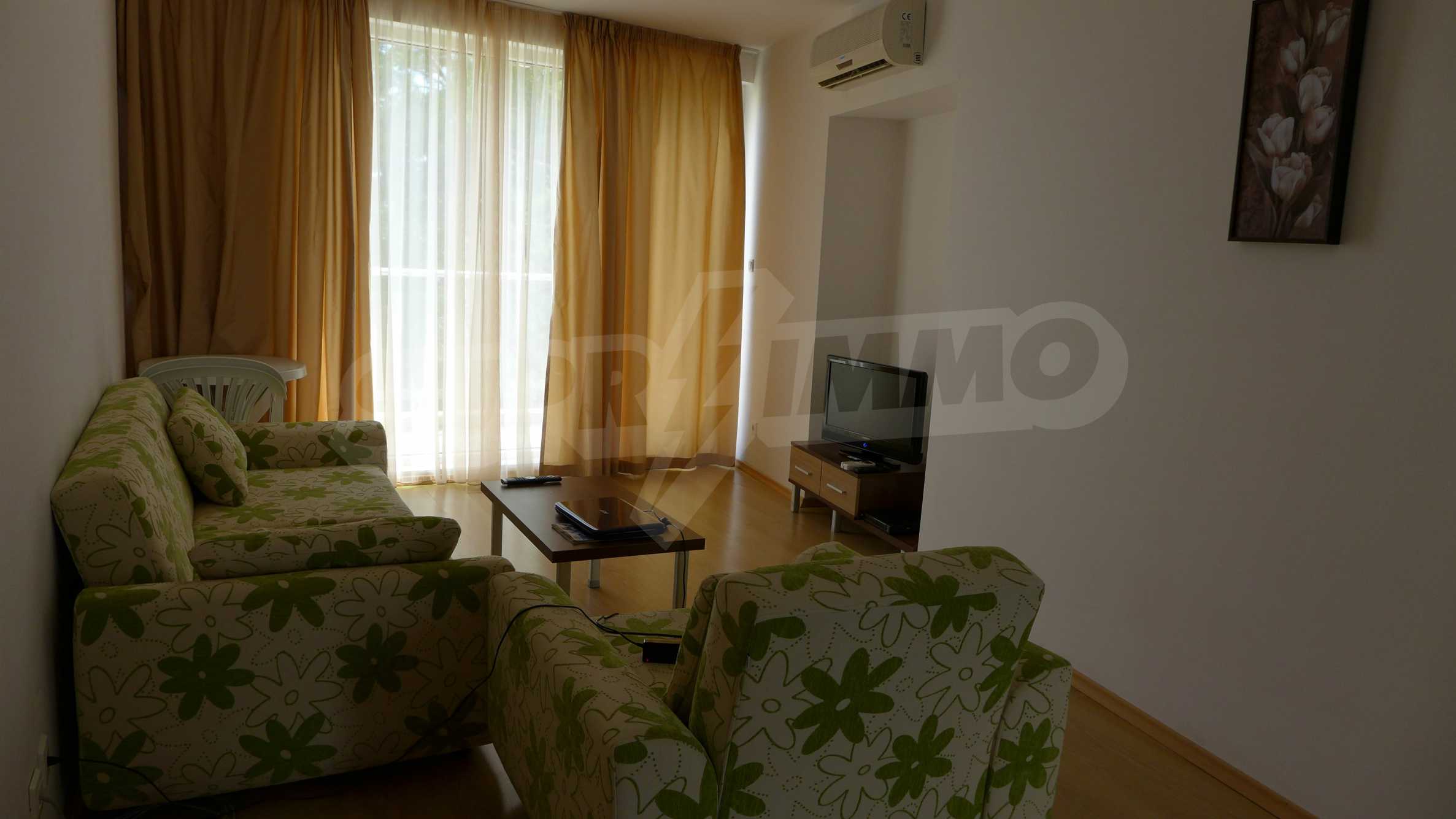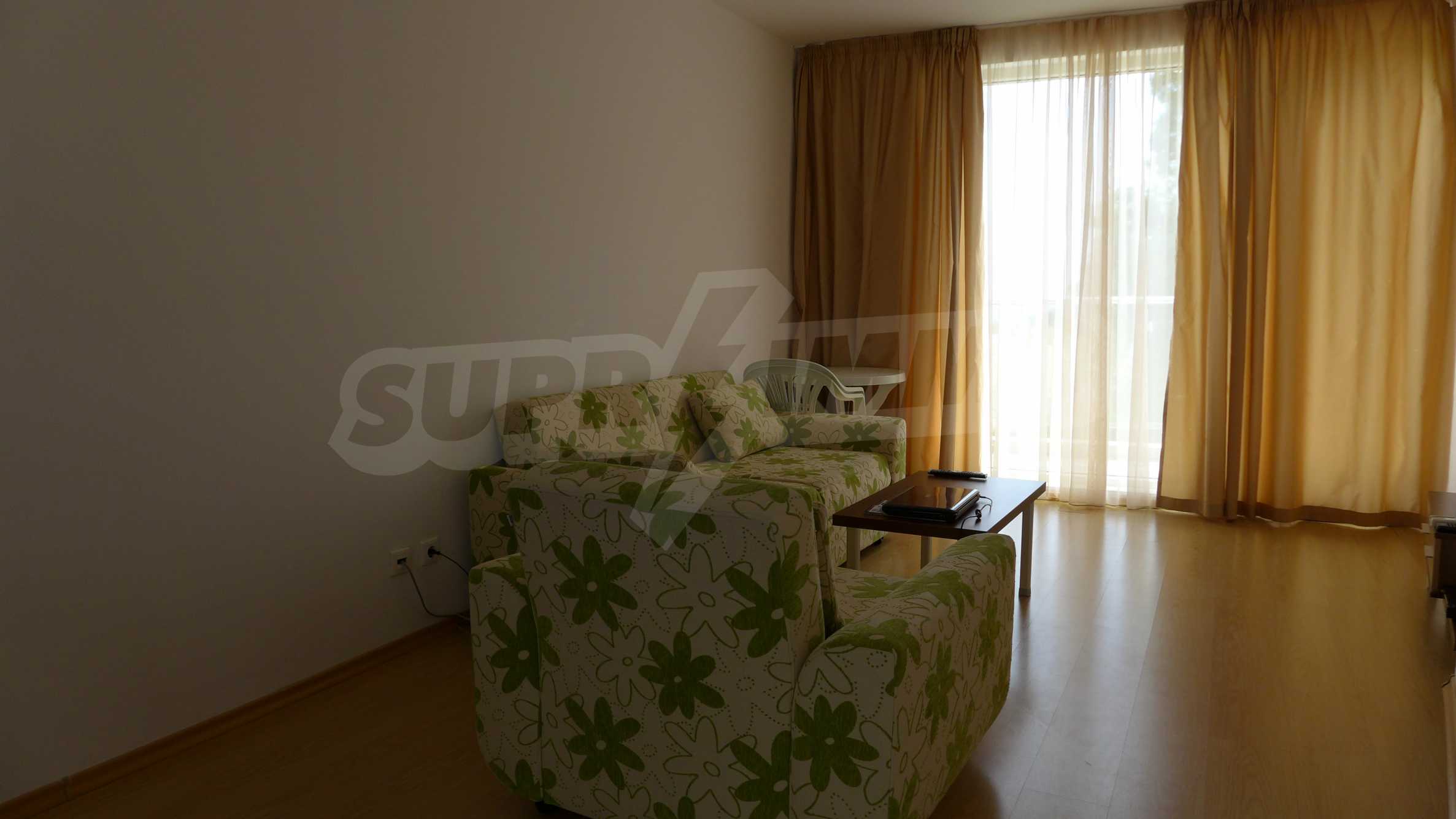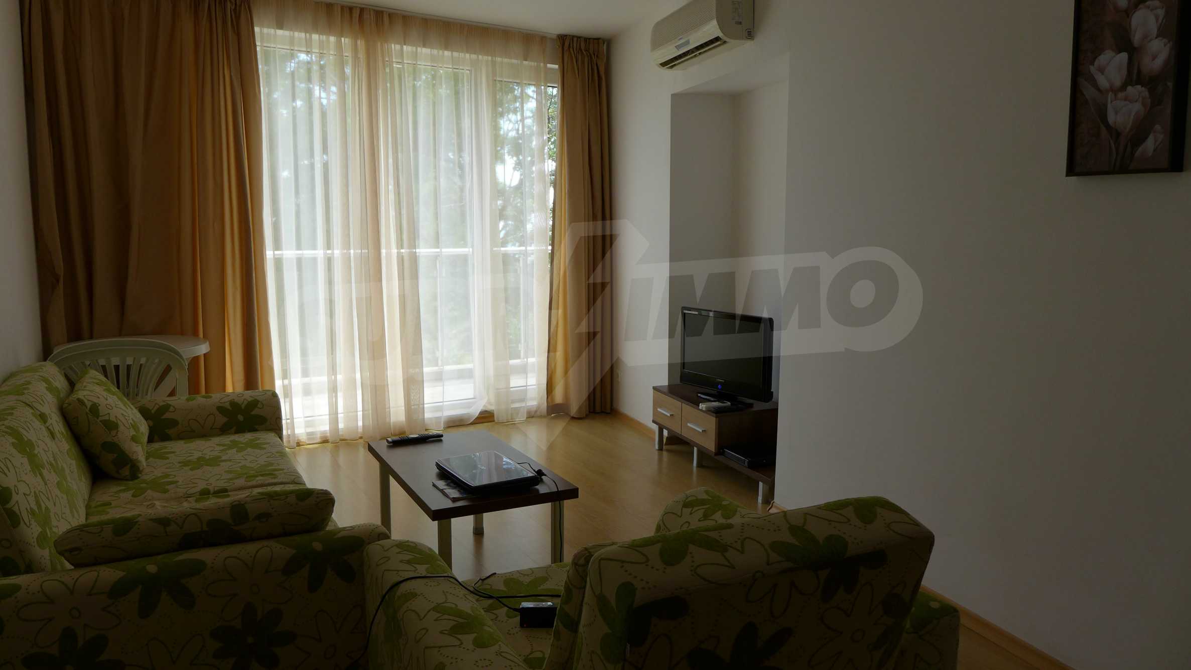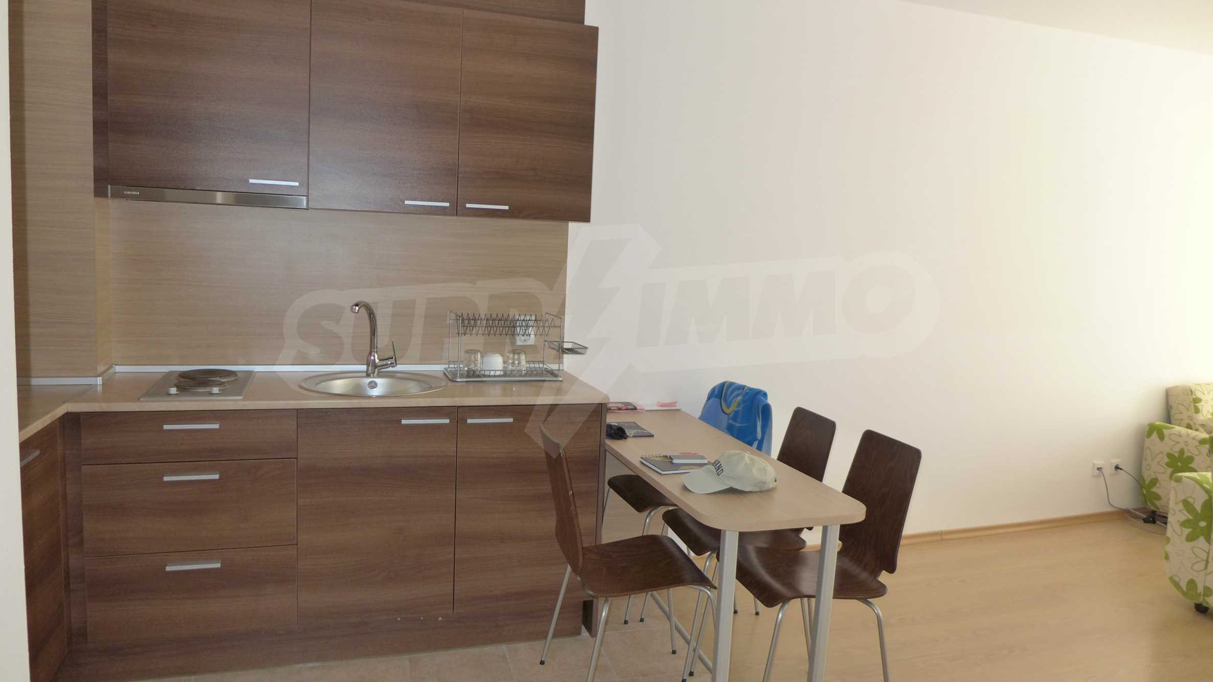 Bay View is a complex with distinctive architecture in Mediterranean style (2008), located on the beach where Strandzha mountain comes into the Black sea, less than 2 minutes from a quiet beach in proximity to the mountains. The apartment that we describe in this offer is set on the second floor and is equipped with cable TV and Internet. It consists of an entrance hall, a bathroom with toilet, a living room with kitchenette, a bedroom and a balcony. The floors in the hallway are tiled and in the living room and bedroom - with laminate. The bathroom is finished with a shower box. The annual maintenance fee is 12 euro / sq.m. (VAT included).