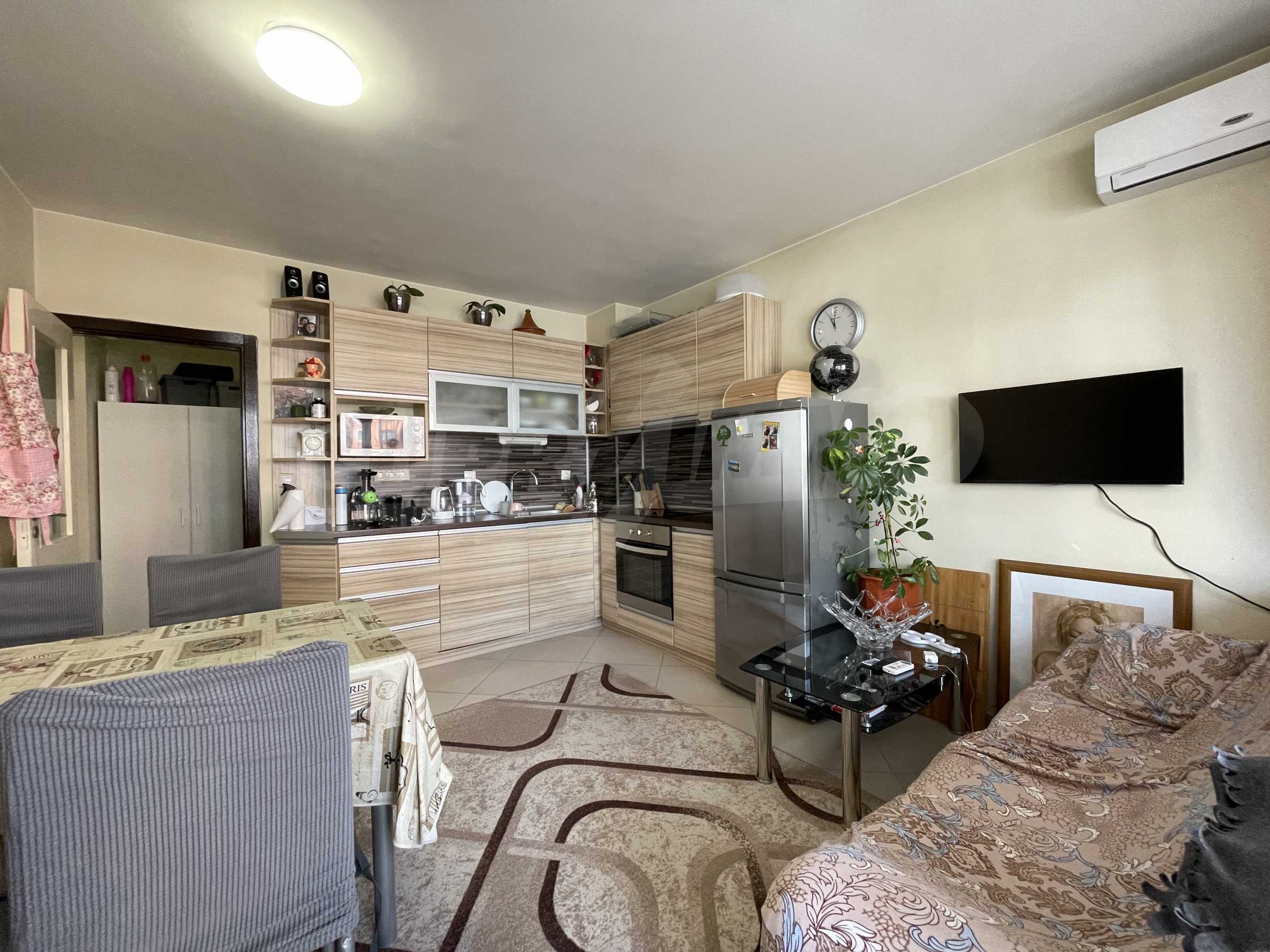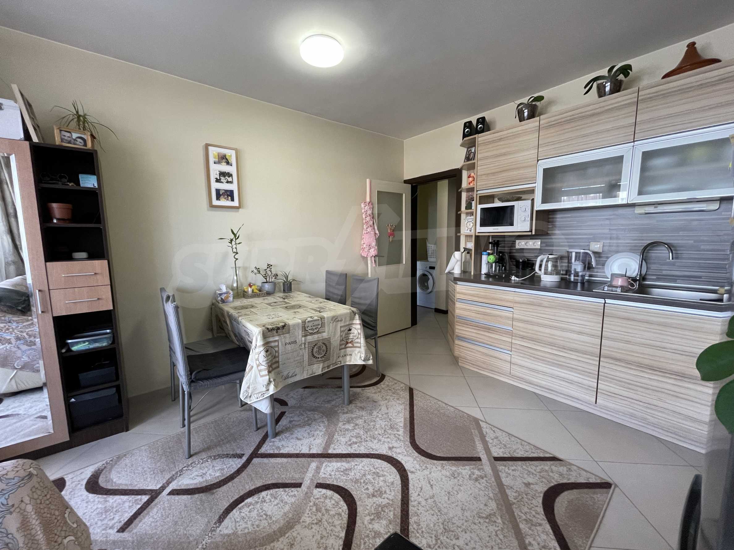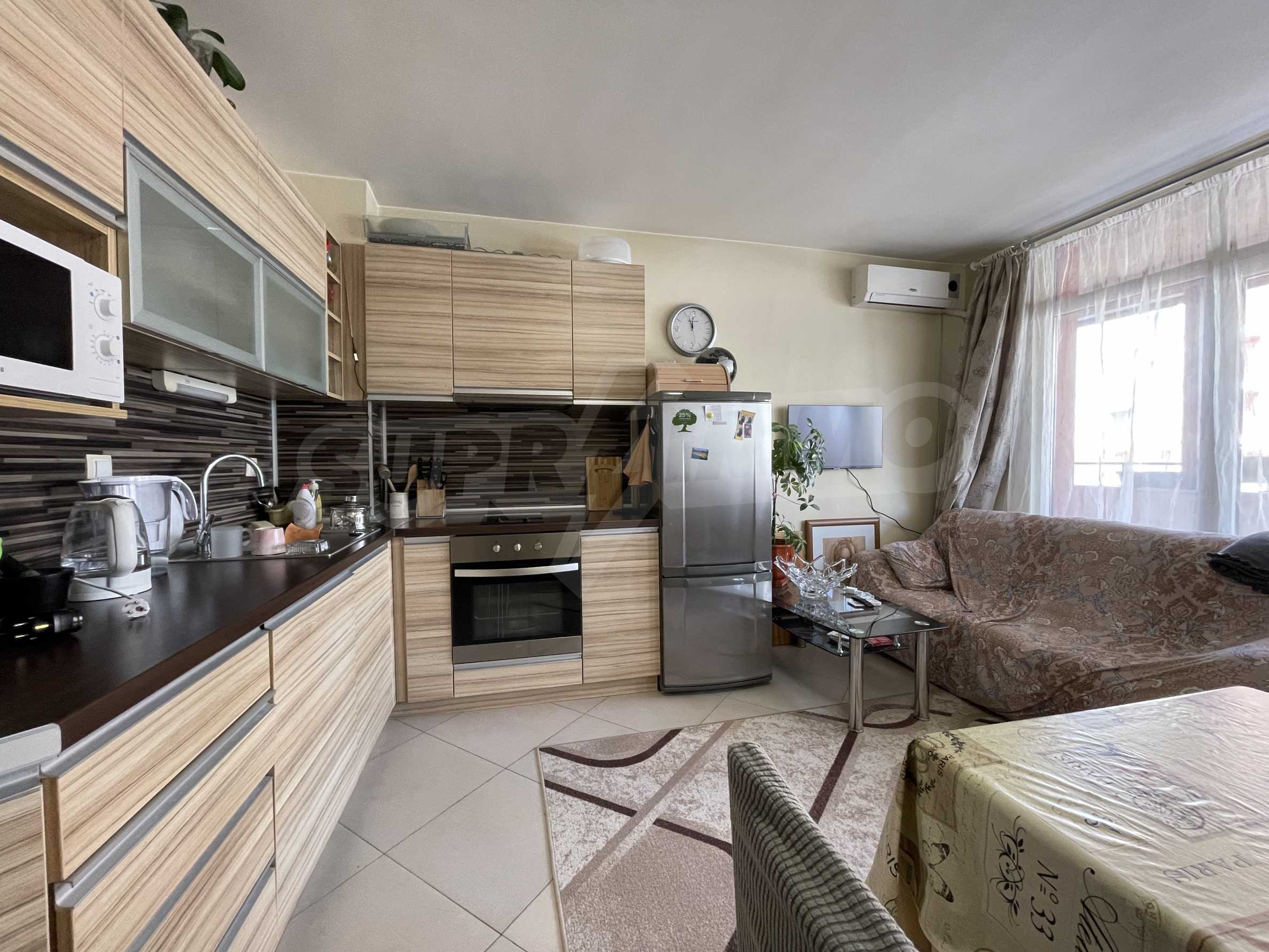 The kitchen is furnished with cupboards and equipped with electric cooker with hob, fridge, washing machine and cooker hood. Laminate floors and tiles. PVC windows are placed. There is central heating. Installed is a boiler for hot water.