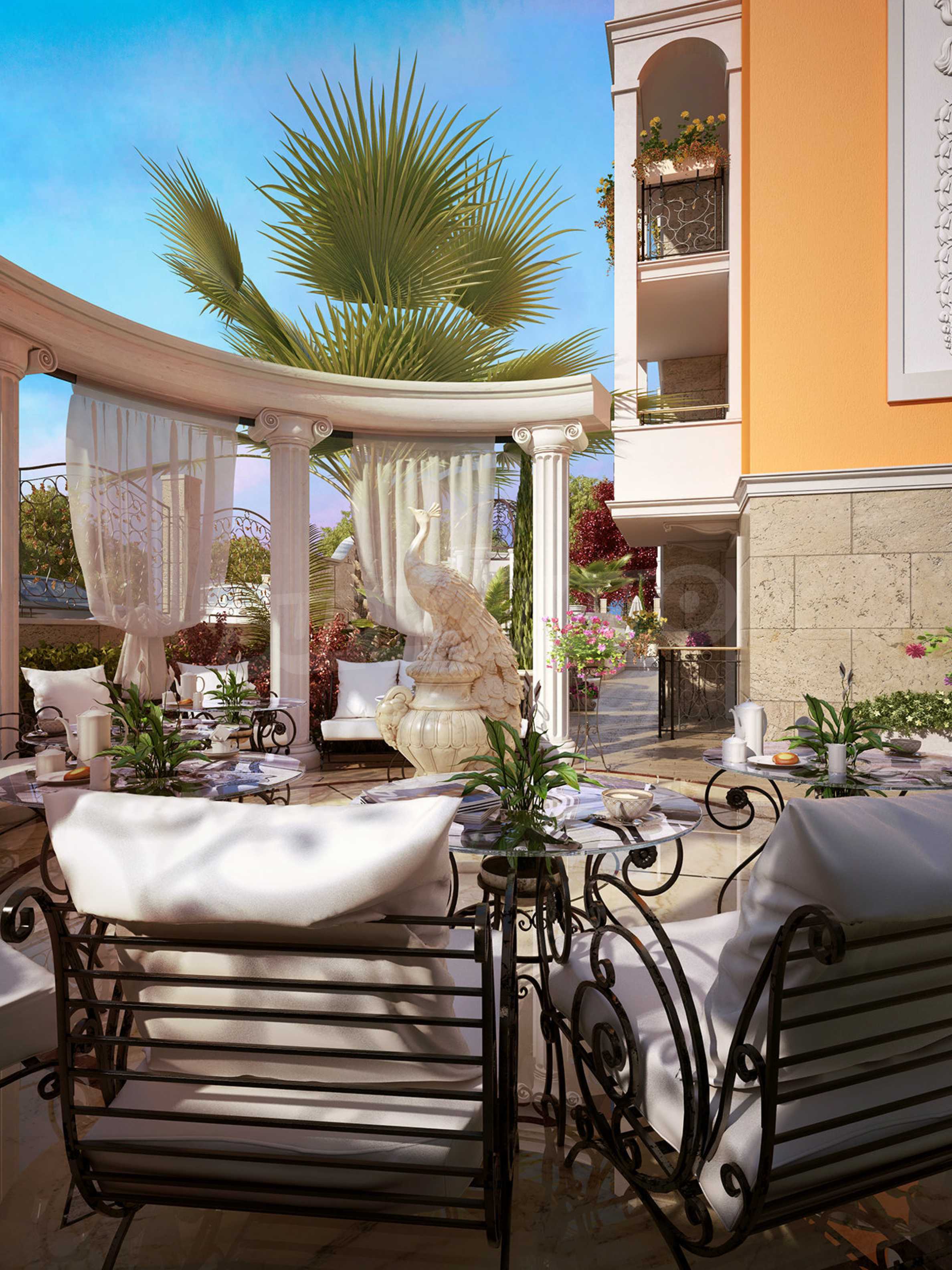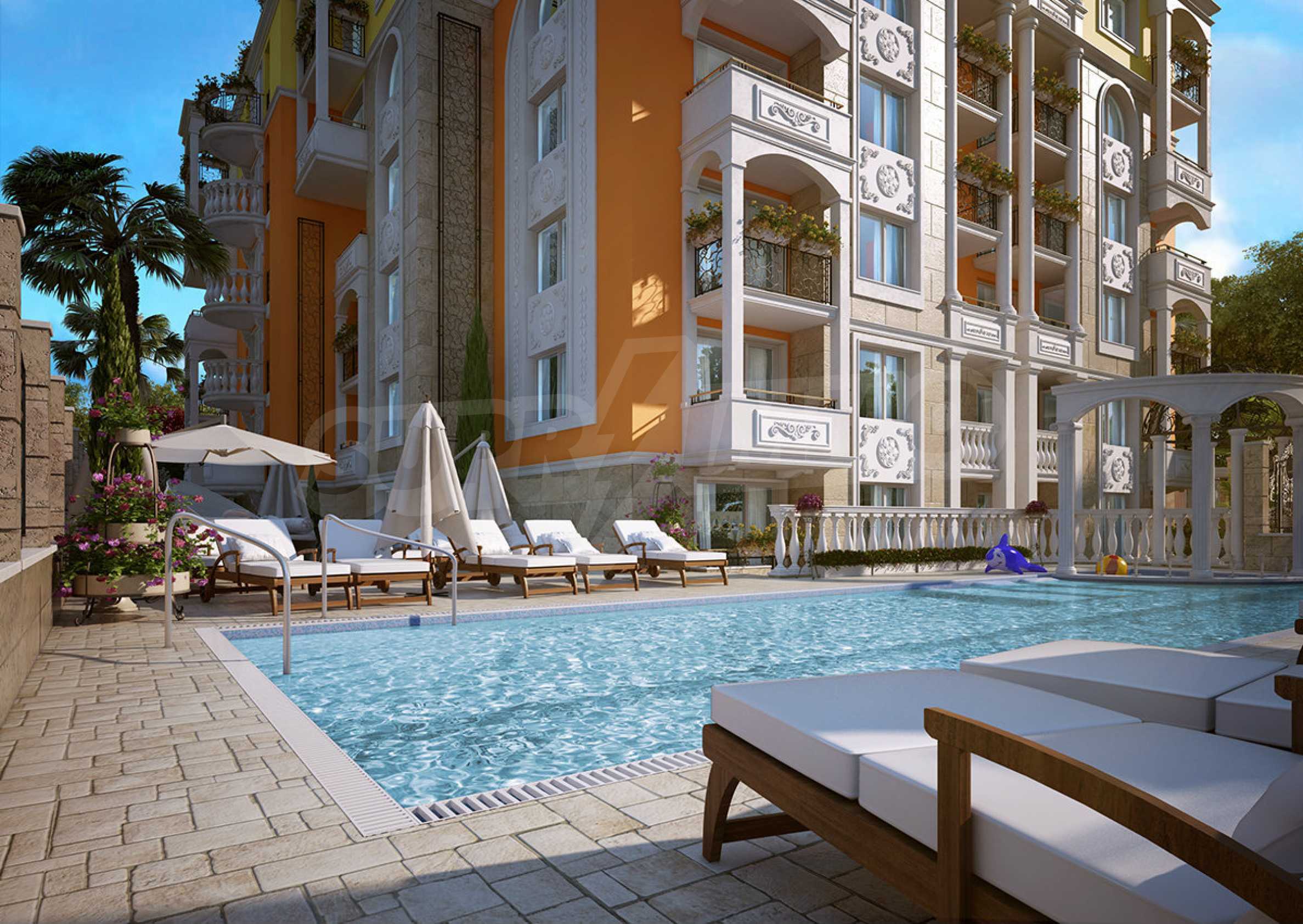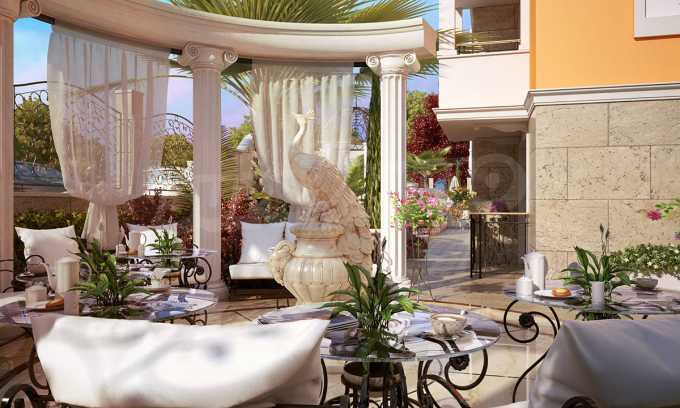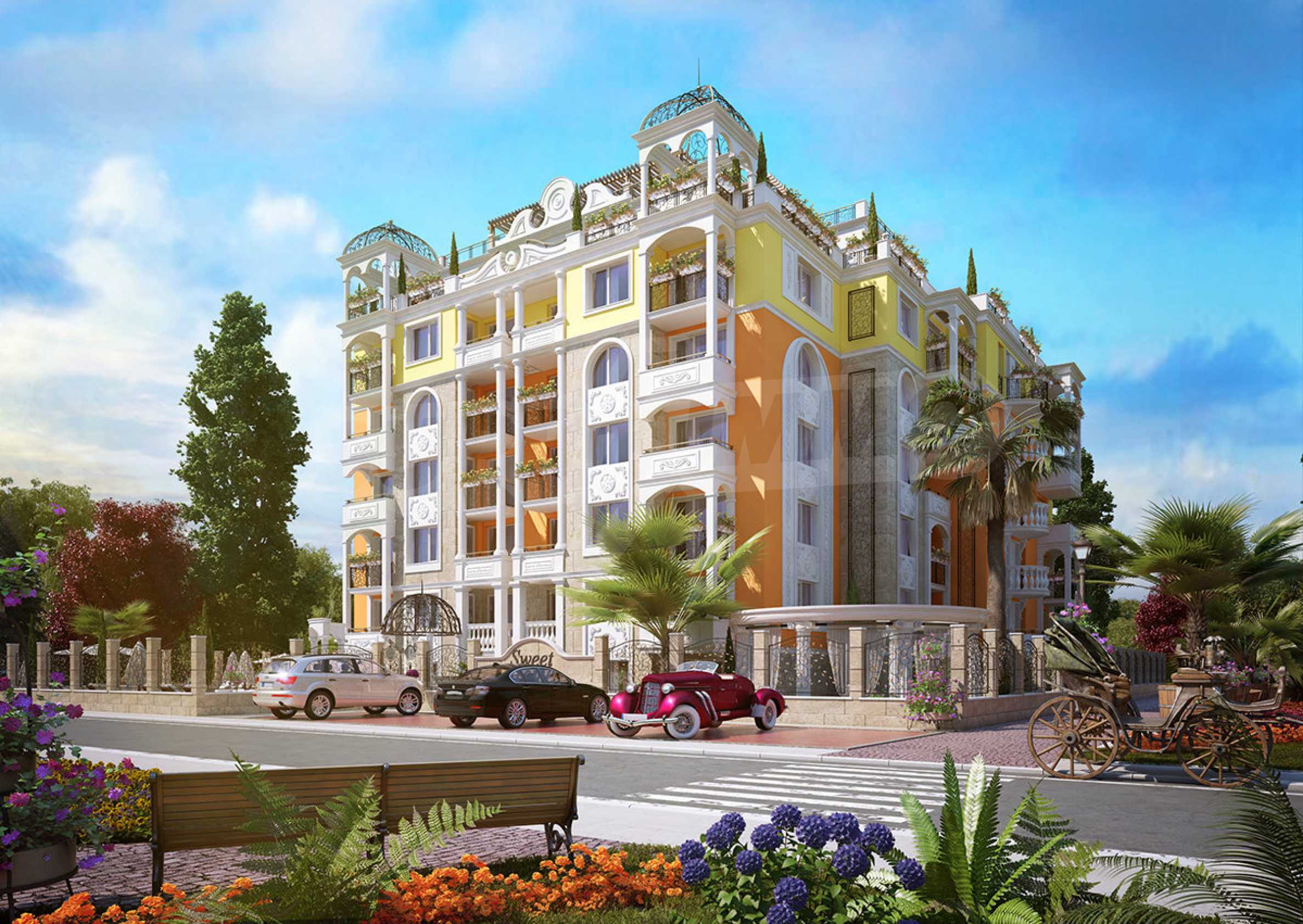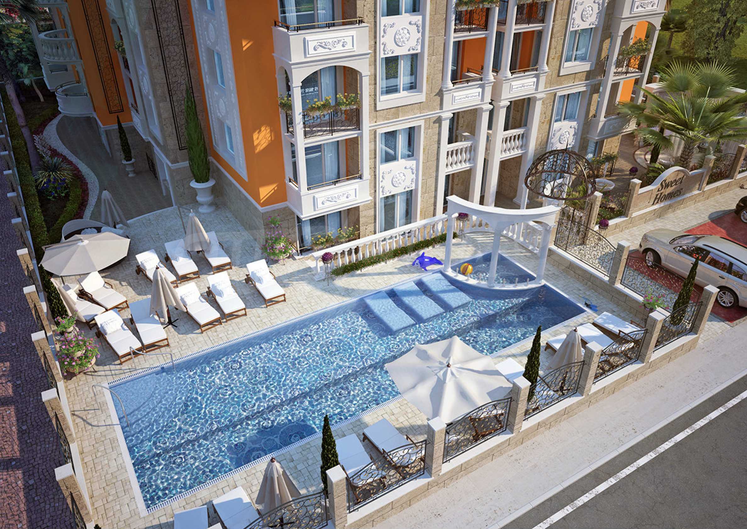 Sweet Homes complex 5 has an elegant Mediterranean facade and beautiful ornaments and decor, being a logical addition to the existing group of complexes by the same investor, providing owners and their guests with a wonderful garden of greenery, large pool and sunbathing area.