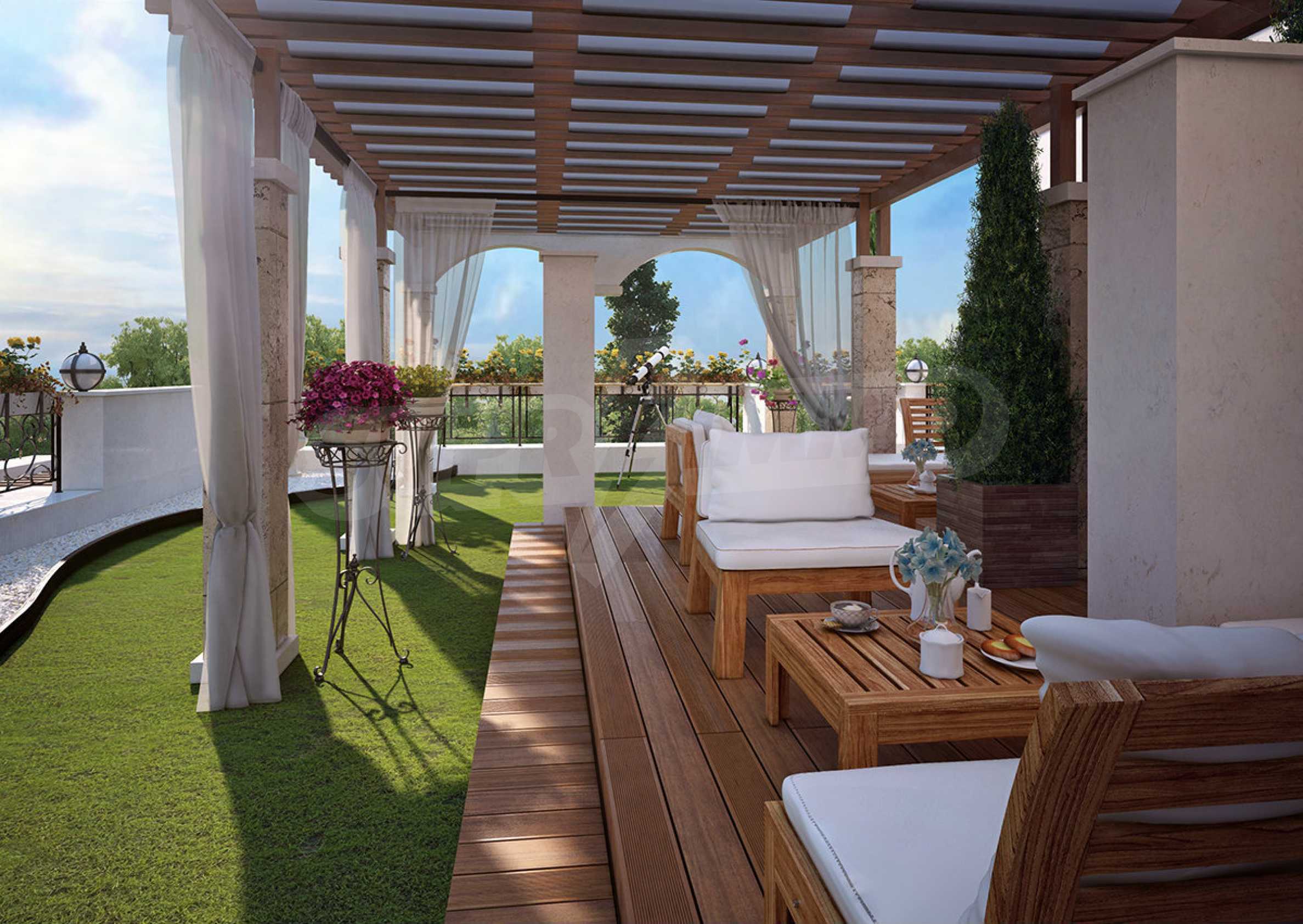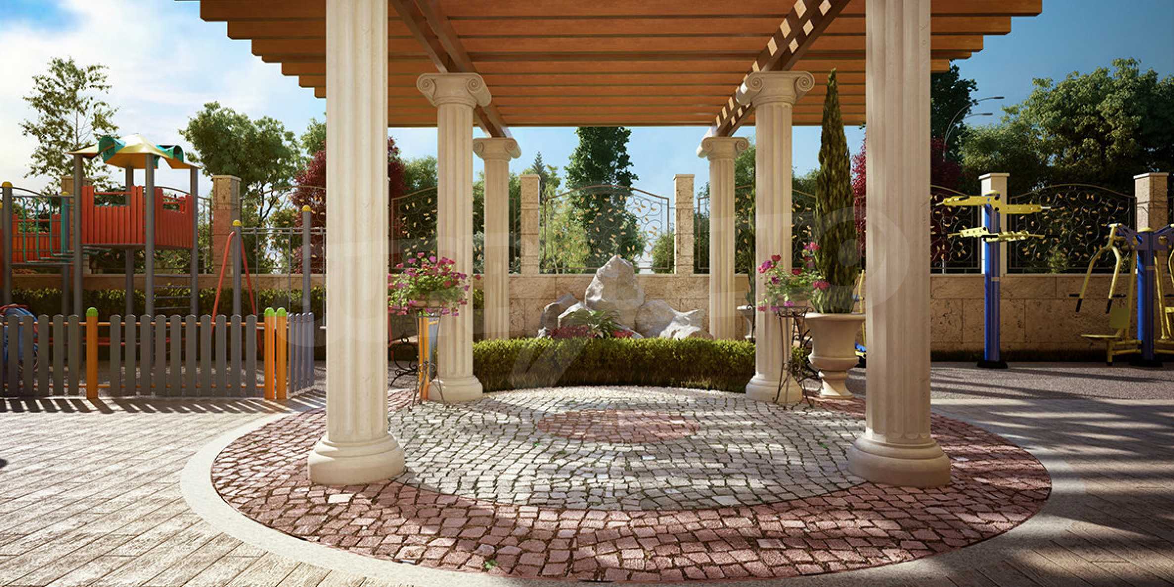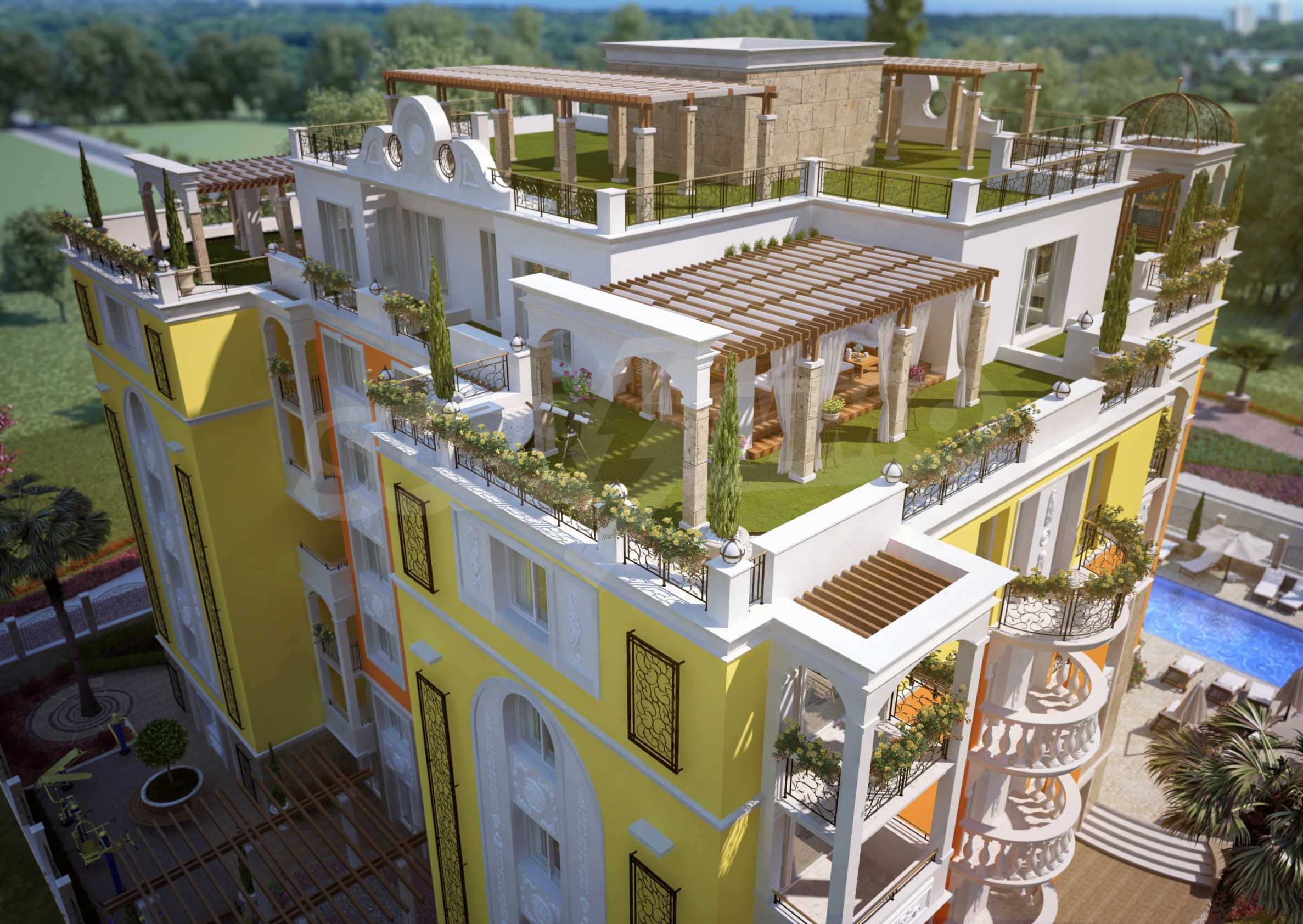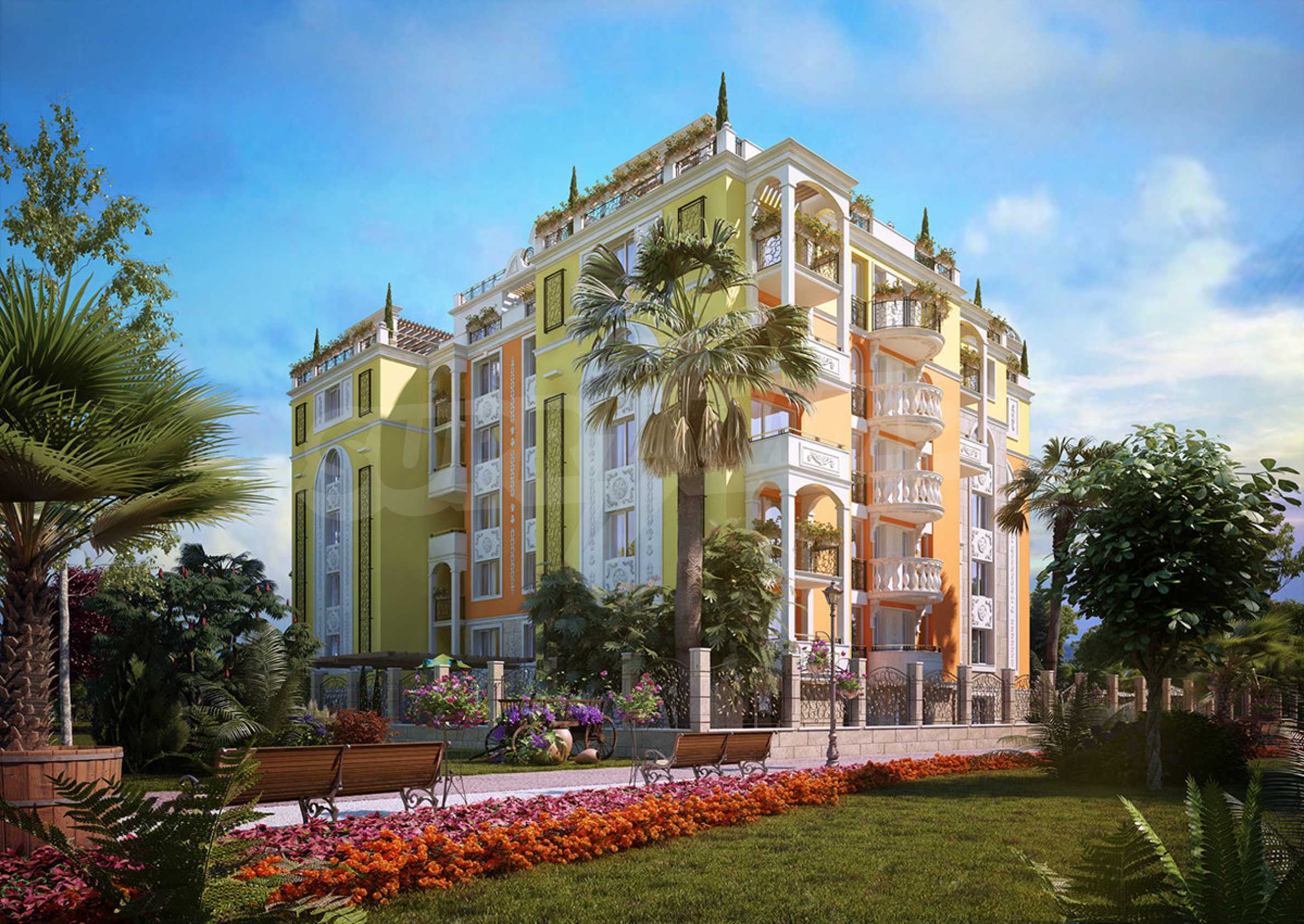 Sweet Homes complex 5 has an elegant Mediterranean facade and beautiful ornaments and decor, being a logical addition to the existing group of complexes by the same investor, providing owners and their guests with a wonderful garden of greenery, large pool and sunbathing area.