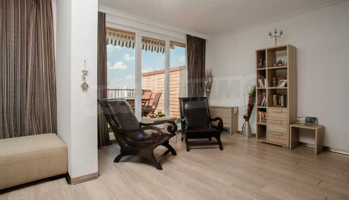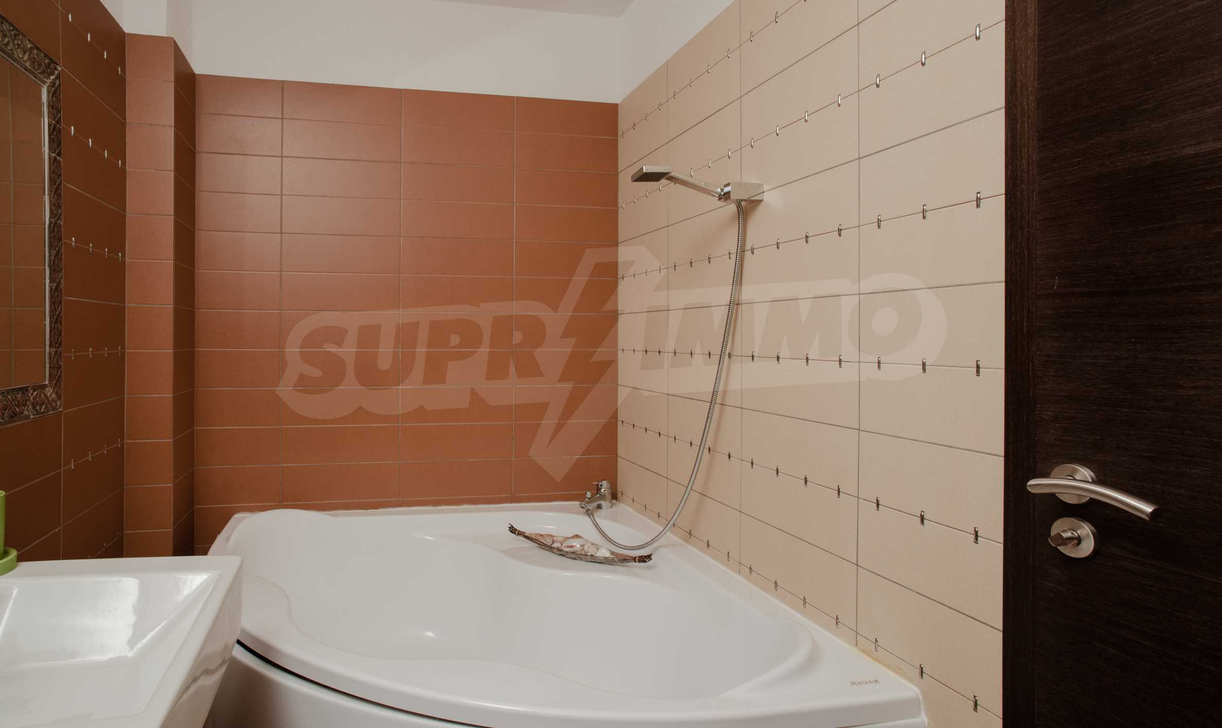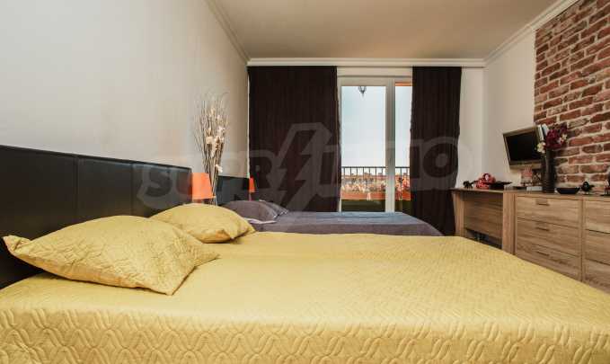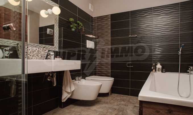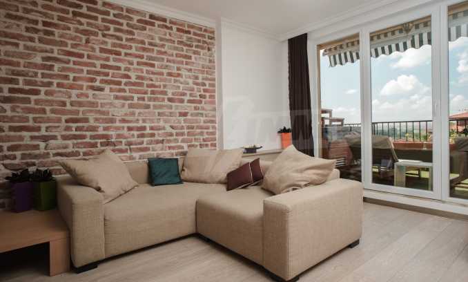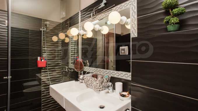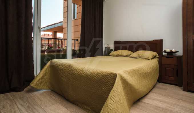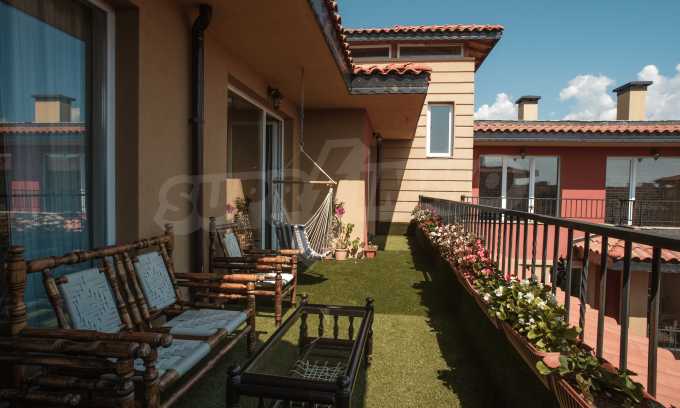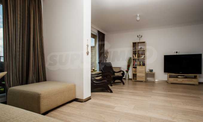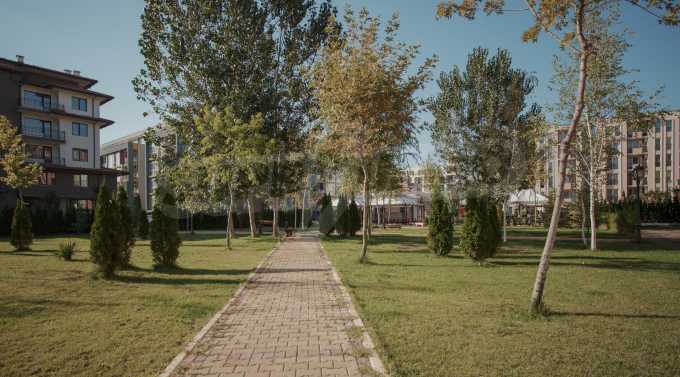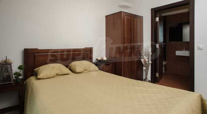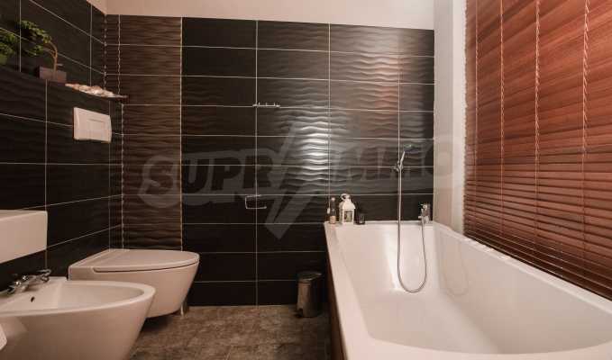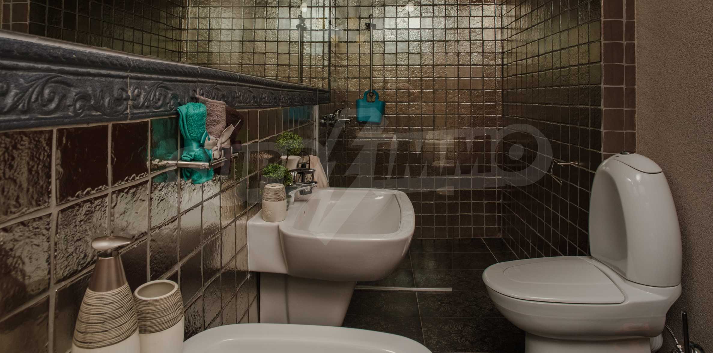 During the construction of the complex have been used only high quality materials. The apartments are finished and come with 5 cm EPS insulation, 5-chamber UPVC window frames front and interior doors from MDF with oak covering; latex painted walls, laminated flooring. The kitchen has fitted cupboards, oven / microwave; 2 electric hotplates, a refrigerator and a sink. The bathrooms have bathtubs, faucets for hot and cold water, flush toilet, sink with hot and cold water mixer, lighting, 4 electric boilers for hot water meter, air conditioners. The apartment has installations for cable television, wireless internet, security and fire alarm system.