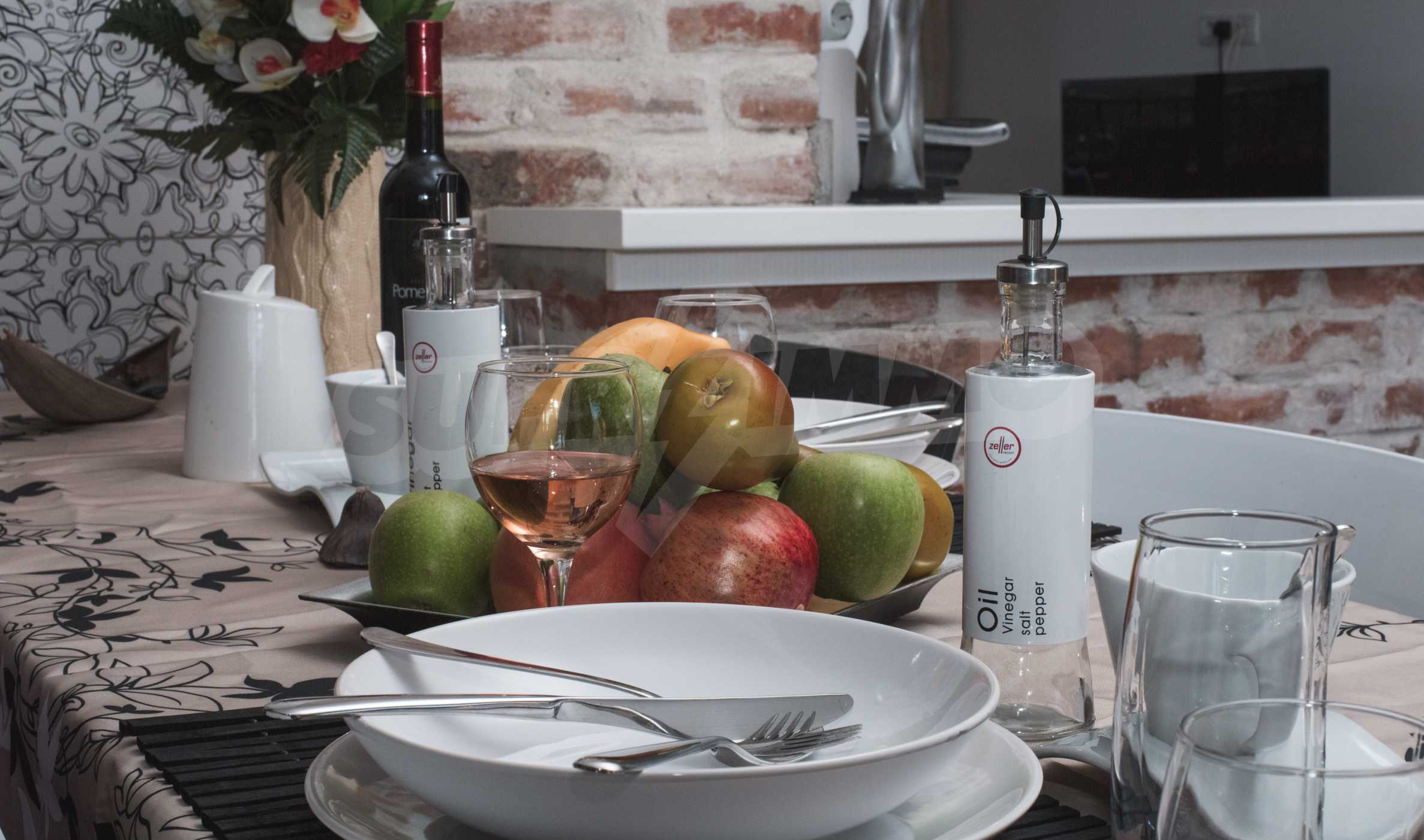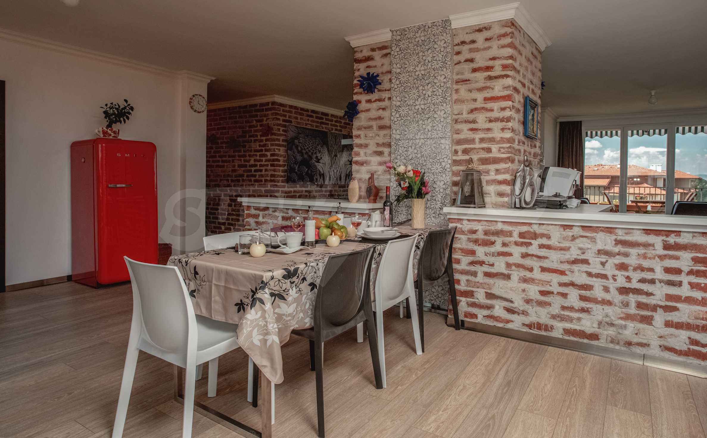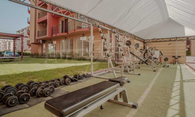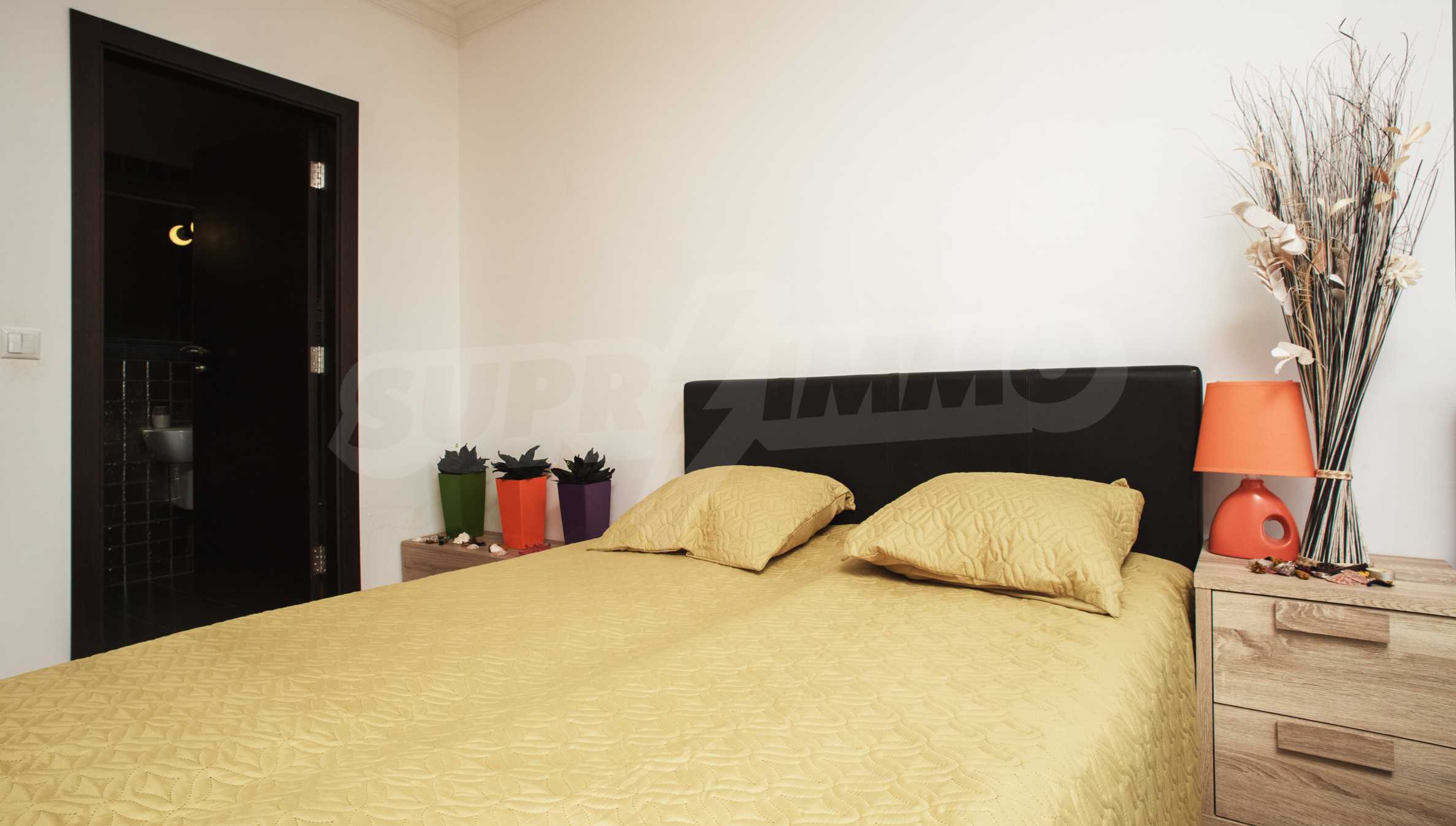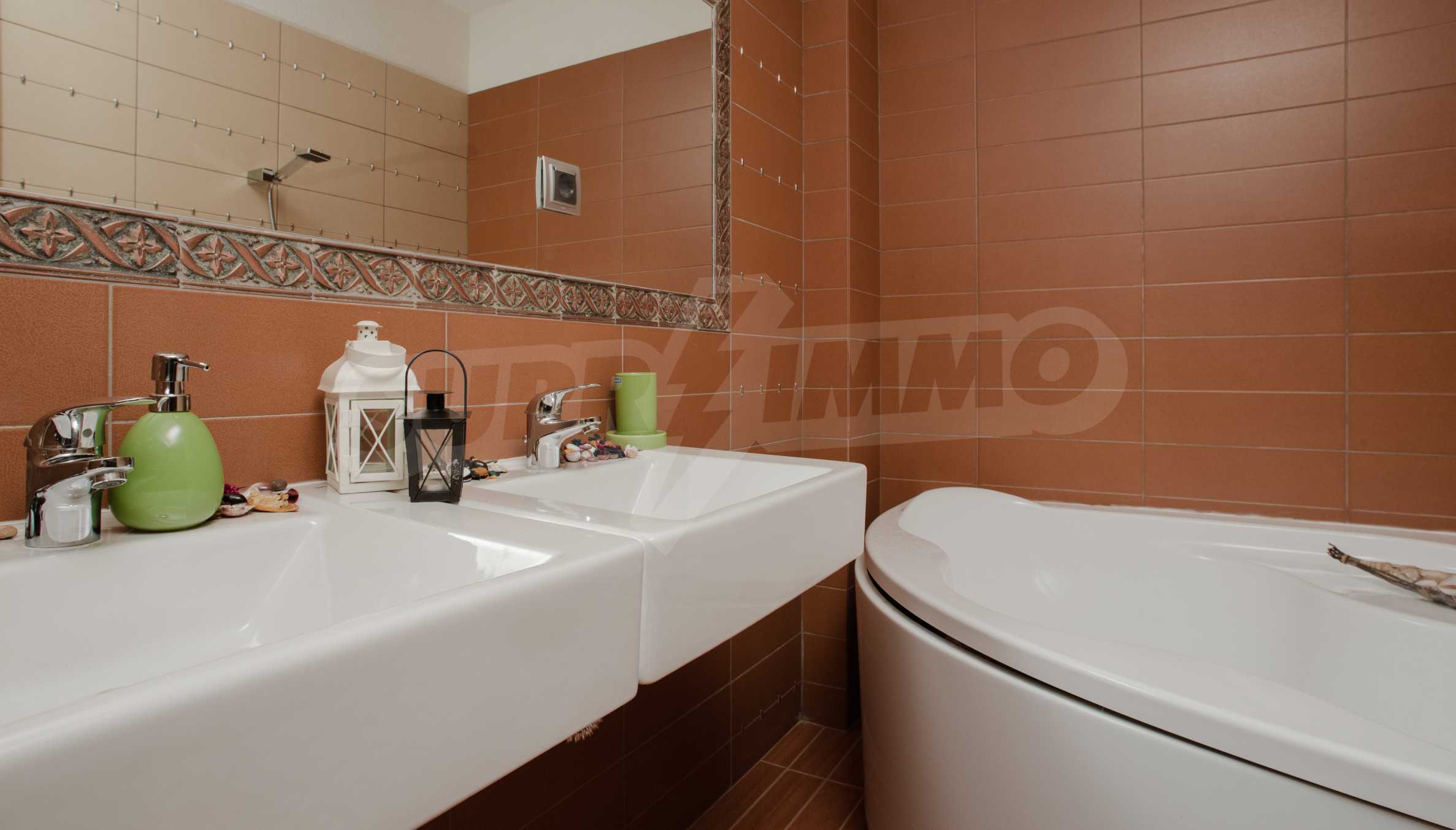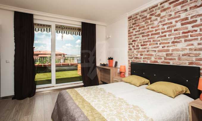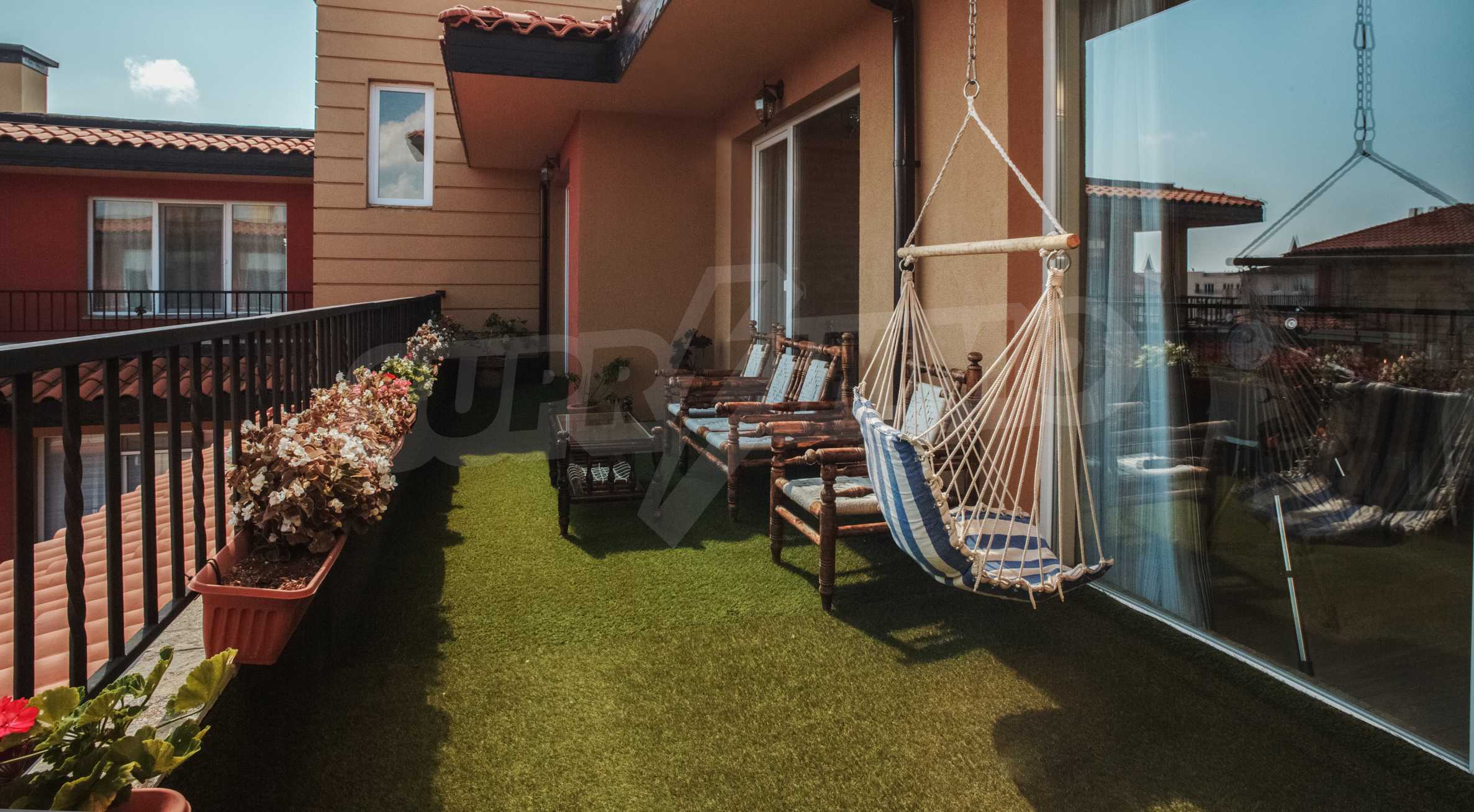 During the construction of the complex have been used only high quality materials. The apartments are finished and come with 5 cm EPS insulation, 5-chamber UPVC window frames front and interior doors from MDF with oak covering; latex painted walls, laminated flooring. The kitchen has fitted cupboards, oven / microwave; 2 electric hotplates, a refrigerator and a sink. The bathrooms have bathtubs, faucets for hot and cold water, flush toilet, sink with hot and cold water mixer, lighting, 4 electric boilers for hot water meter, air conditioners. The apartment has installations for cable television, wireless internet, security and fire alarm system.