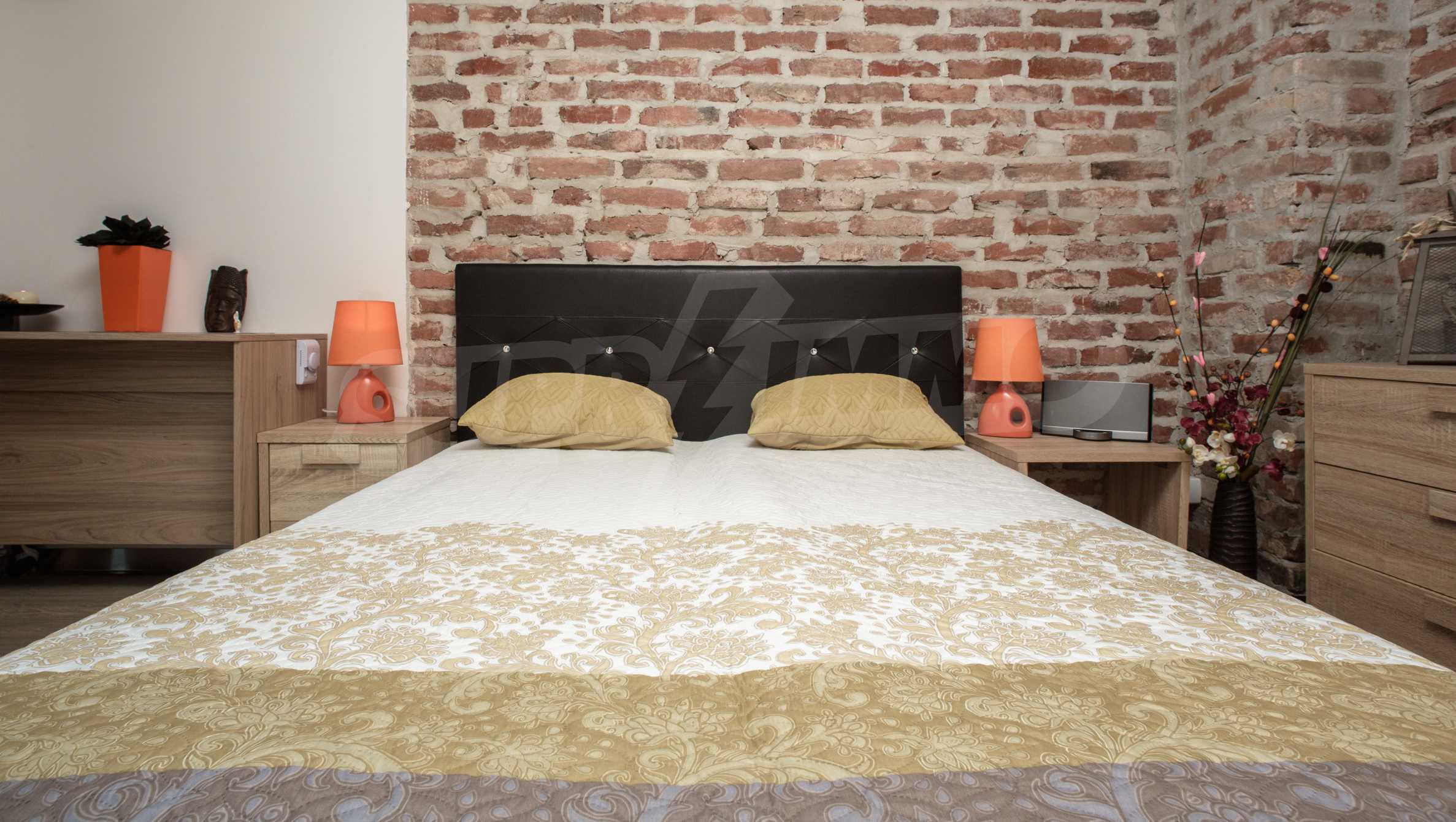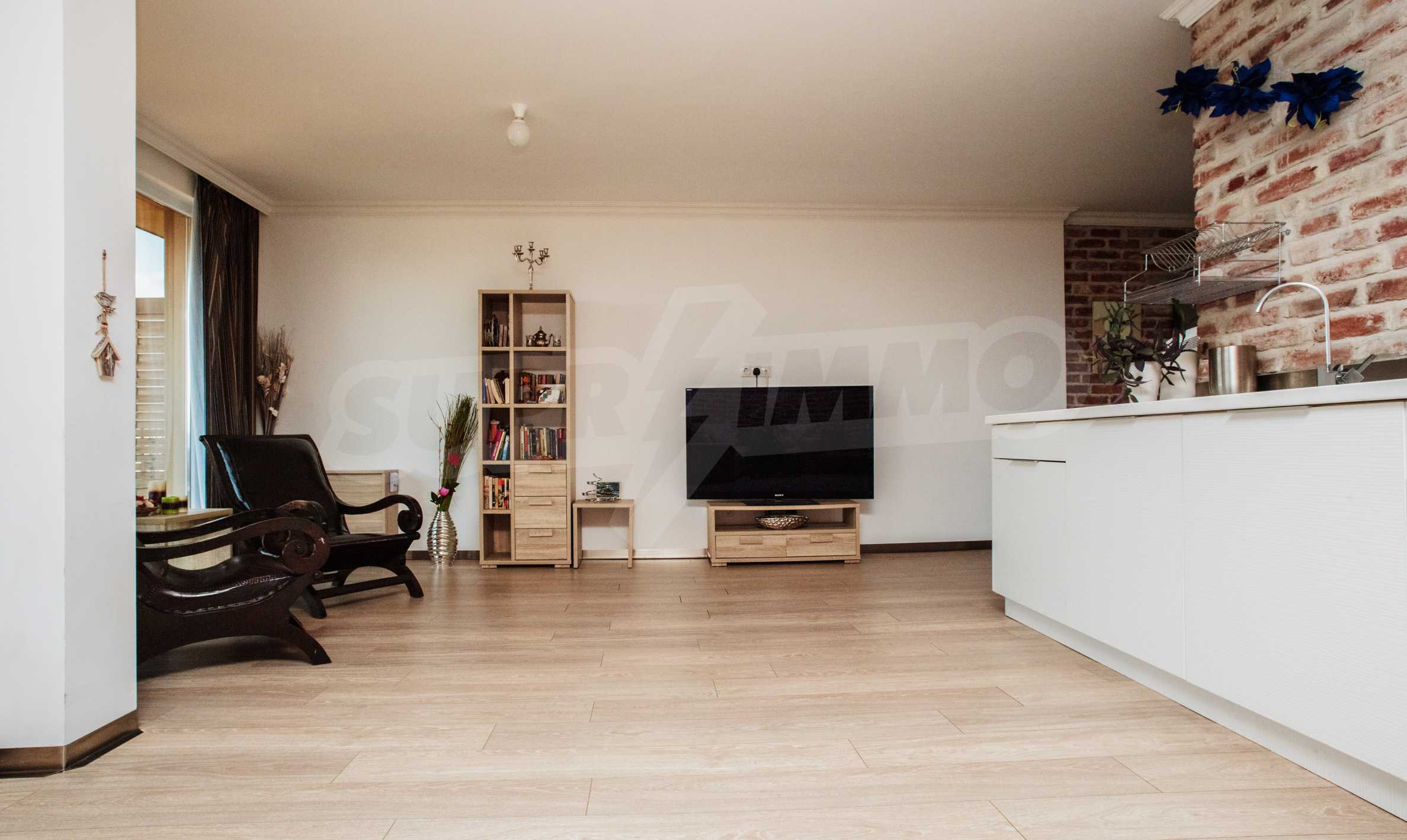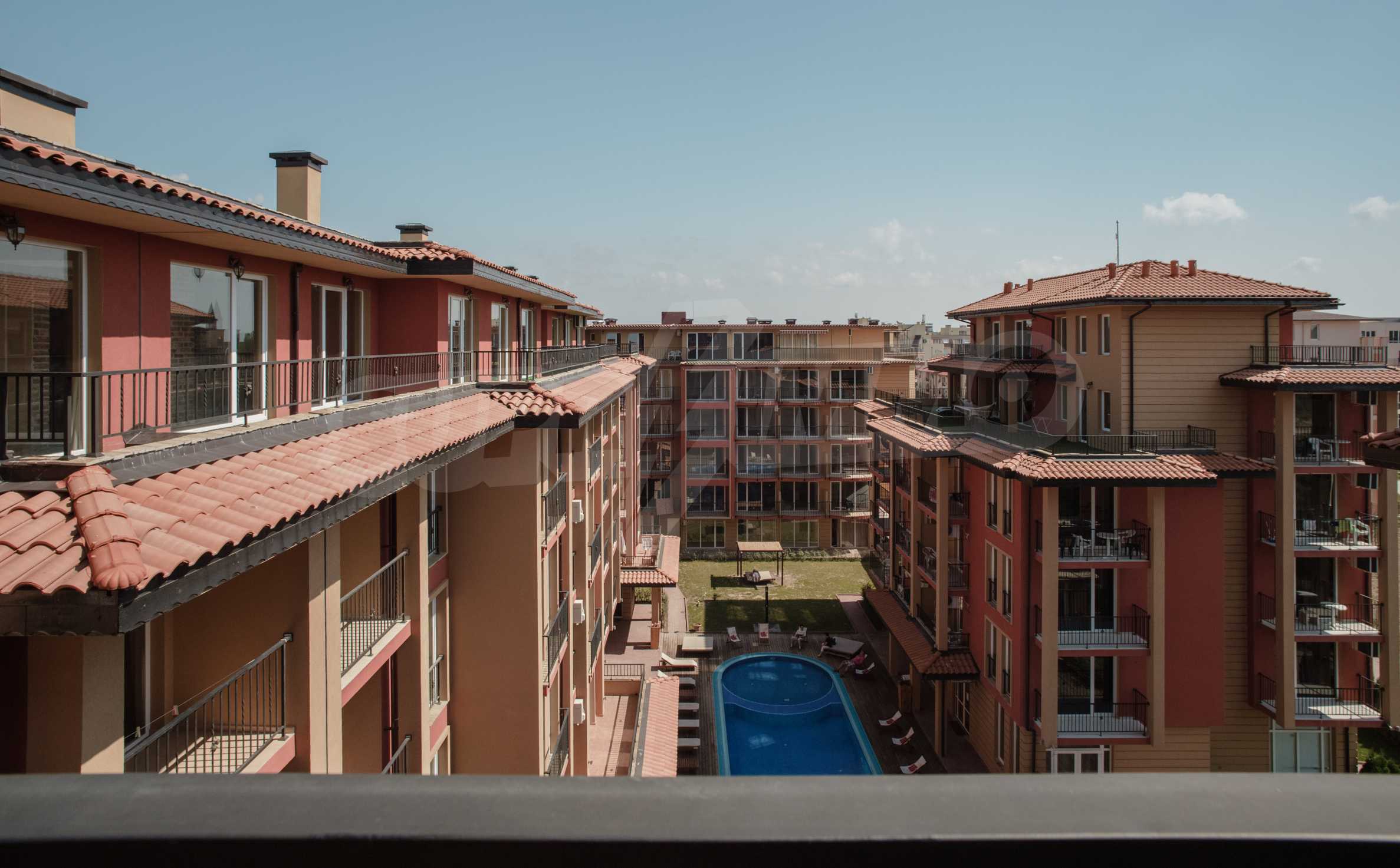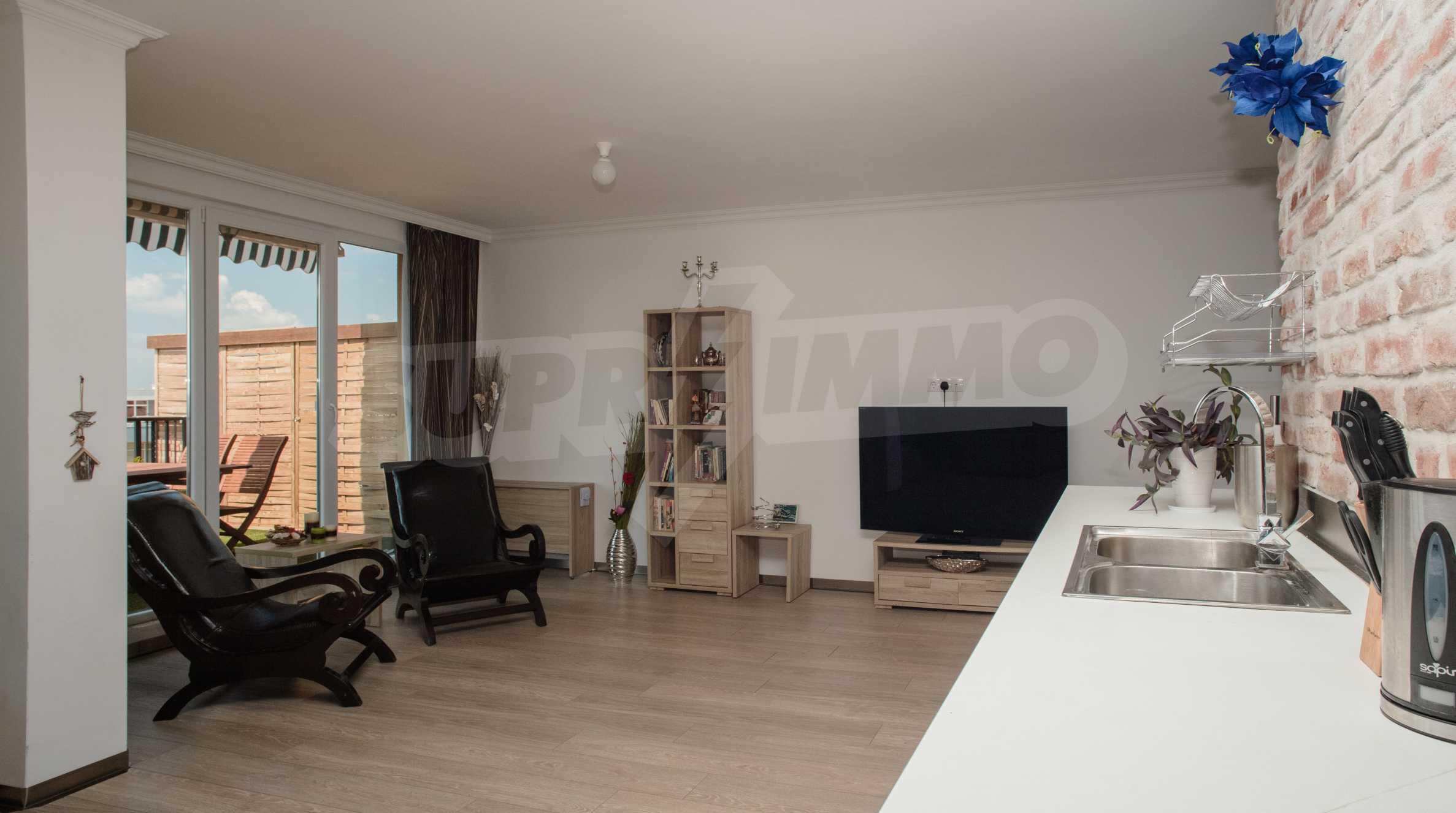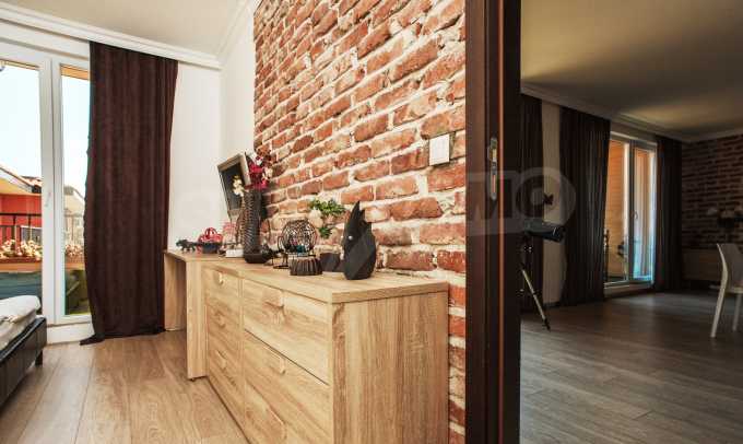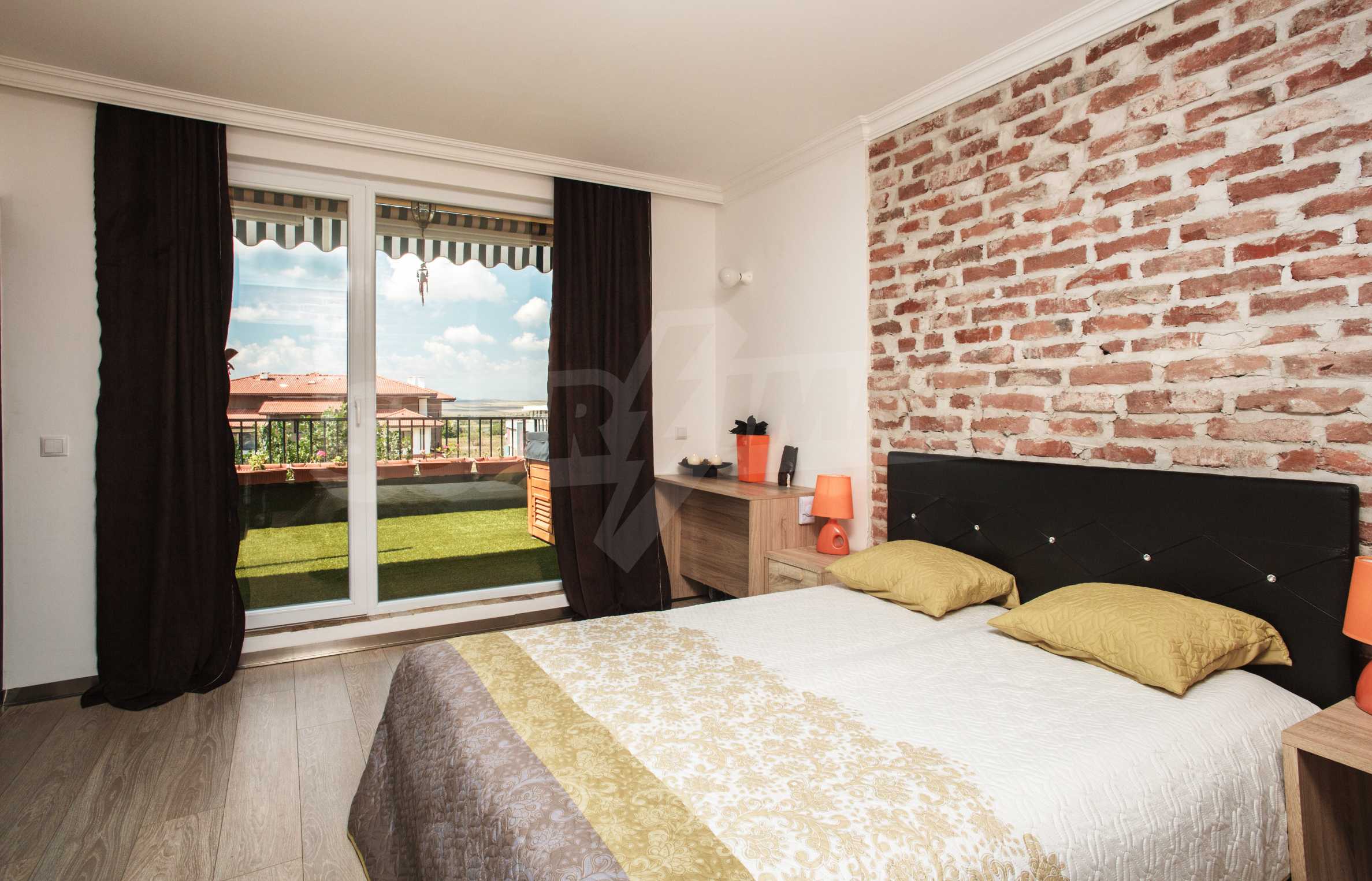 During the construction of the complex have been used only high quality materials. The apartments are finished and come with 5 cm EPS insulation, 5-chamber UPVC window frames front and interior doors from MDF with oak covering; latex painted walls, laminated flooring. The kitchen has fitted cupboards, oven / microwave; 2 electric hotplates, a refrigerator and a sink. The bathrooms have bathtubs, faucets for hot and cold water, flush toilet, sink with hot and cold water mixer, lighting, 4 electric boilers for hot water meter, air conditioners. The apartment has installations for cable television, wireless internet, security and fire alarm system.